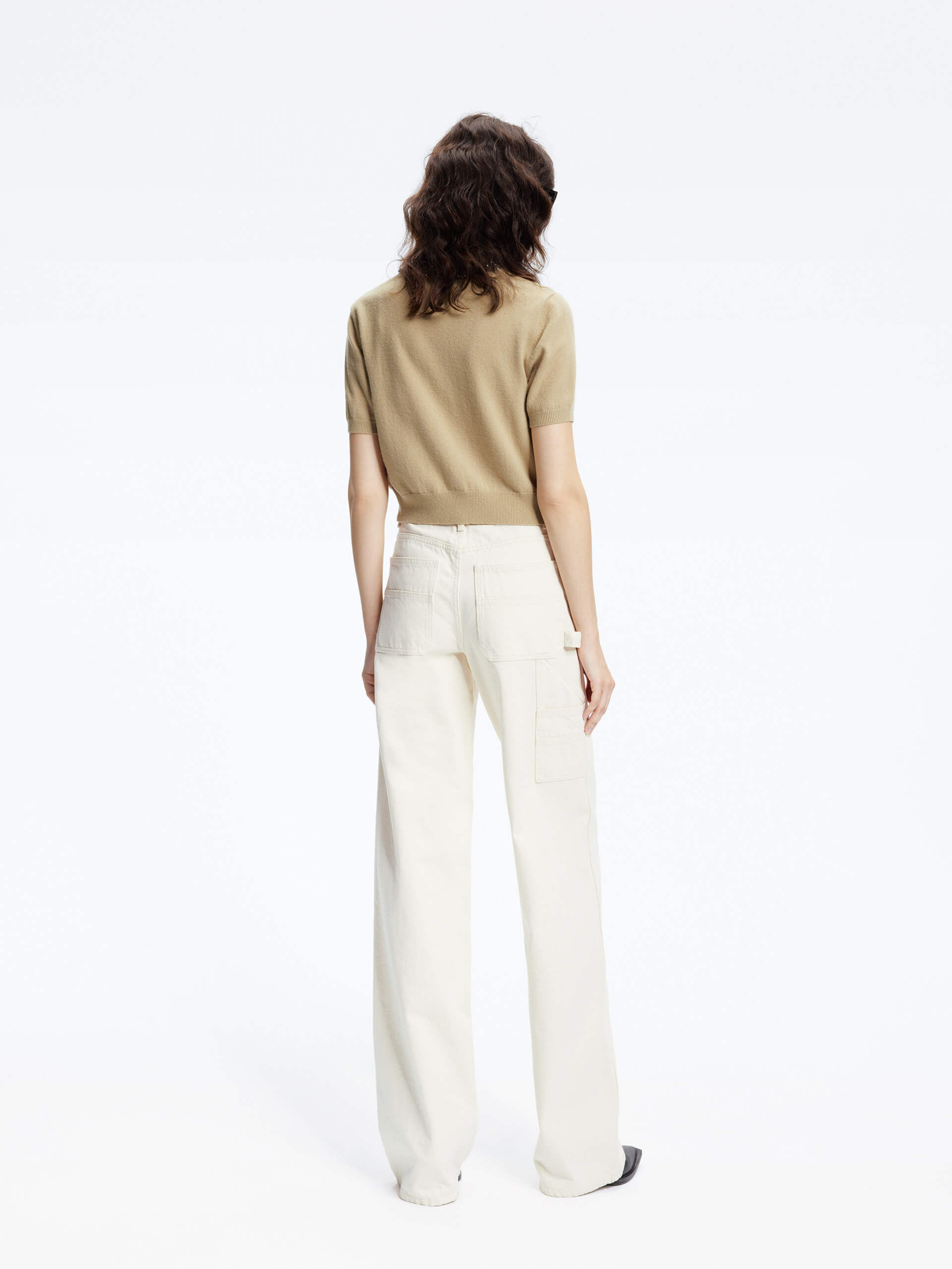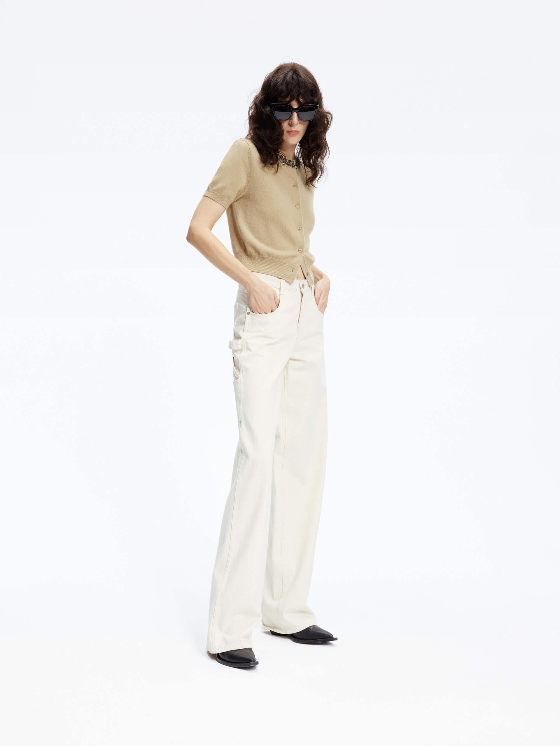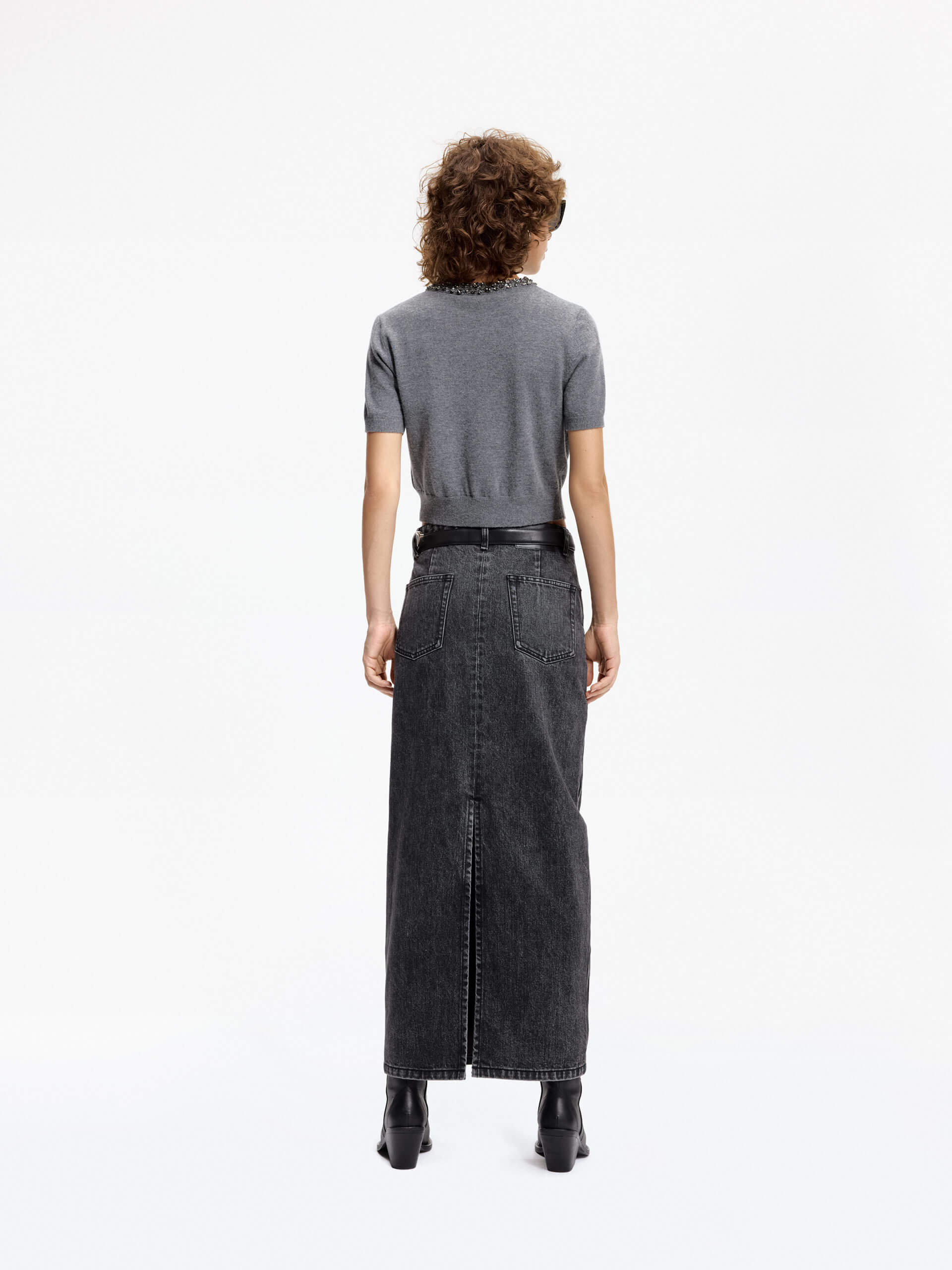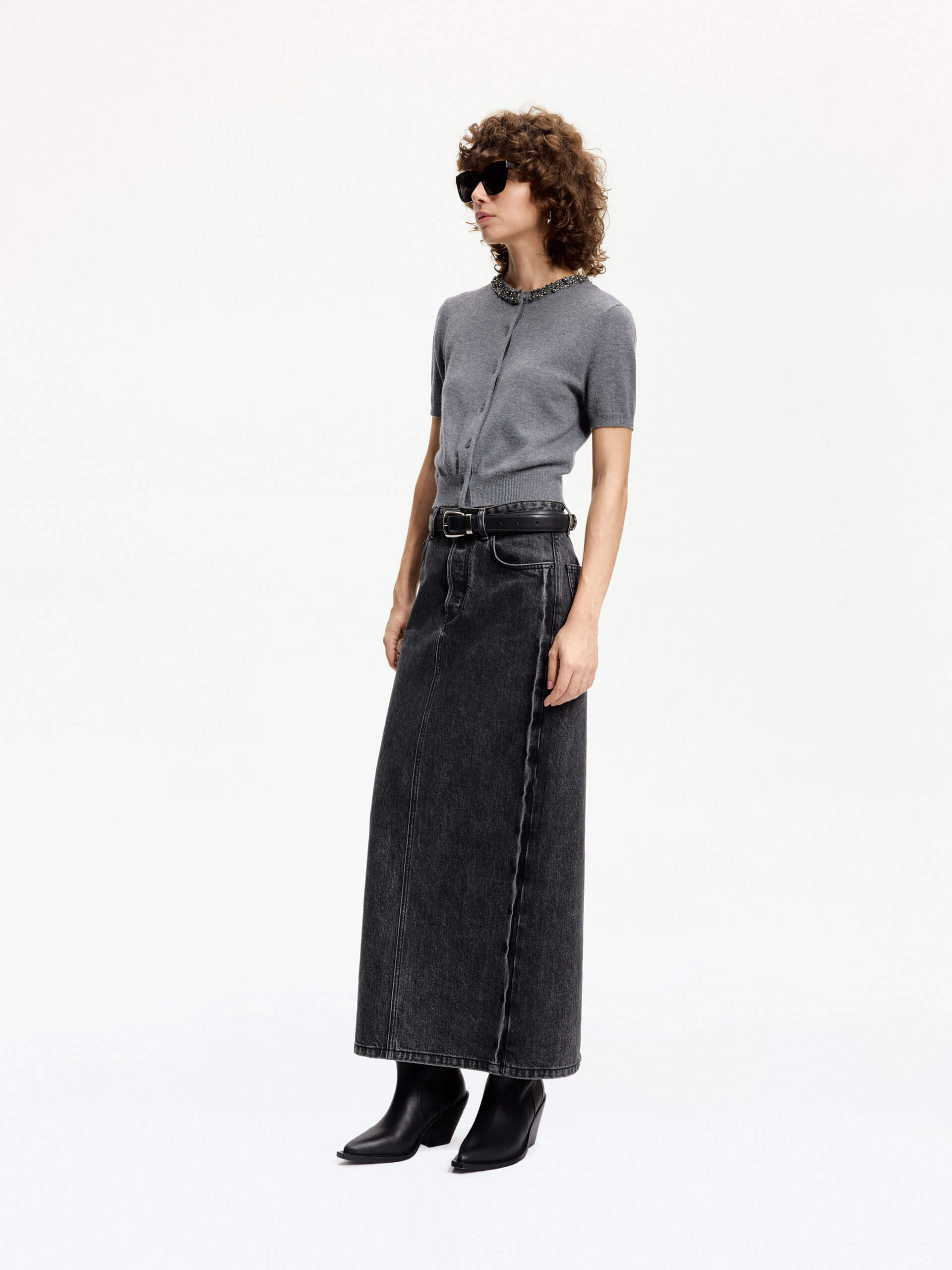 Made with soft wool and cashmere, this cardigan features a fitted silhouette and sparkling crystal accents on the collar. Pair it with a high-waisted skirt or jeans for a chic and effortless look.