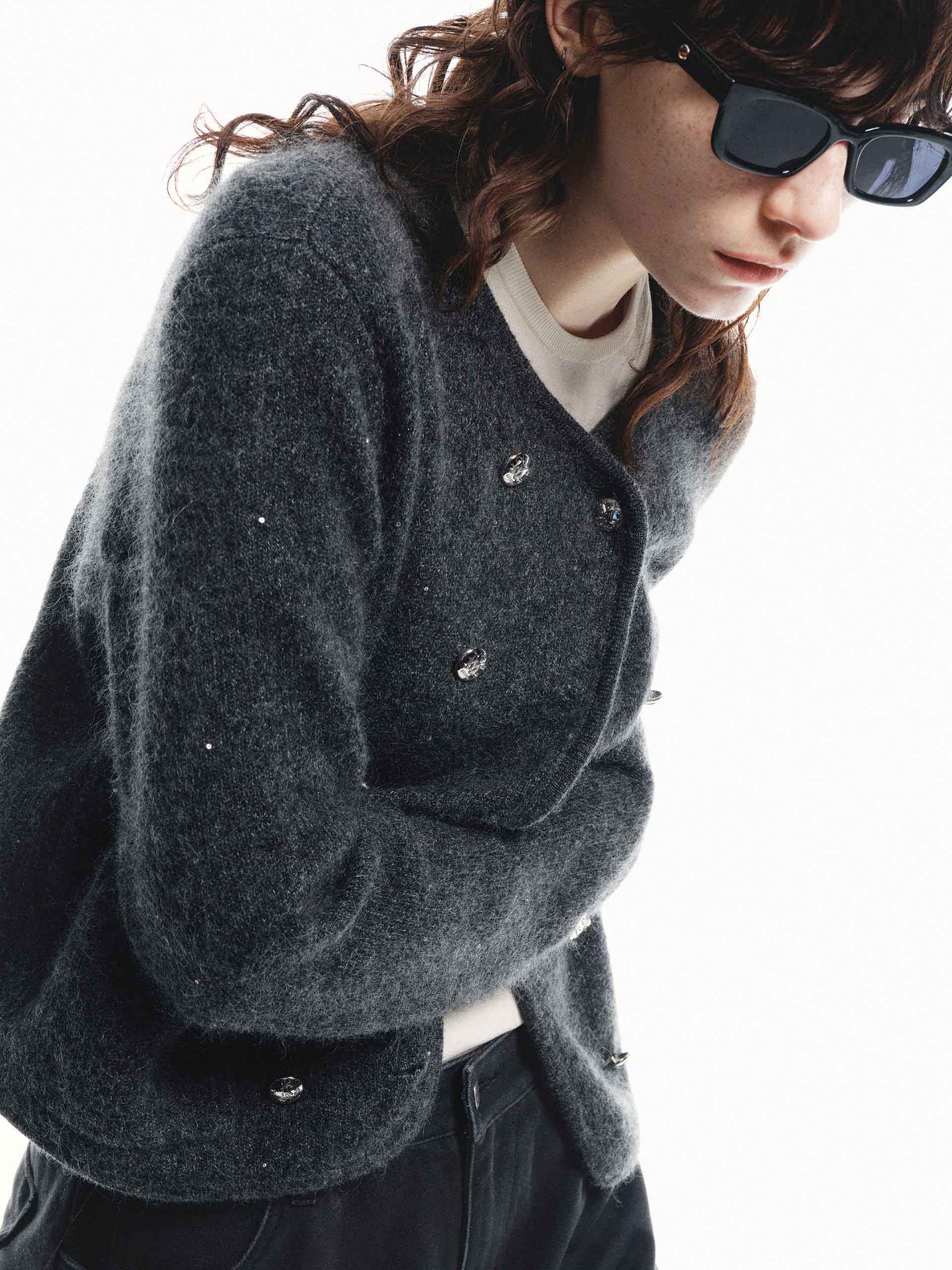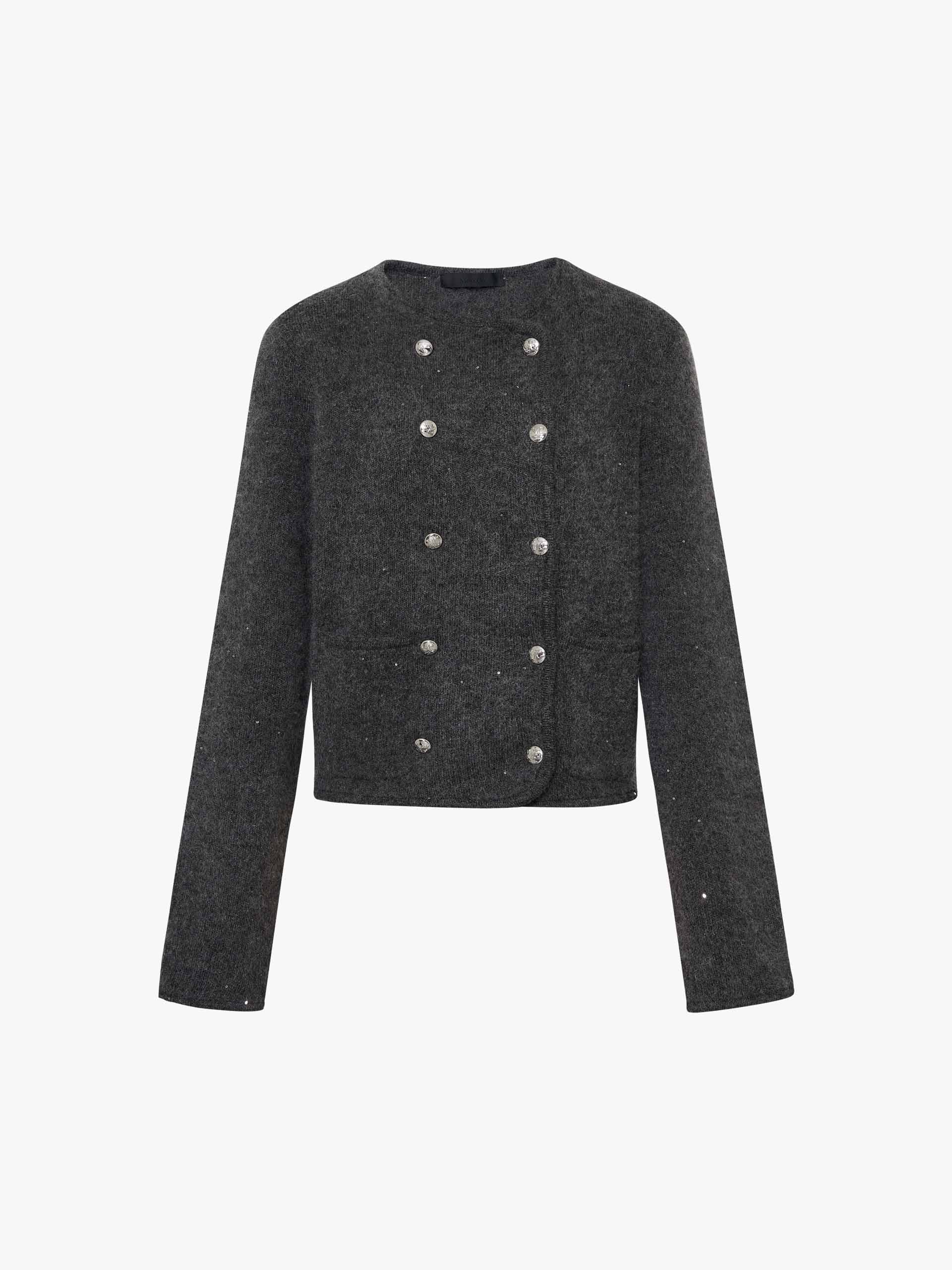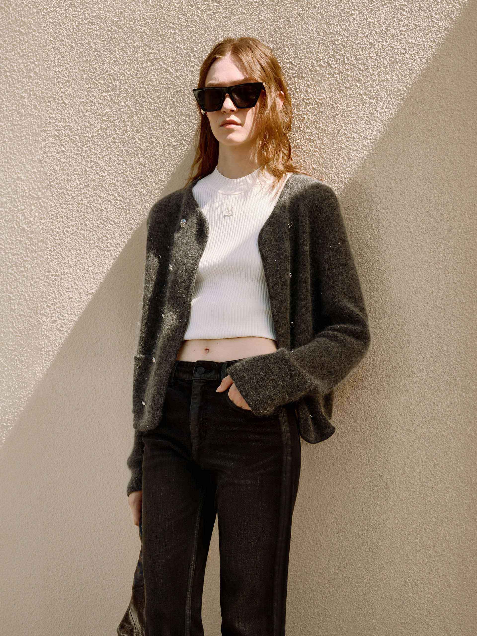 This cardigan is an effortless and refined addition to any transitional wardrobe. Made from a wool mohair blend and other fibers, it offers a fluffy touch and features metallic buttons. With its cropped cut, this cardigan is perfect for layering and adding a touch of sophistication to any outfit.