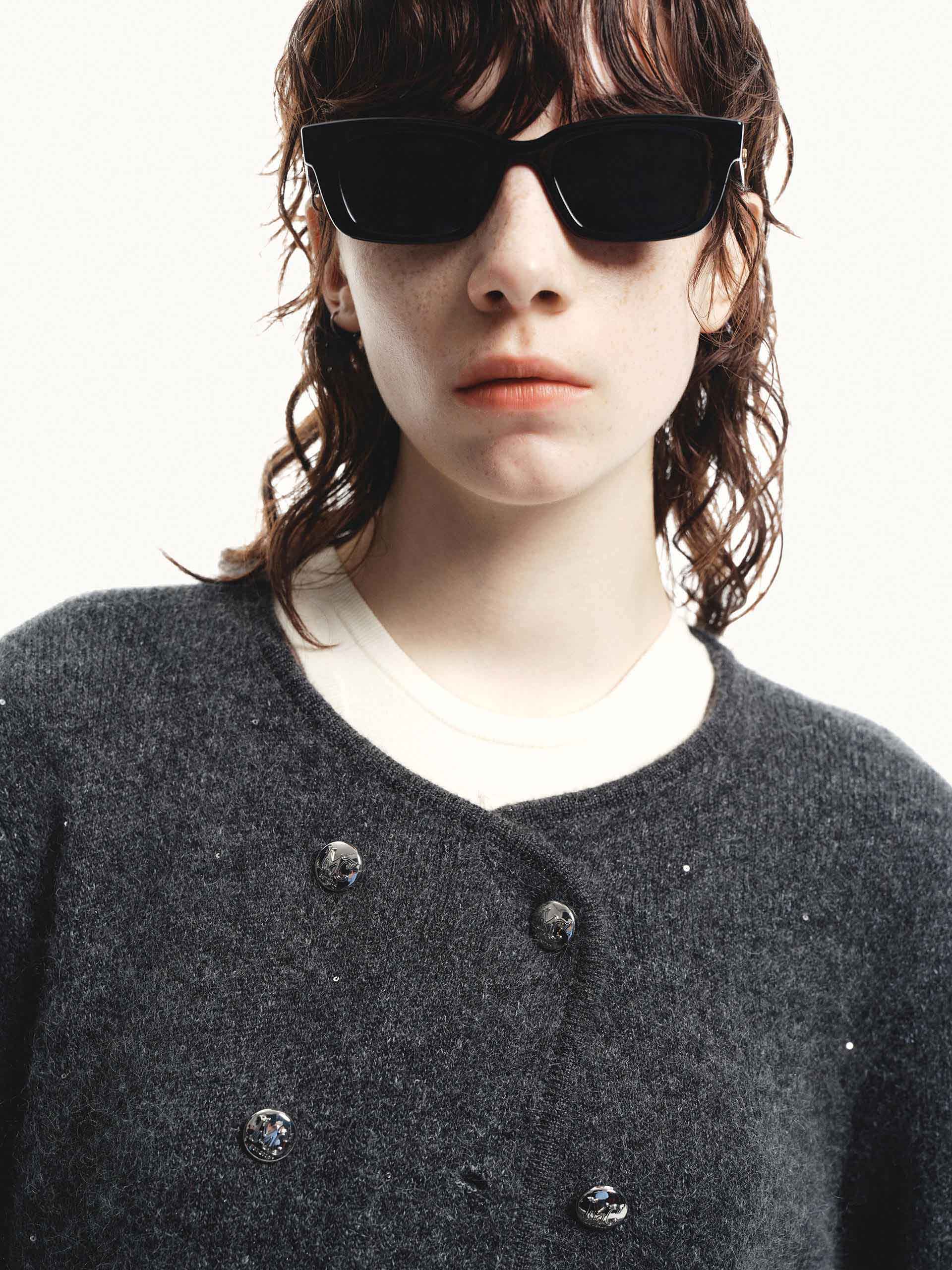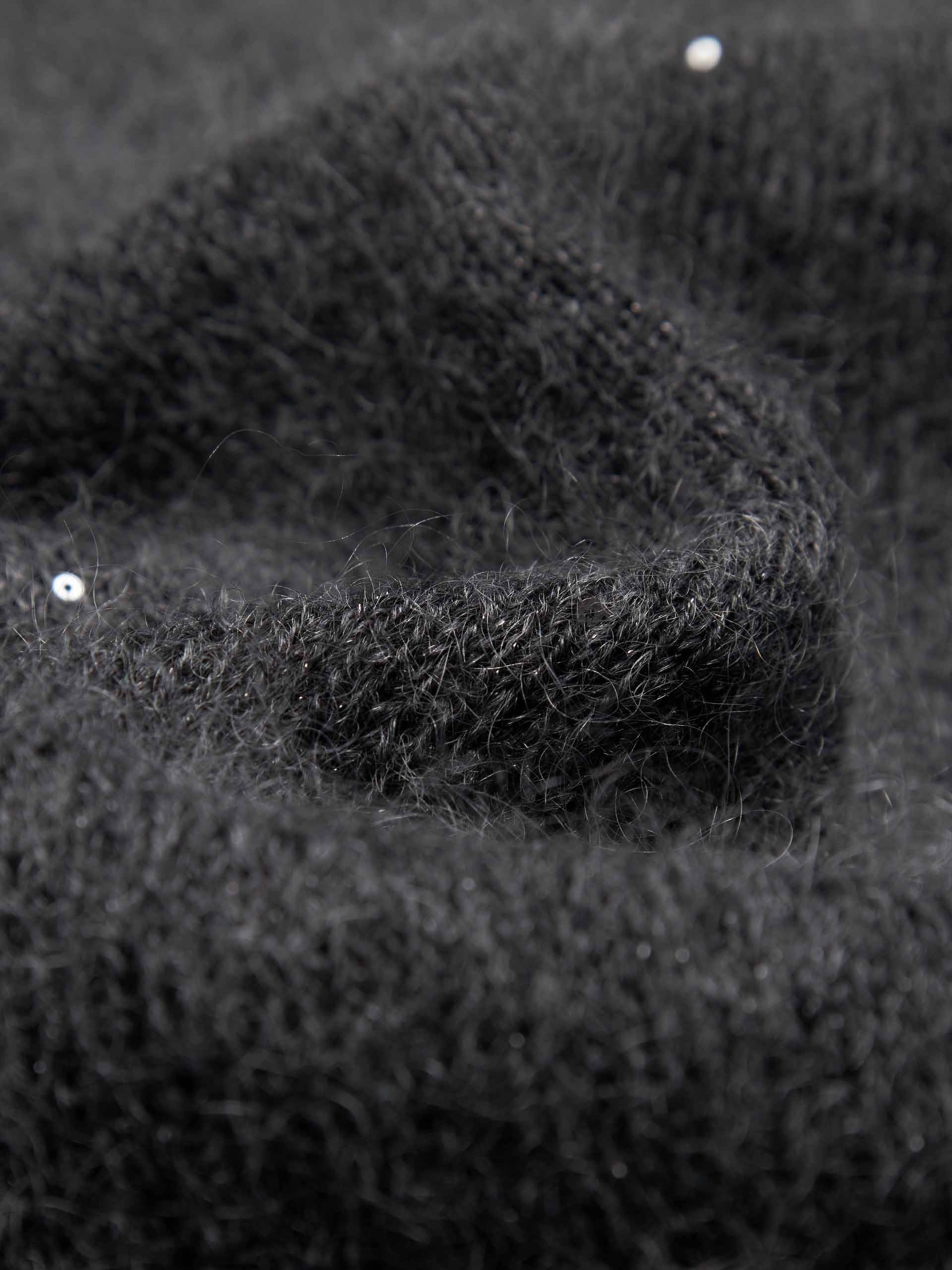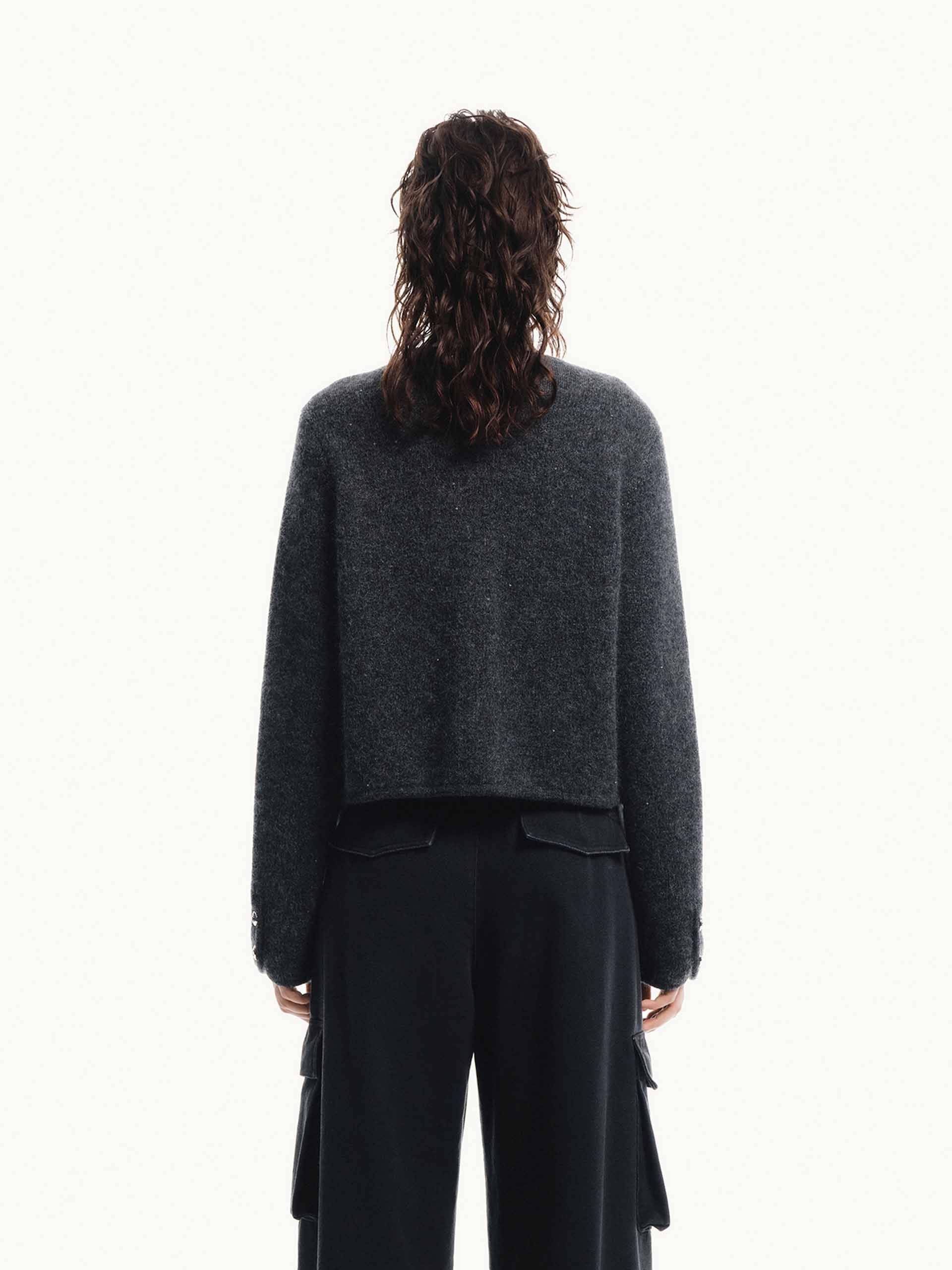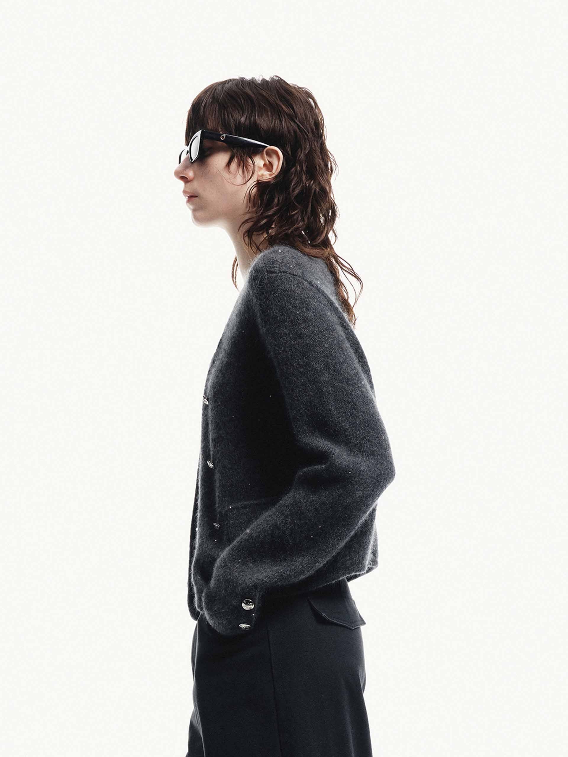 This cardigan is an effortless and refined addition to any transitional wardrobe. Made from a wool mohair blend and other fibers, it offers a fluffy touch and features metallic buttons. With its cropped cut, this cardigan is perfect for layering and adding a touch of sophistication to any outfit.