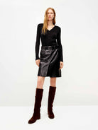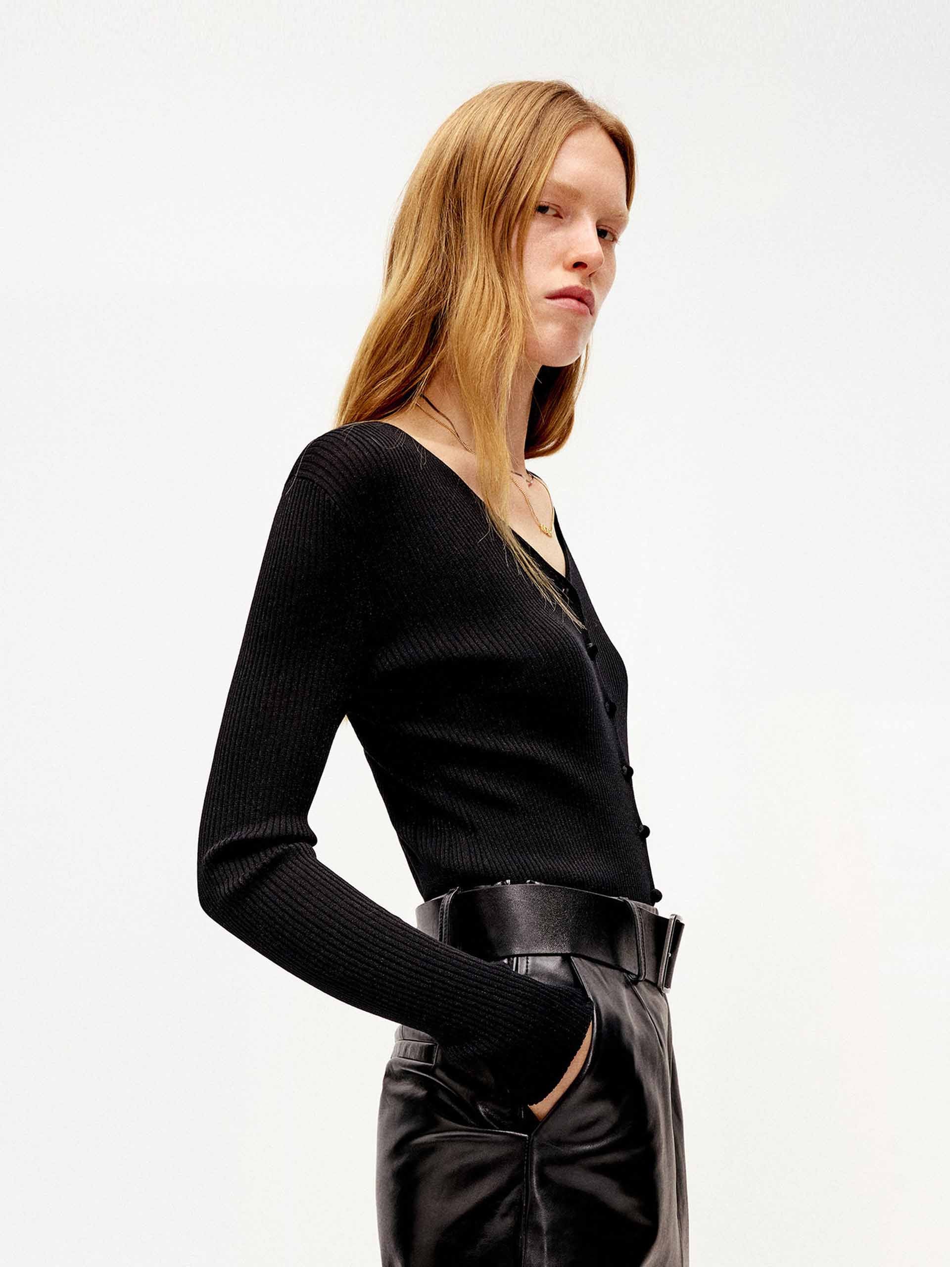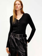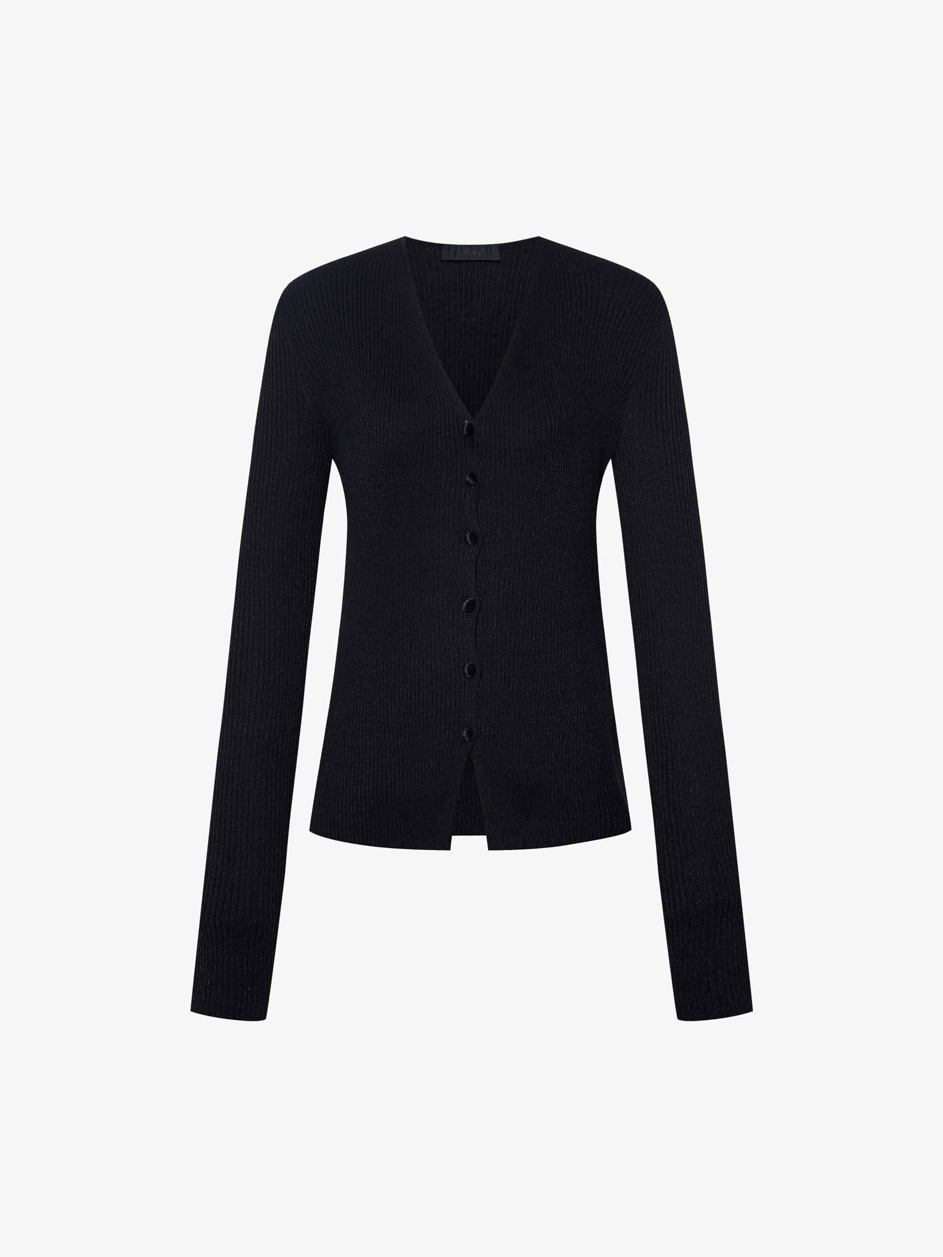 Made from a premium blend of Lyocell, this cardigan delivers a subtle shimmer and exceptional comfort. Its sleek silhouette contours the body for a polished and flattering fit, while the classic V-neckline and subtle button closure detail provide timeless appeal. The statement back metal patch design introduces a distinctive contemporary accent, contrasting beautifully with the overall softness.