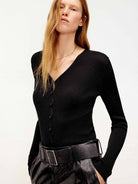 - V-neck and button closure detail