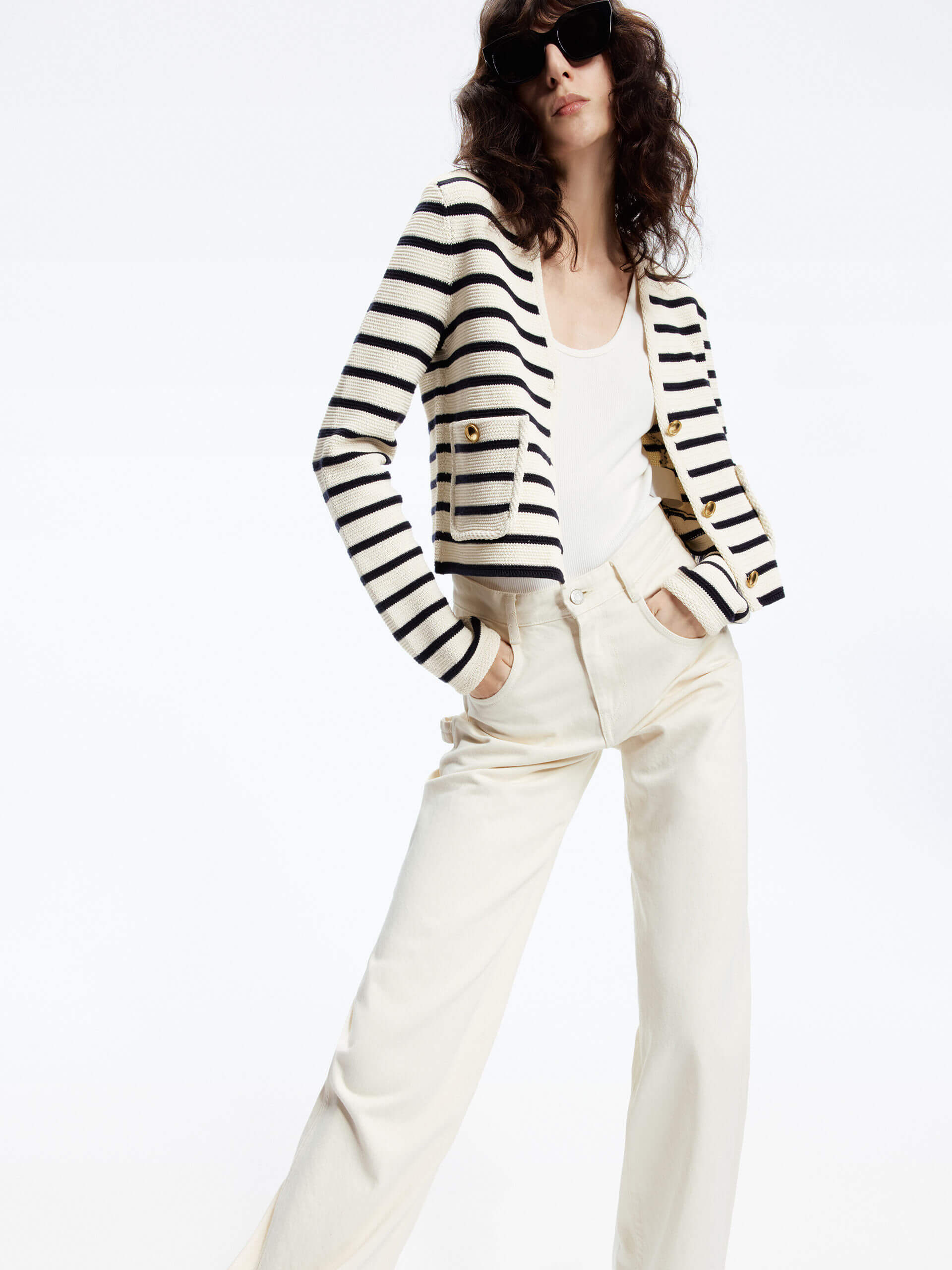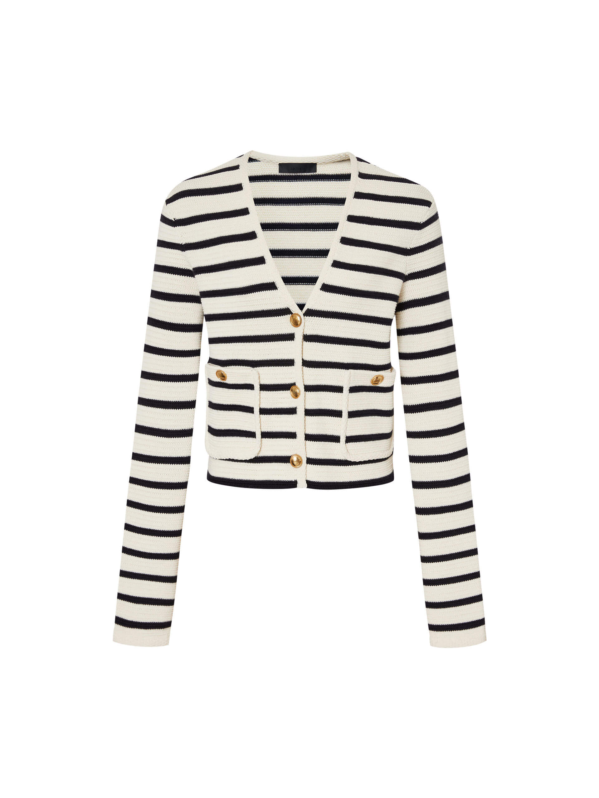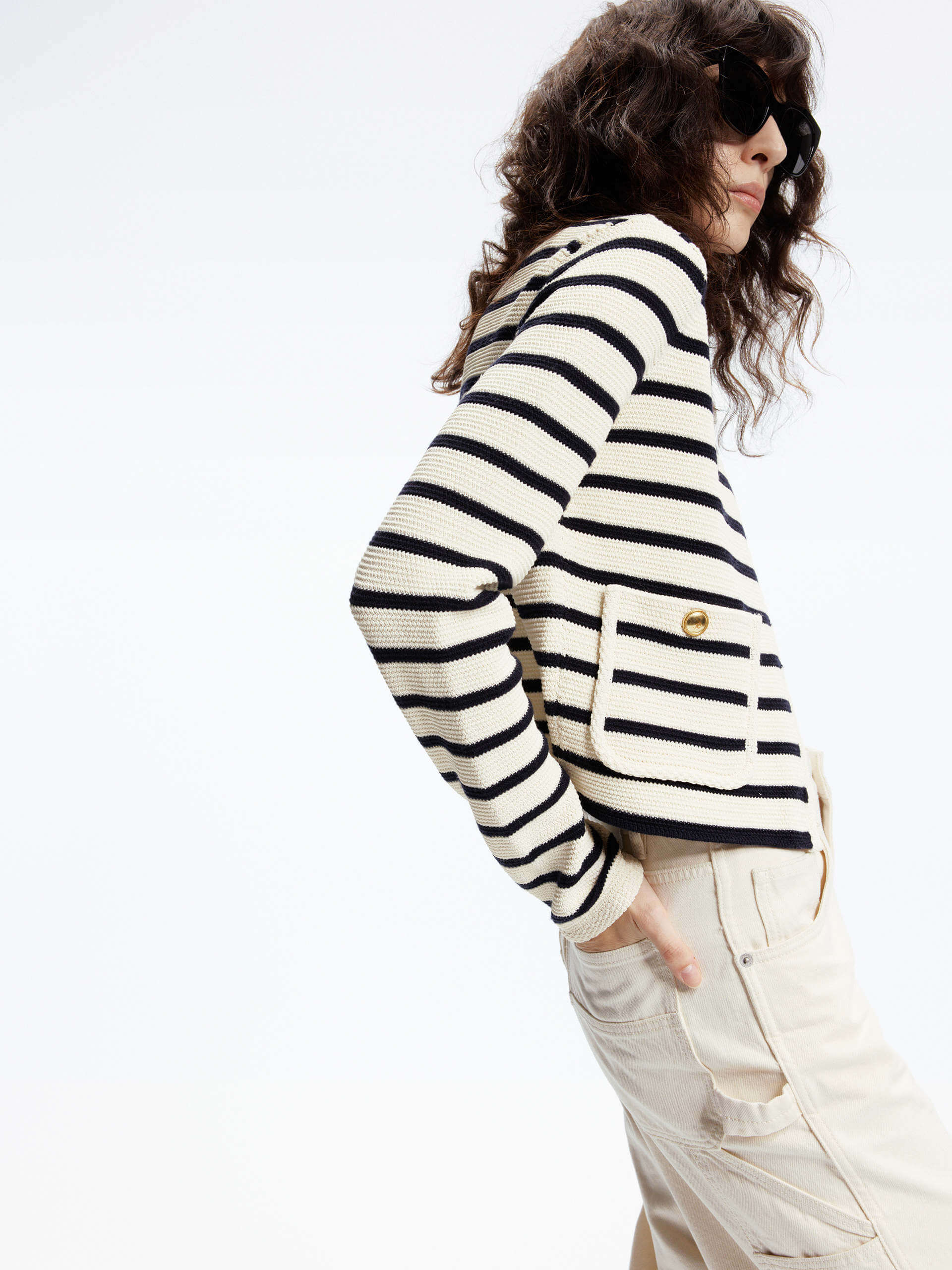 Made with a blend of fine wool, this short-cut cardigan features a classic striped design that exudes sophistication. Perfect for layering in the spring, it will keep you looking chic and feeling cozy all season long.