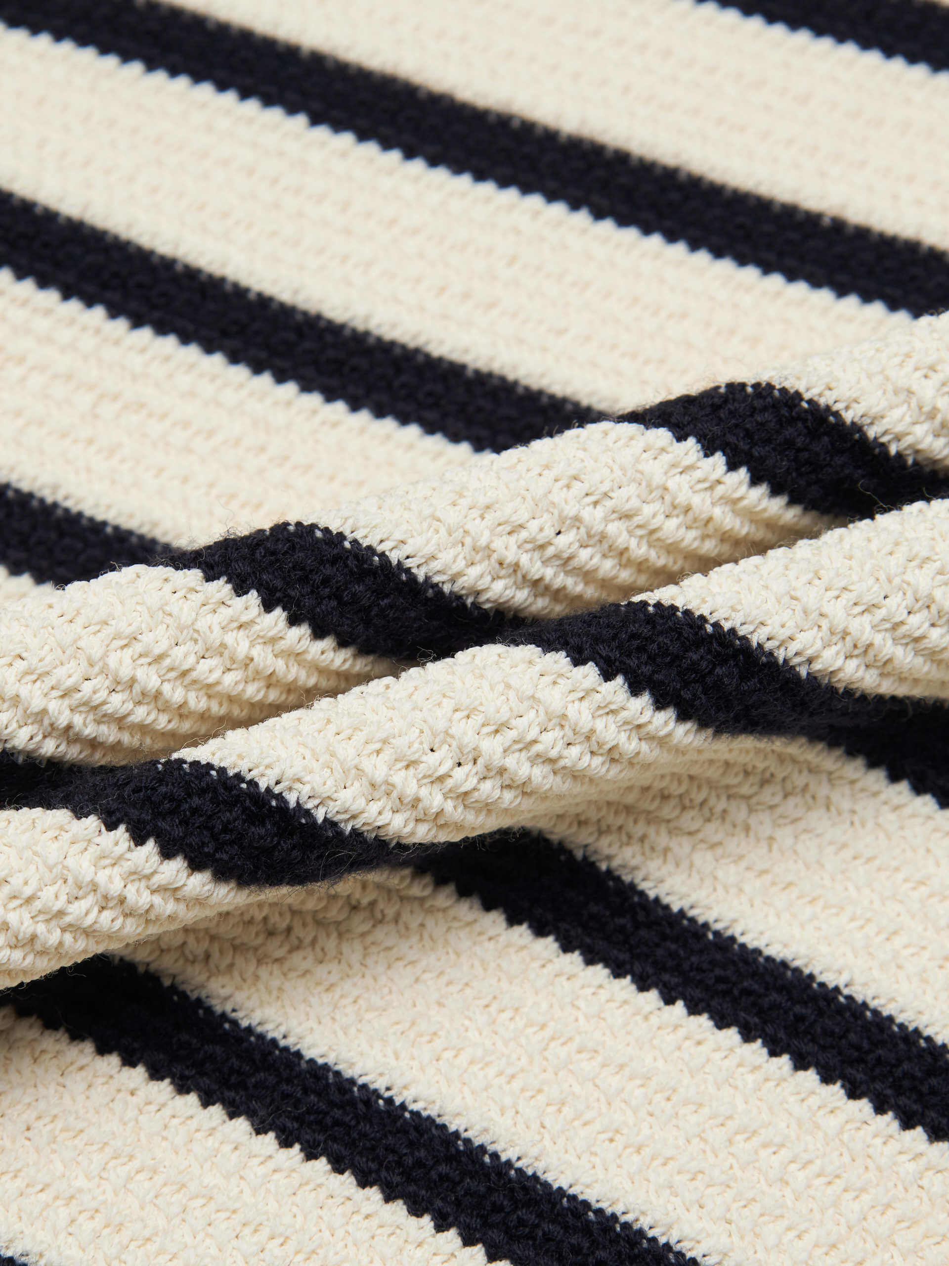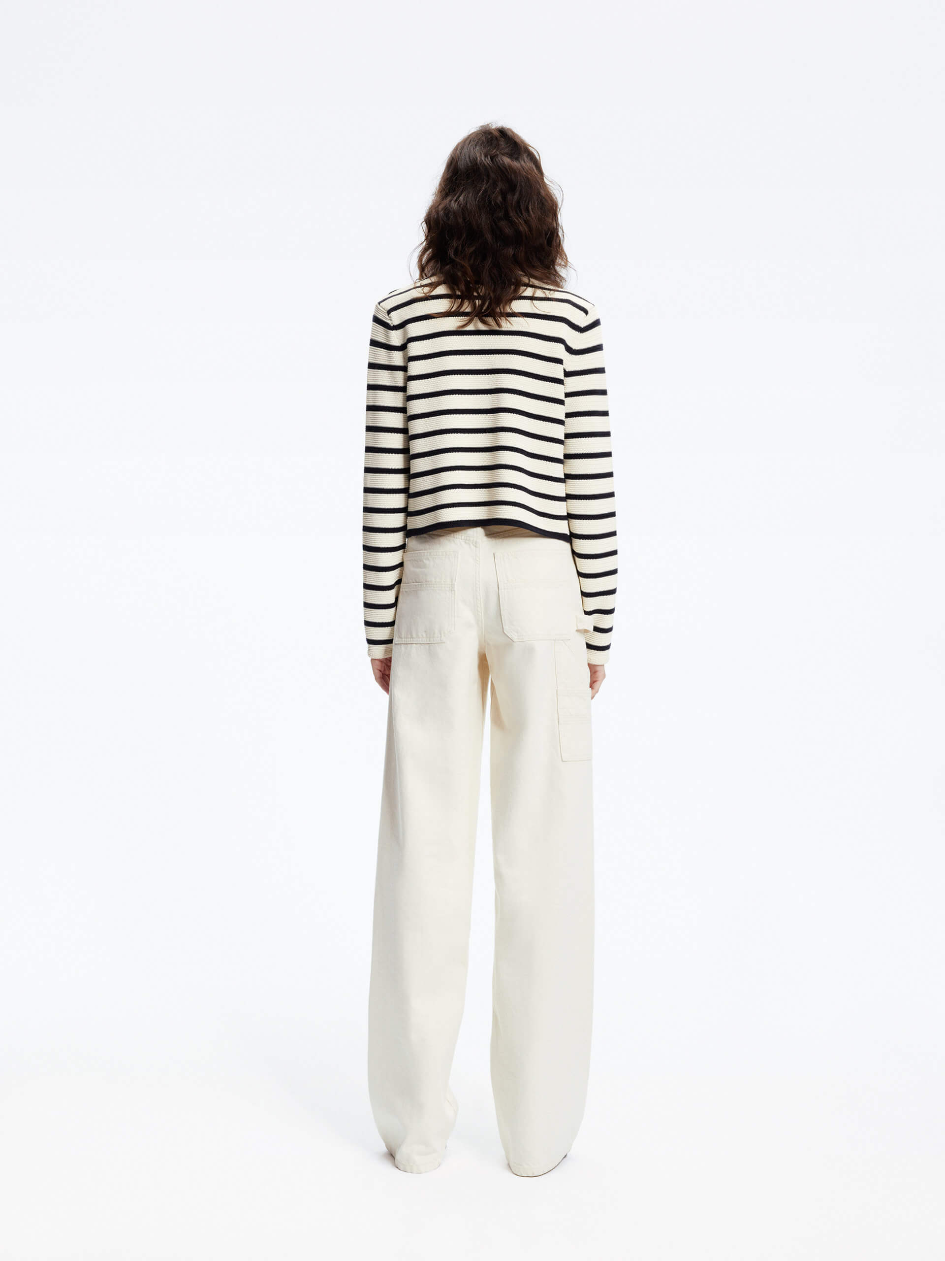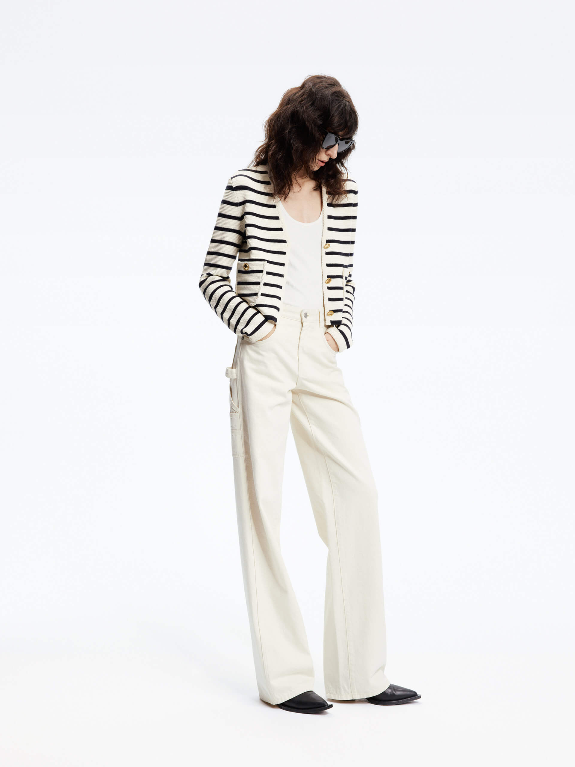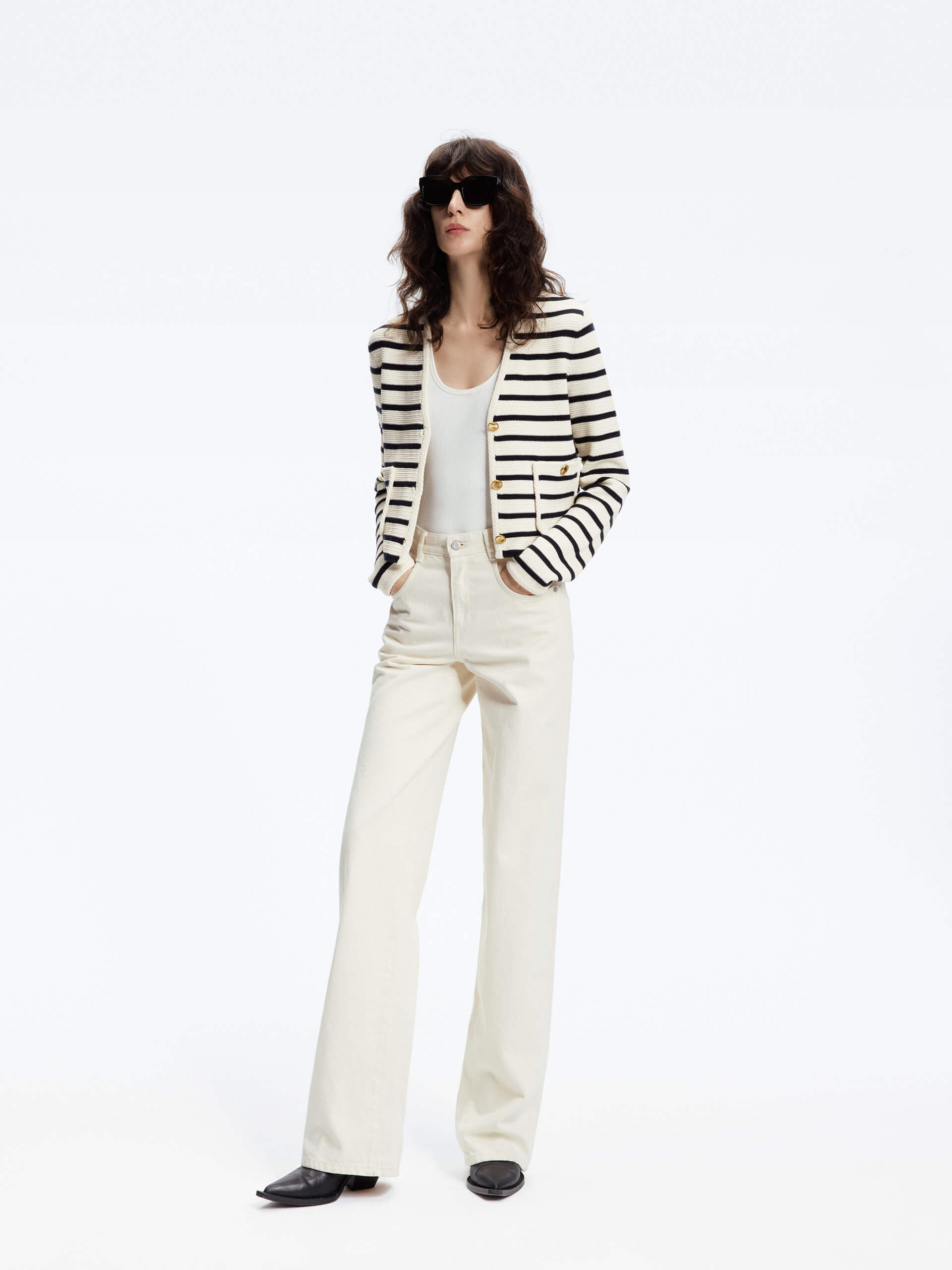 Made with a blend of fine wool, this short-cut cardigan features a classic striped design that exudes sophistication. Perfect for layering in the spring, it will keep you looking chic and feeling cozy all season long.