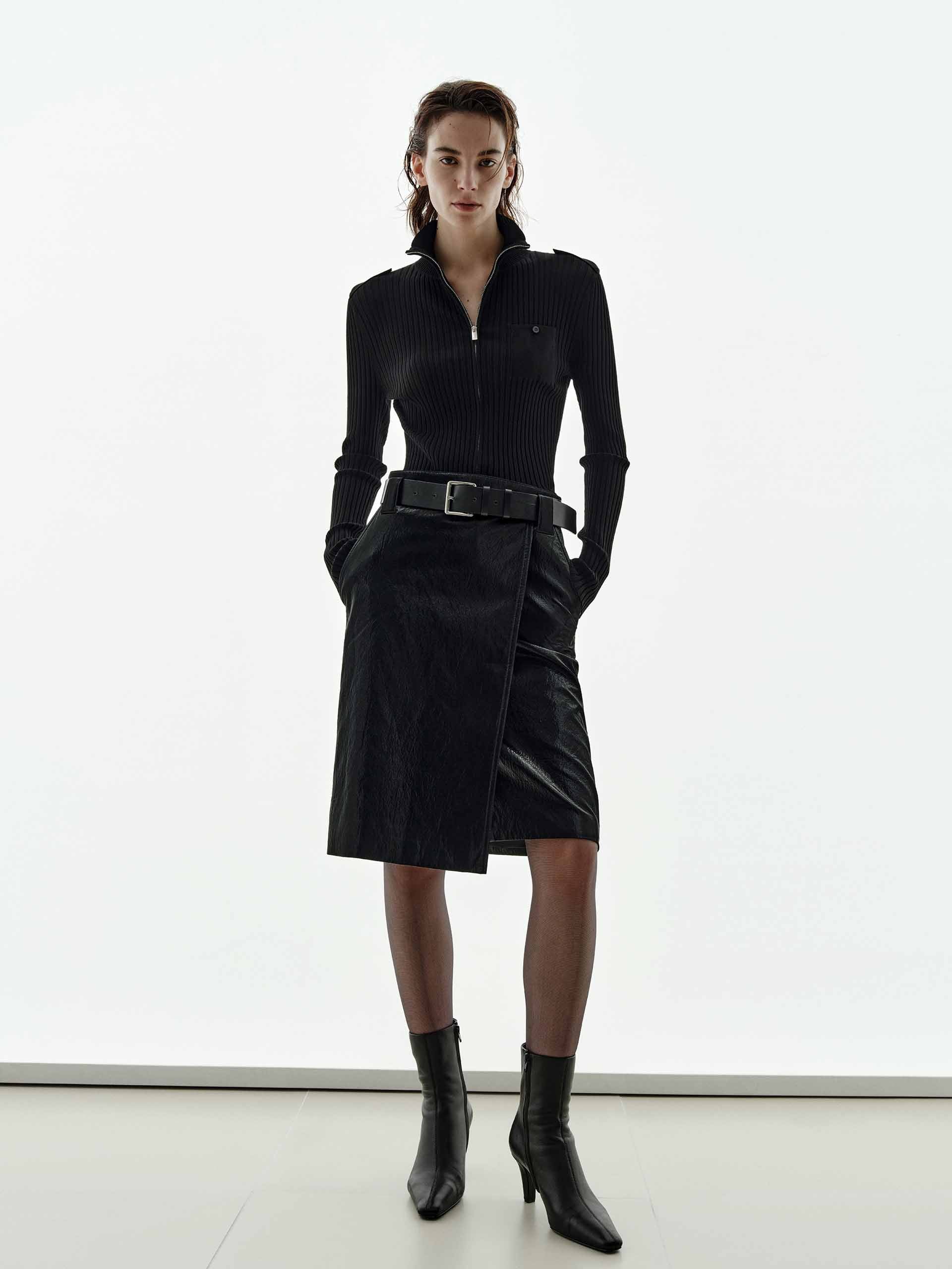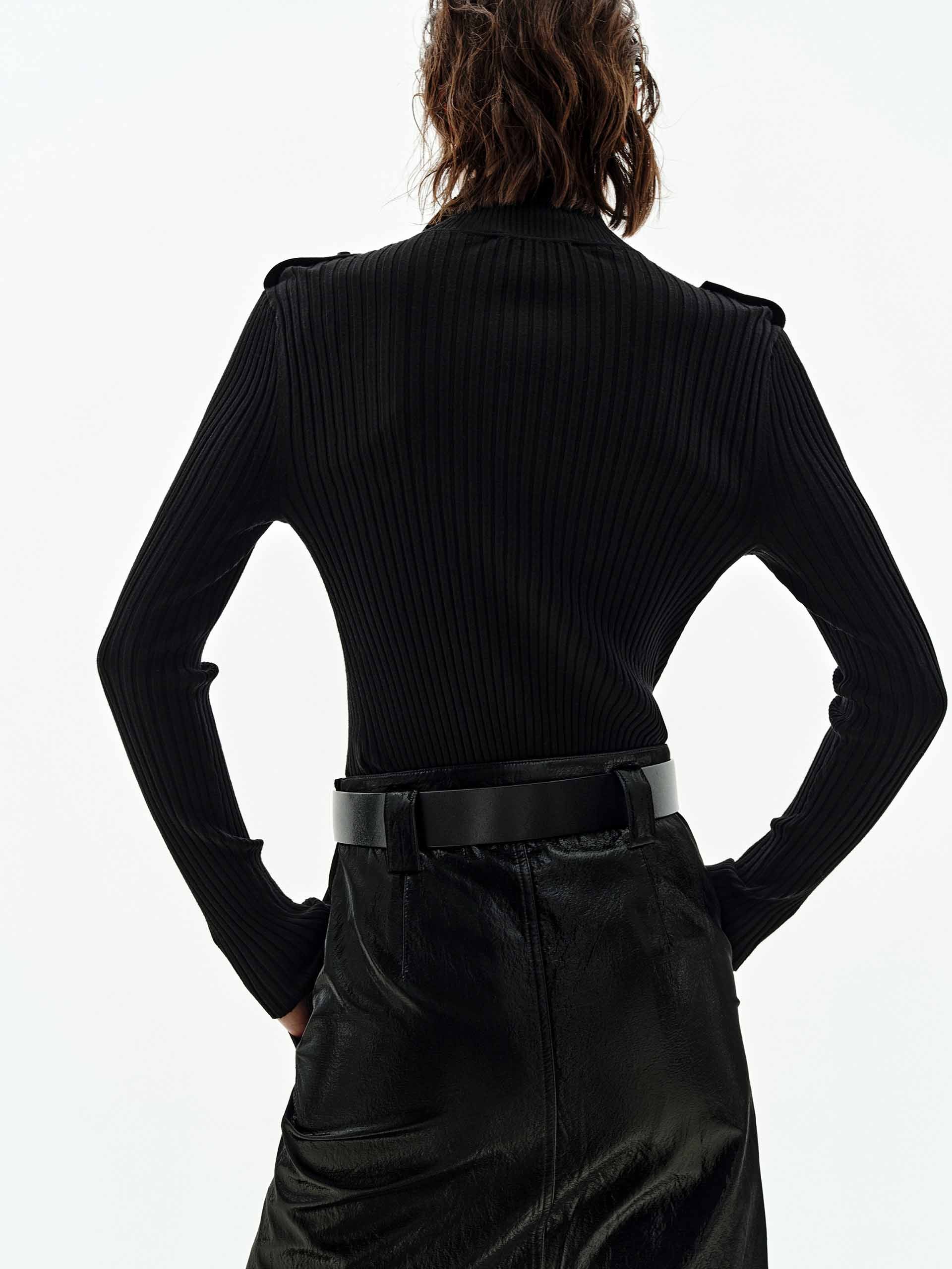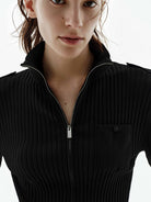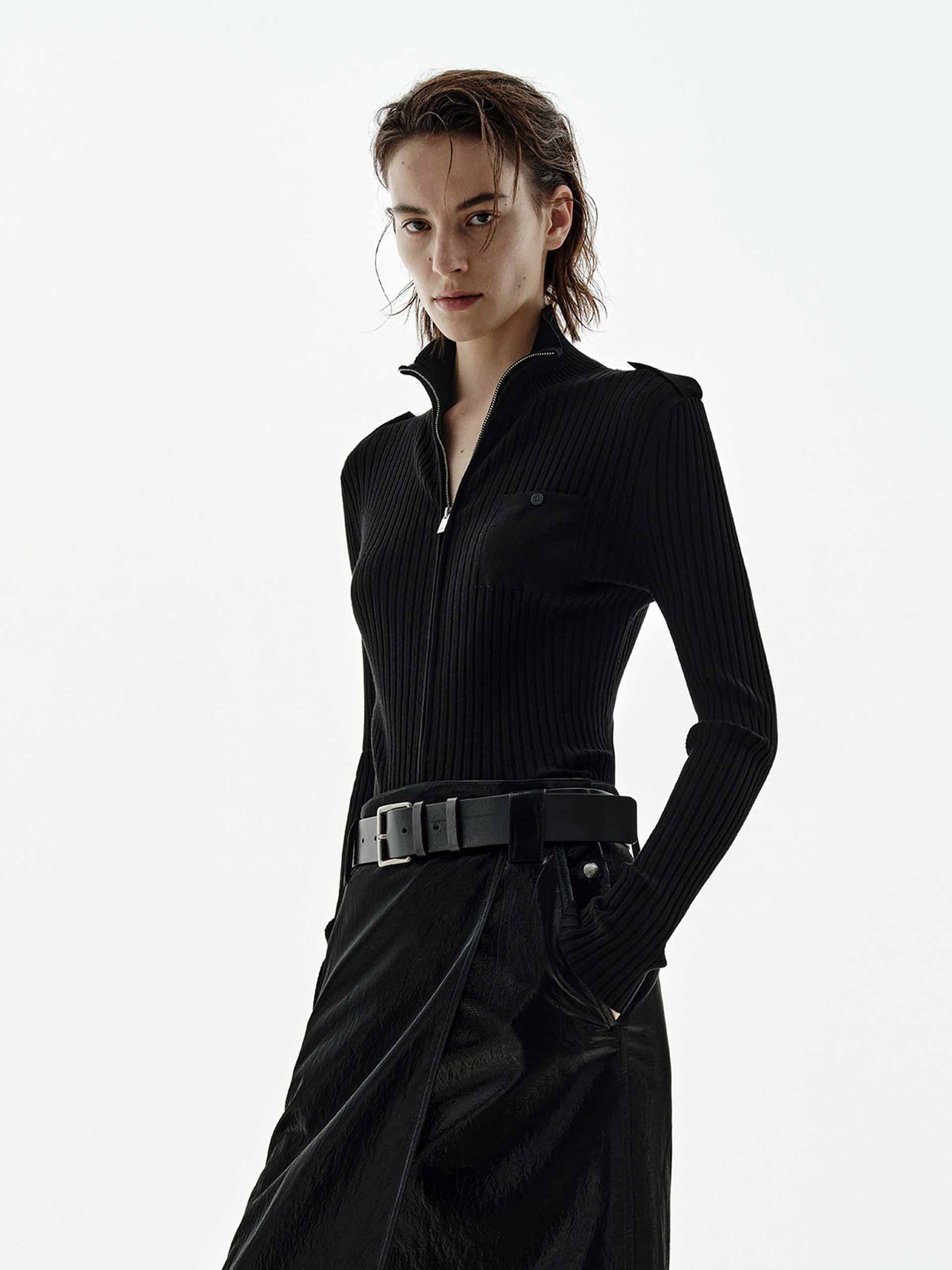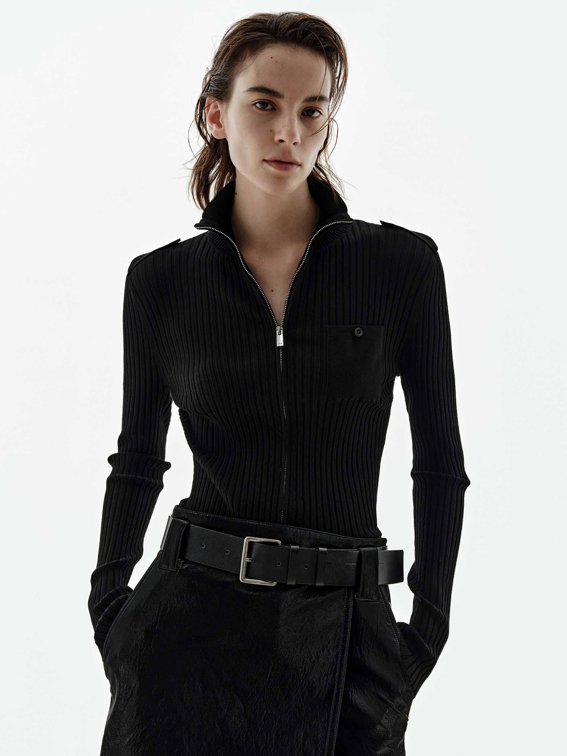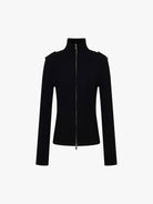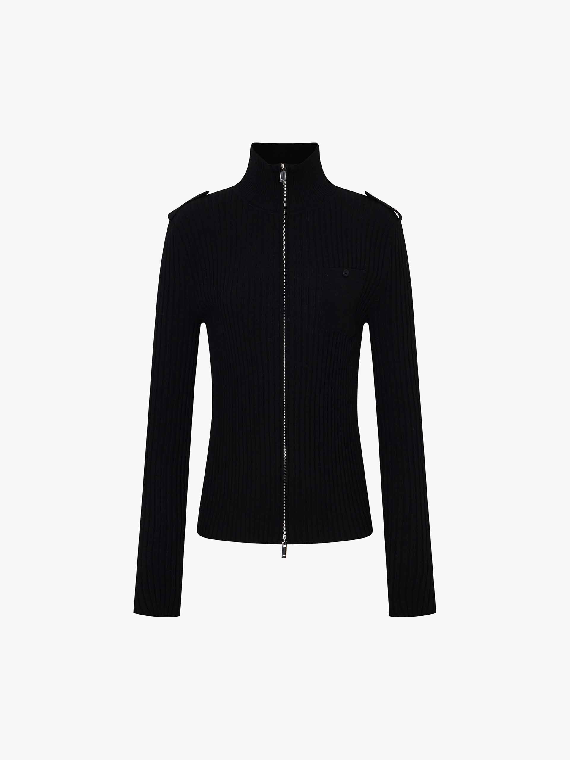 Embrace a perfect blend of modern style and practical design with our cardigan. This piece features a sleek slim fit that is beautifully accentuated by an all-over ribbed knitted design for a flattering, textured look. The versatile two-way zip closure and a convenient chest pocket offer functional everyday wear, while the sophisticated button shoulder tabs add a unique, tailored detail for a polished finish.