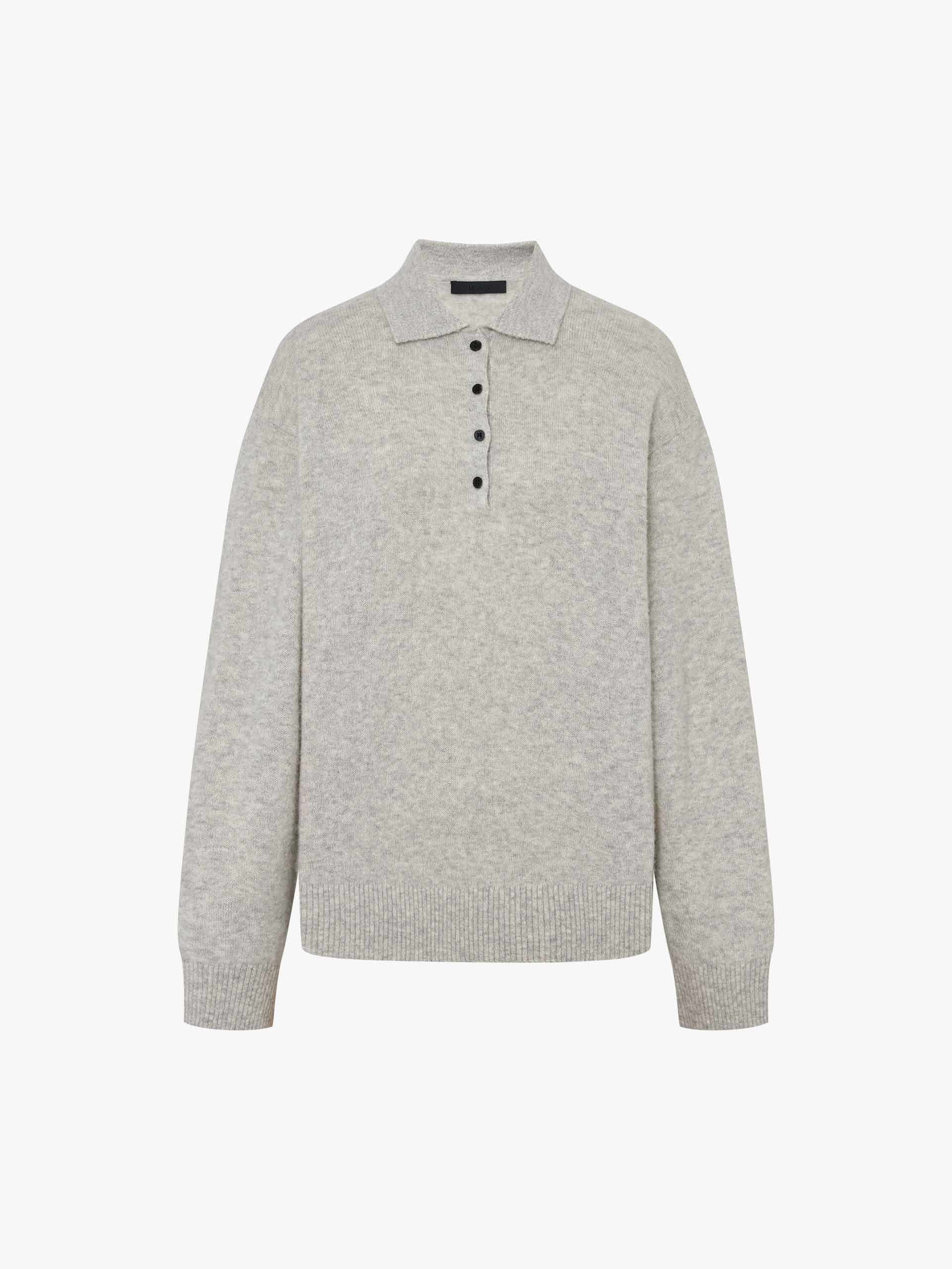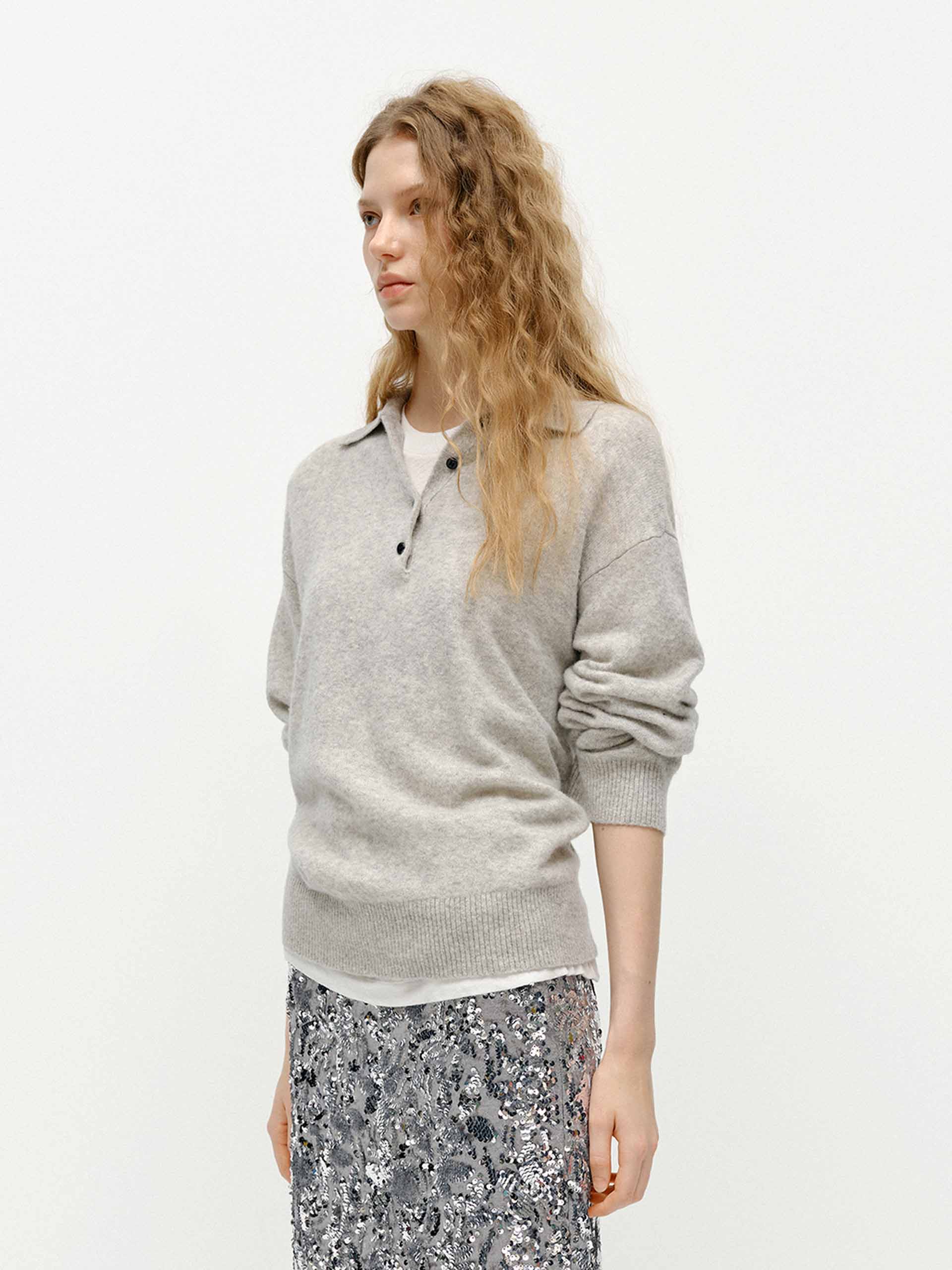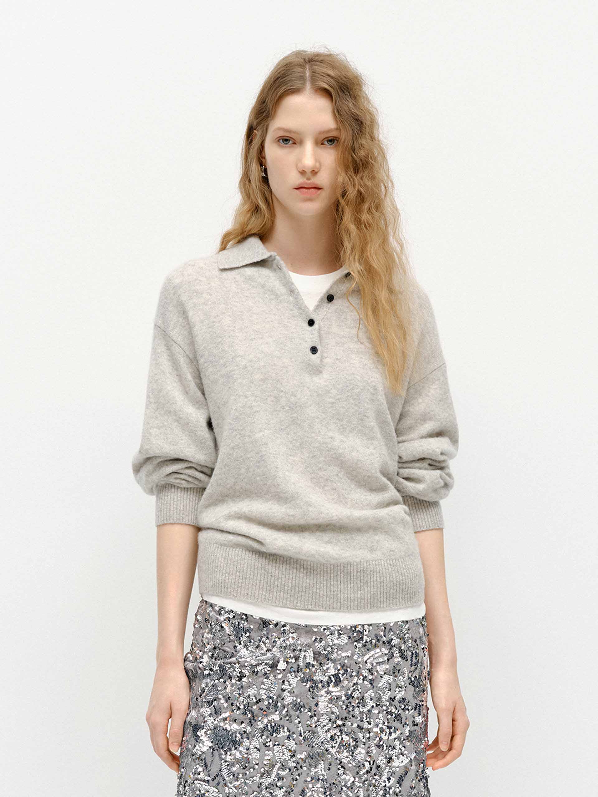 This sweater is made from lightweight and soft wool, cashmere and silk, it features a classic polo collar and half-button detail. Perfect for transitioning into the warmer seasons while staying fashionable.