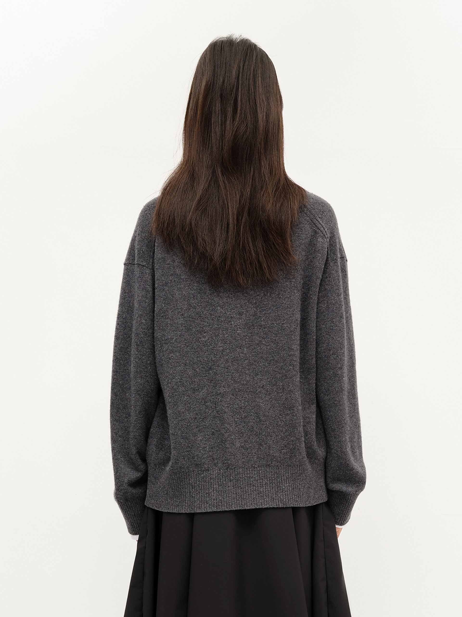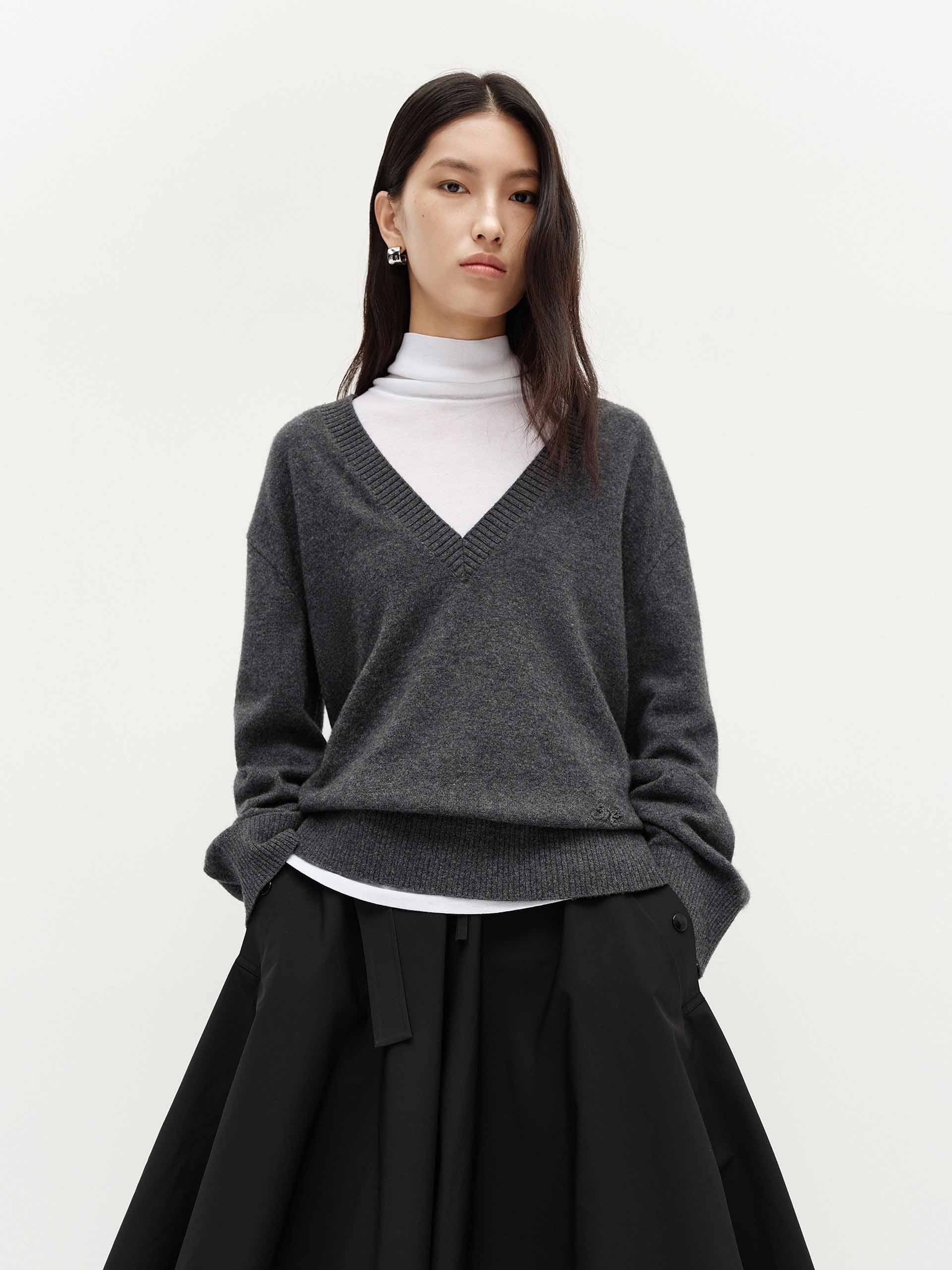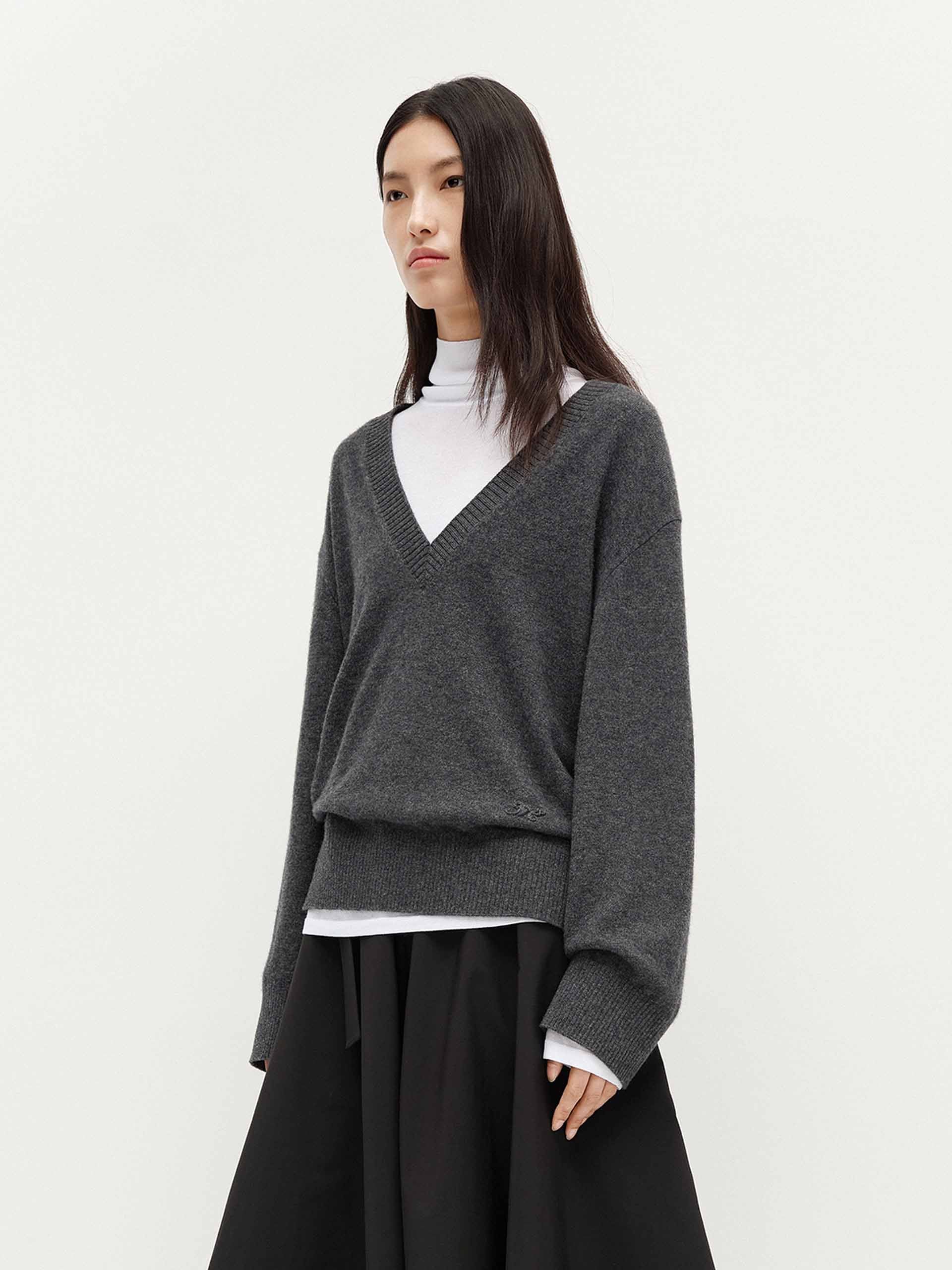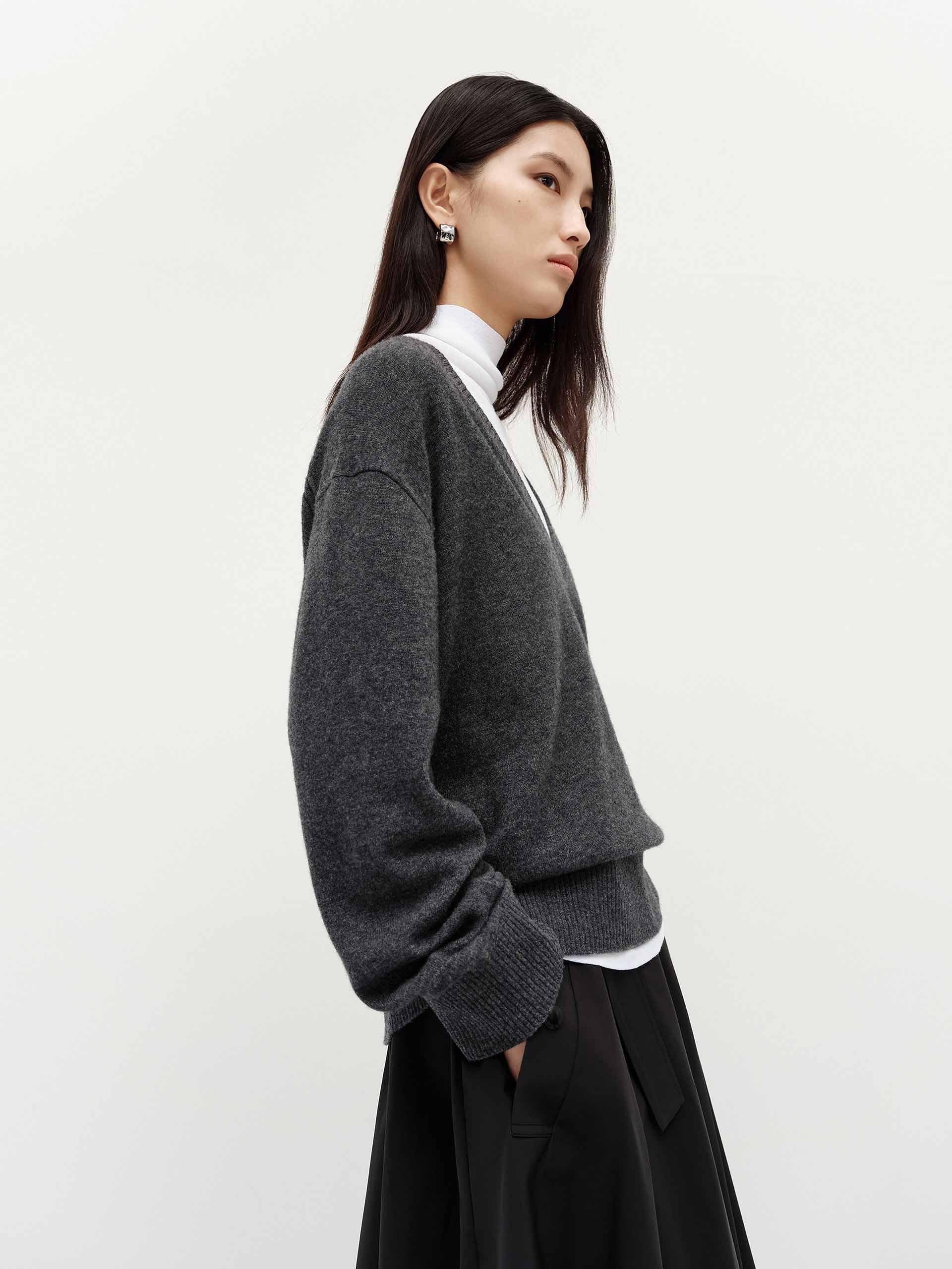 This sweater is a must-have for spring-season days, crafted from luxurious warm wool and cashmere. Its loose fit allows for easy layering over turtlenecks, while the V-neck and drop shoulder add a touch of effortless style.
