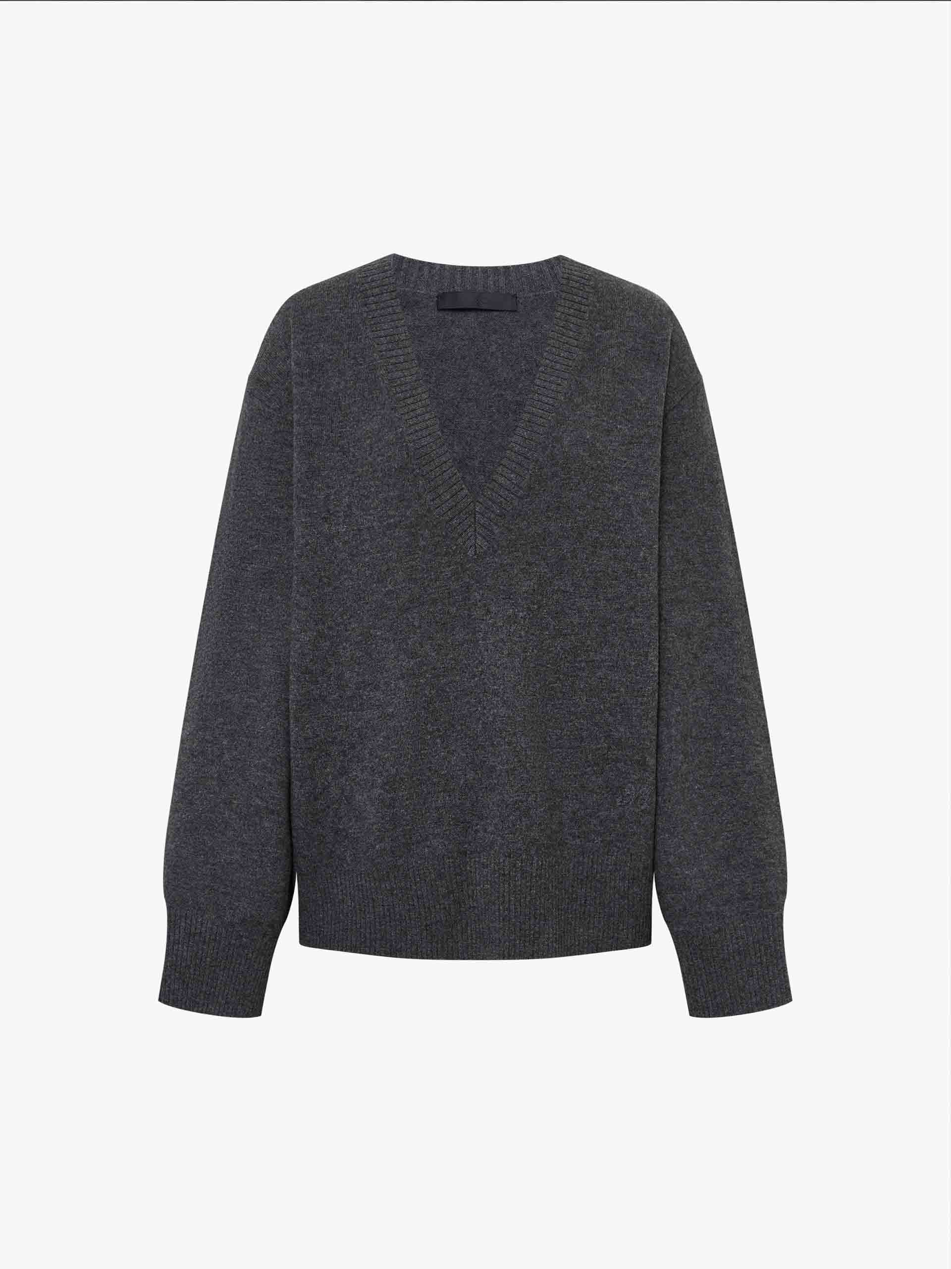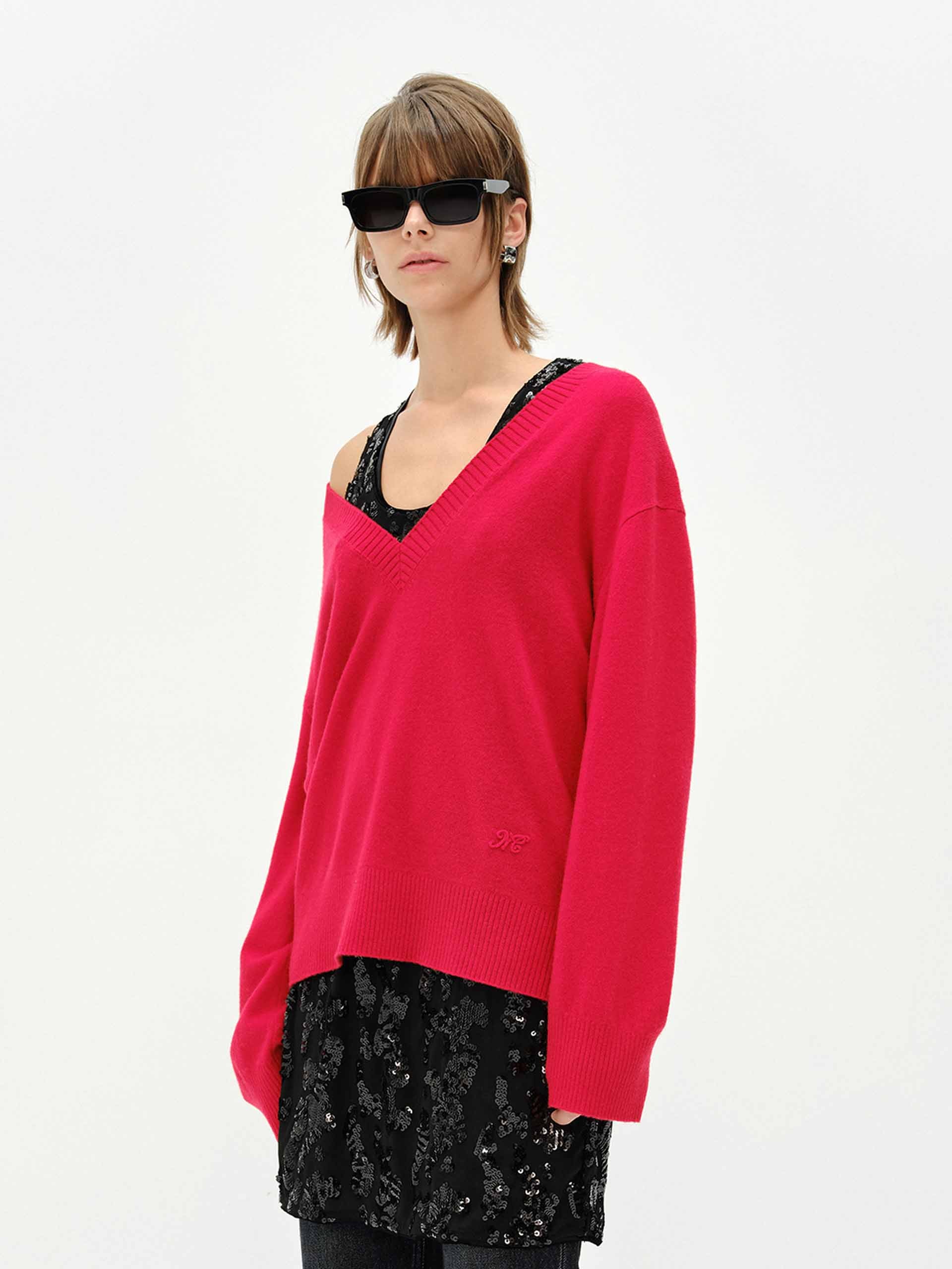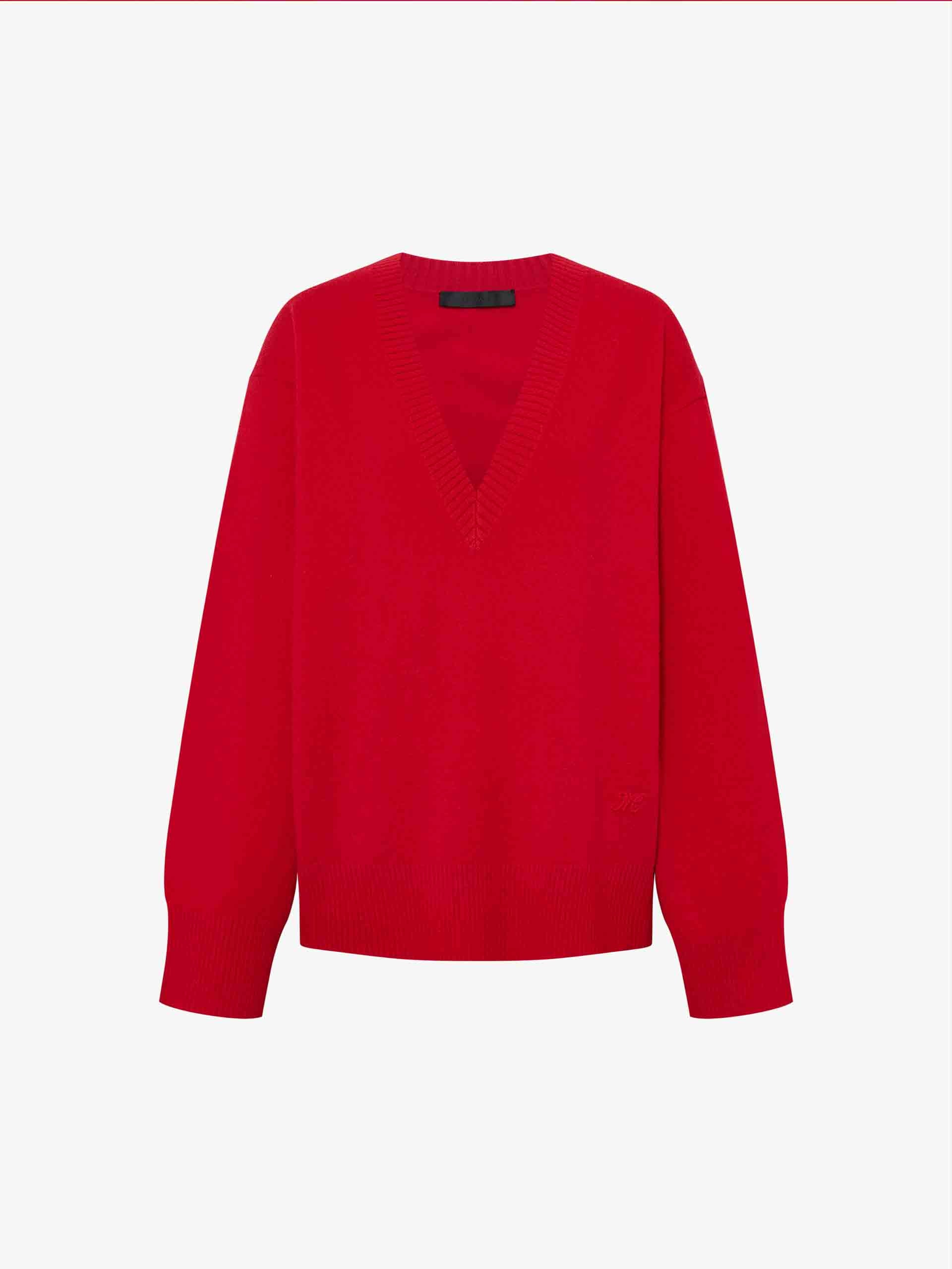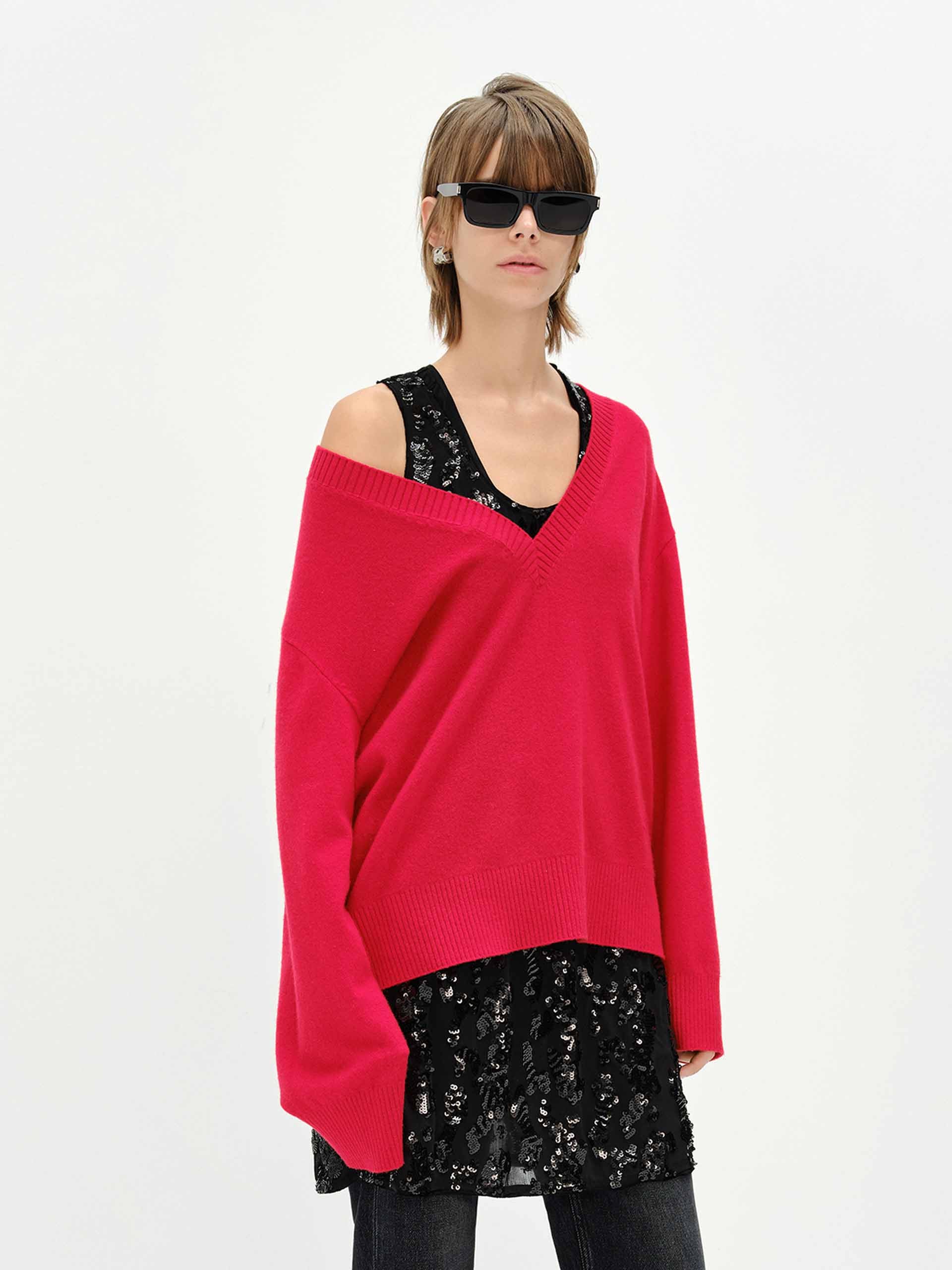 This sweater is a must-have for spring-season days, crafted from luxurious warm wool and cashmere. Its loose fit allows for easy layering over turtlenecks, while the V-neck and drop shoulder add a touch of effortless style.