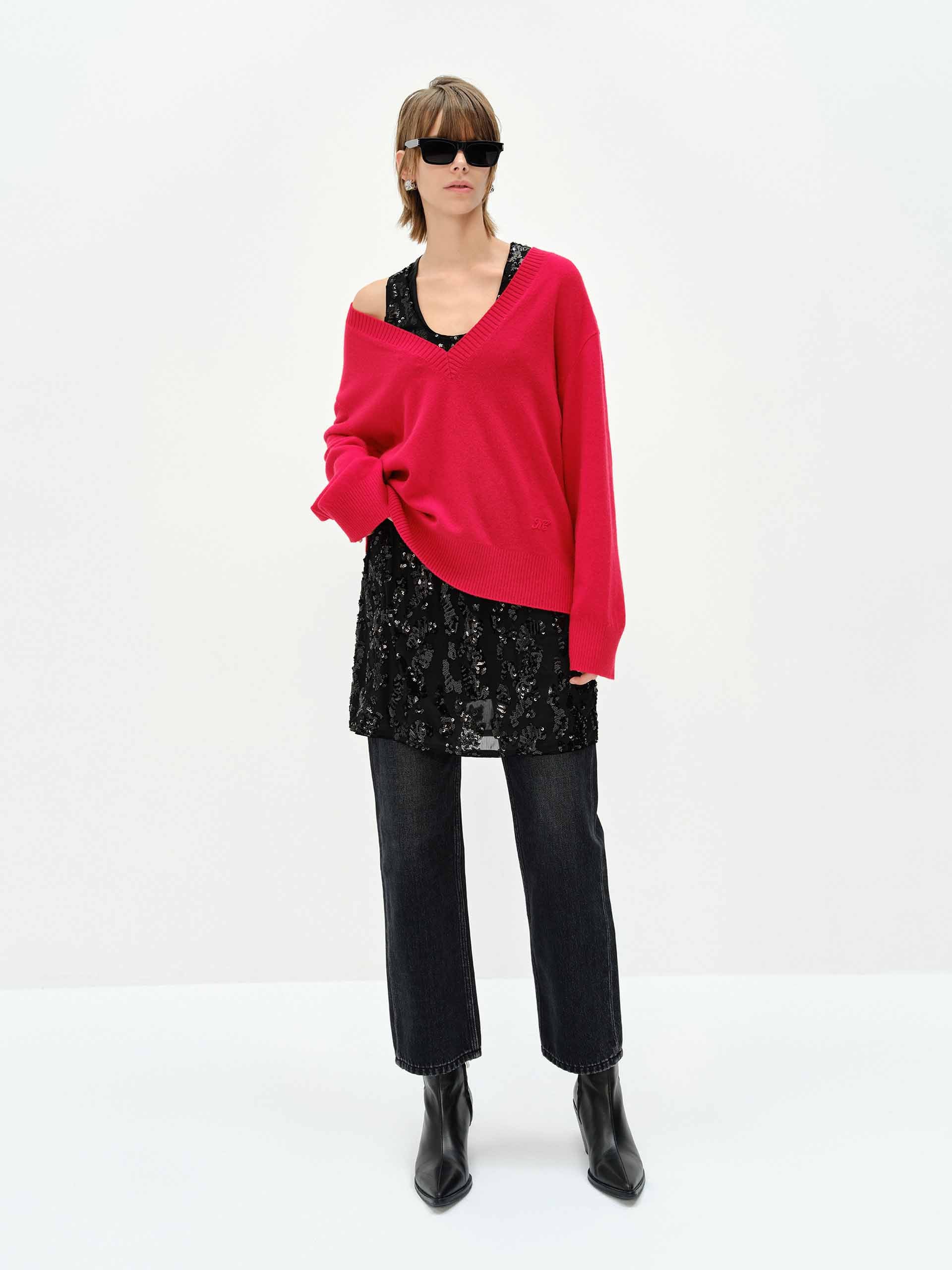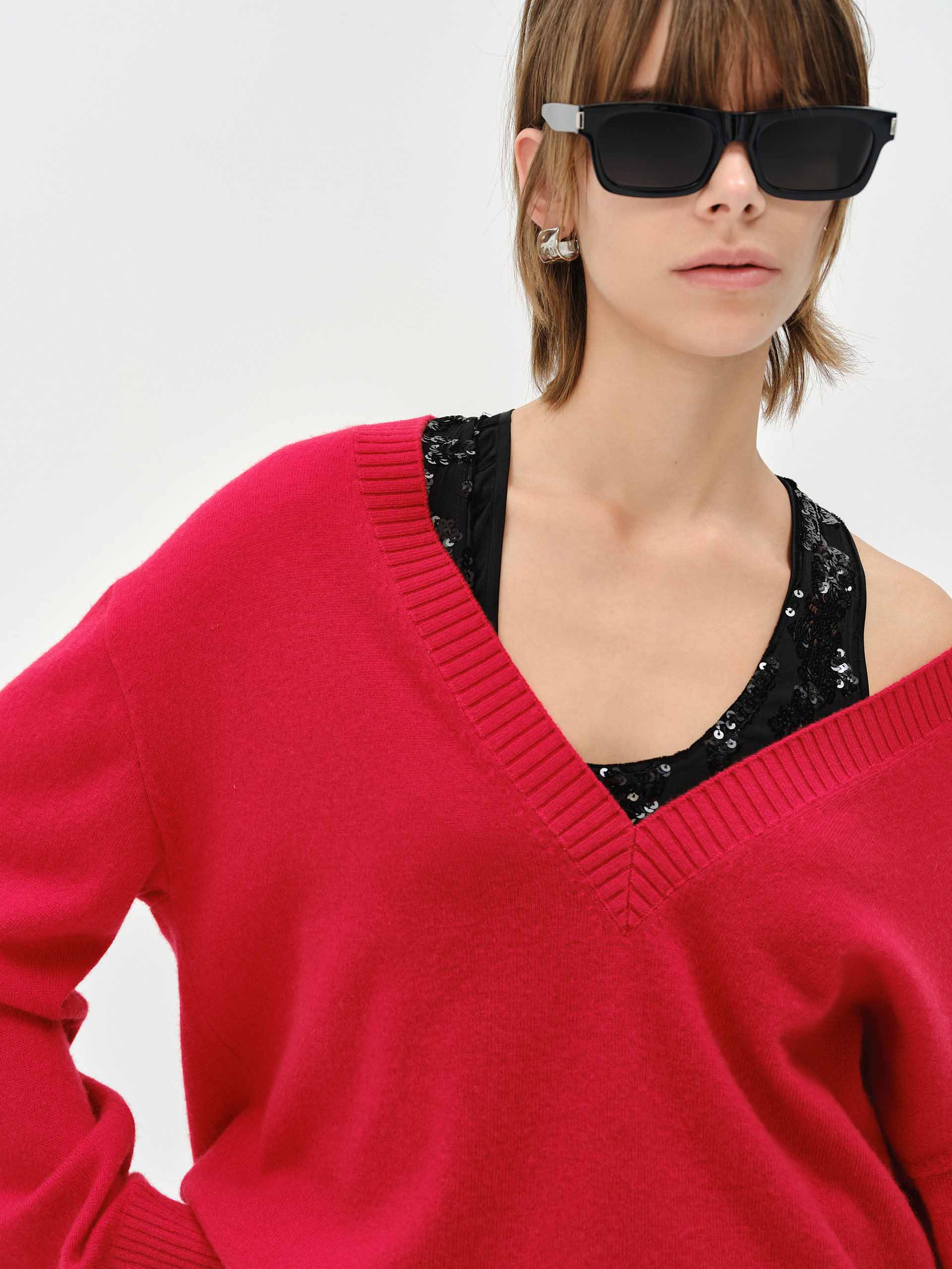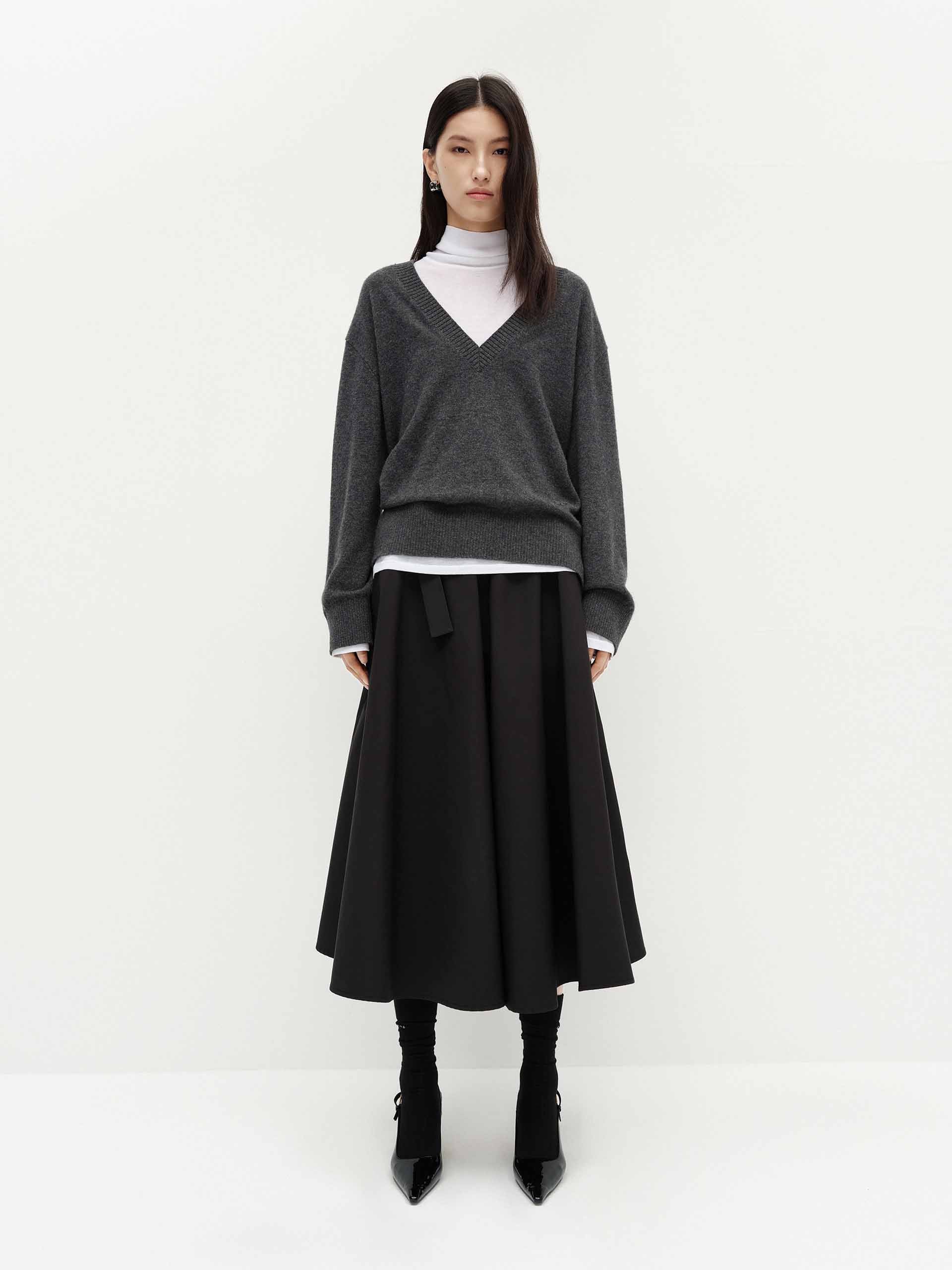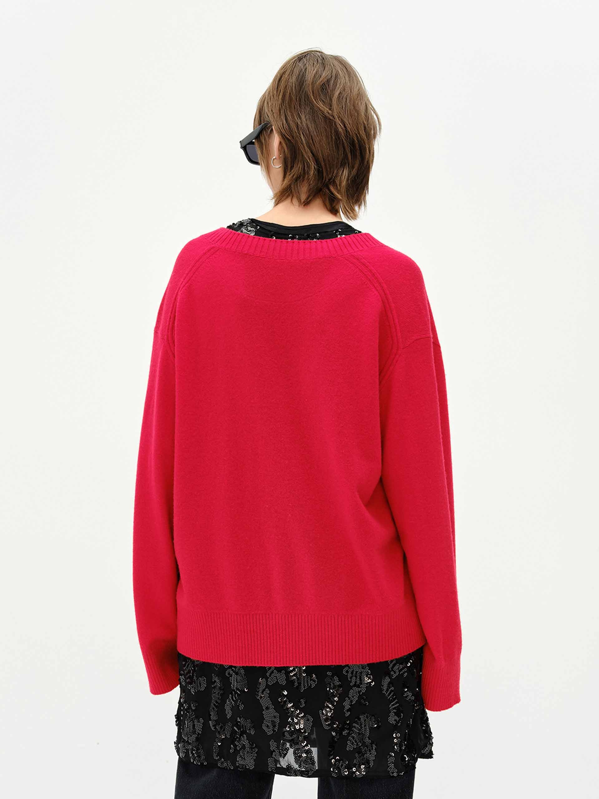 This sweater is a must-have for spring-season days, crafted from luxurious warm wool and cashmere. Its loose fit allows for easy layering over turtlenecks, while the V-neck and drop shoulder add a touch of effortless style.