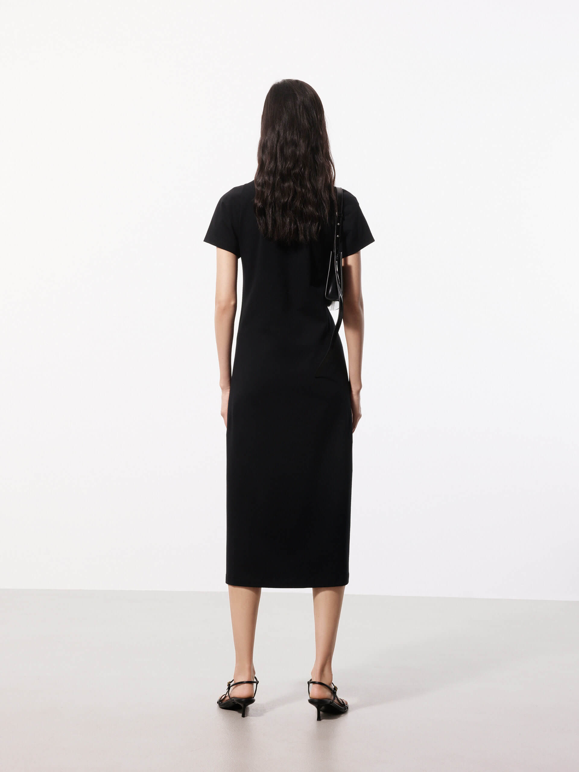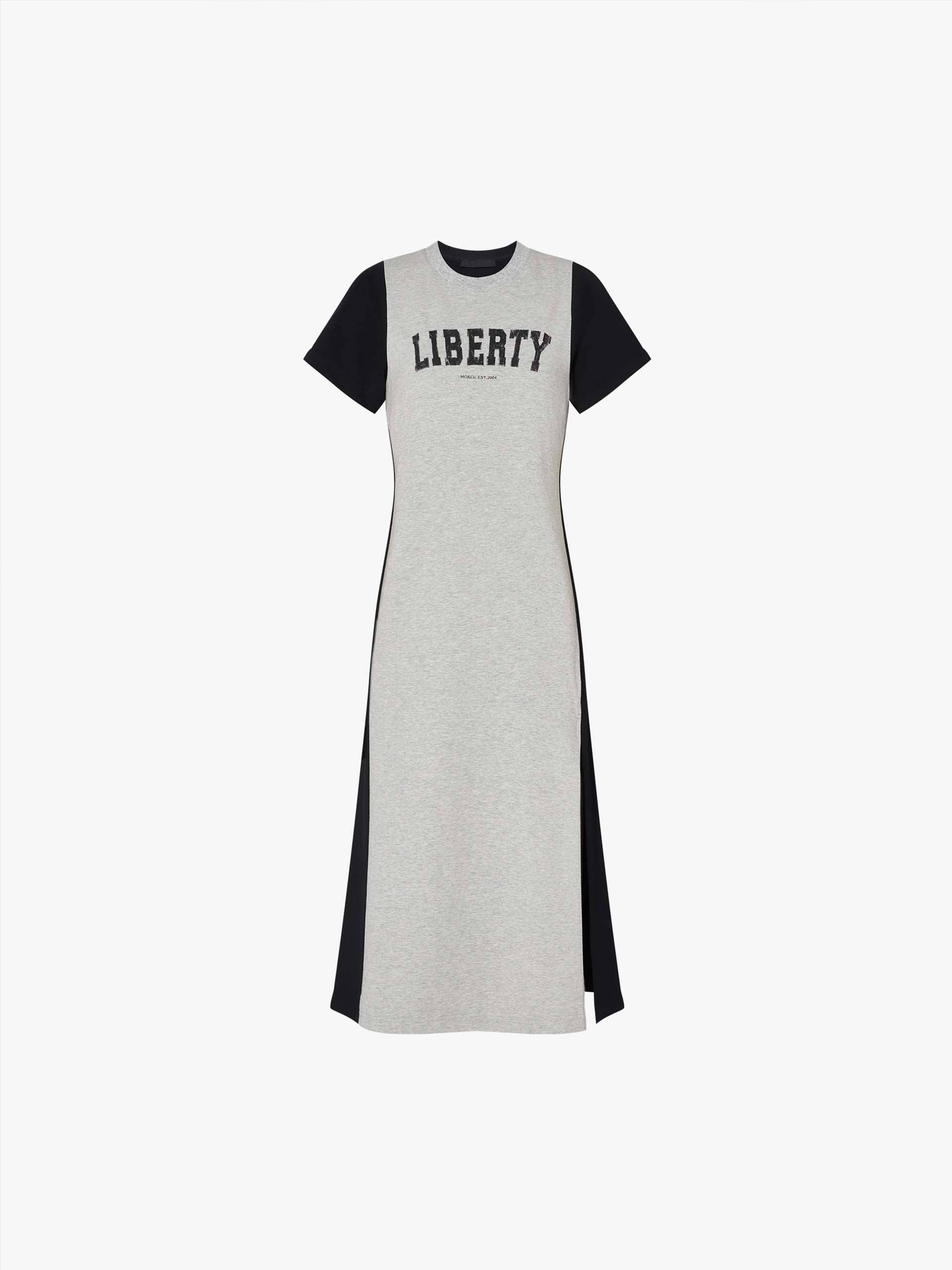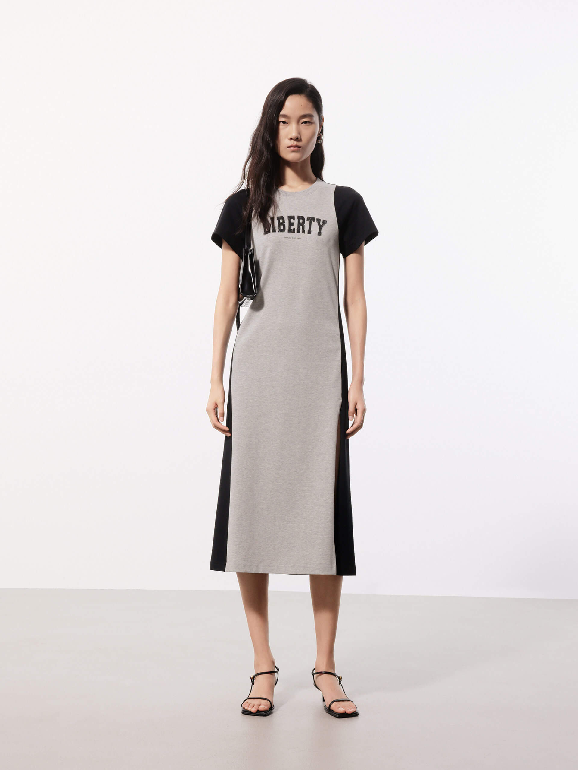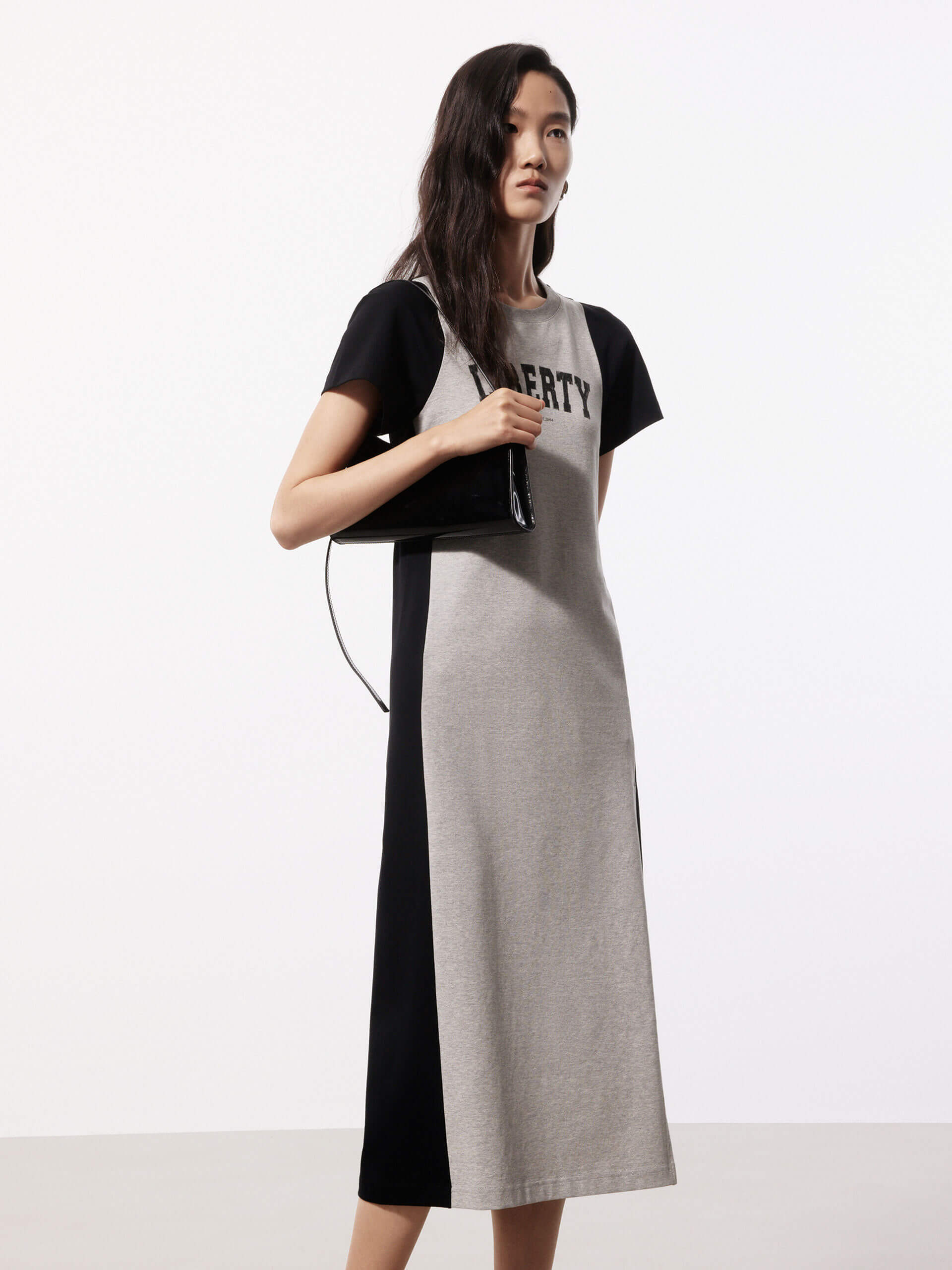 Introducing our new dress, made with a comfy blend of cotton. Comfortable stretch fabric ensures a perfect fit, while color-blocking and lettering on the chest add a touch of style. This dress features a side slit and can be worn with sandals, making it perfect for a casual yet stylish look.
