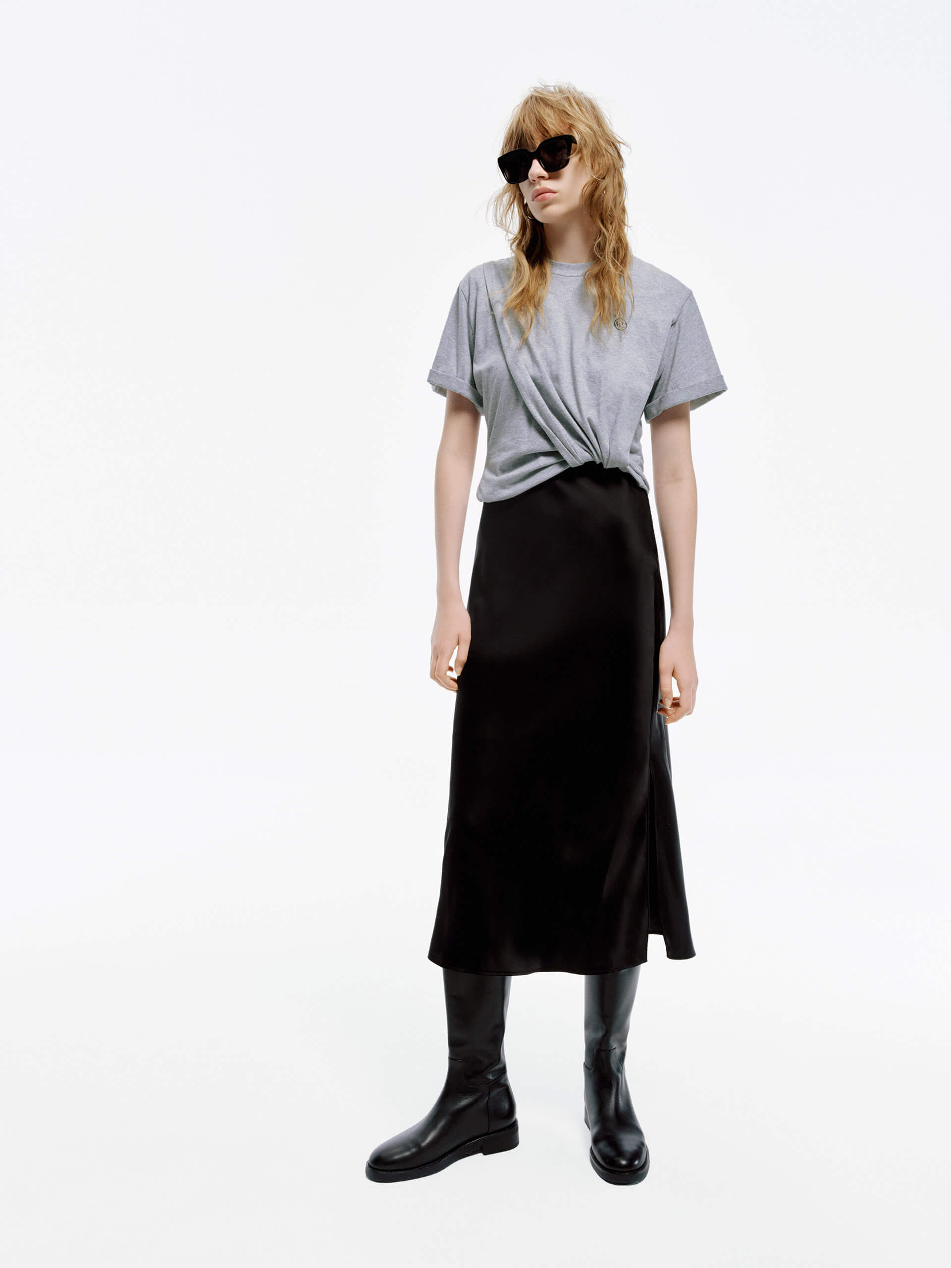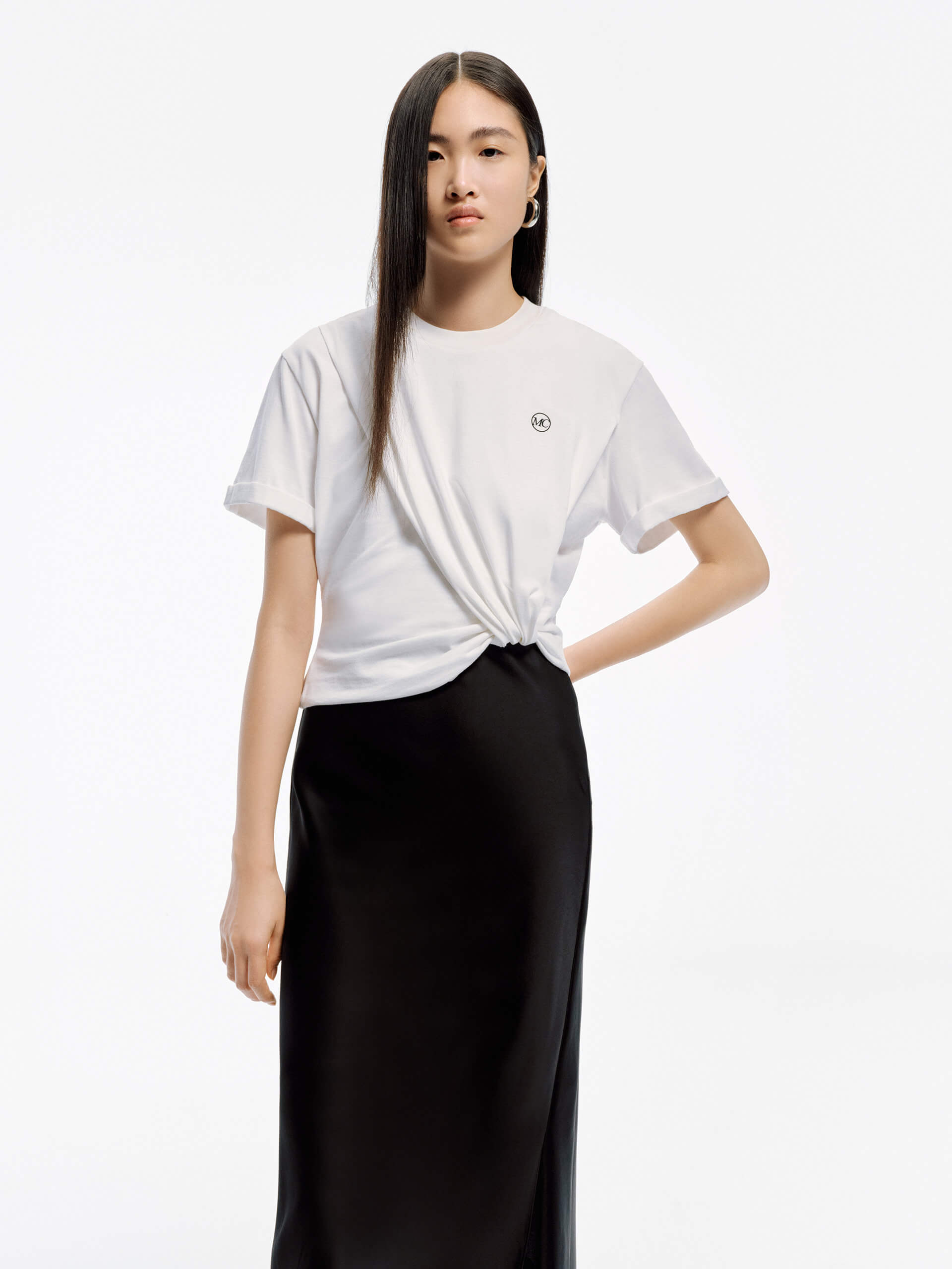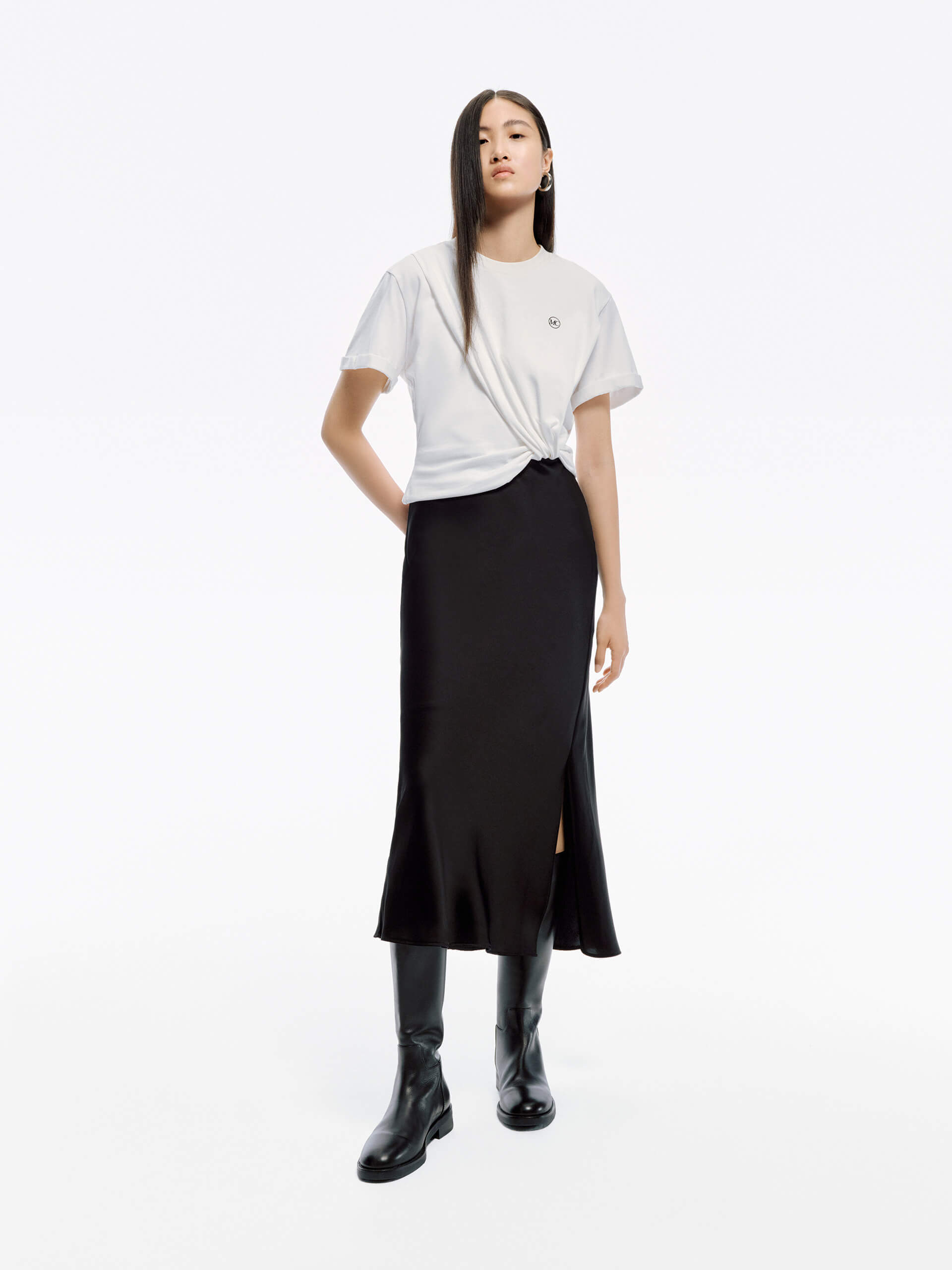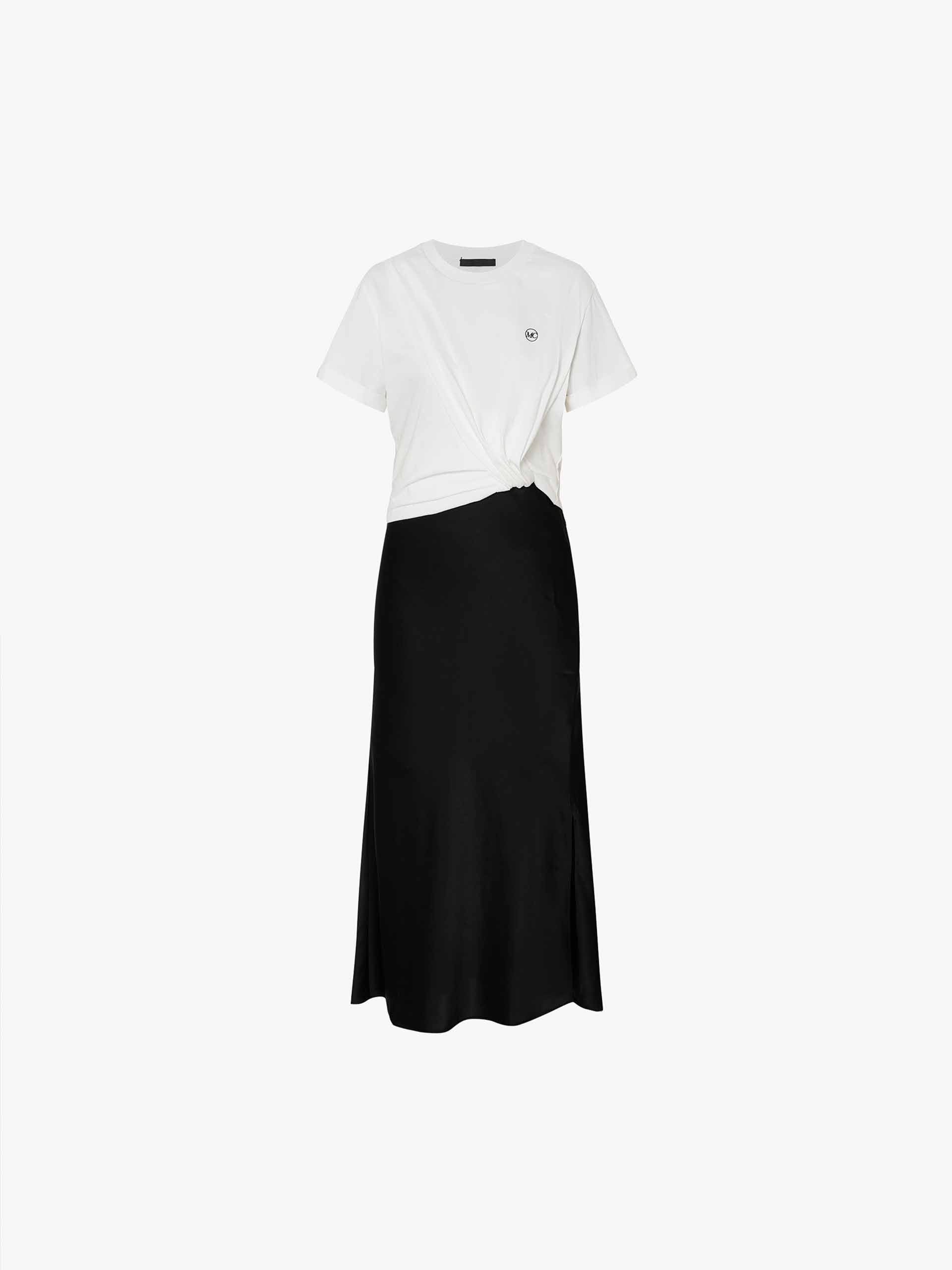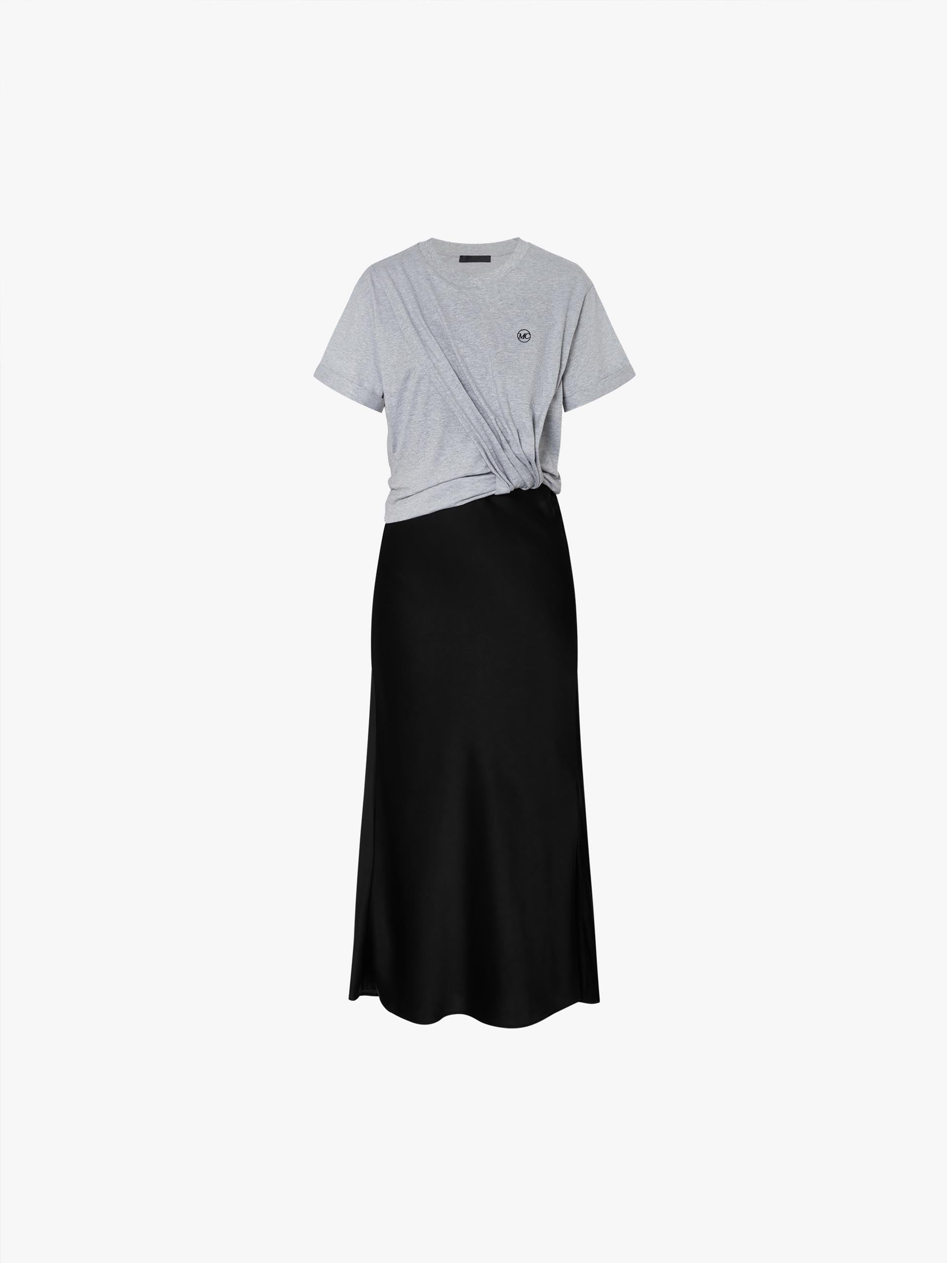 Unique cuts and tactile fabrics give dresses a new perspective. This item is made of two-tone colors, a cotton jersey top and a comfortable acetate blend skirt. The side slit design makes it easy to move, making it visually unique and chic.