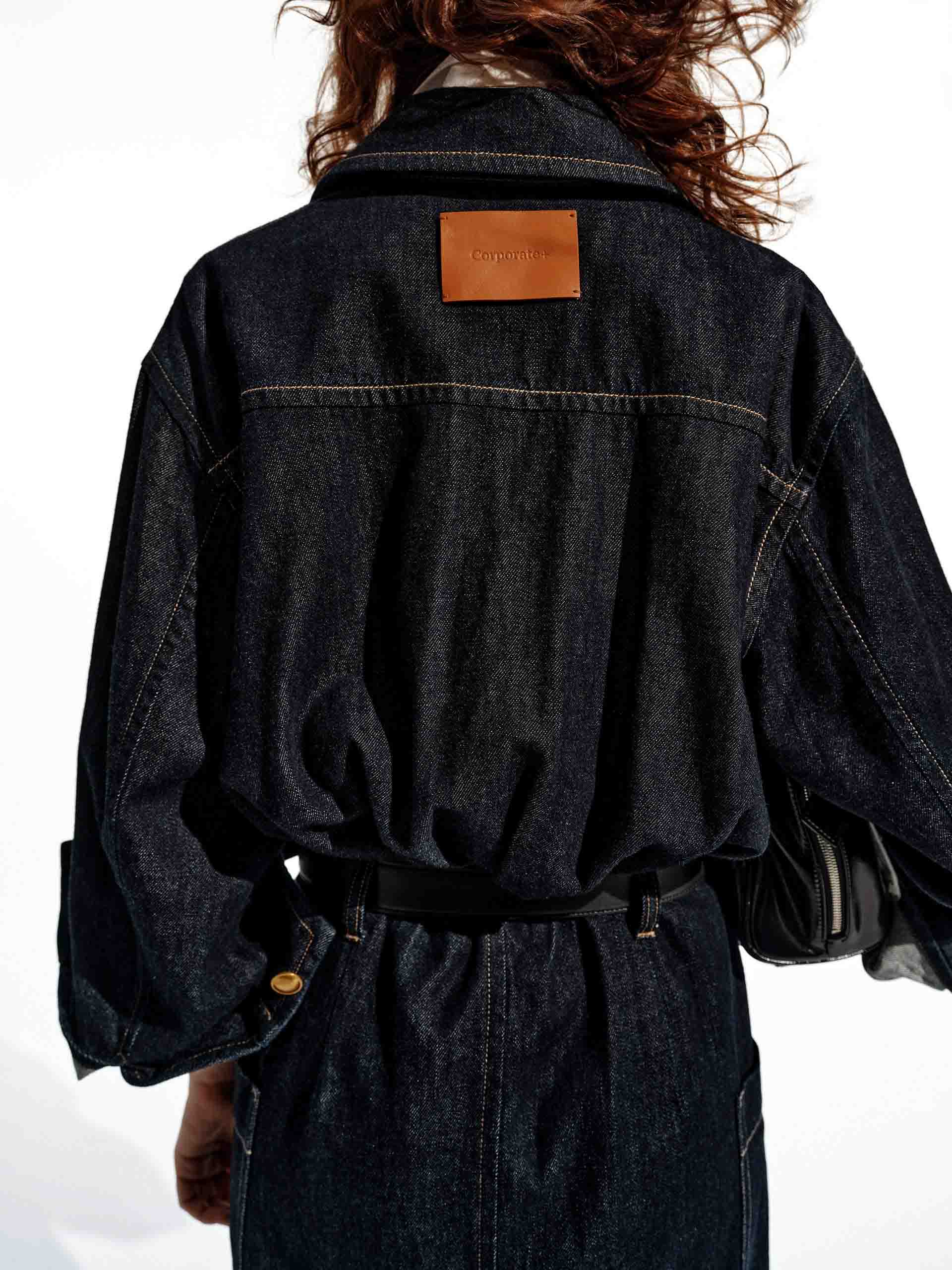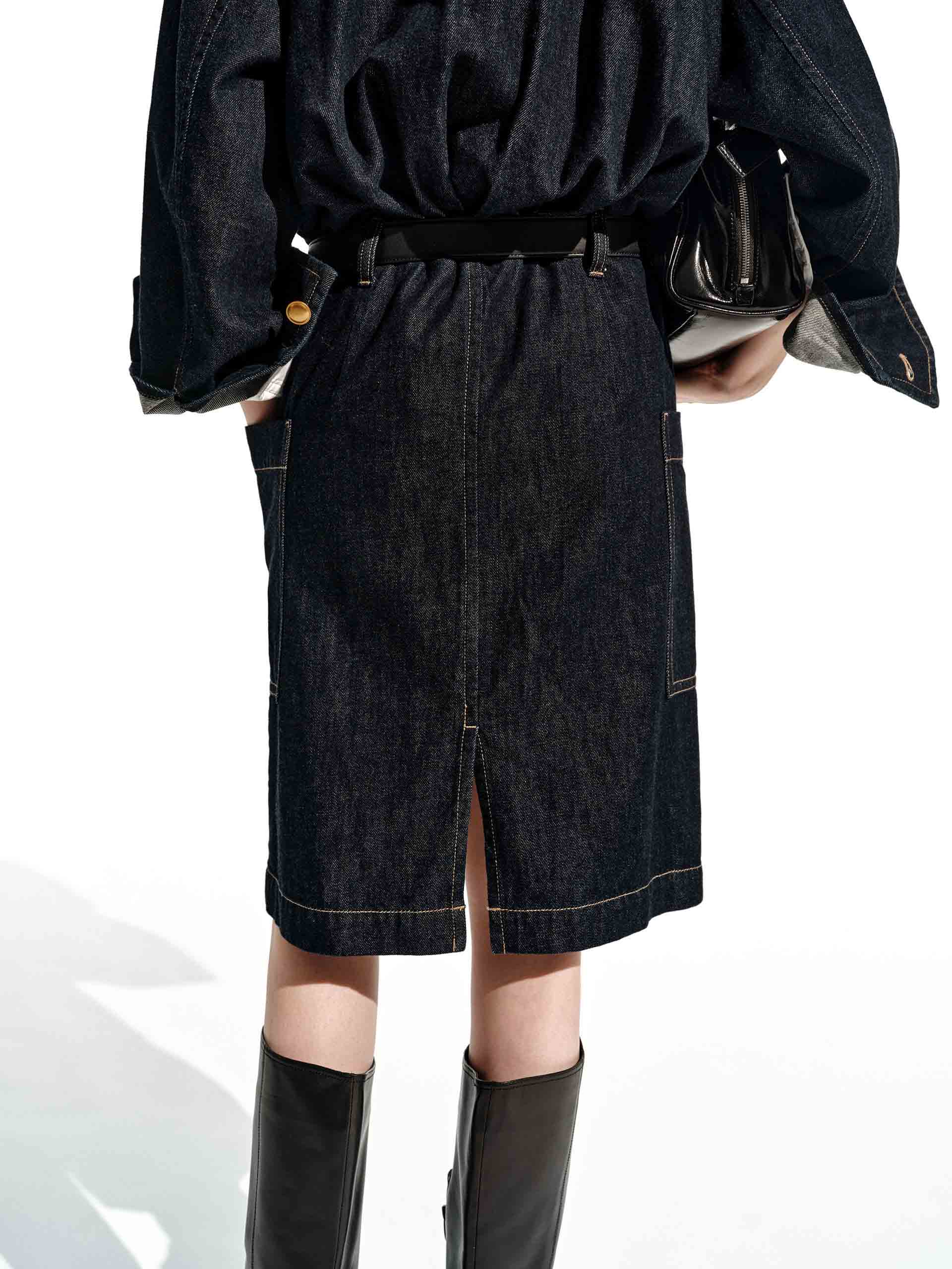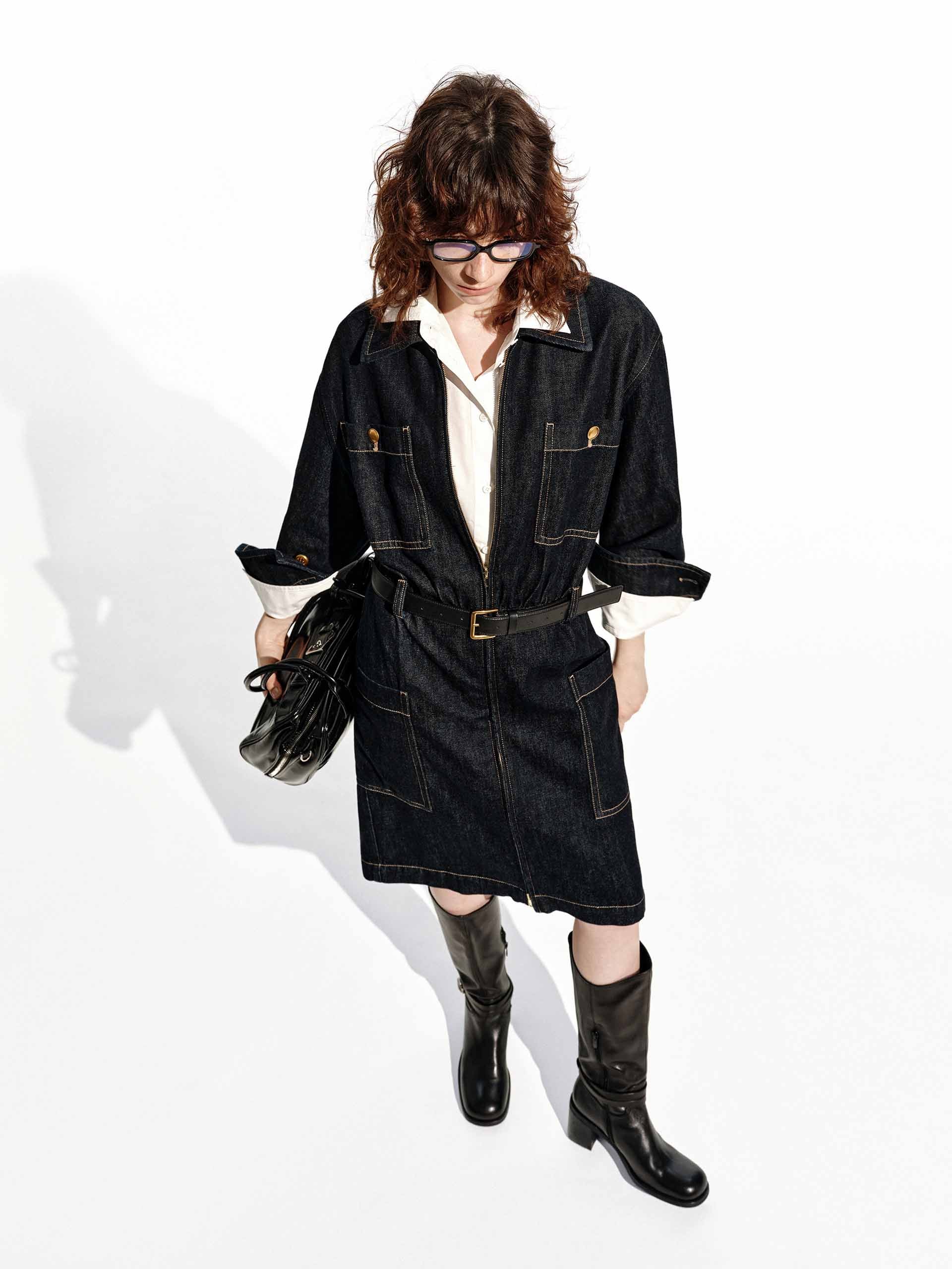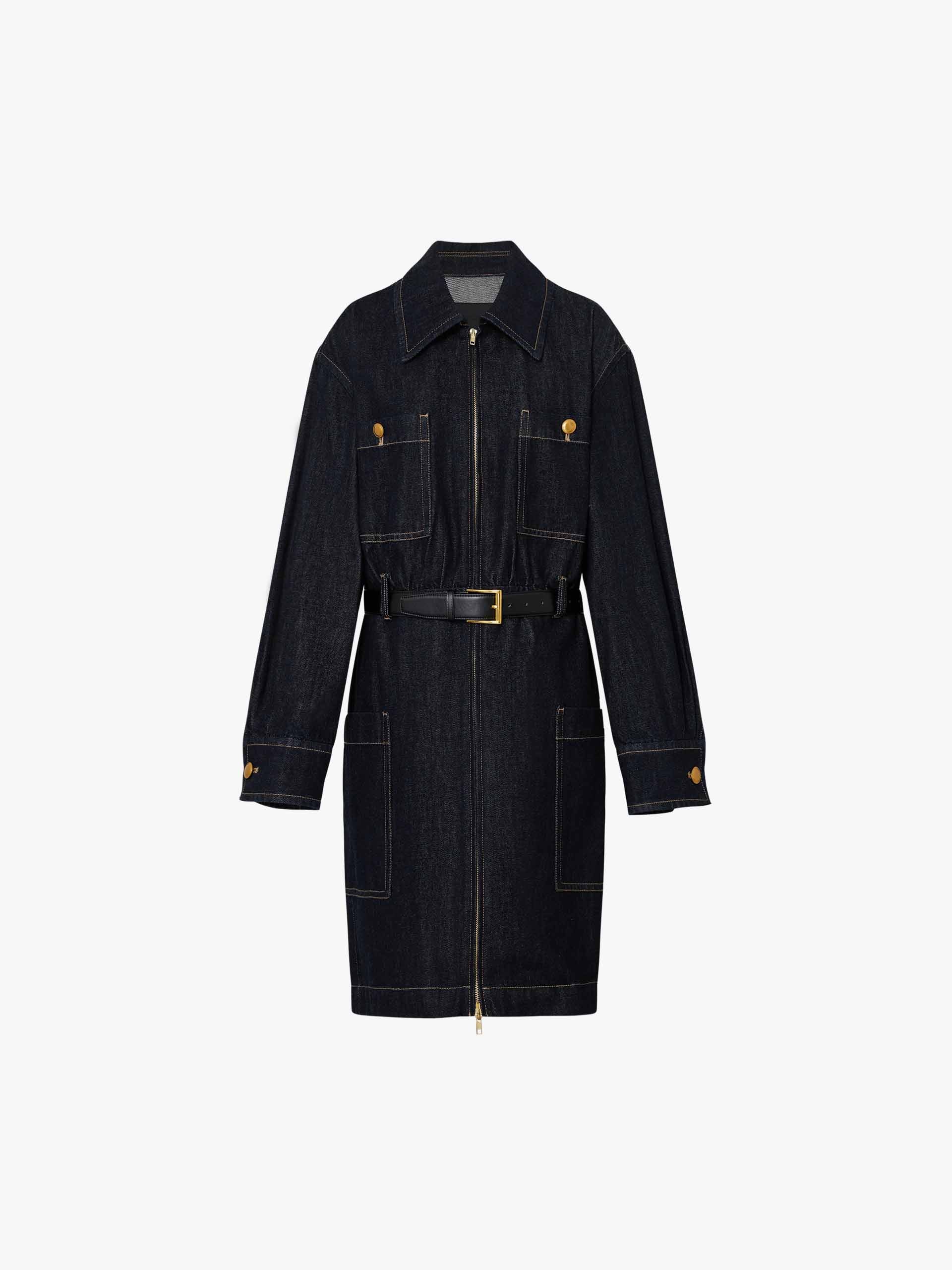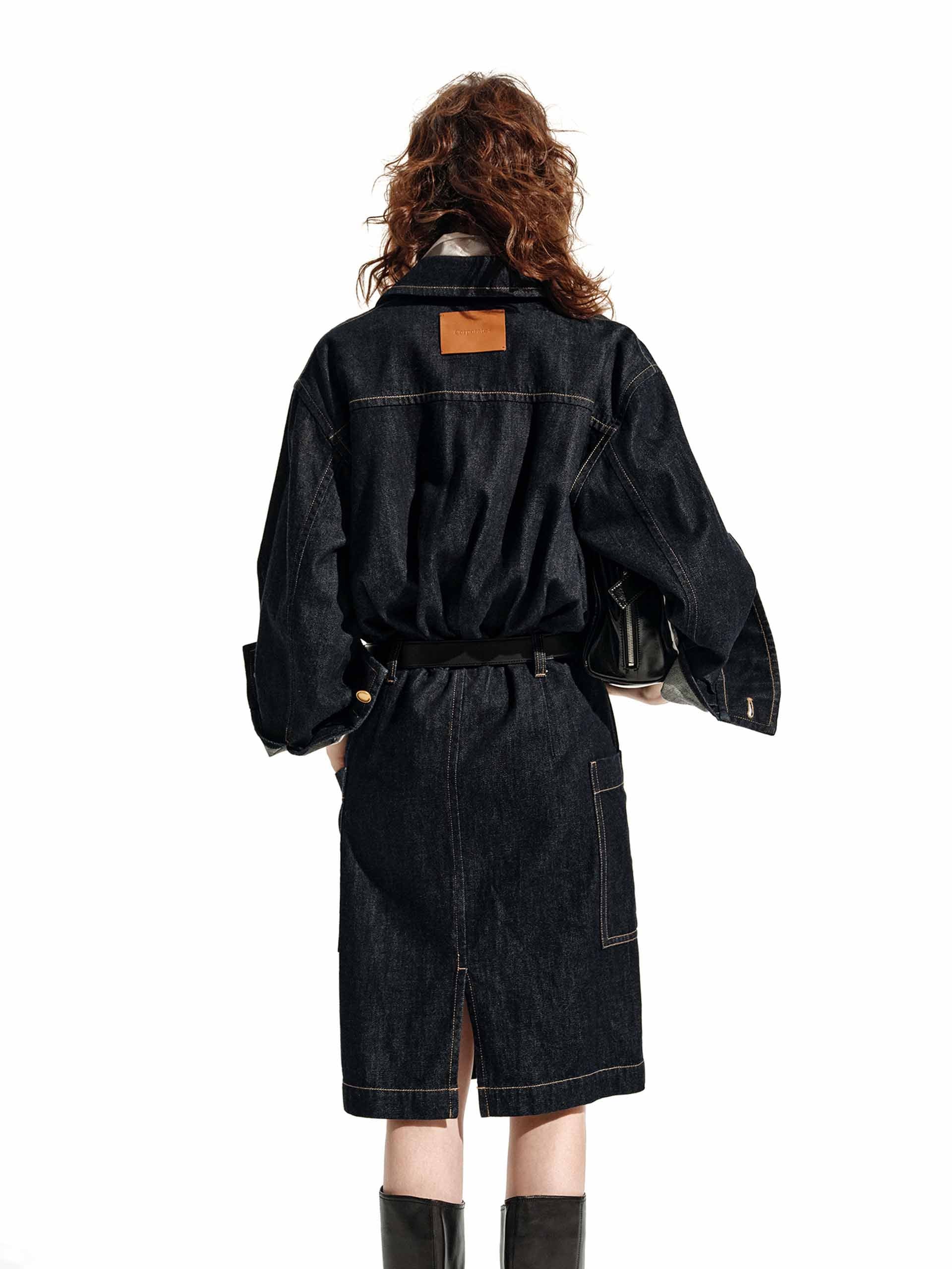 This dress offers a classic shirtdress silhouette crafted from durable denim with a dark blue washed finish. Features multiple pockets and contrast stitches for added style. Expertly designed for a comfortable and casual look. Please note, the waist belt is not included.