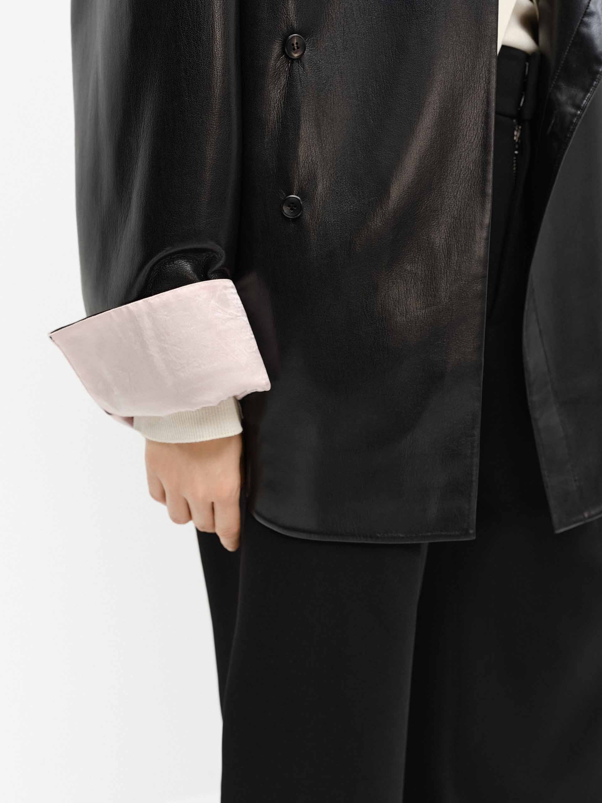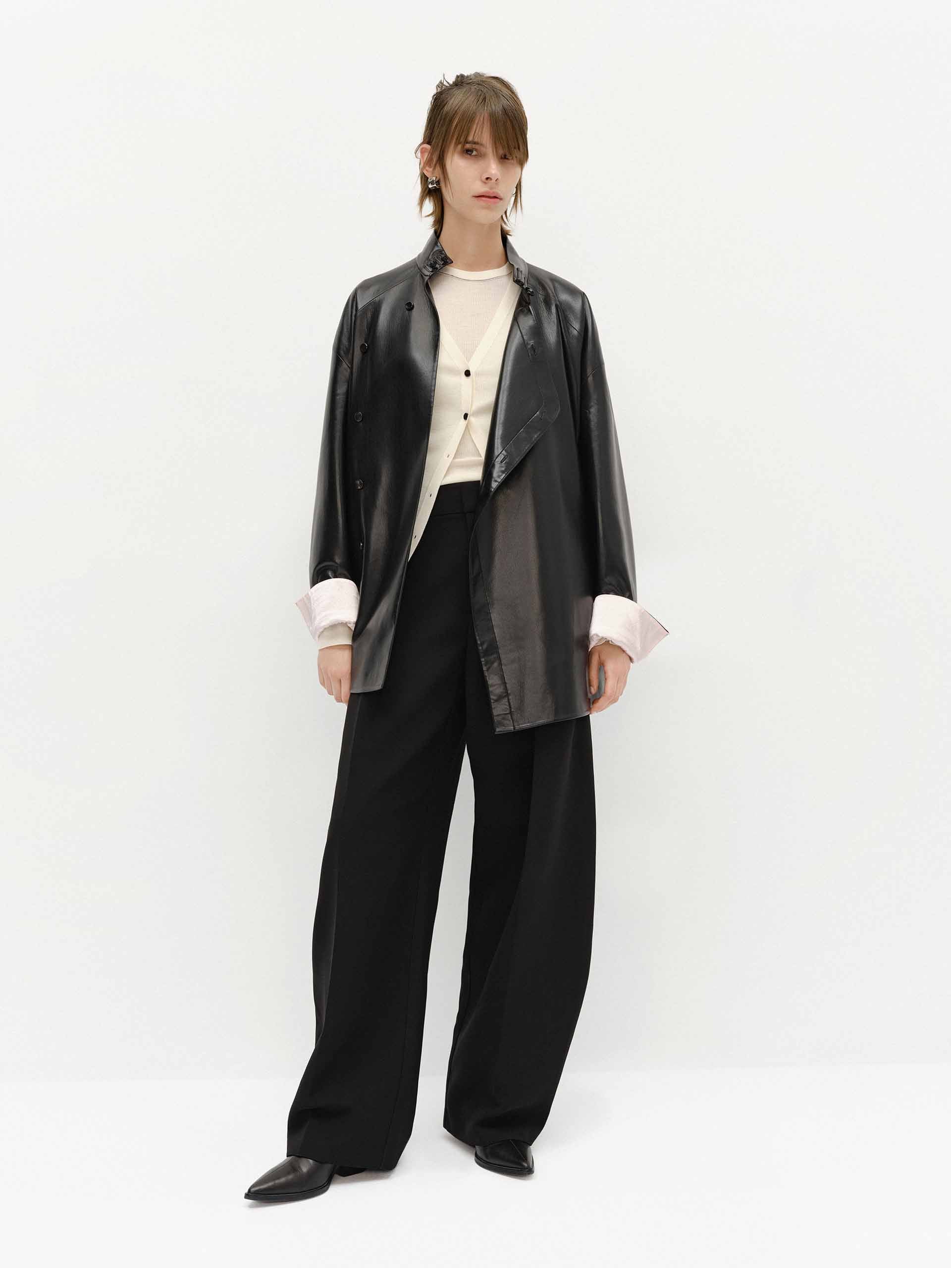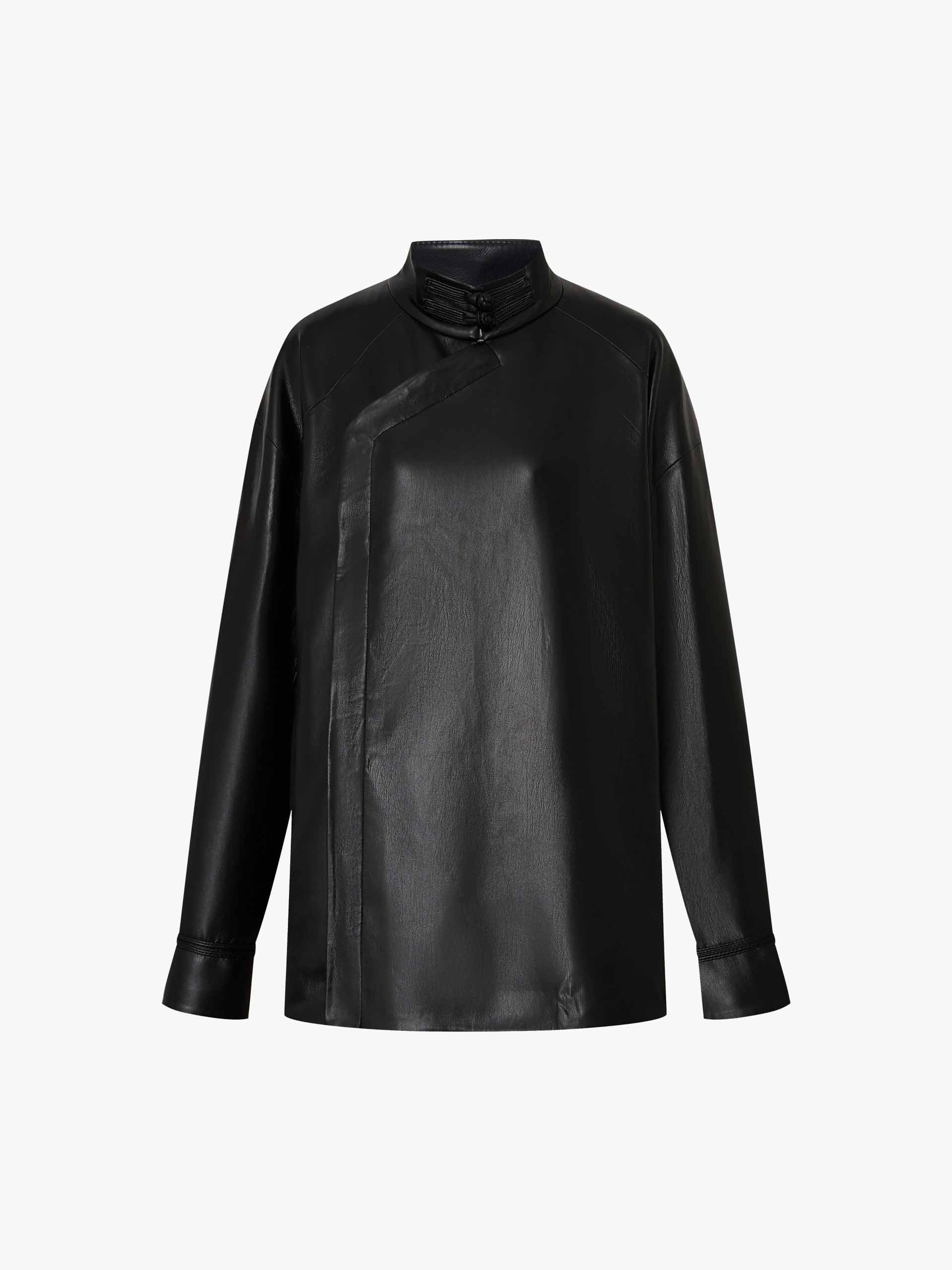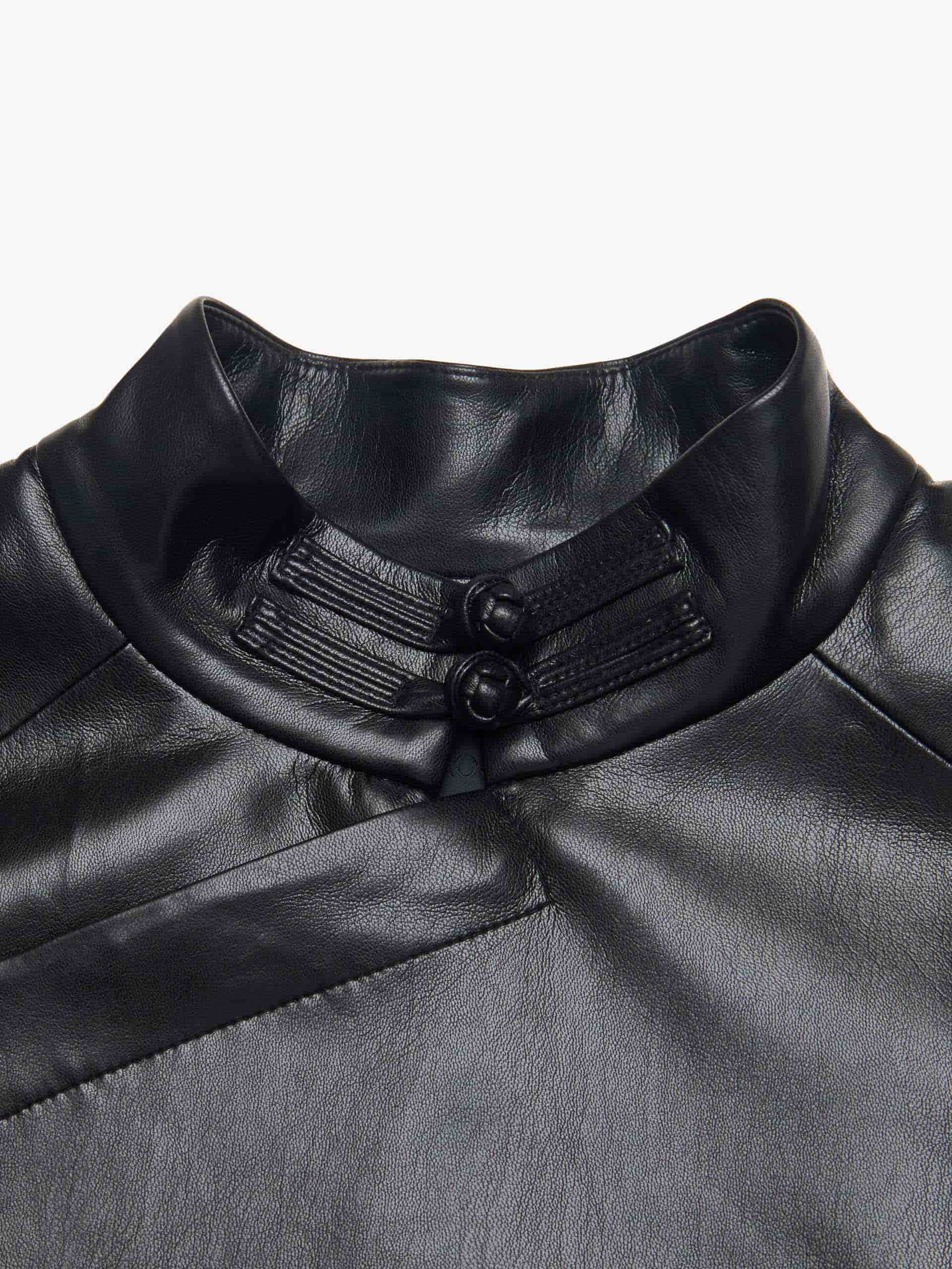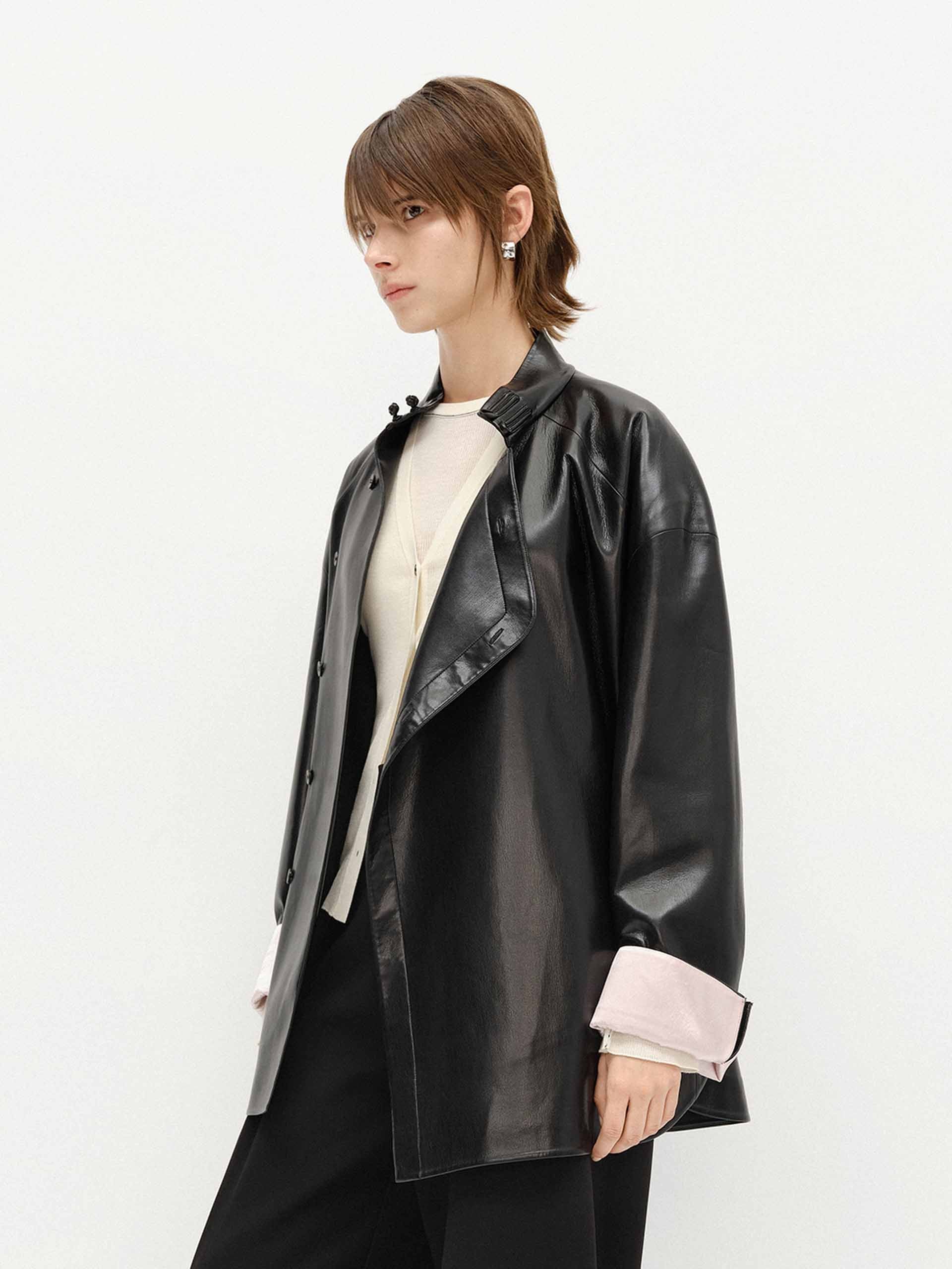 Made from soft faux leather, this coat features a relaxed cut and a unique slanted placket and cheongsam buckle design inspired by Chinese fashion. The turn cuffs add a chic with exquisite contrast jacquard detail.