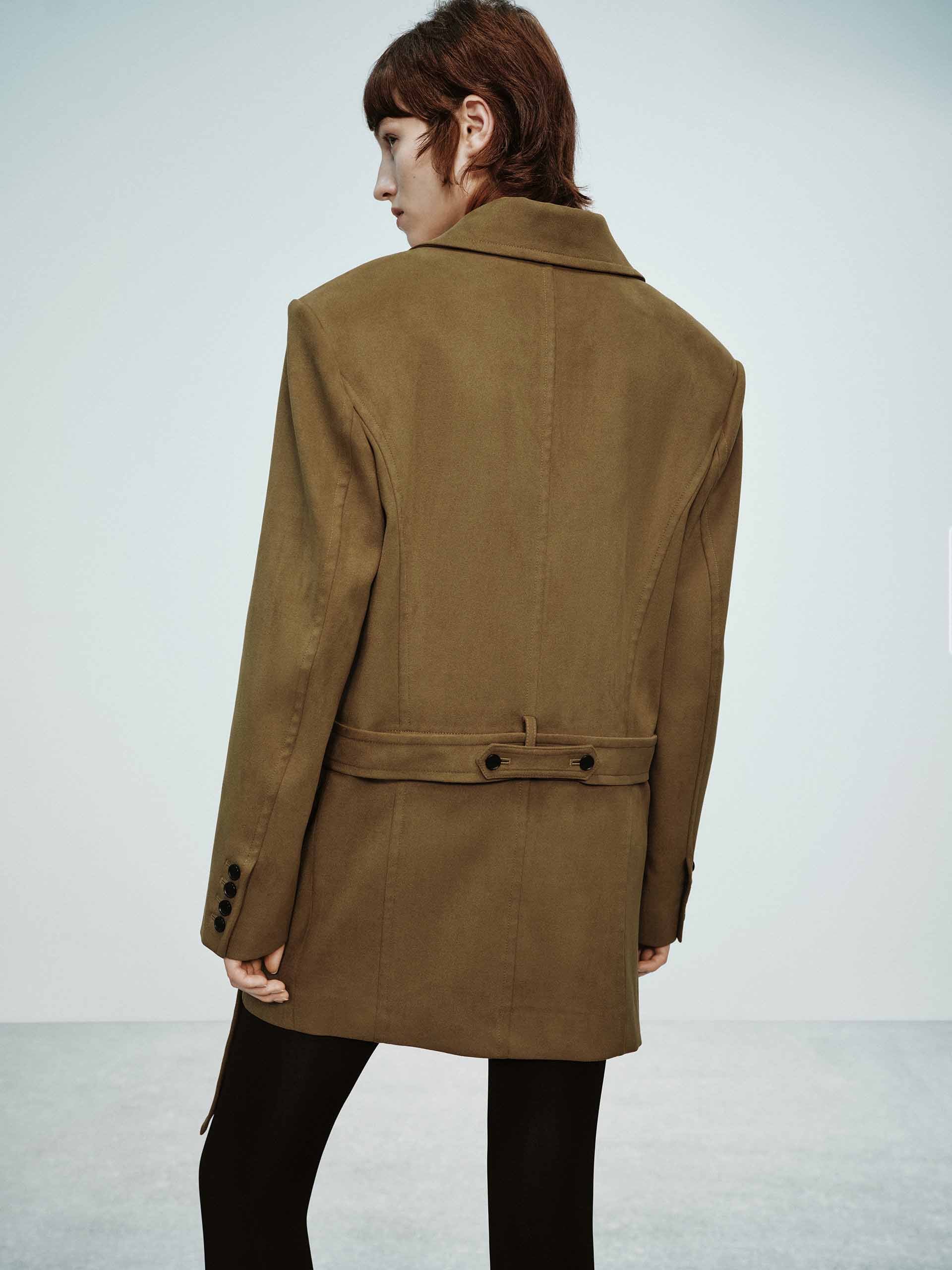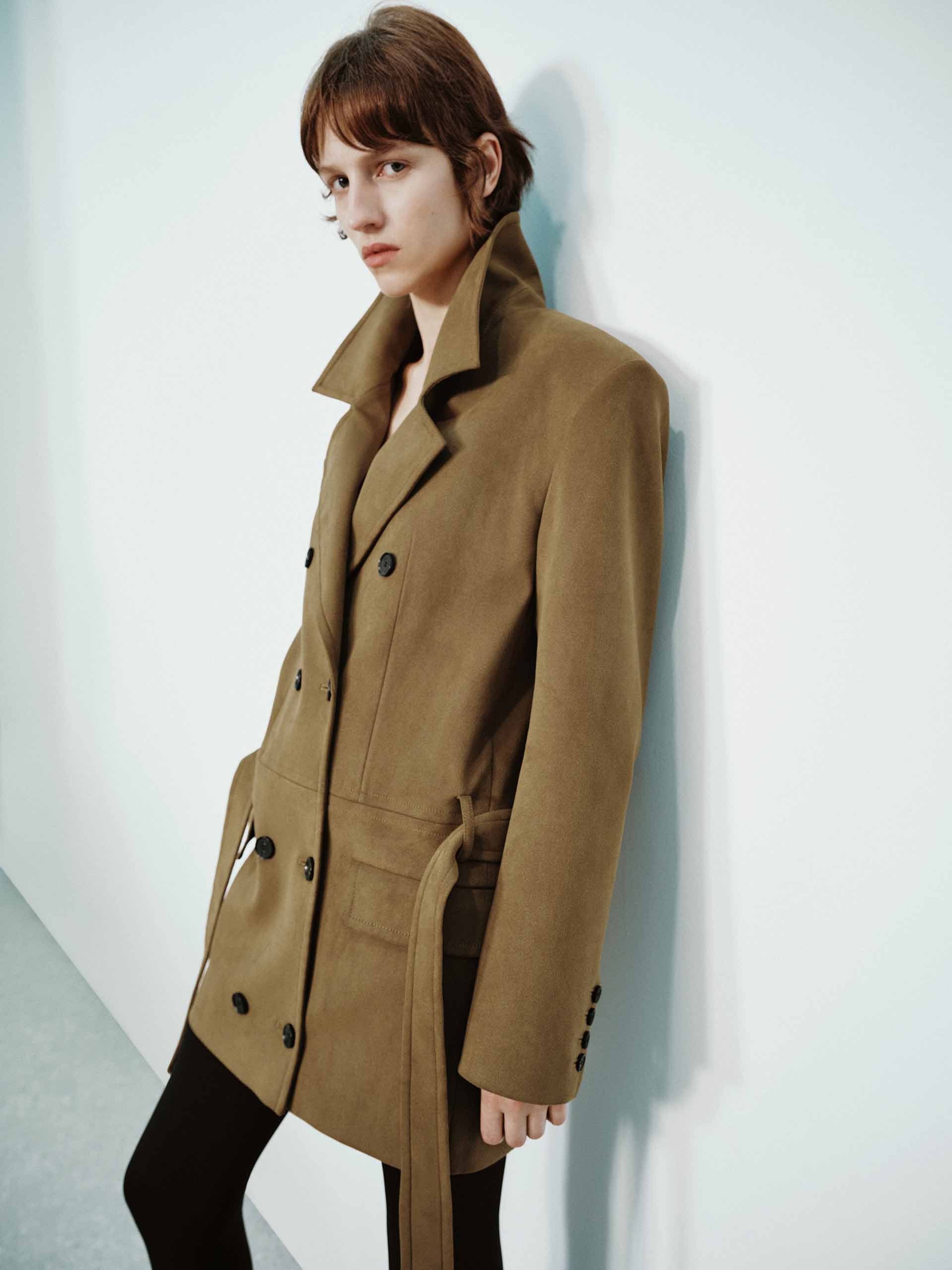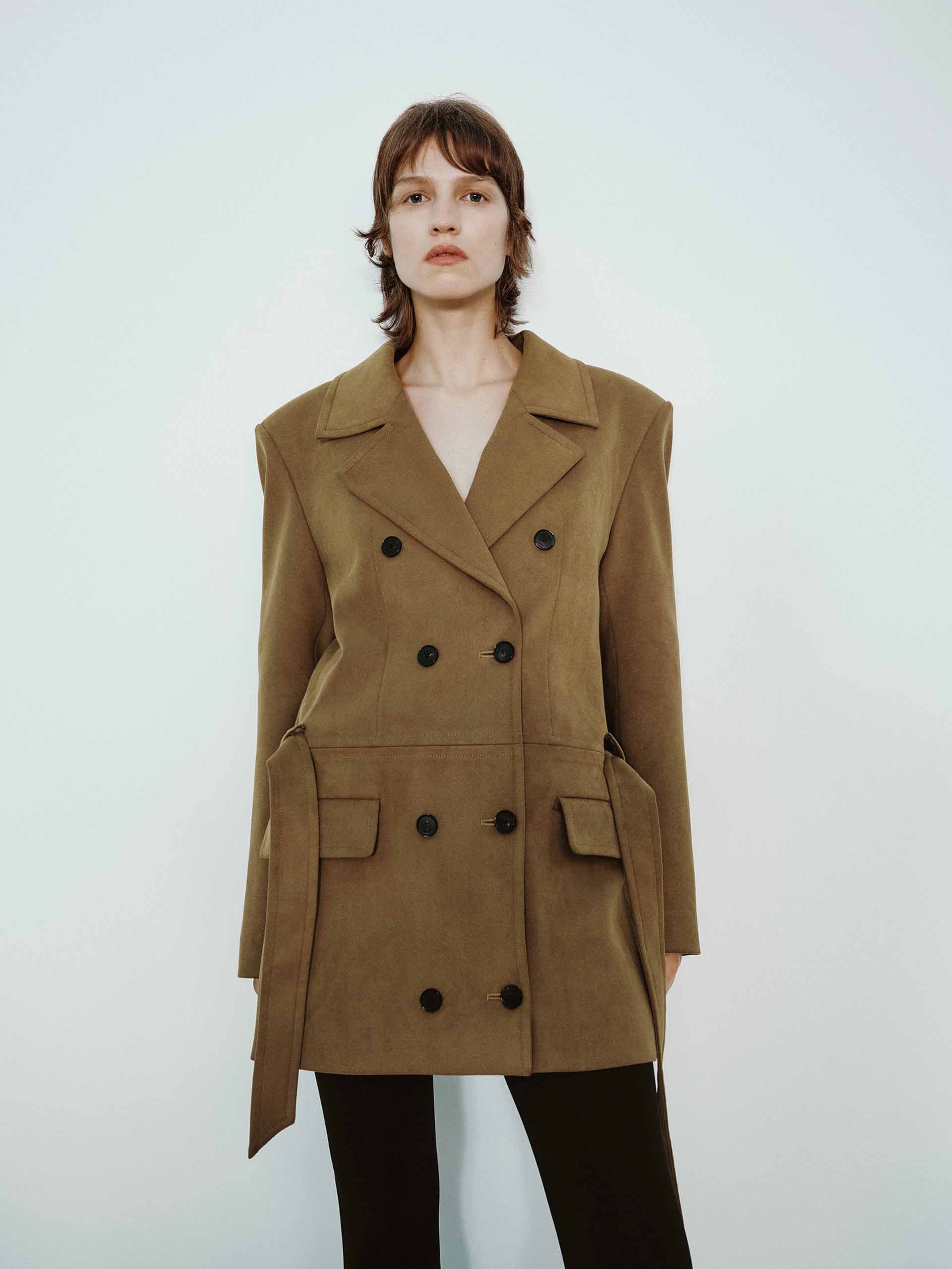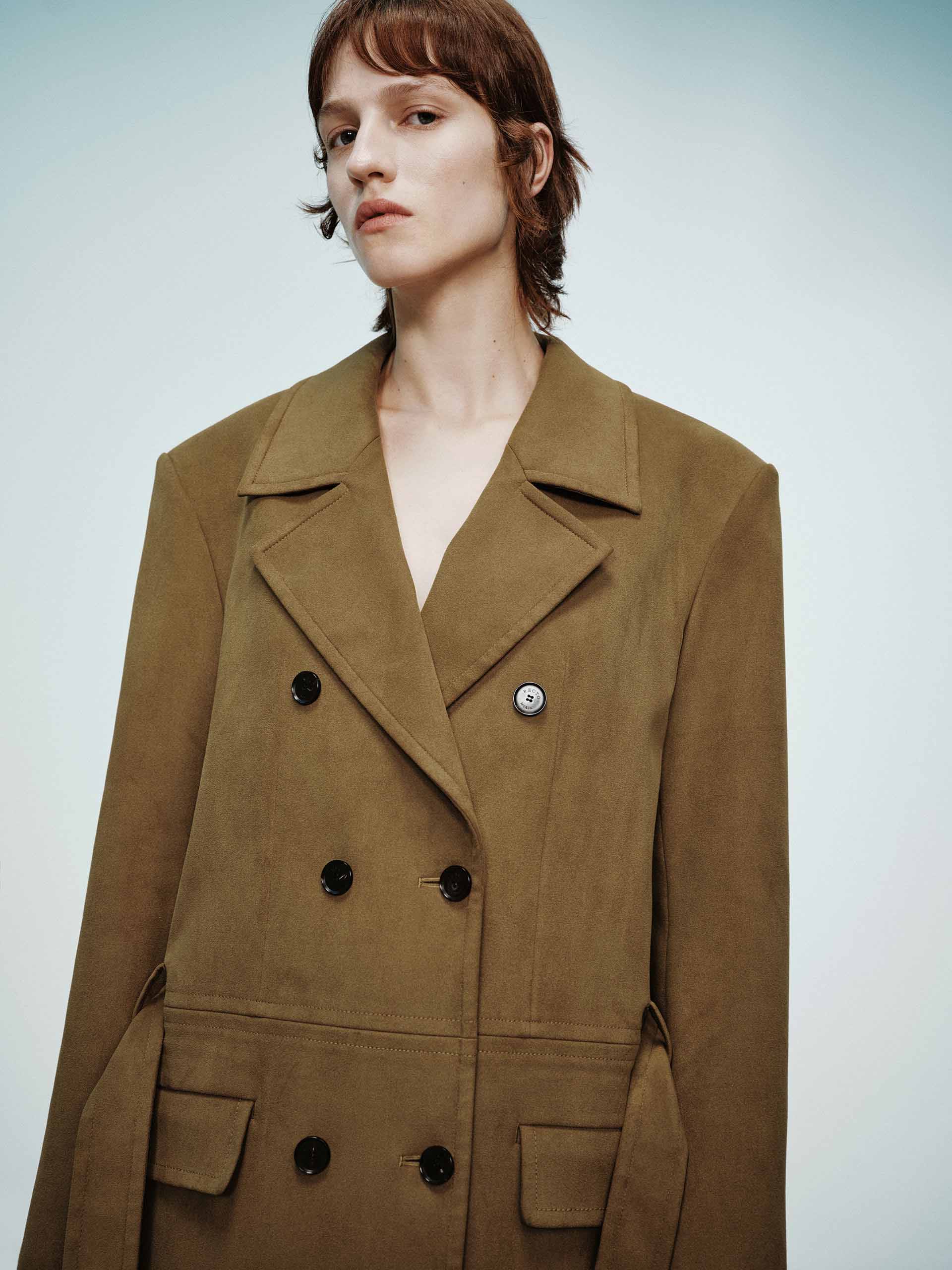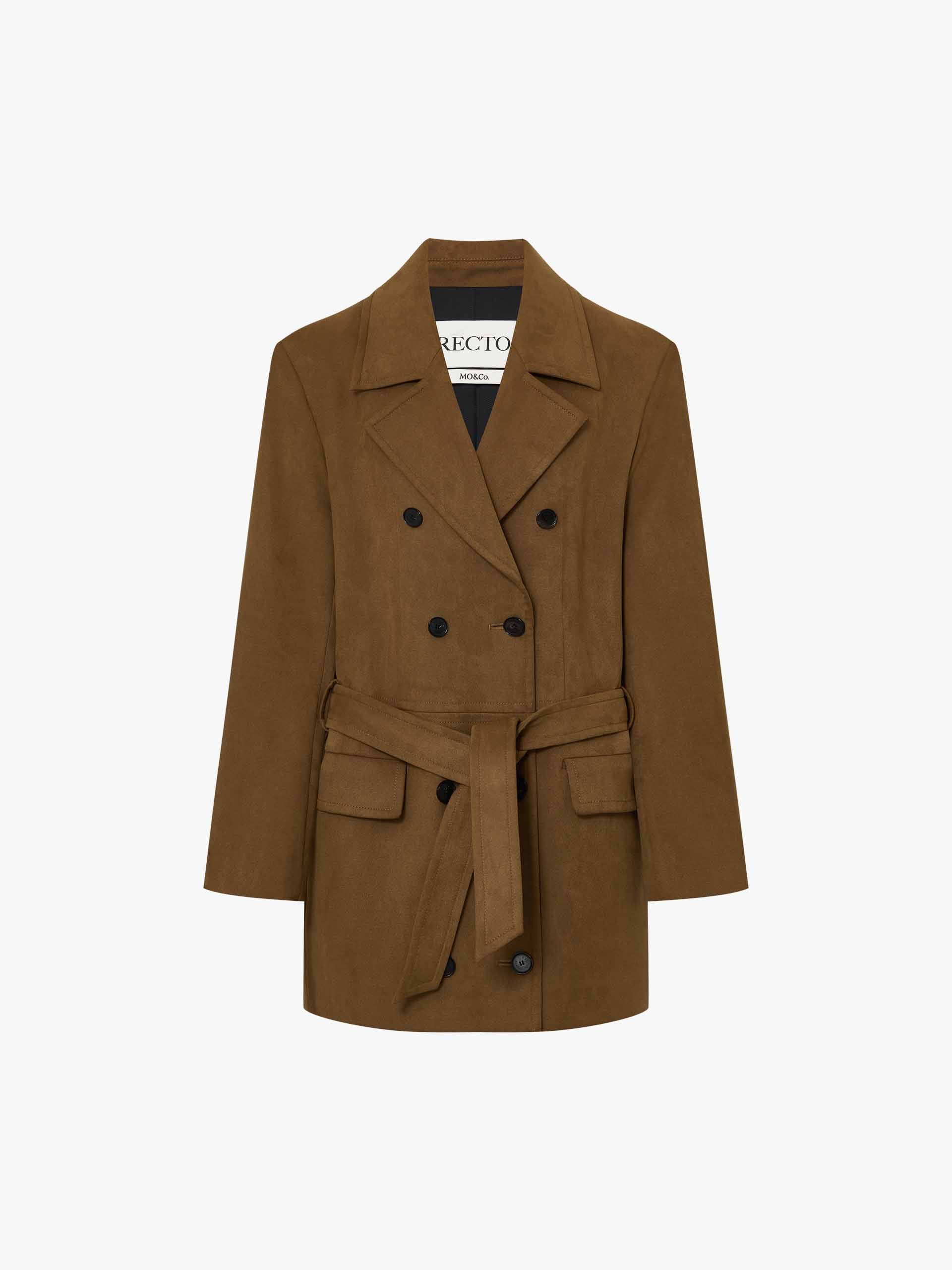 This RECTO x MO&Co collaboration offers a sophisticated coat with timeless double-breasted close and notch lapels. Offered in a brown hue with a soft suede texture, midi length and front flap pocket design.