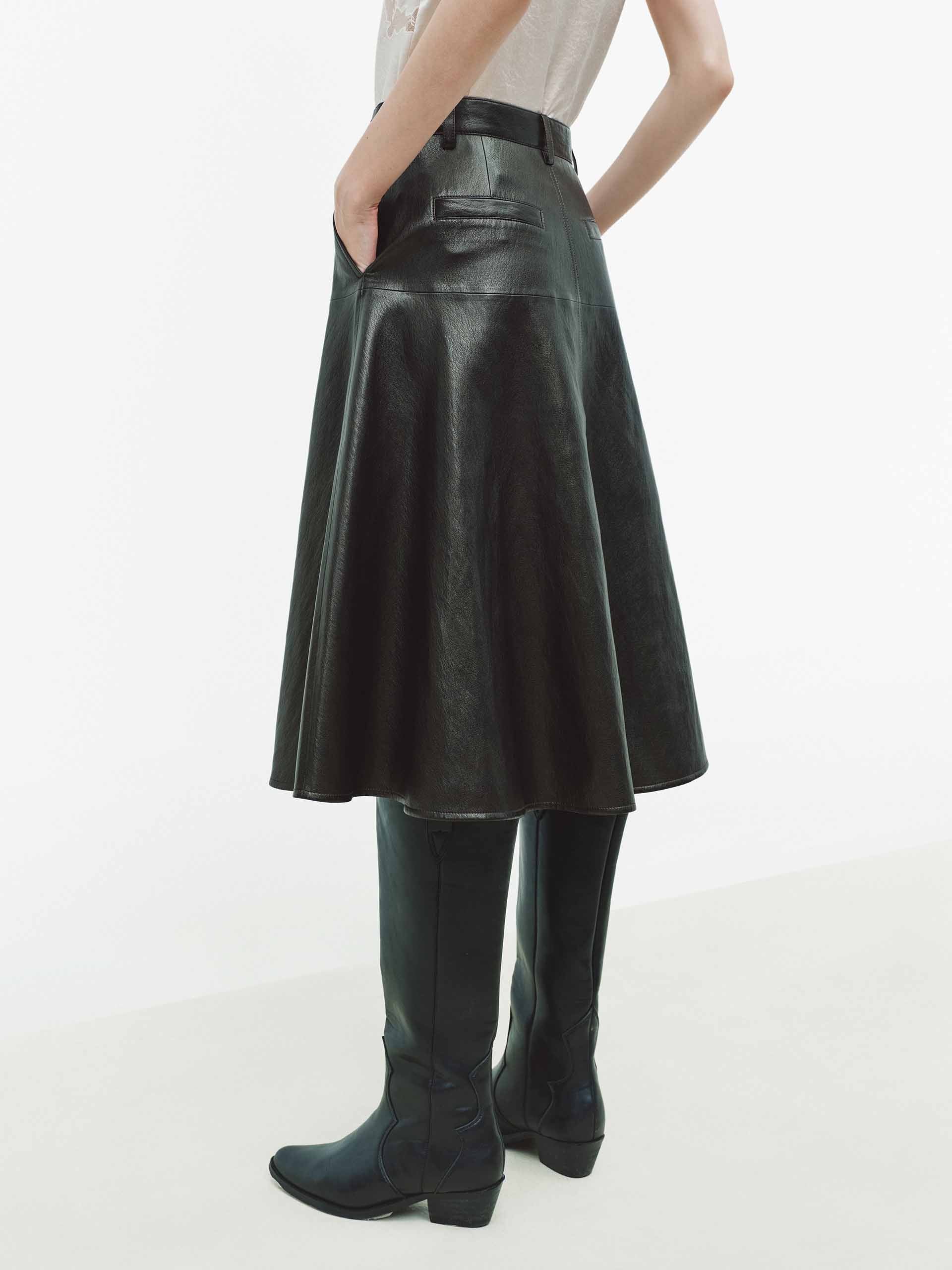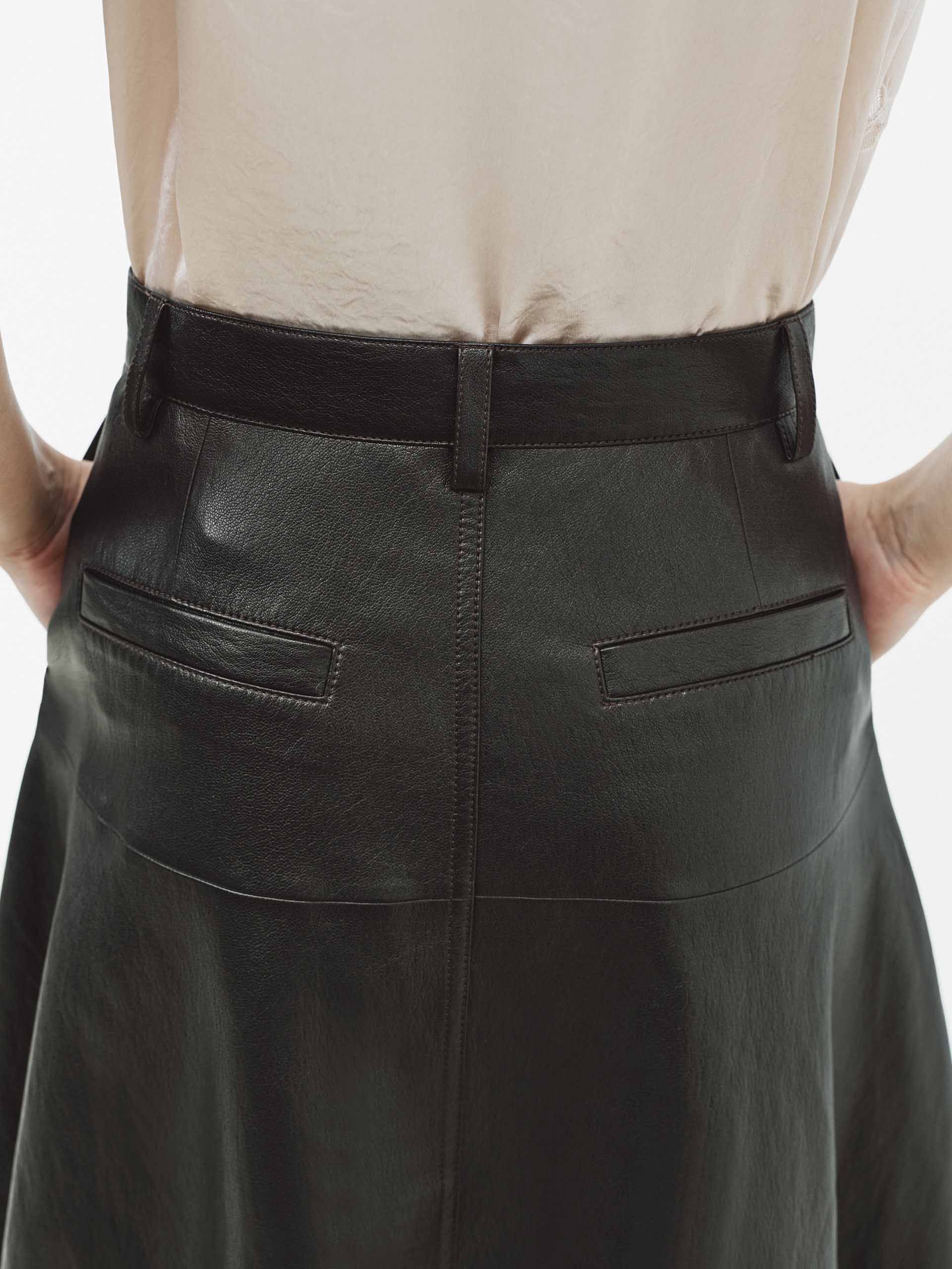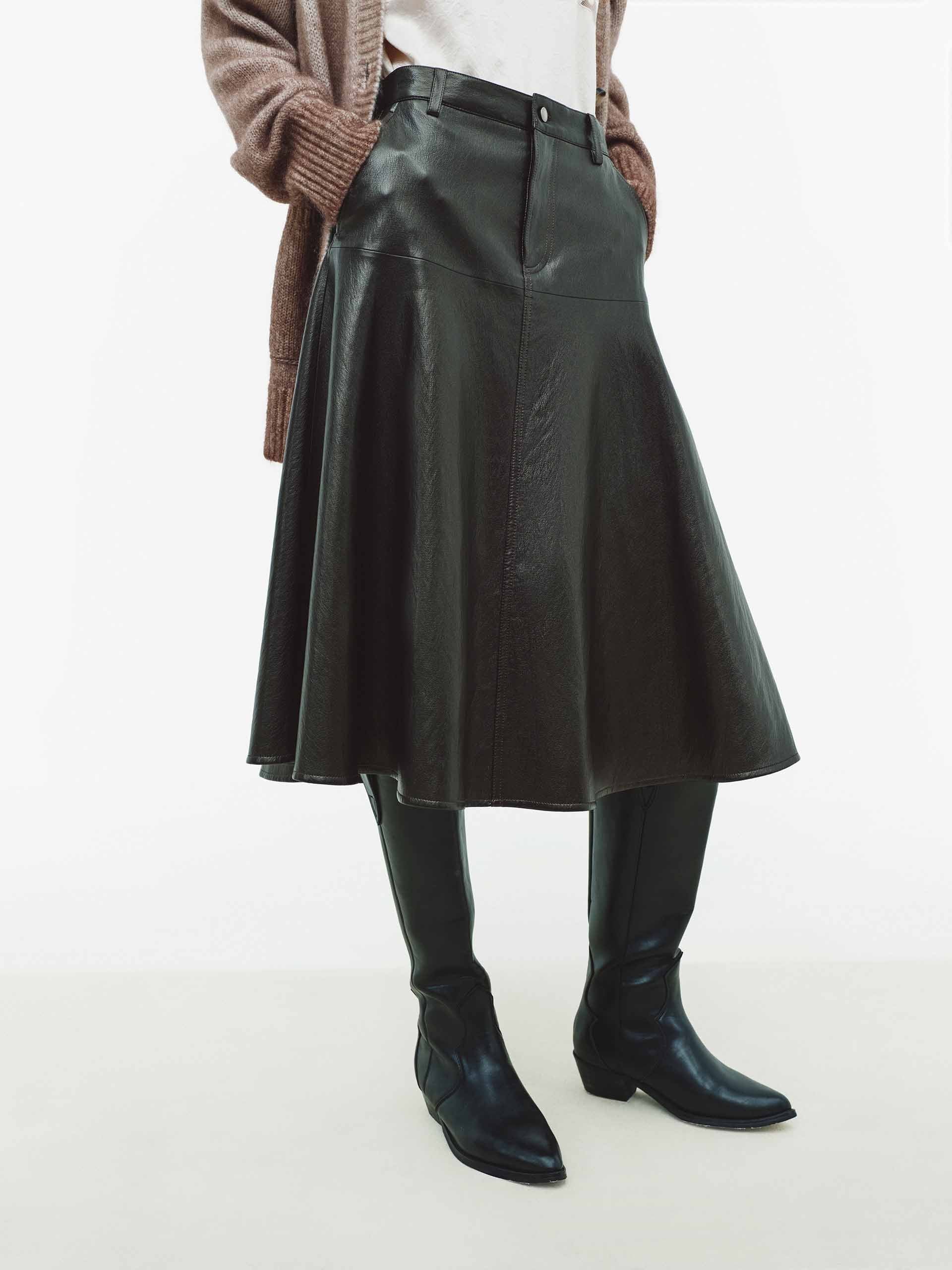 This skirt is crafted from luxurious PU leather fabric, offering a premium look with a soft feel. The flattering A-line cut and elegant midi length create a timeless, feminine shape, accentuated by a sleek high waist and defining center seam detail.  Practical side pockets and a secure zip and button closure blend functionality with style. A dusky blend of brown and black.