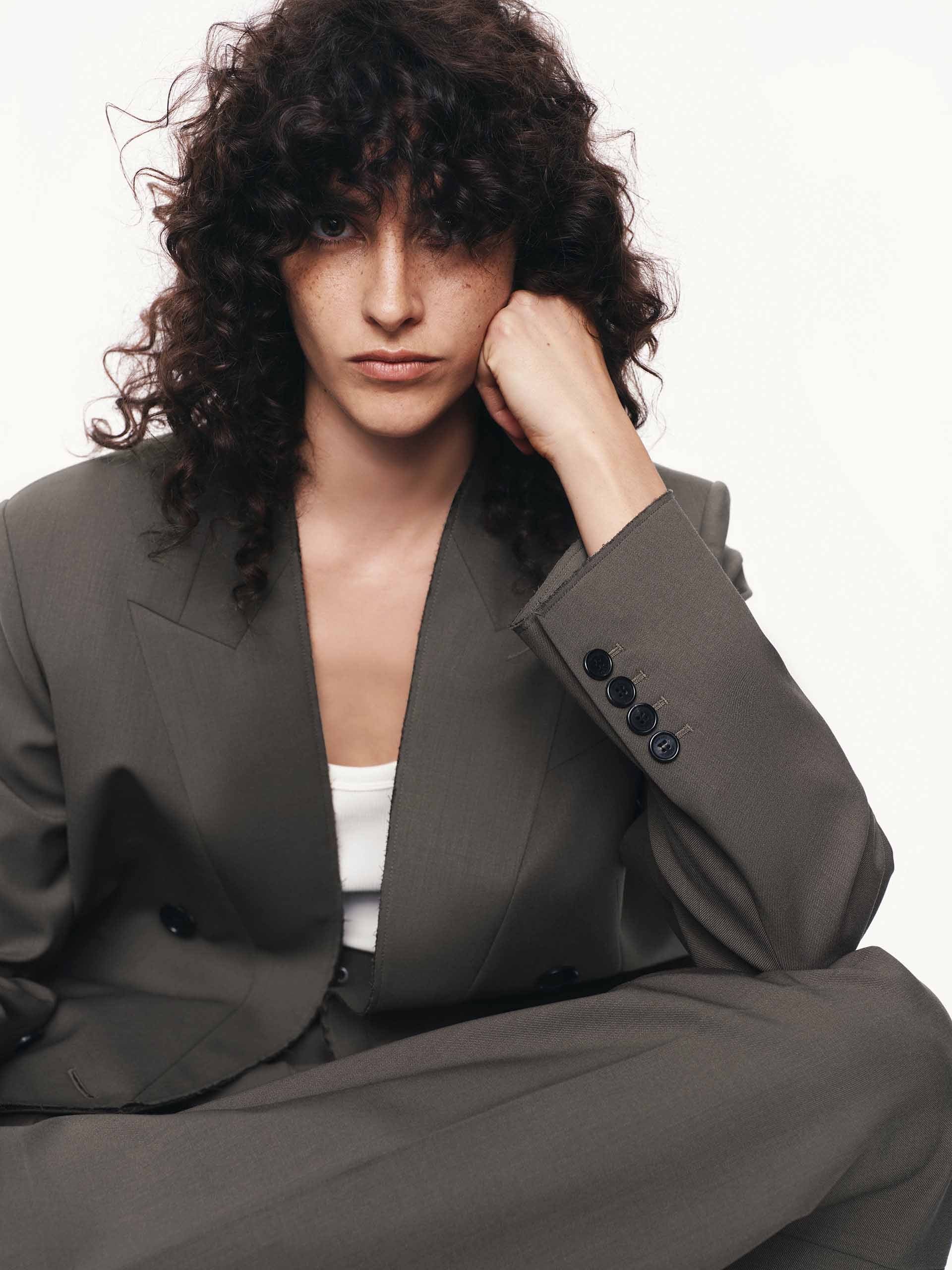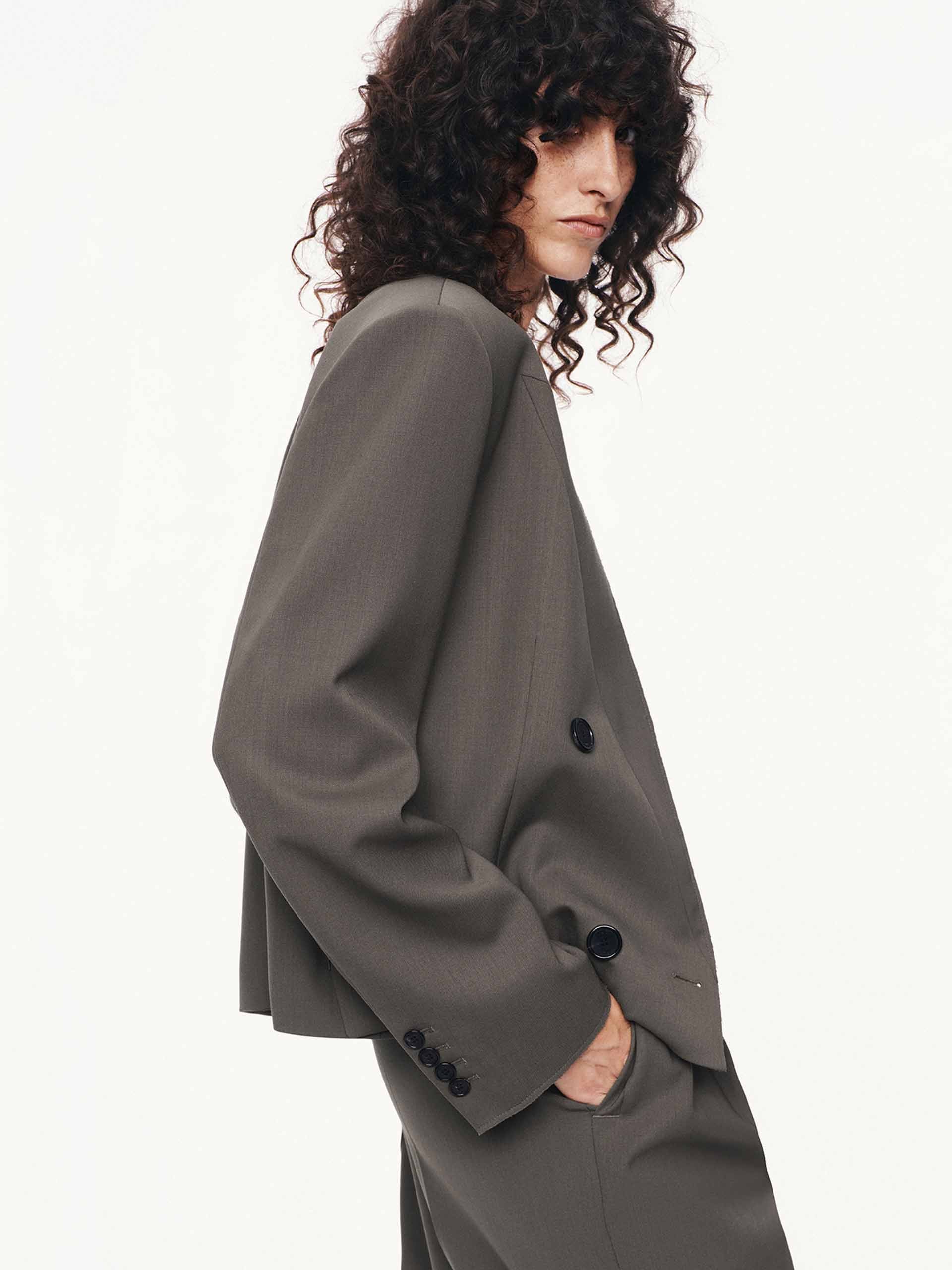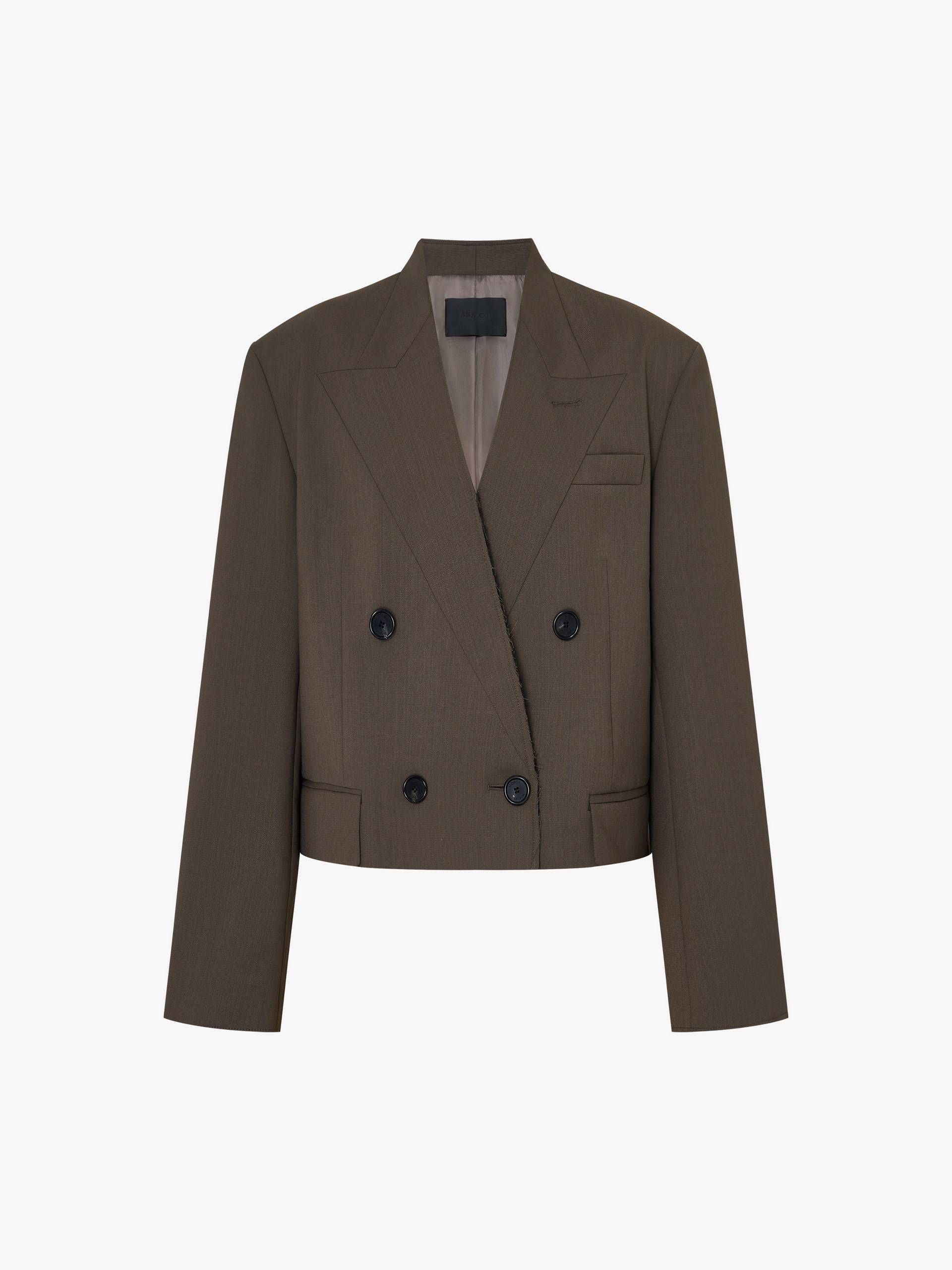 A modern twist on timeless tailoring, this blazer combines sharp sophistication with contemporary edge. The cropped fit delivers a flattering, fashion-forward silhouette. Featuring a classic peak lapel and strong padded shoulders, it exudes power dressing vibes with its double-breasted design. Pair with the matching trousers for a more sophisticated and charming look. The brown blazer may appear olive or grey under different lighting.