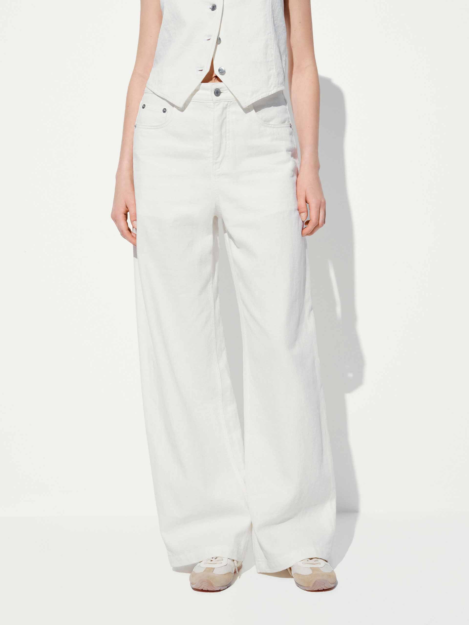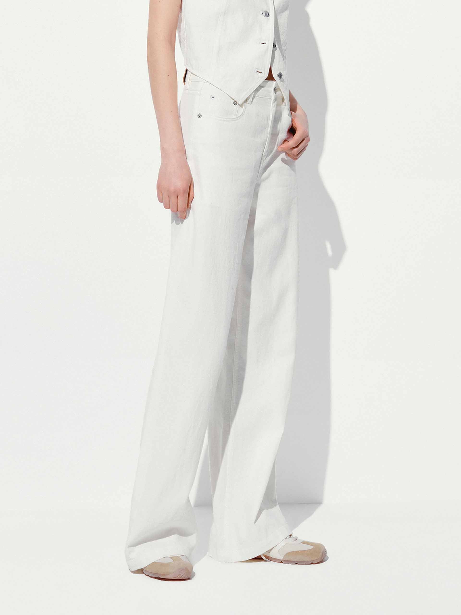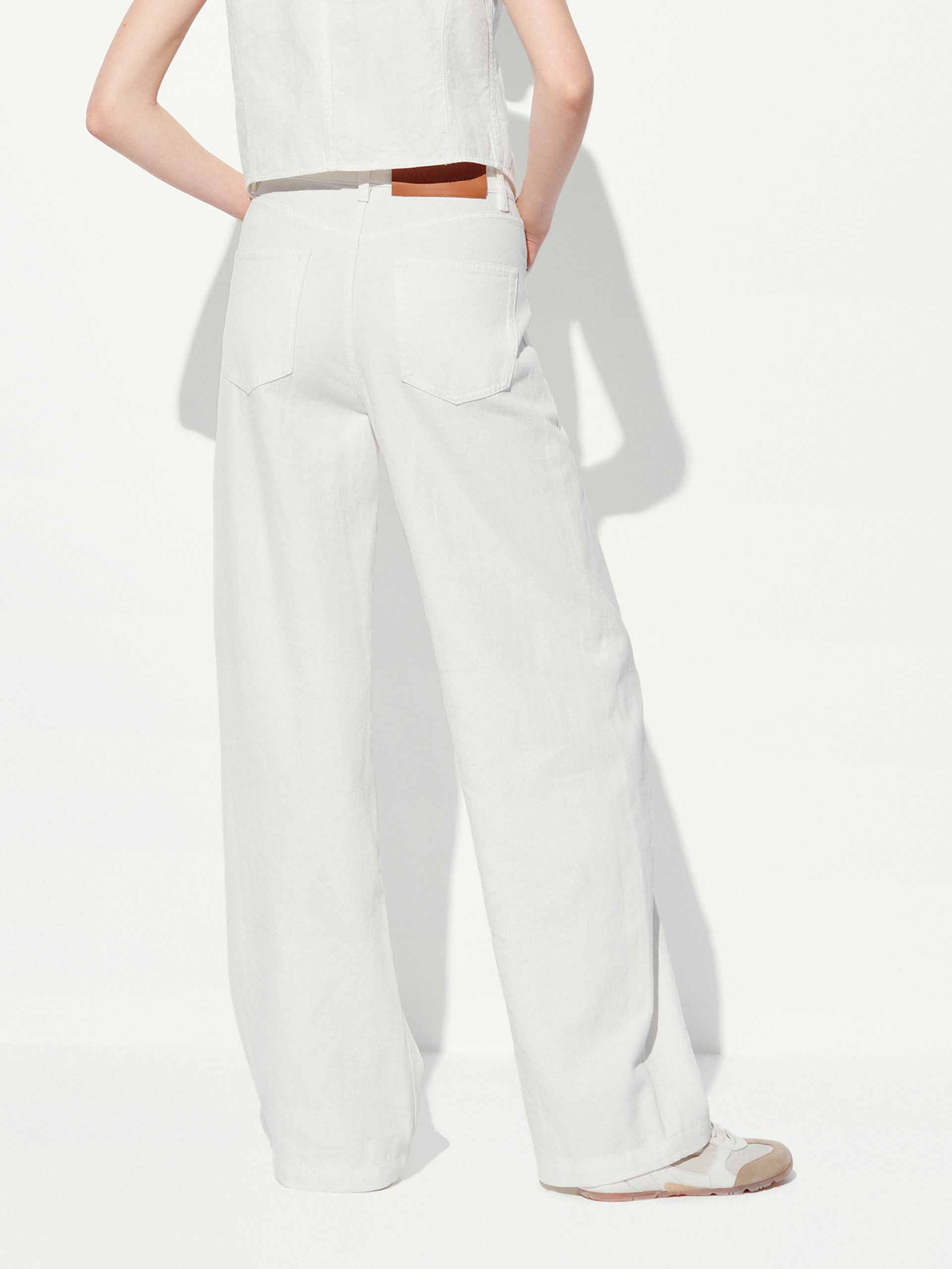 Expertly crafted from a cotton linen blend, these white jeans feature a classic straight cut and a five-pocket design. Perfect for any occasion, this wardrobe staple offers both comfort and style in one. Easily pair with any top for a timeless, polished look.