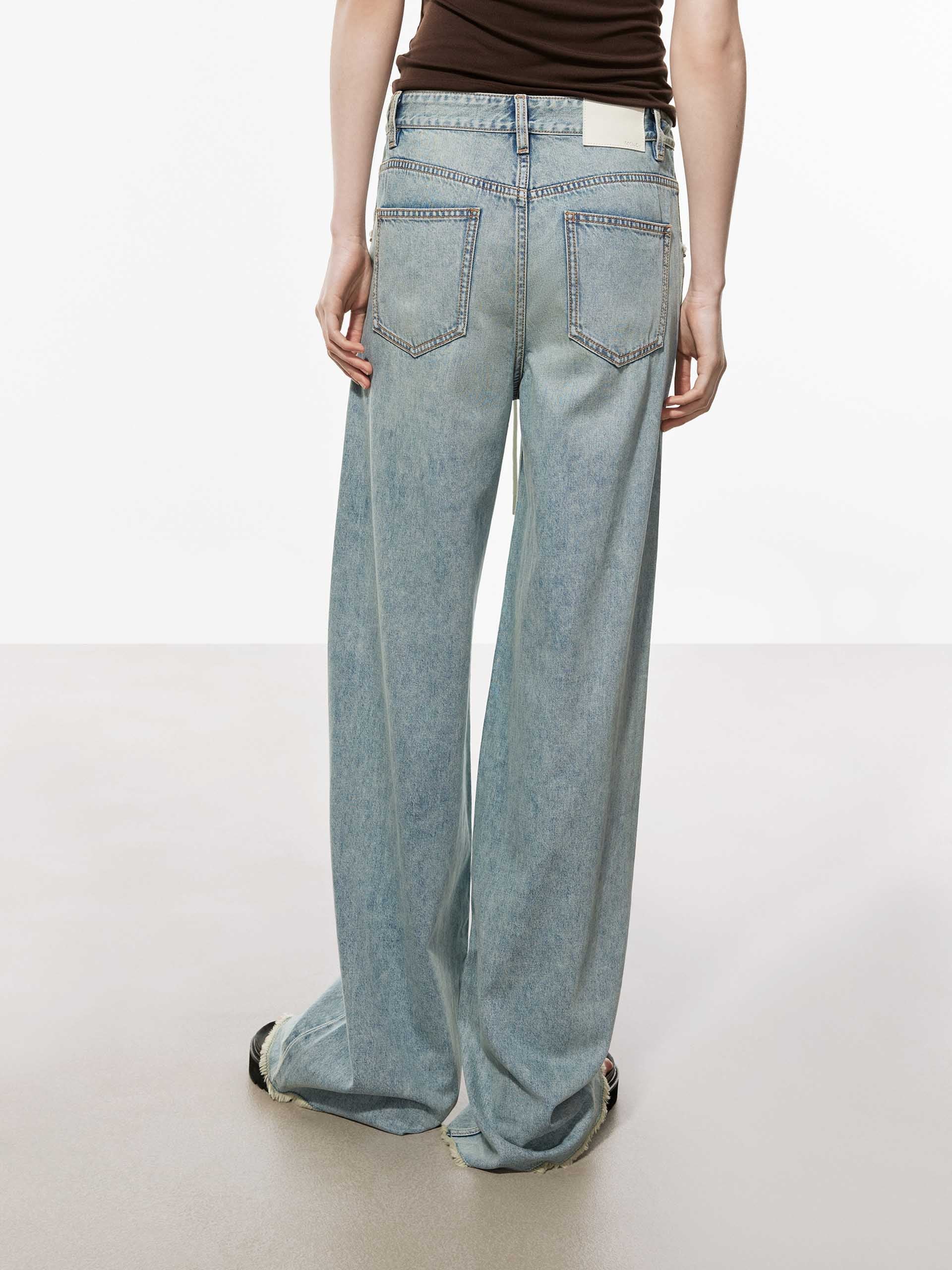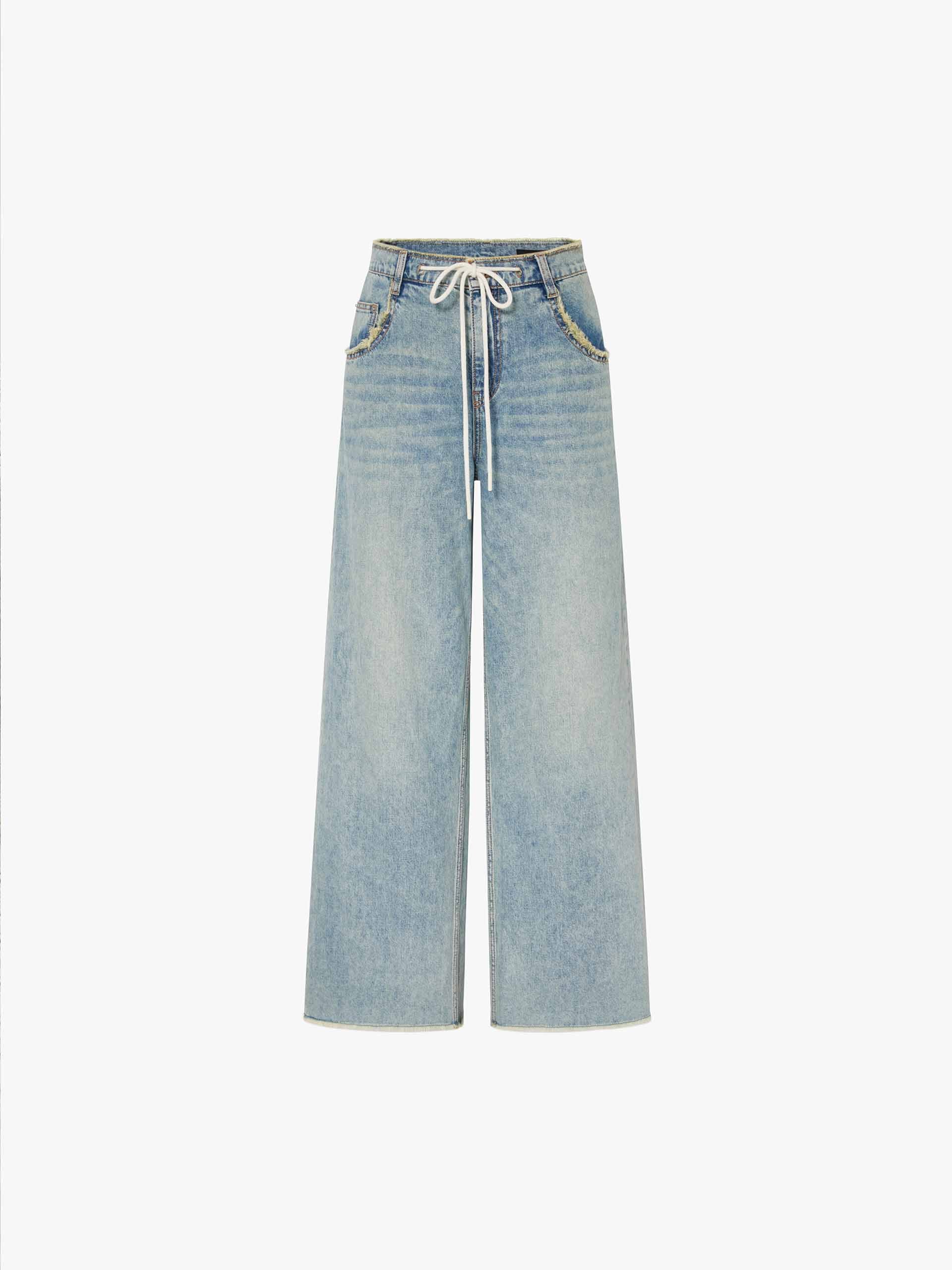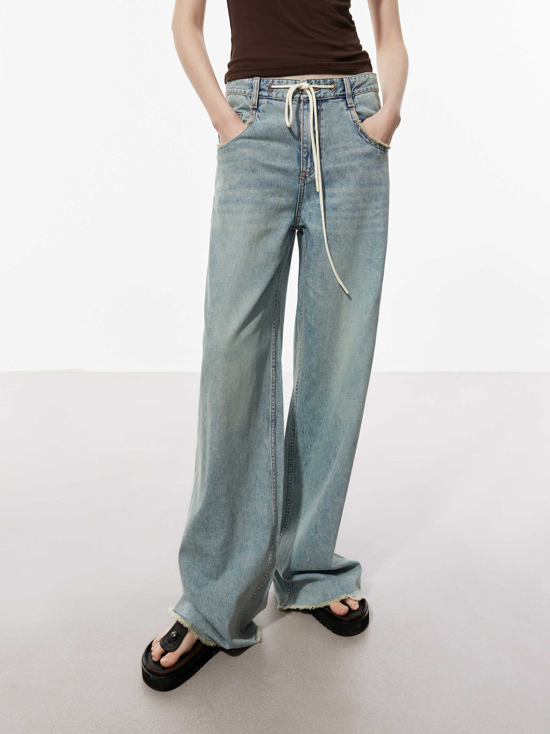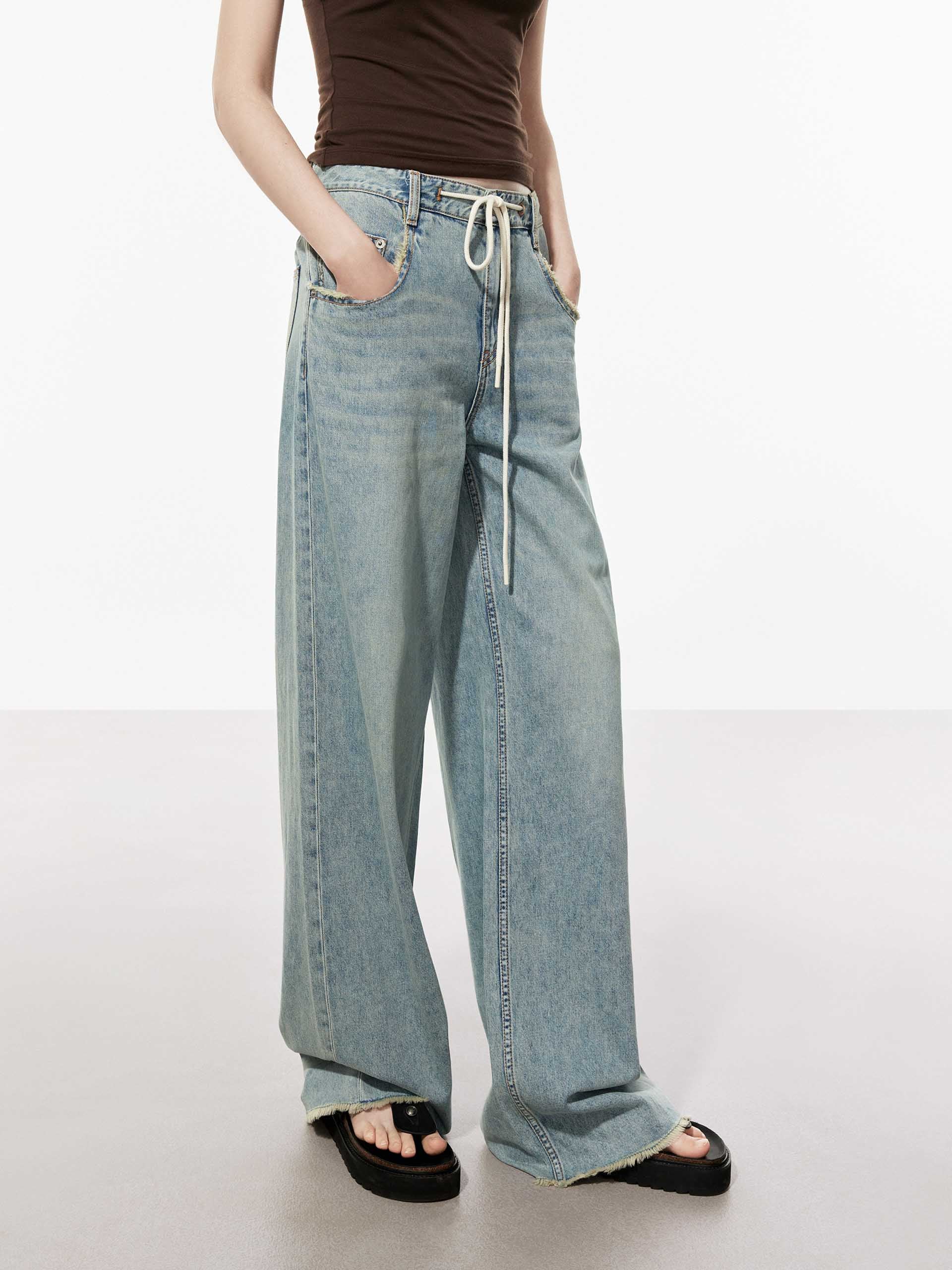 These jeans are everything about chicness and comfort. Made of a soft blend of 89% cotton and 11% silk, they have smooth textures, an inclusive long straight-leg silhouette, and a vintage blue water wash. They are mid-waist with a drawstring belt for adjustment and decoration. Raw trims are designed around the waist, pockets, and bottoms, which bring a rock-girl street-style vibe.