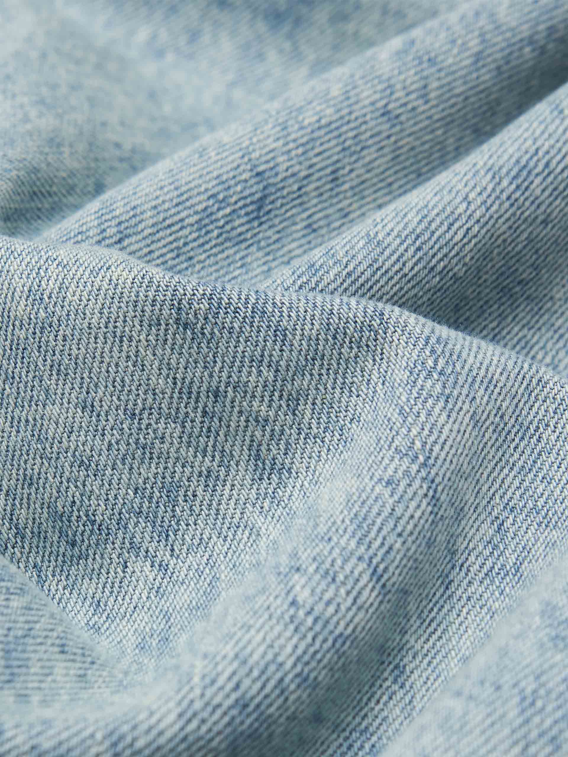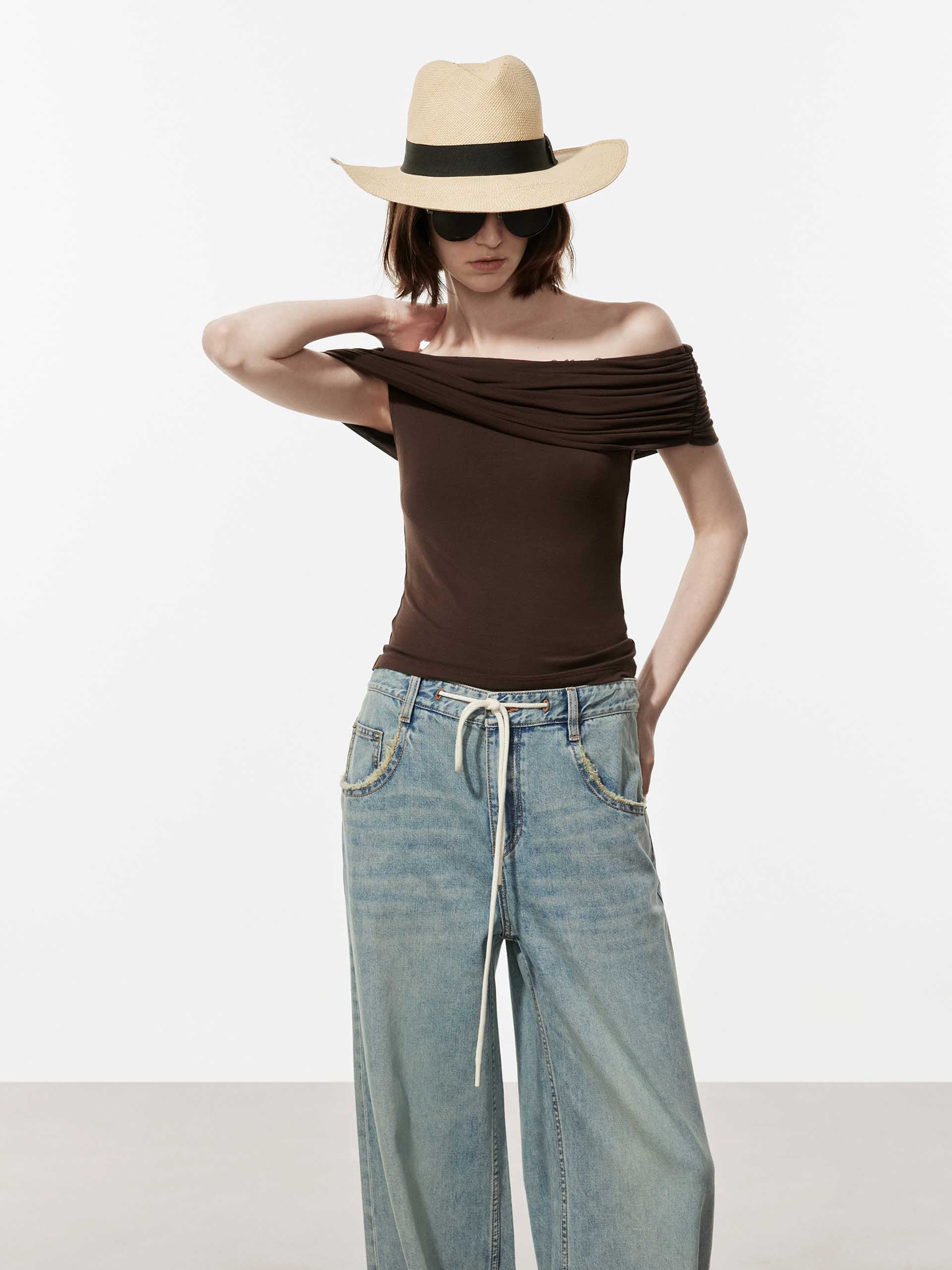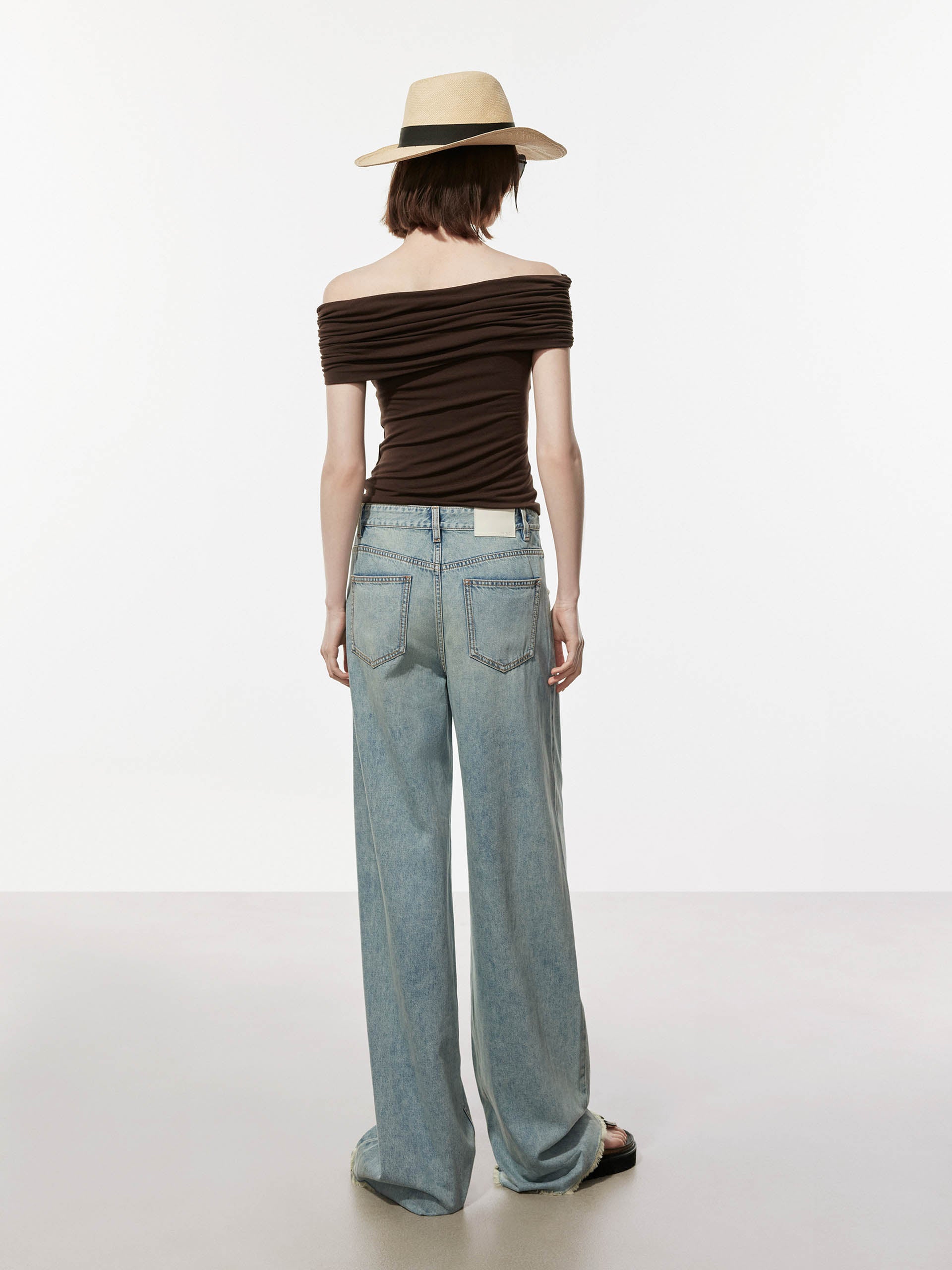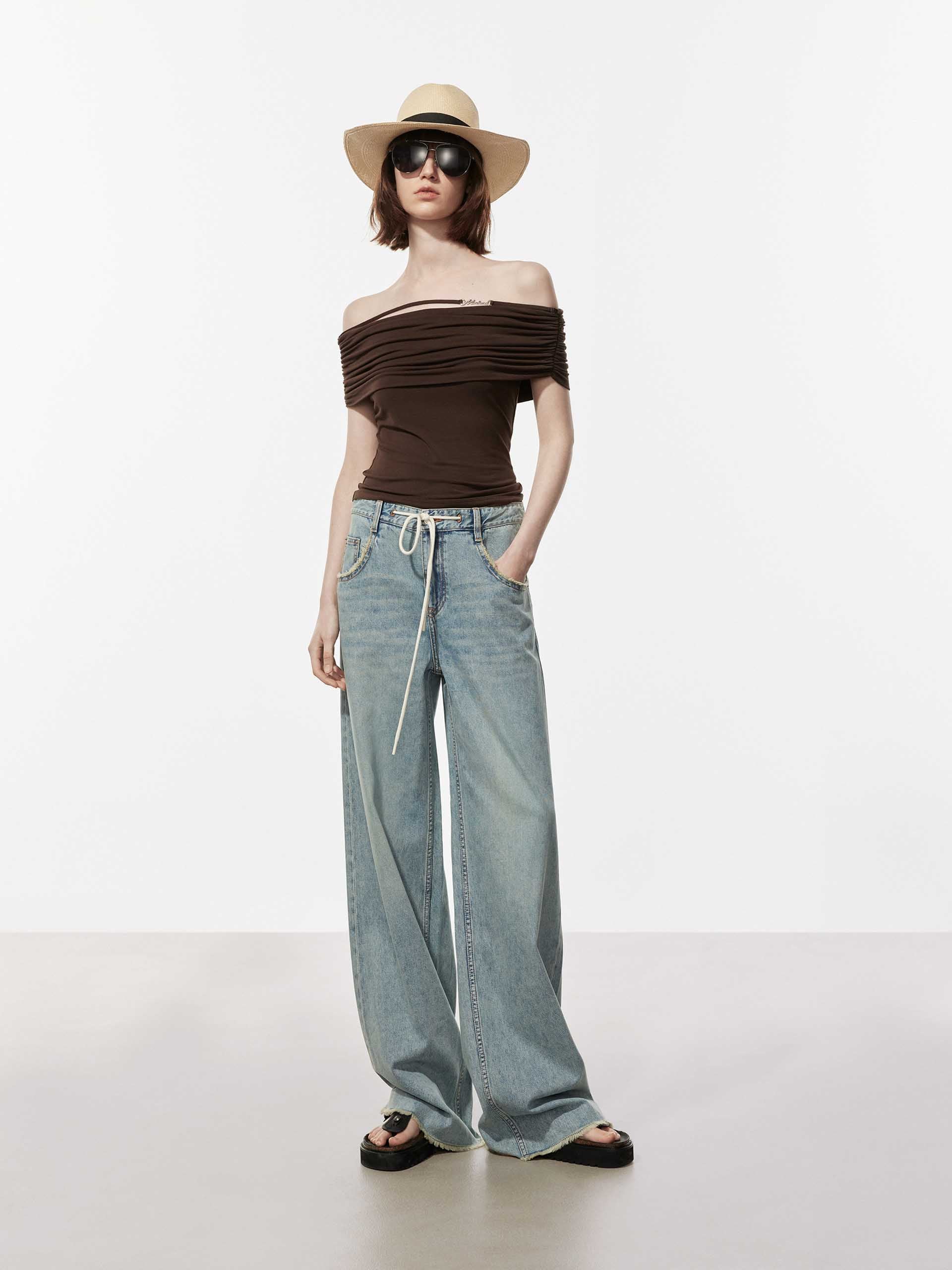 These jeans are everything about chicness and comfort. Made of a soft blend of 89% cotton and 11% silk, they have smooth textures, an inclusive long straight-leg silhouette, and a vintage blue water wash. They are mid-waist with a drawstring belt for adjustment and decoration. Raw trims are designed around the waist, pockets, and bottoms, which bring a rock-girl street-style vibe.