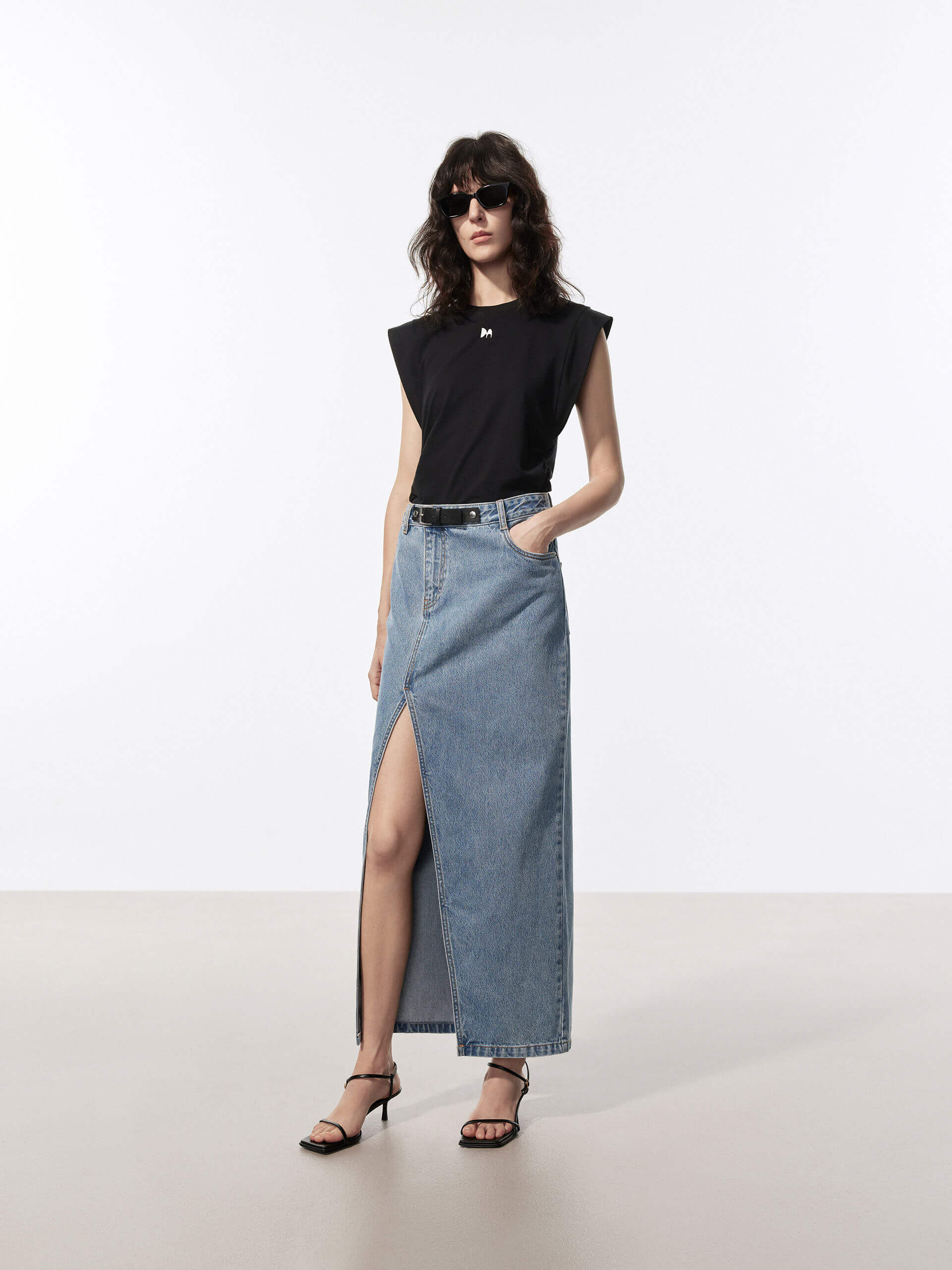 This silhouette of this column maxi skirt calls to mind styles from the '00s. Crafted from cotton denim, it's modernized for Summer 2024 with an asymmetrical slit at the front and unique front buckle and zipper closure. Pair it with a fitted top for a chic look.