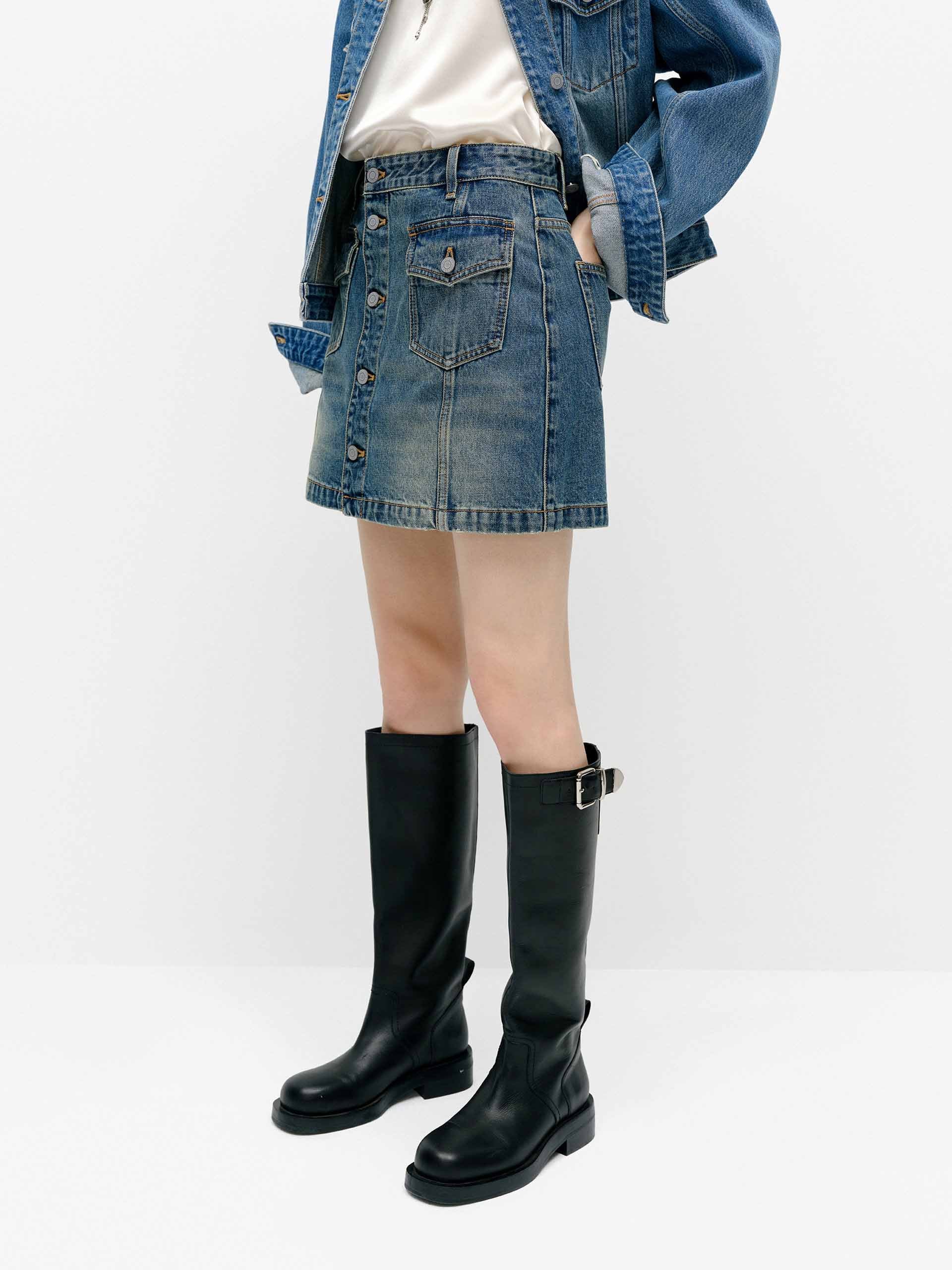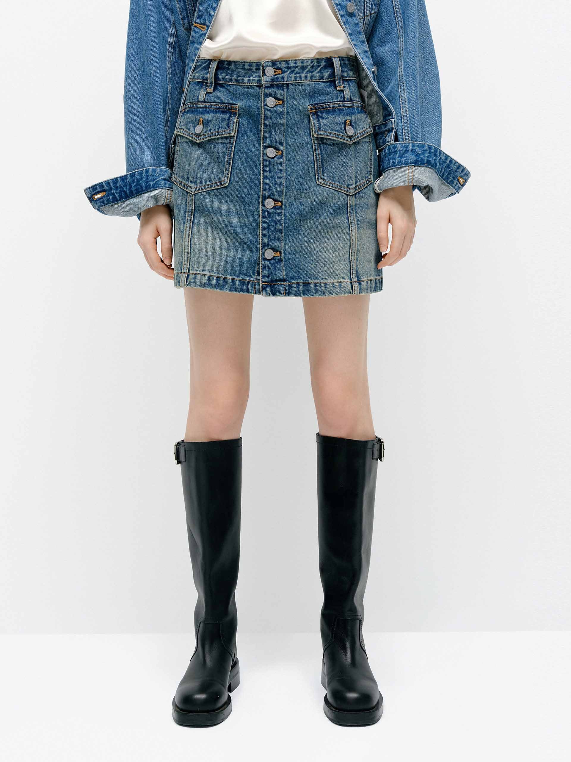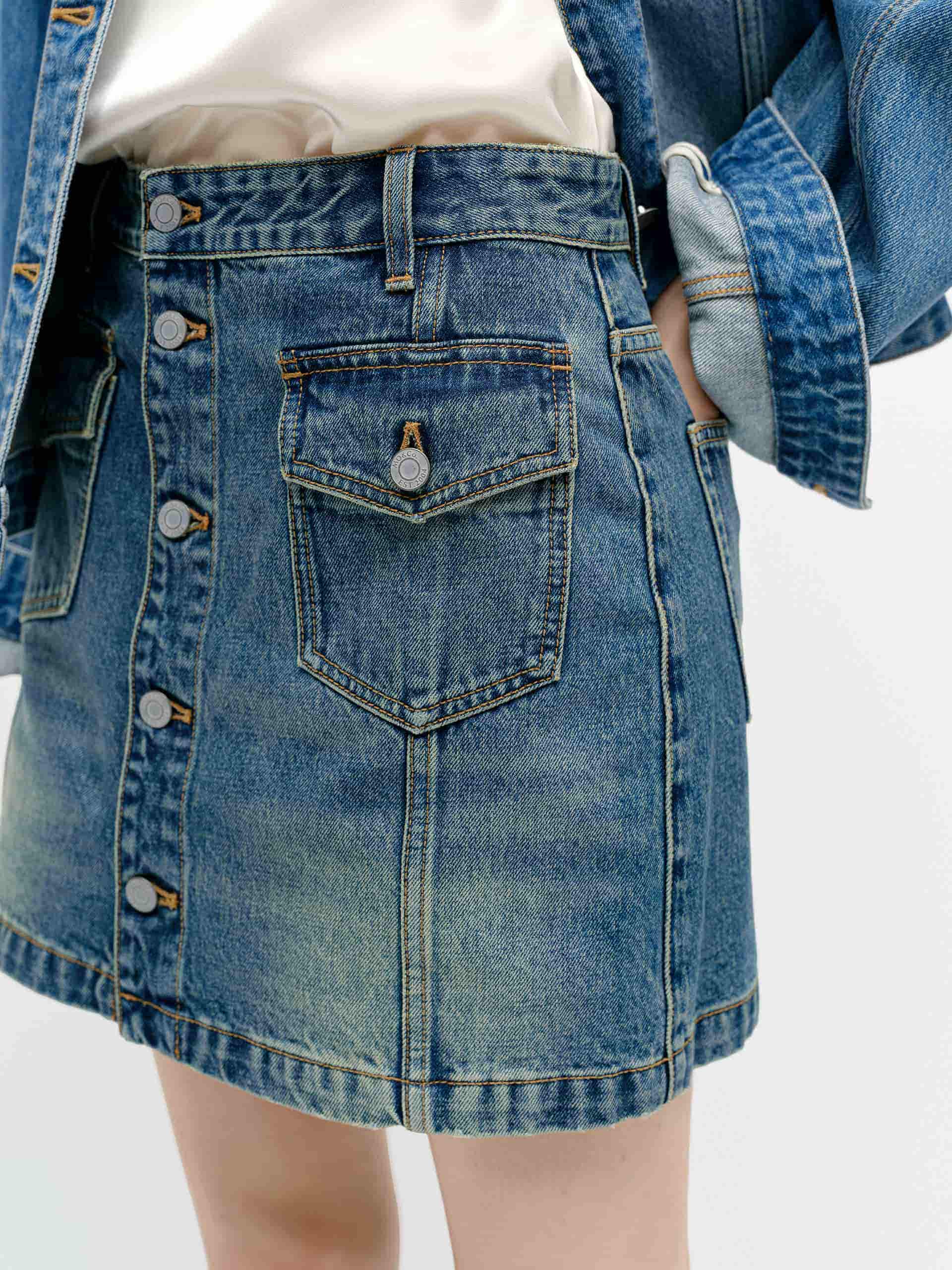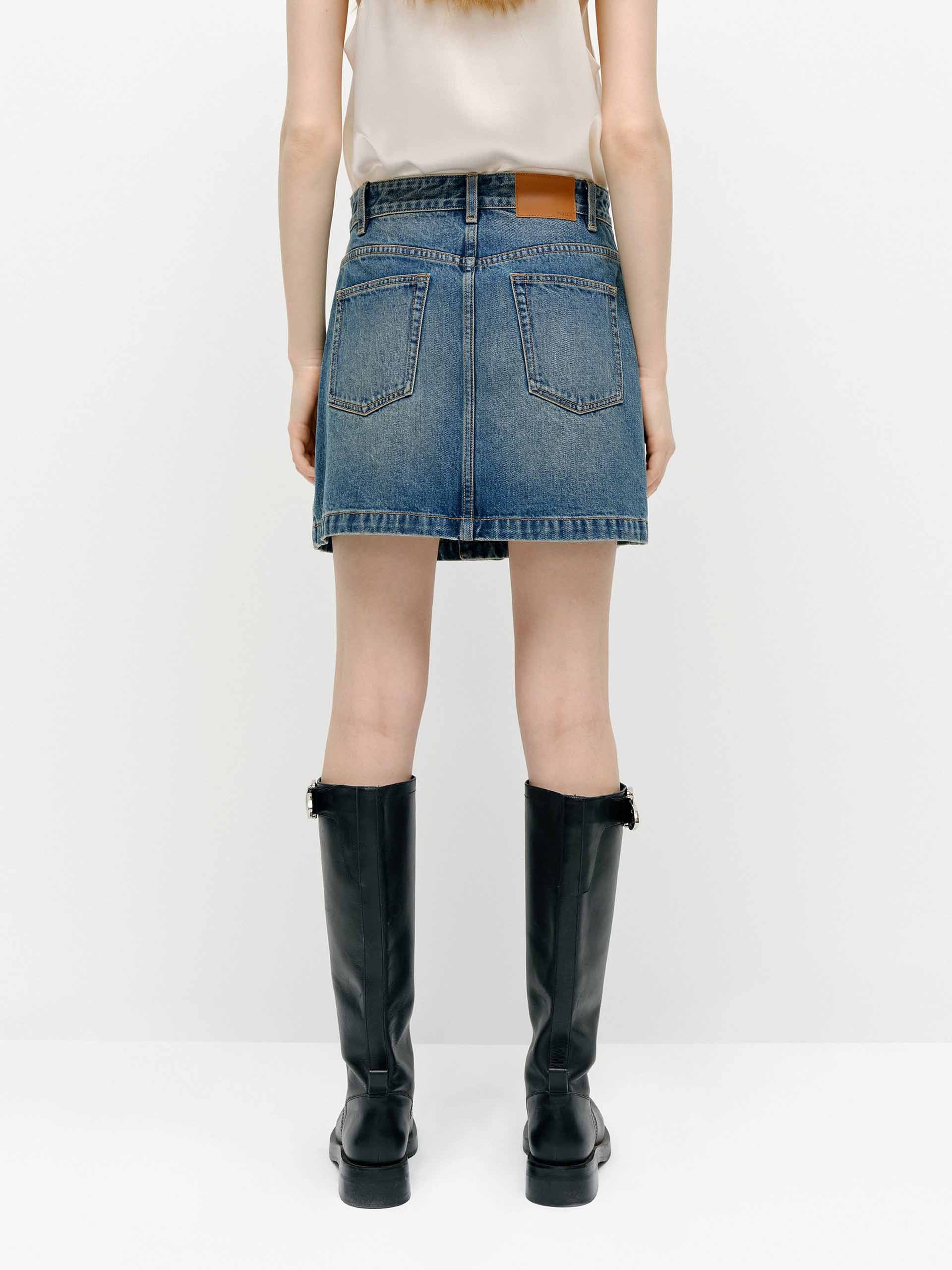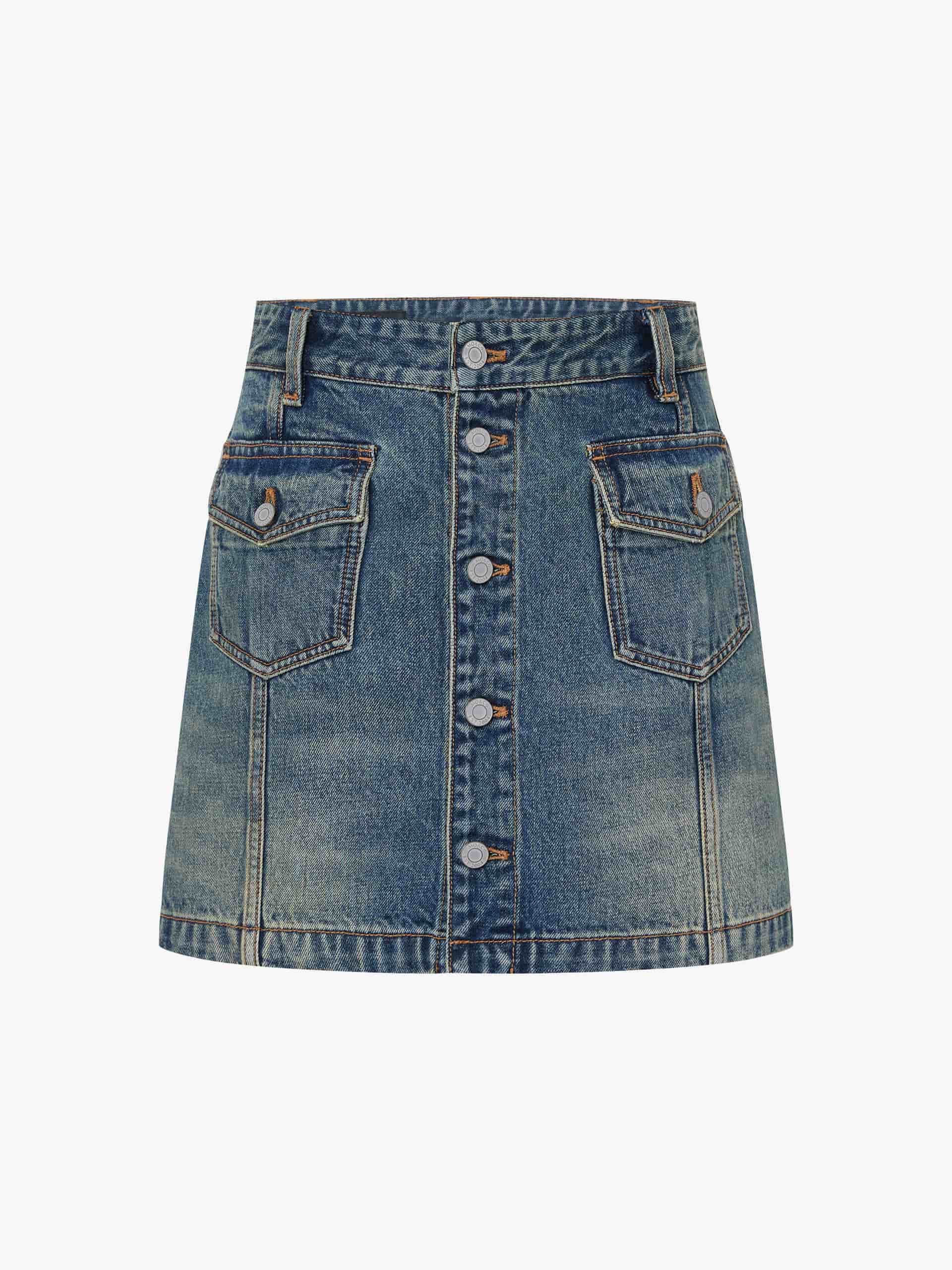 Expertly made in blue denim, this skirt is a versatile addition to any wardrobe. Its straight silhouette, patch pocket and front button fastening offer style and functionality.