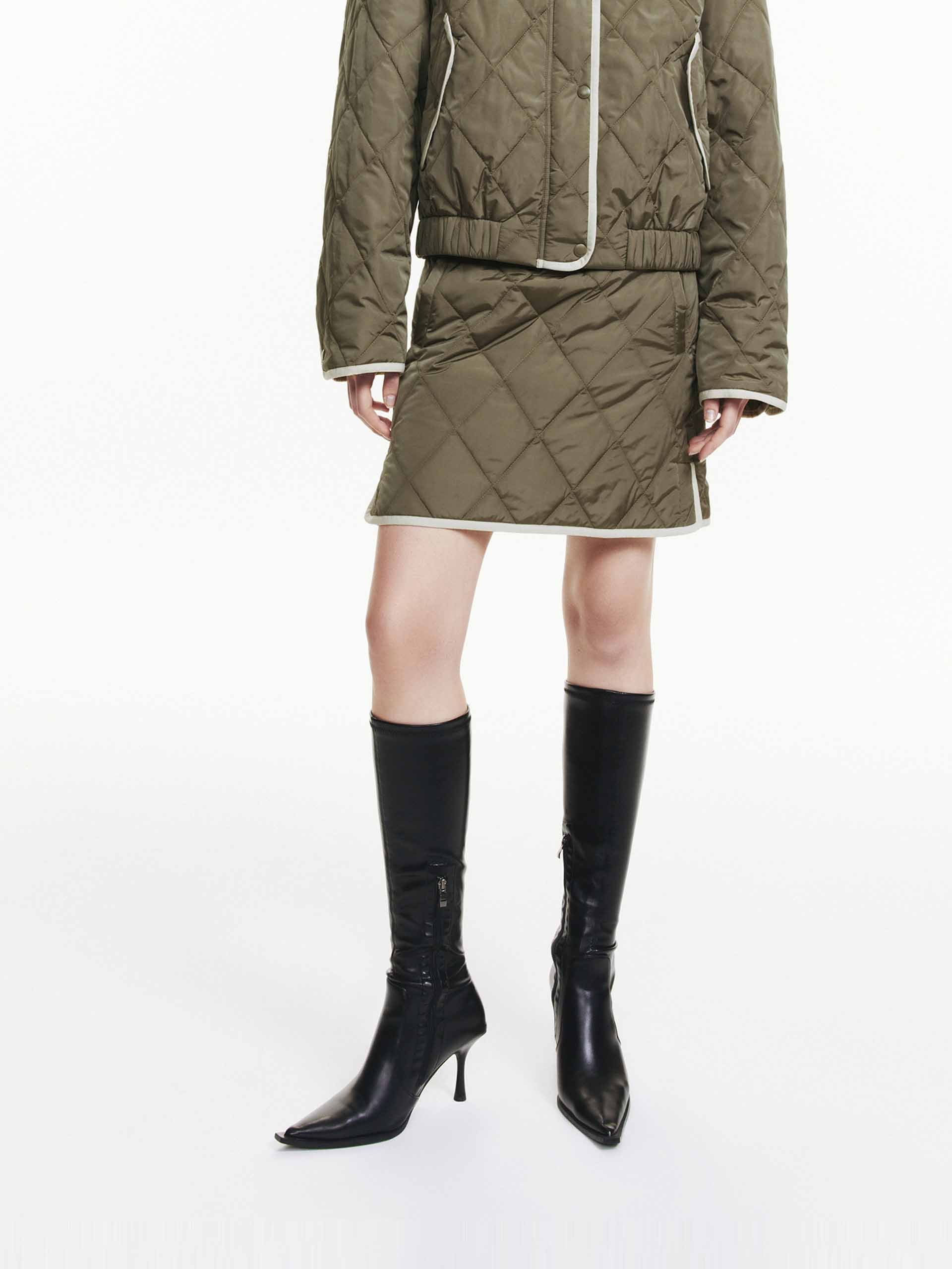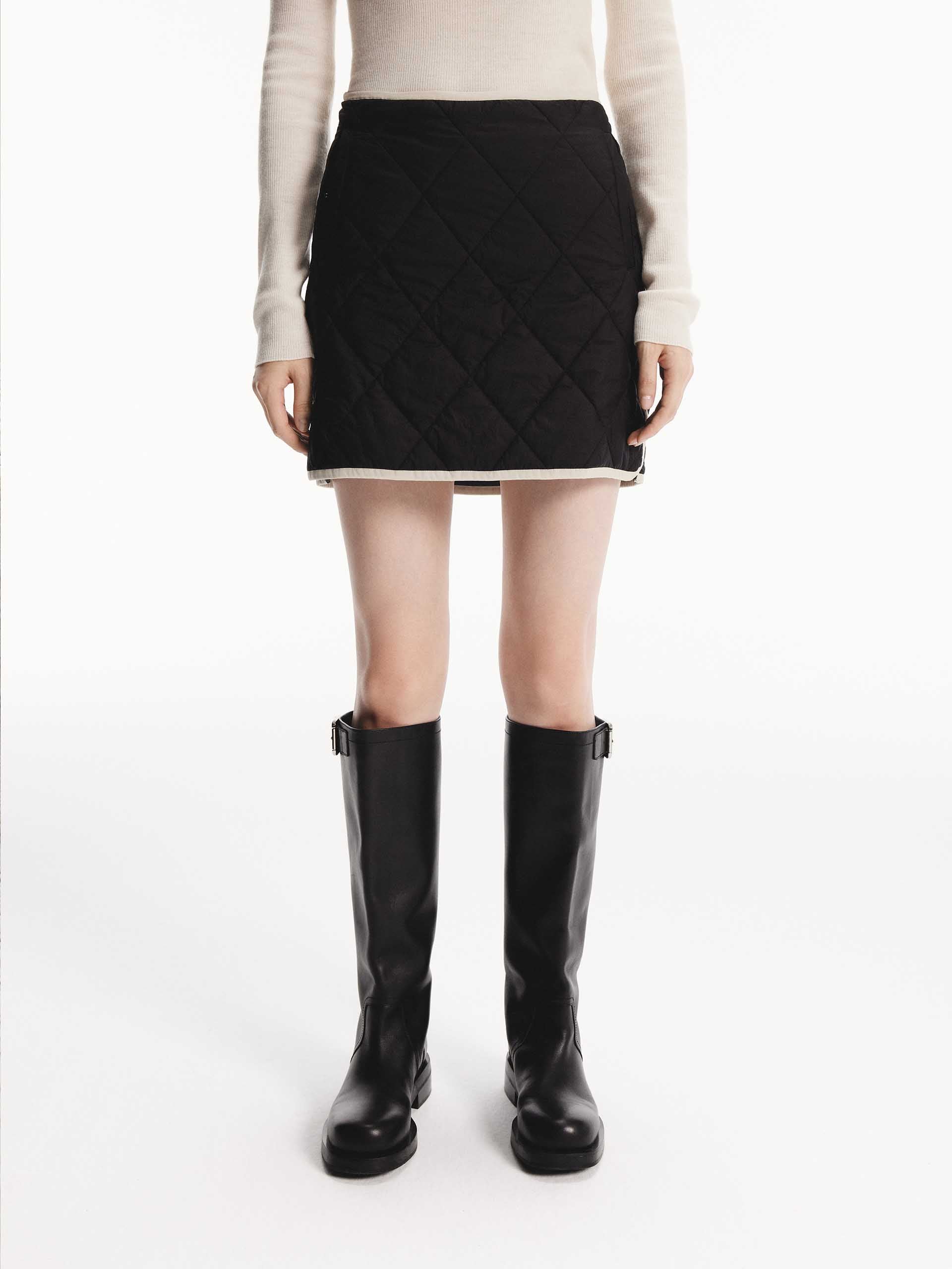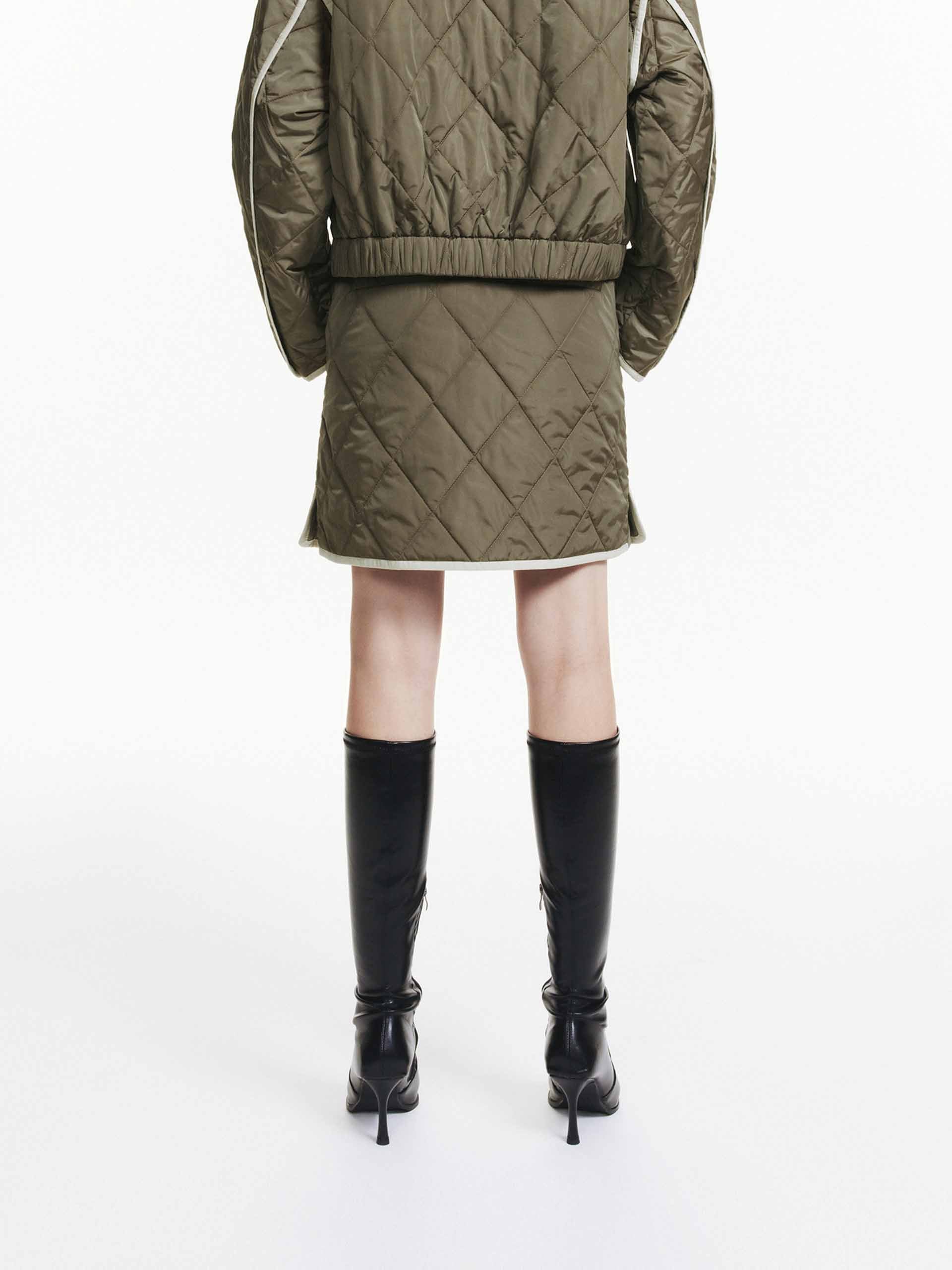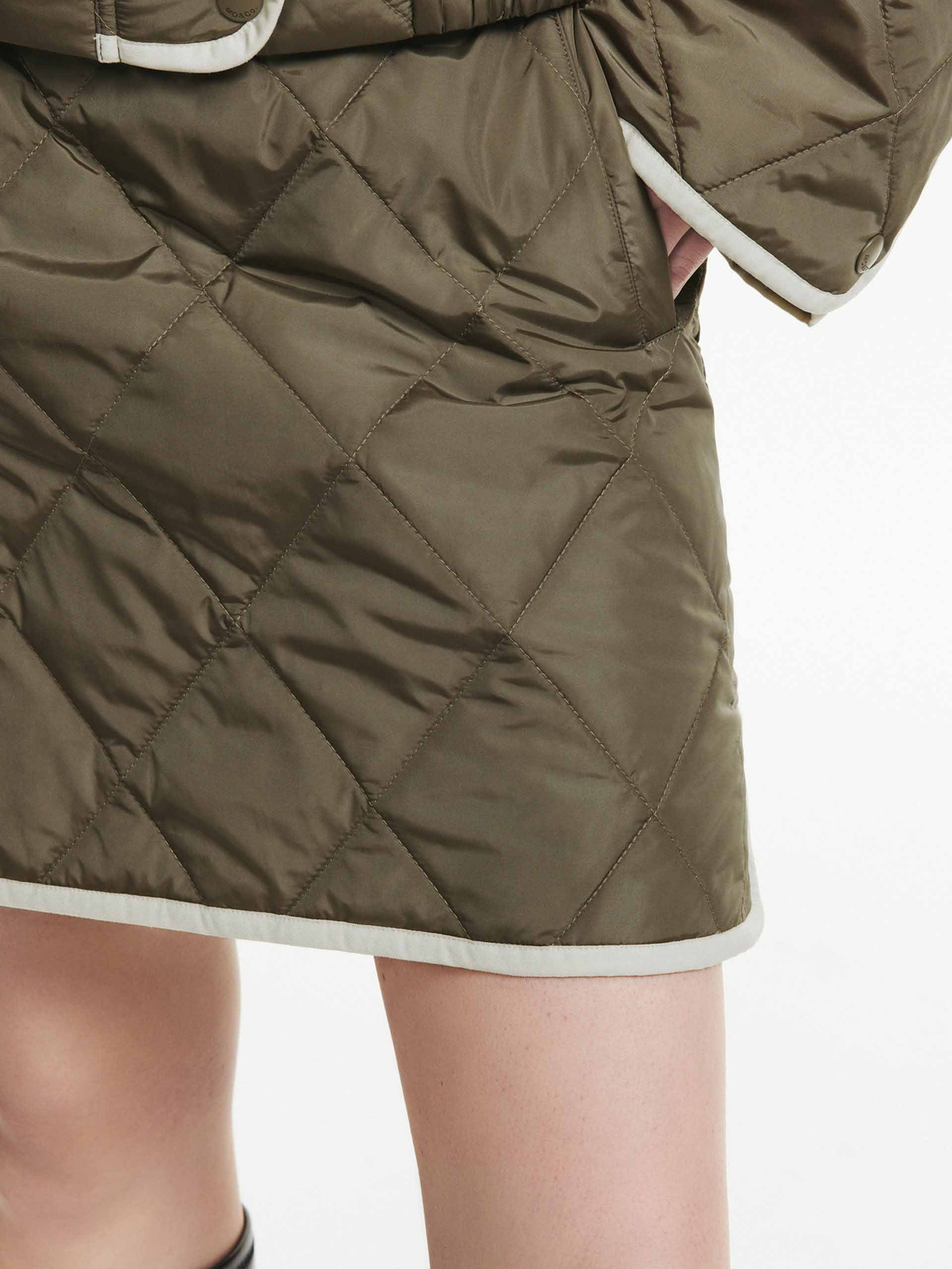 This mini skirt features a geometric quilted design with a slightly A-line silhouette. A contrast trim and side pocket add functional and stylish elements. With a side zip closure for easy to slip on and wear. Pair with the coordinating coat for a complete look.