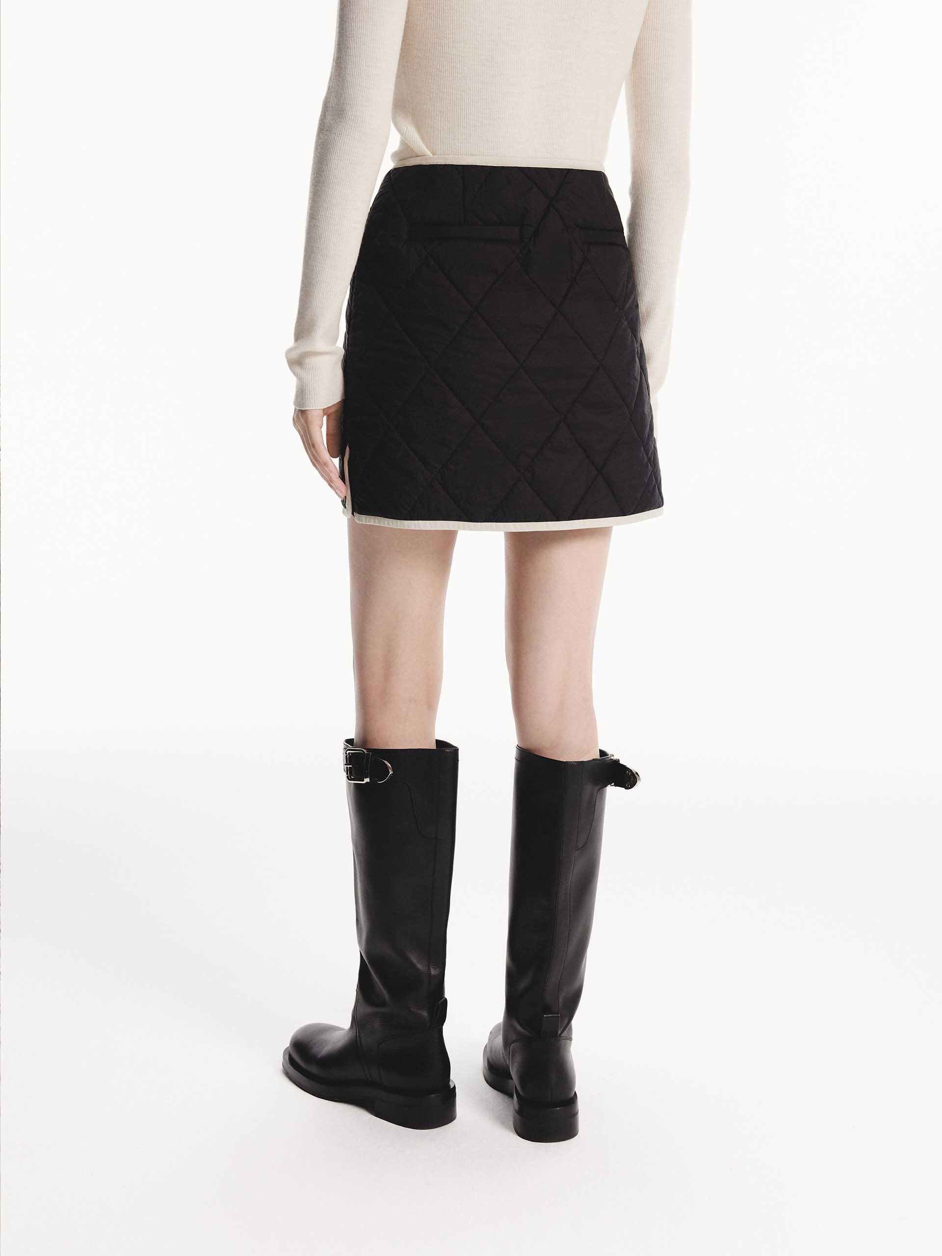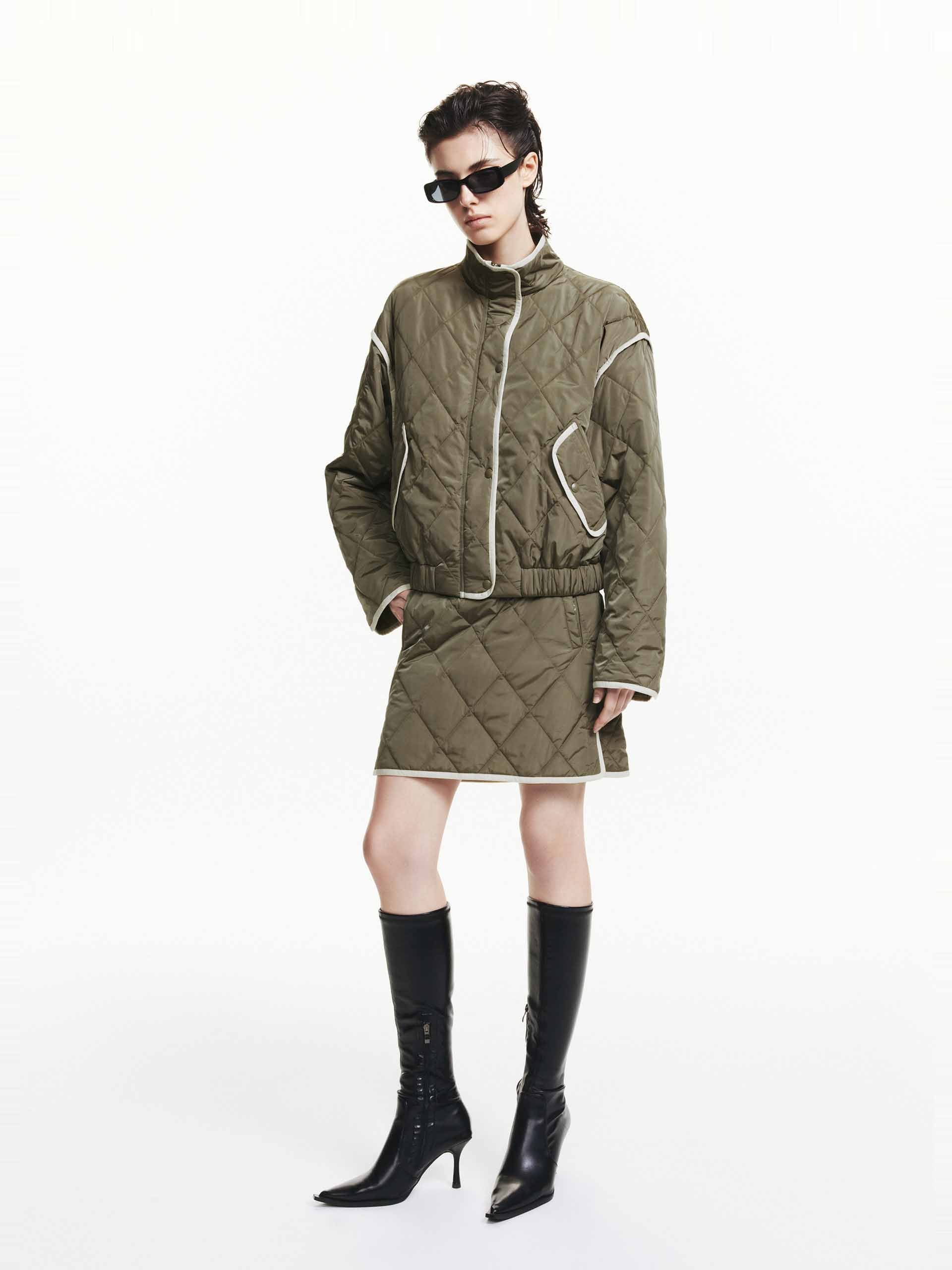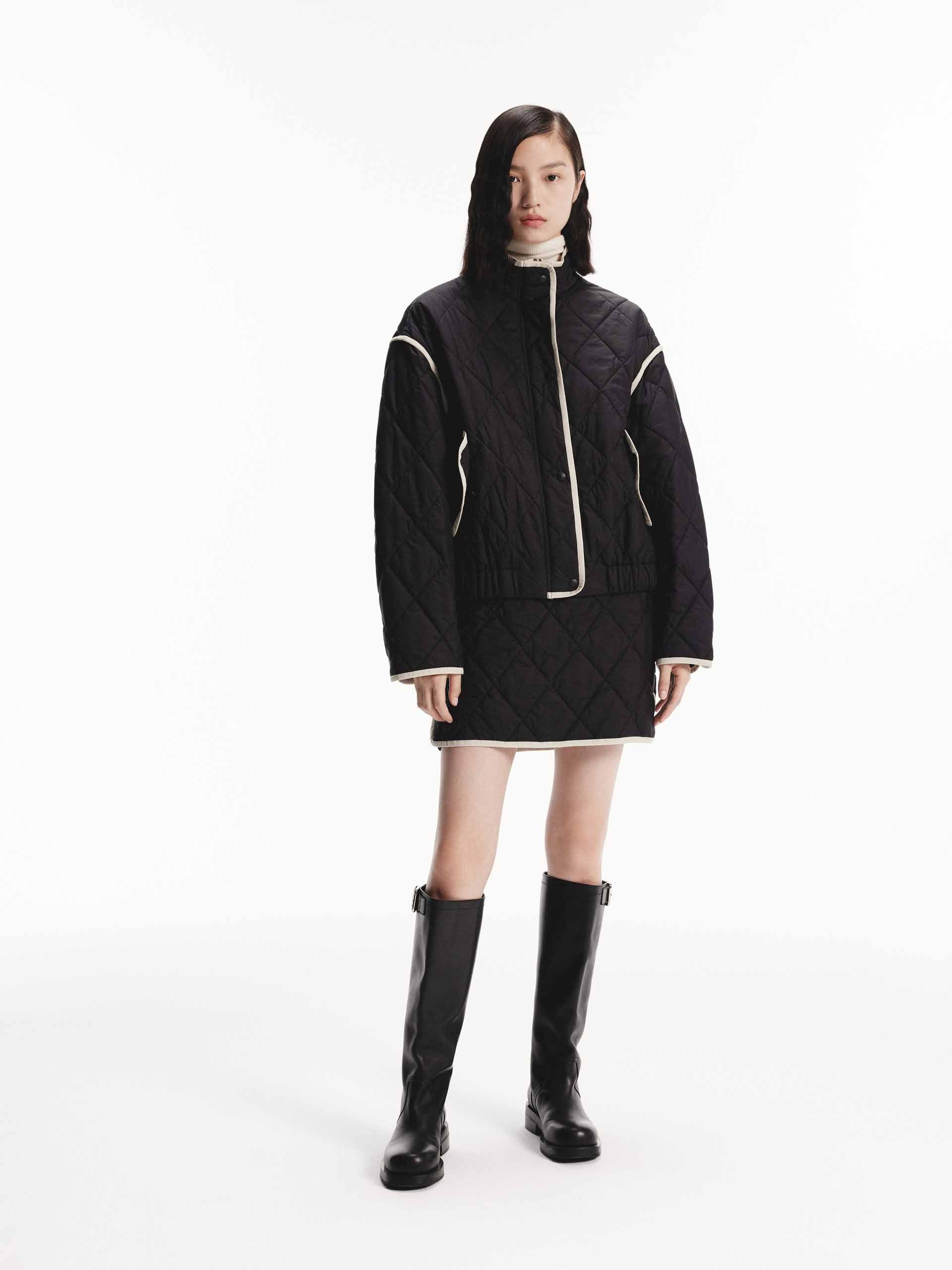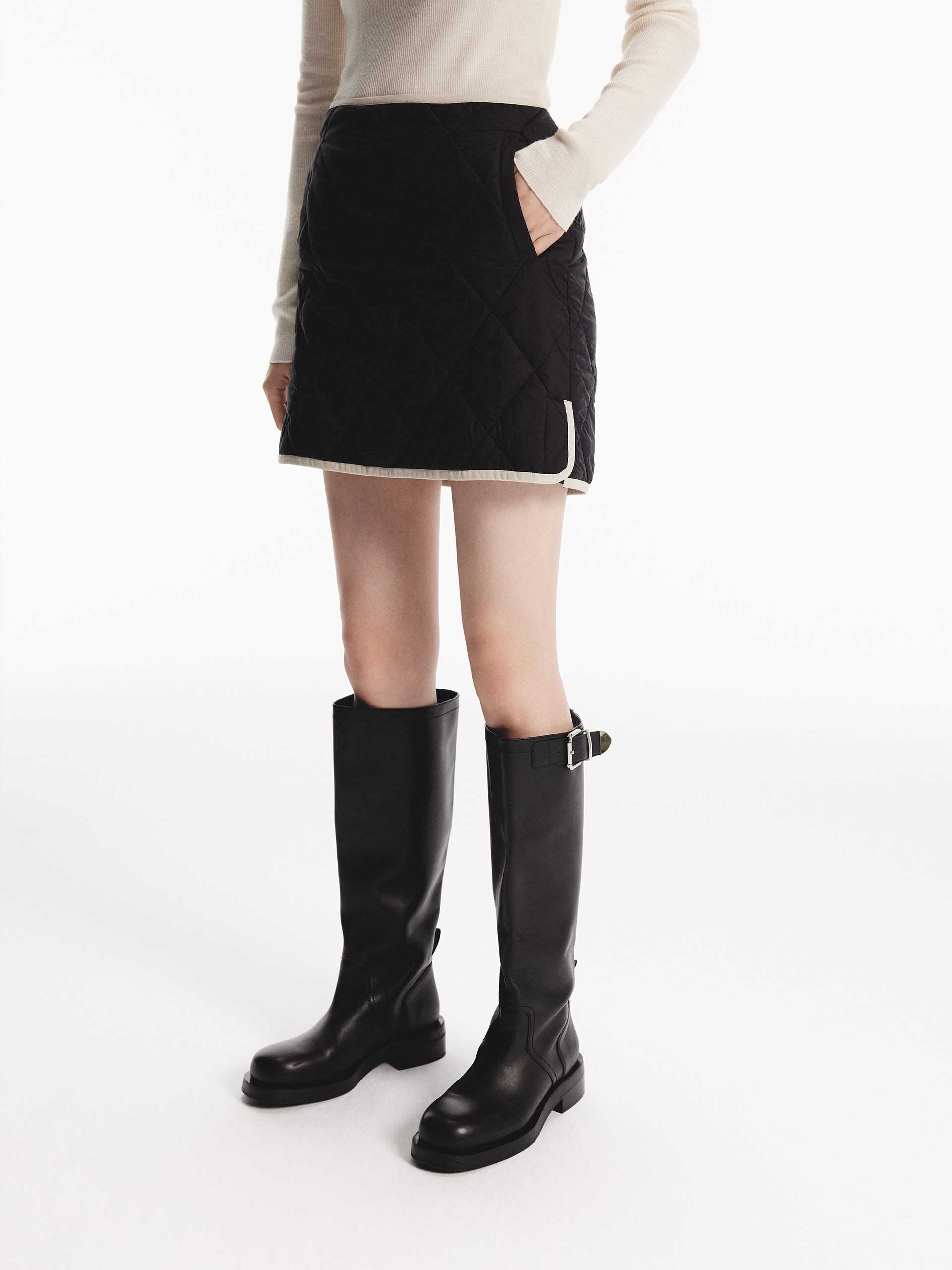 This mini skirt features a geometric quilted design with a slightly A-line silhouette. A contrast trim and side pocket add functional and stylish elements. With a side zip closure for easy to slip on and wear. Pair with the coordinating coat for a complete look.