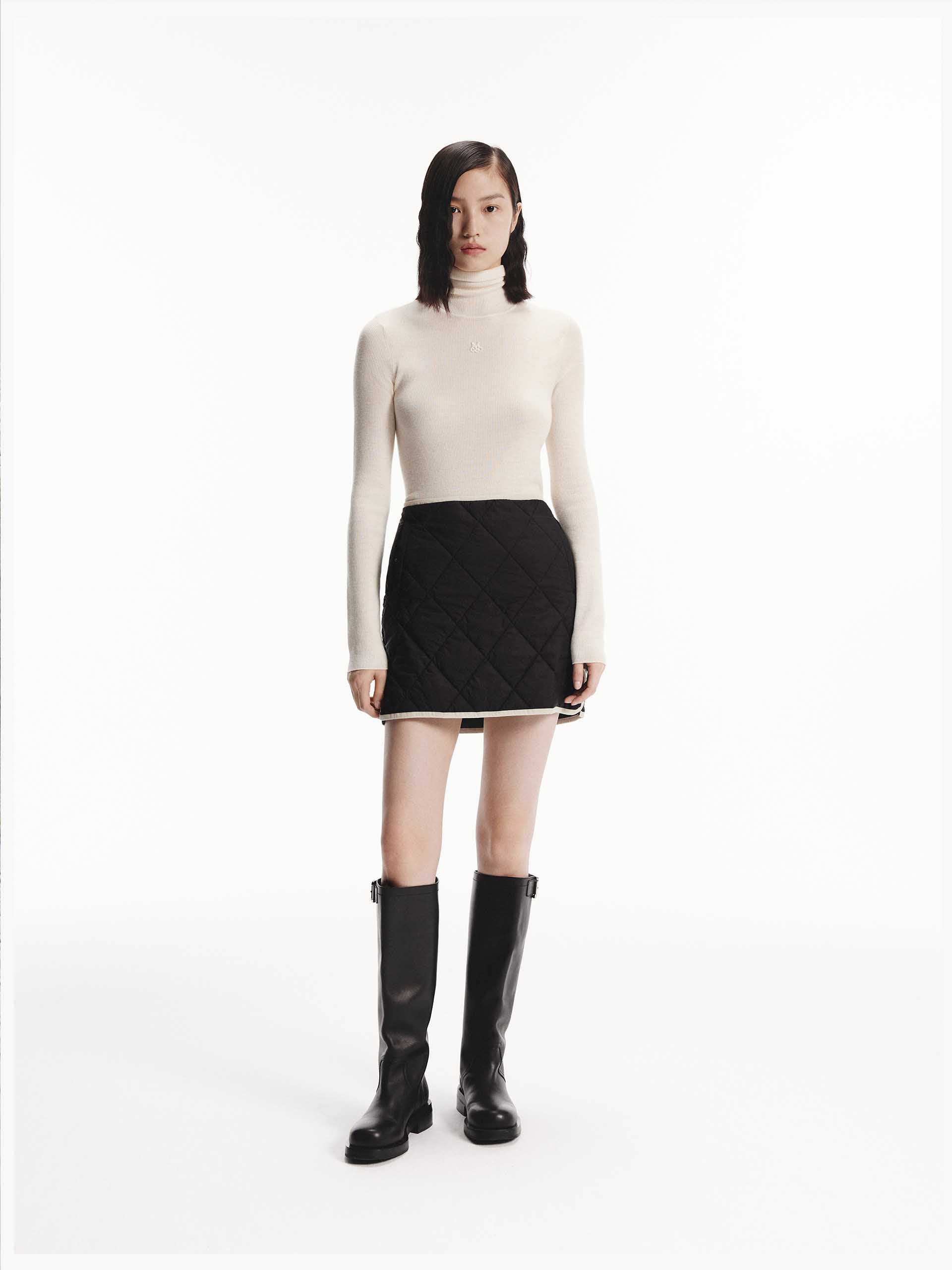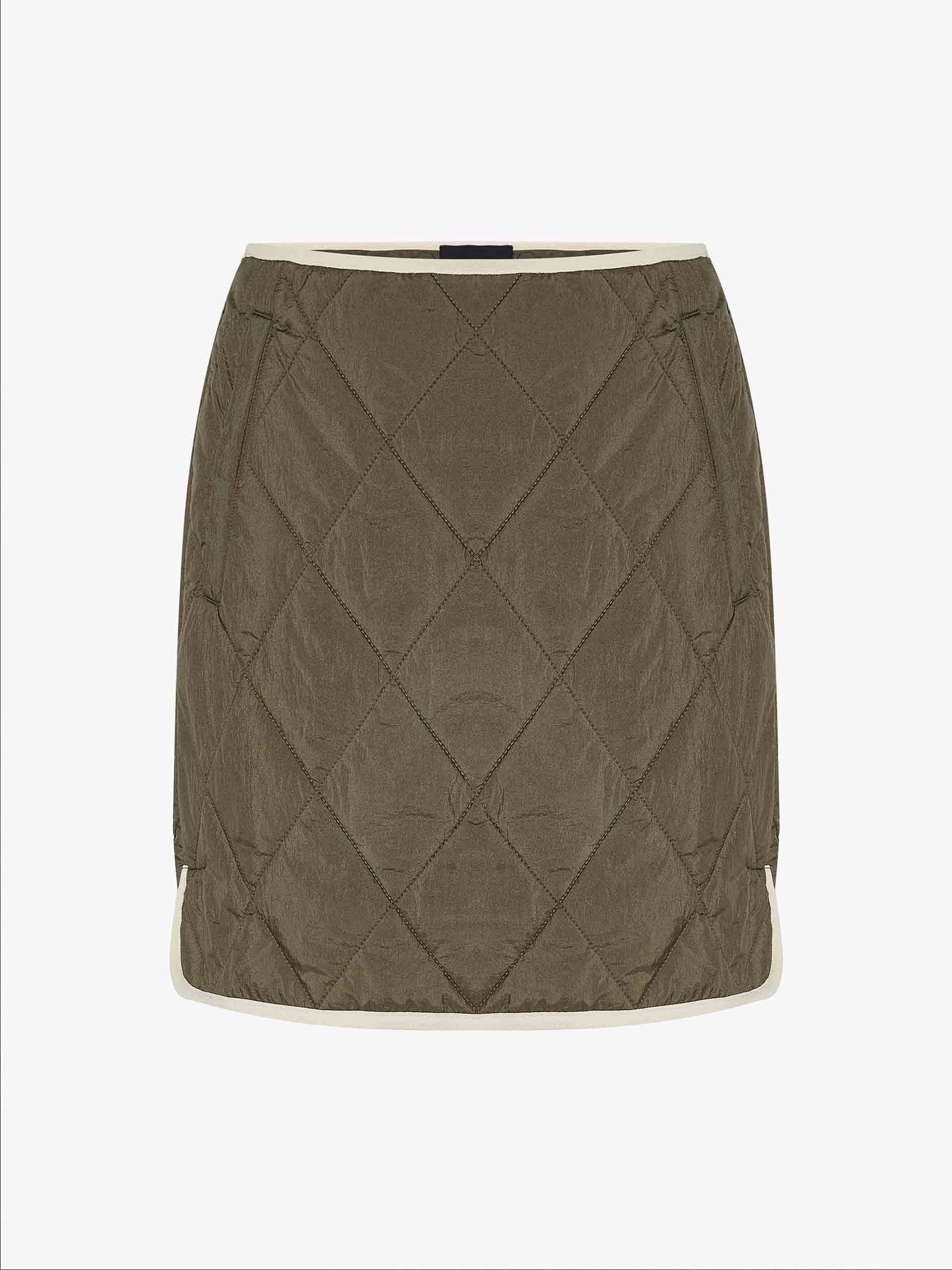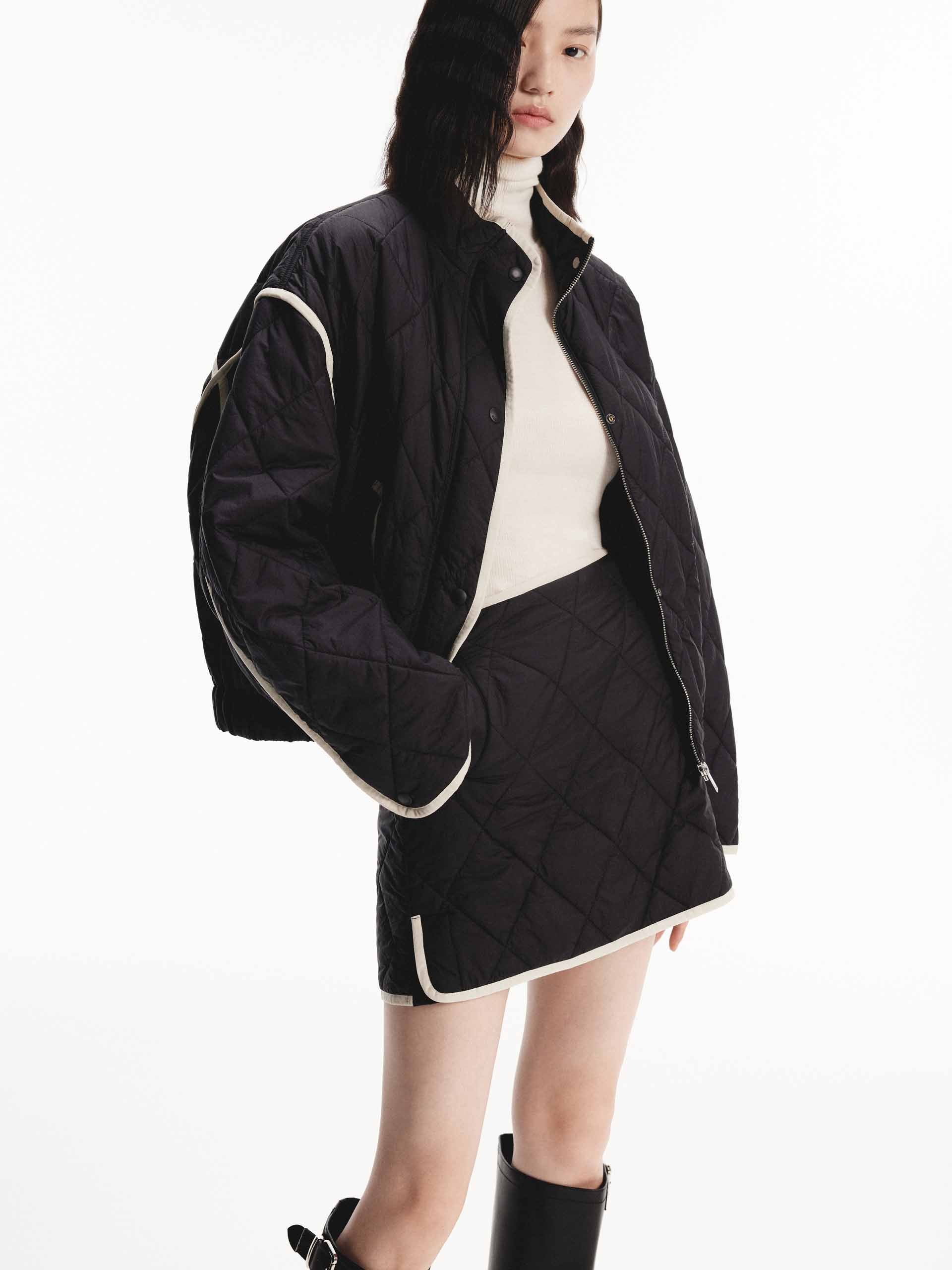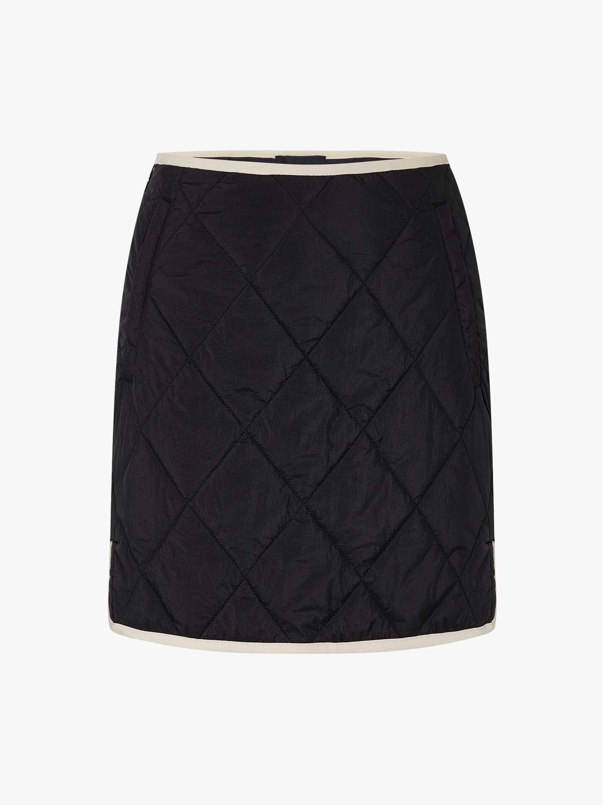 This mini skirt features a geometric quilted design with a slightly A-line silhouette. A contrast trim and side pocket add functional and stylish elements. With a side zip closure for easy to slip on and wear. Pair with the coordinating coat for a complete look.