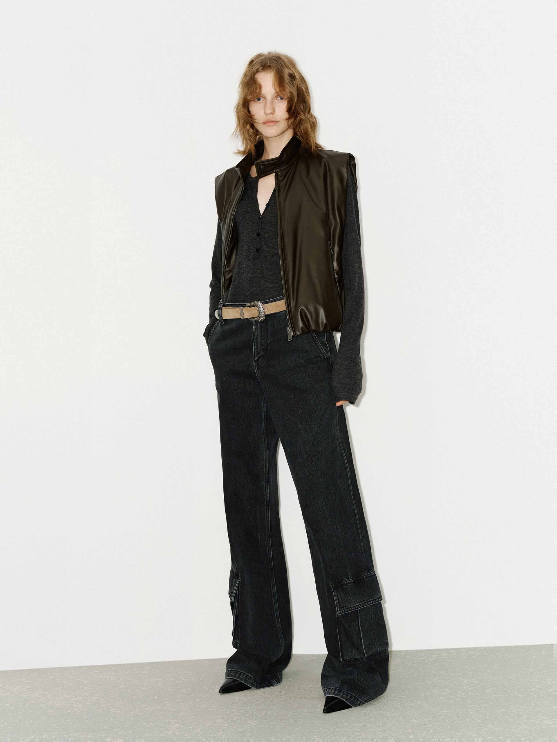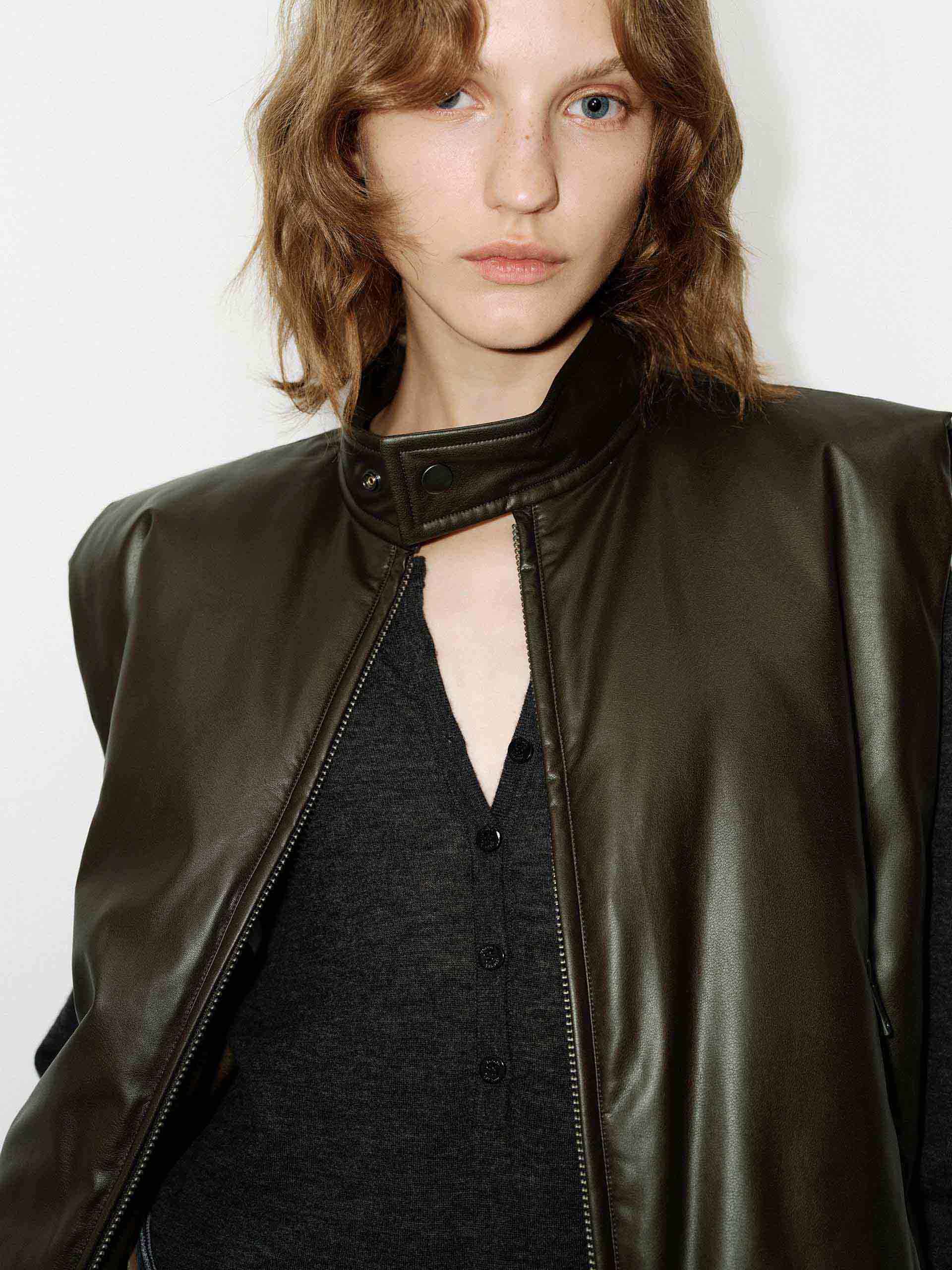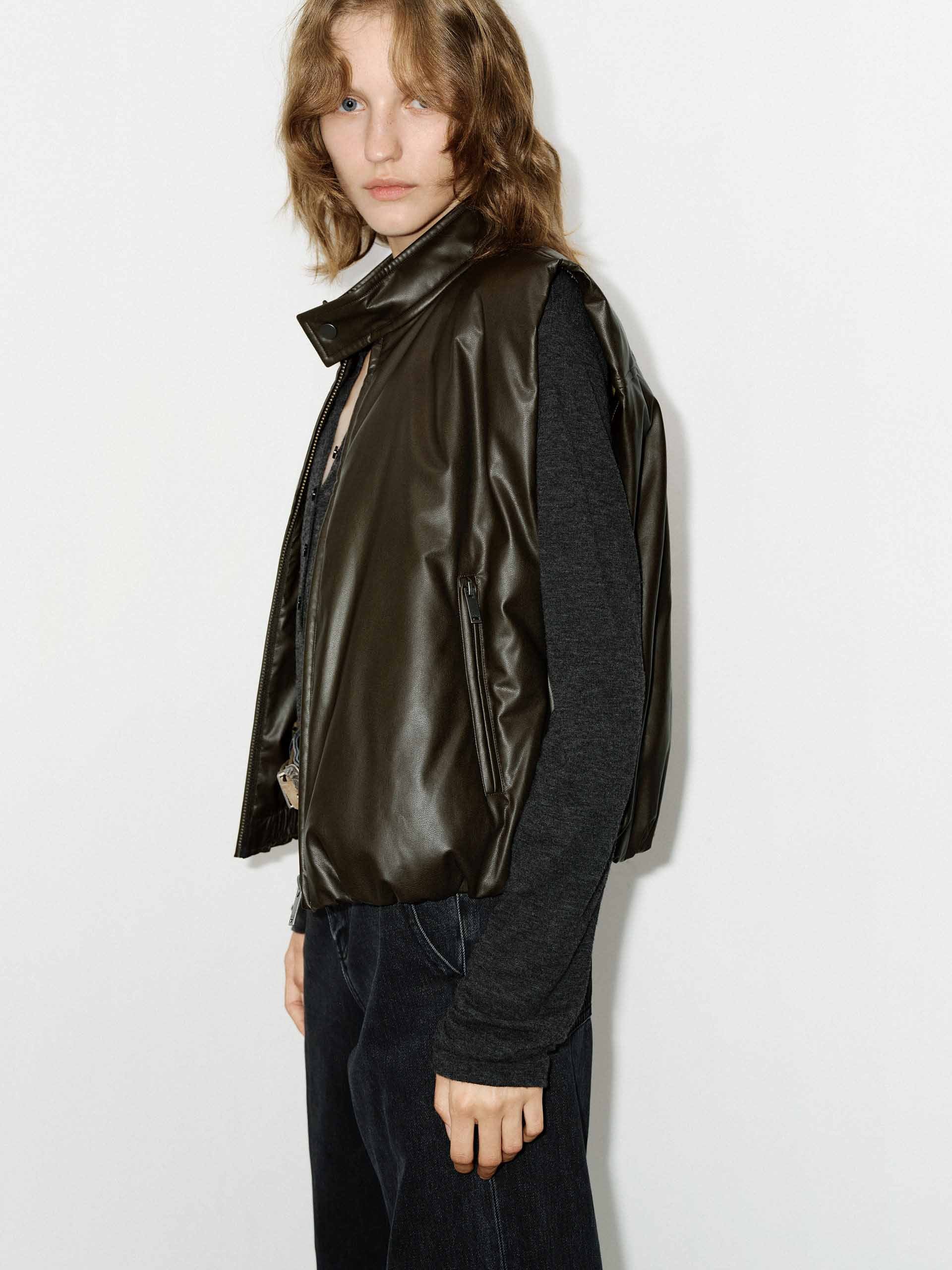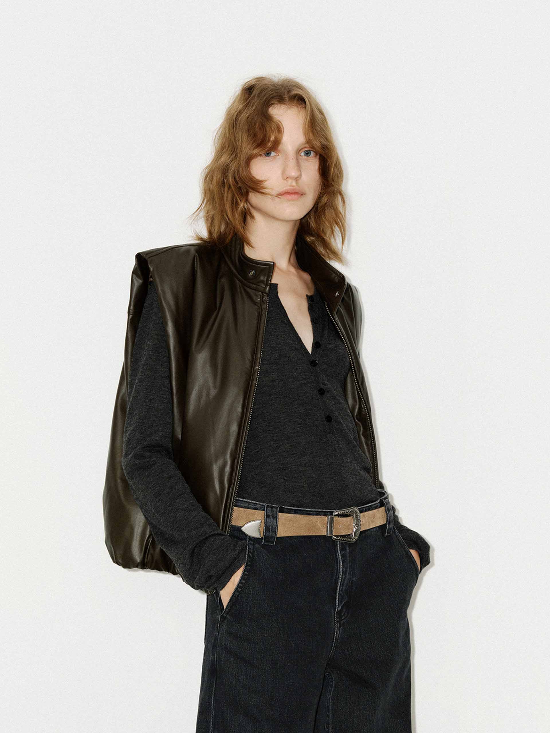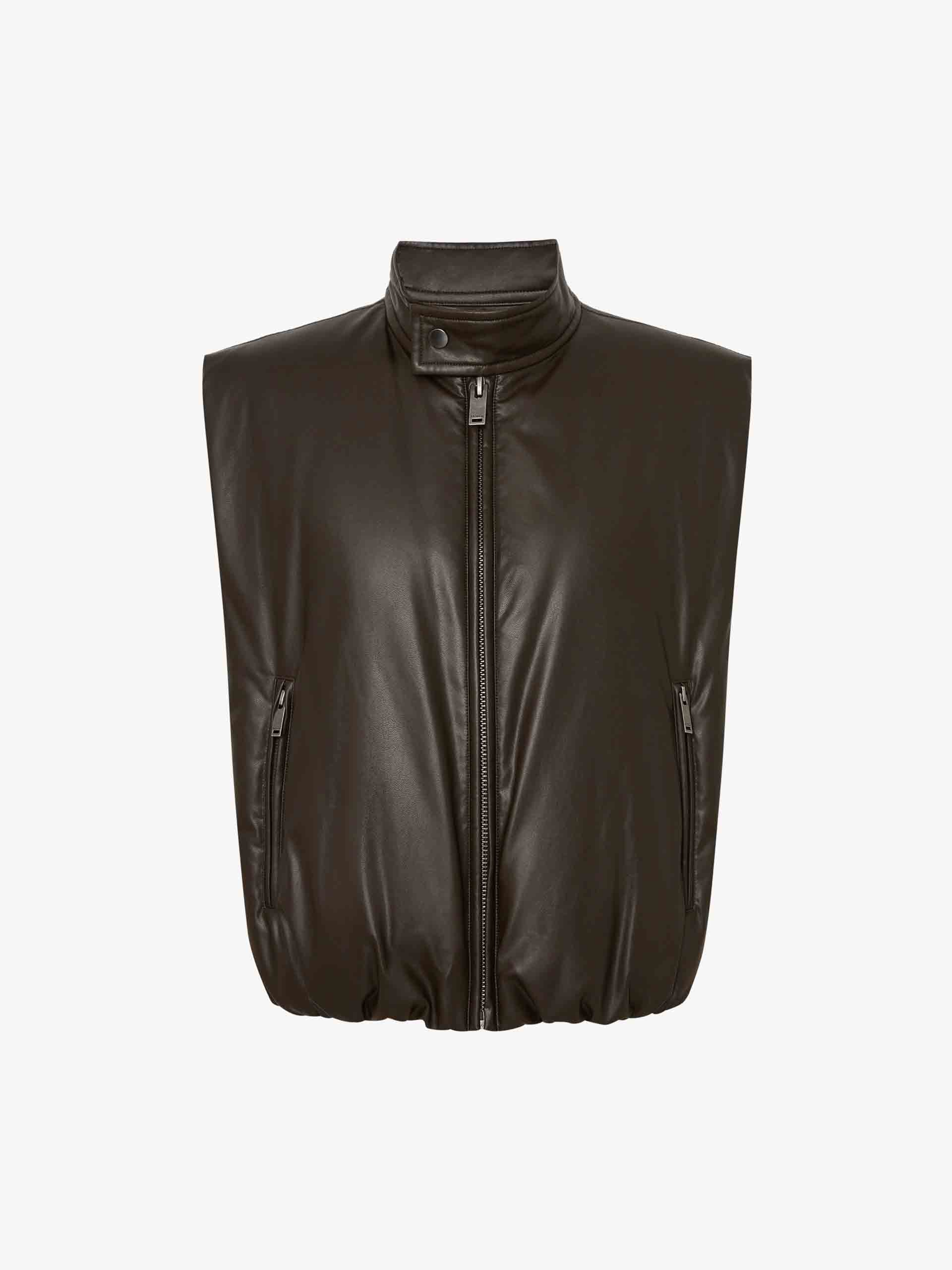 This down vest is a must-have for any transitional wardrobe. Its hybrid design allows for versatile styling. It has a soft leather finish, wide shoulders, and a side pocket design that offers style and comfort. With duck down filling, it's the perfect layer for any weather.