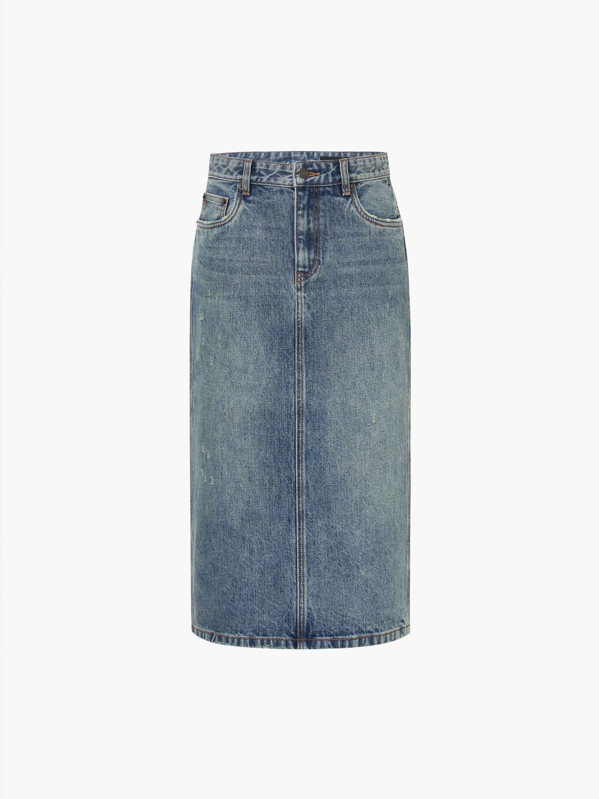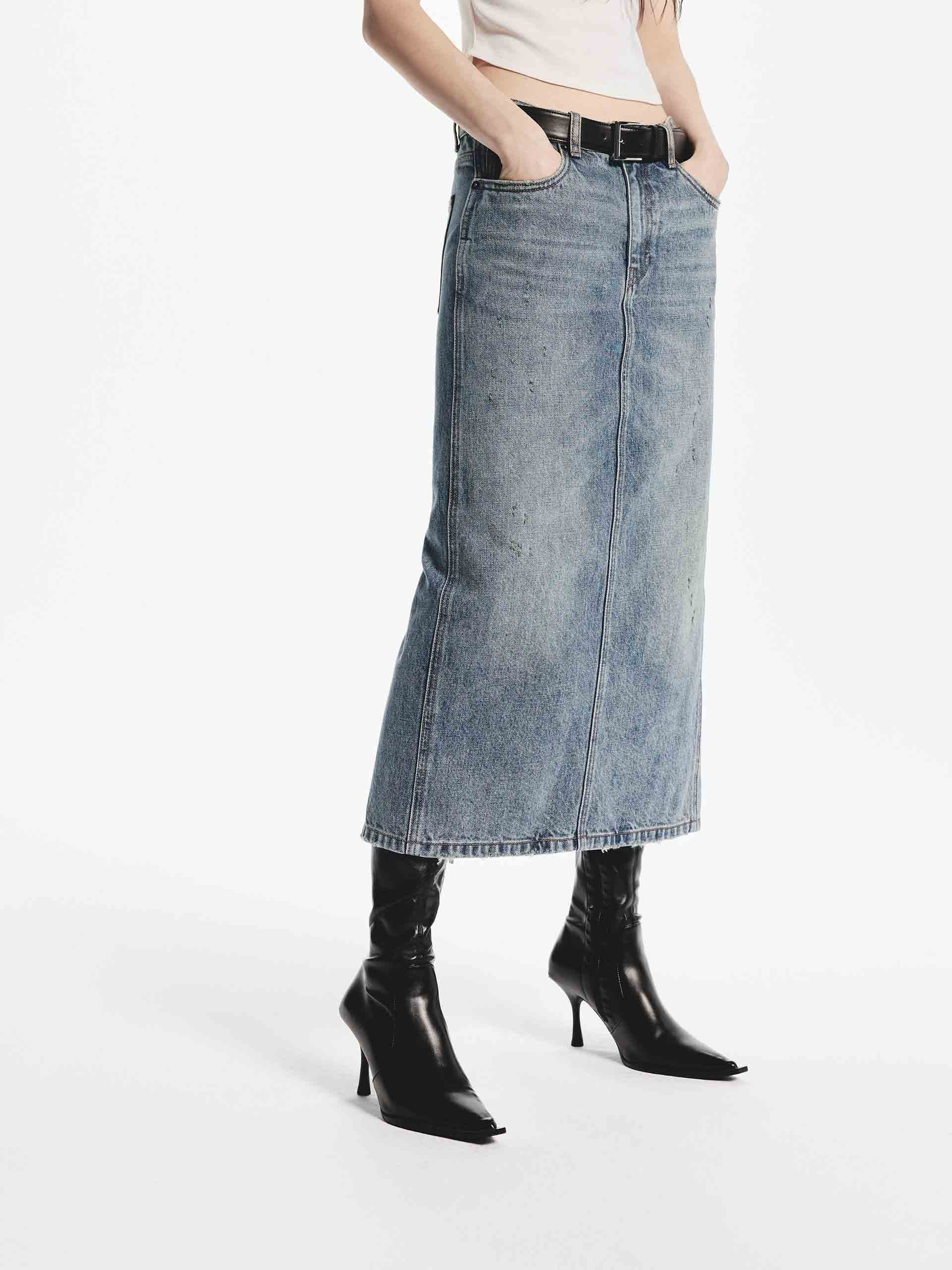 Made from 100% cotton, this skirt feature a back slit and distressed details for a vintage, edgy look. Its straight midi cut offers a flattering fit. Wear it with a basic top for a casual look.