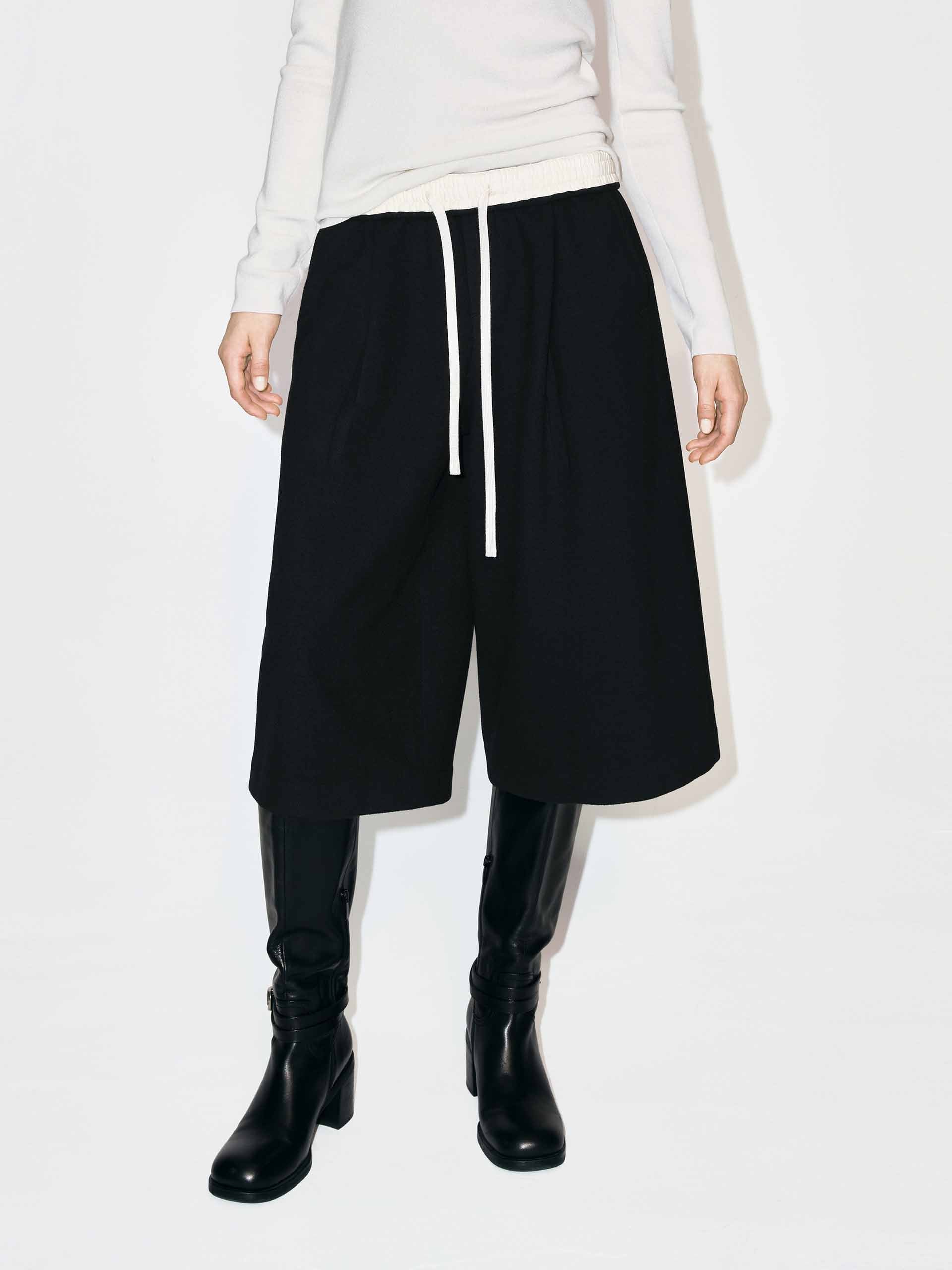 Perfect for effortless style and comfort, these midi-length shorts feature a relaxed fit that offers freedom of movement. Practical side pockets add convenience to your daily wear, while the adjustable drawstring and elasticated waistband ensure a customizable, secure fit. The layered waist design also adds a touch of texture and contemporary flair.