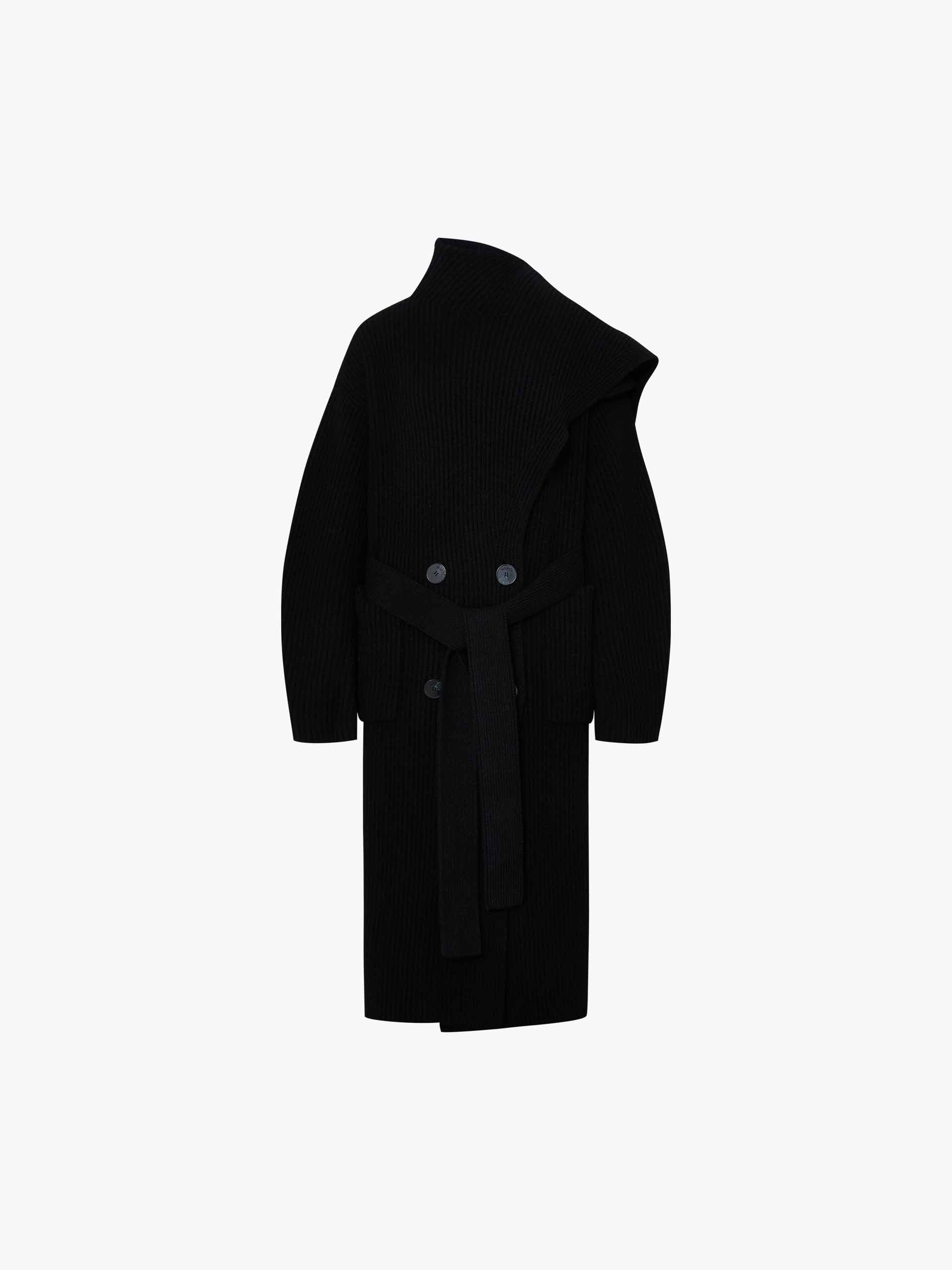This coat adds subtle polished touches to the classic wool coat. It features an oversized fit and longline cut for a sophisticated look. The front patch pocket design adds functionality, while the ribbed texture and deconstructed scarf collar provide a premium finish.