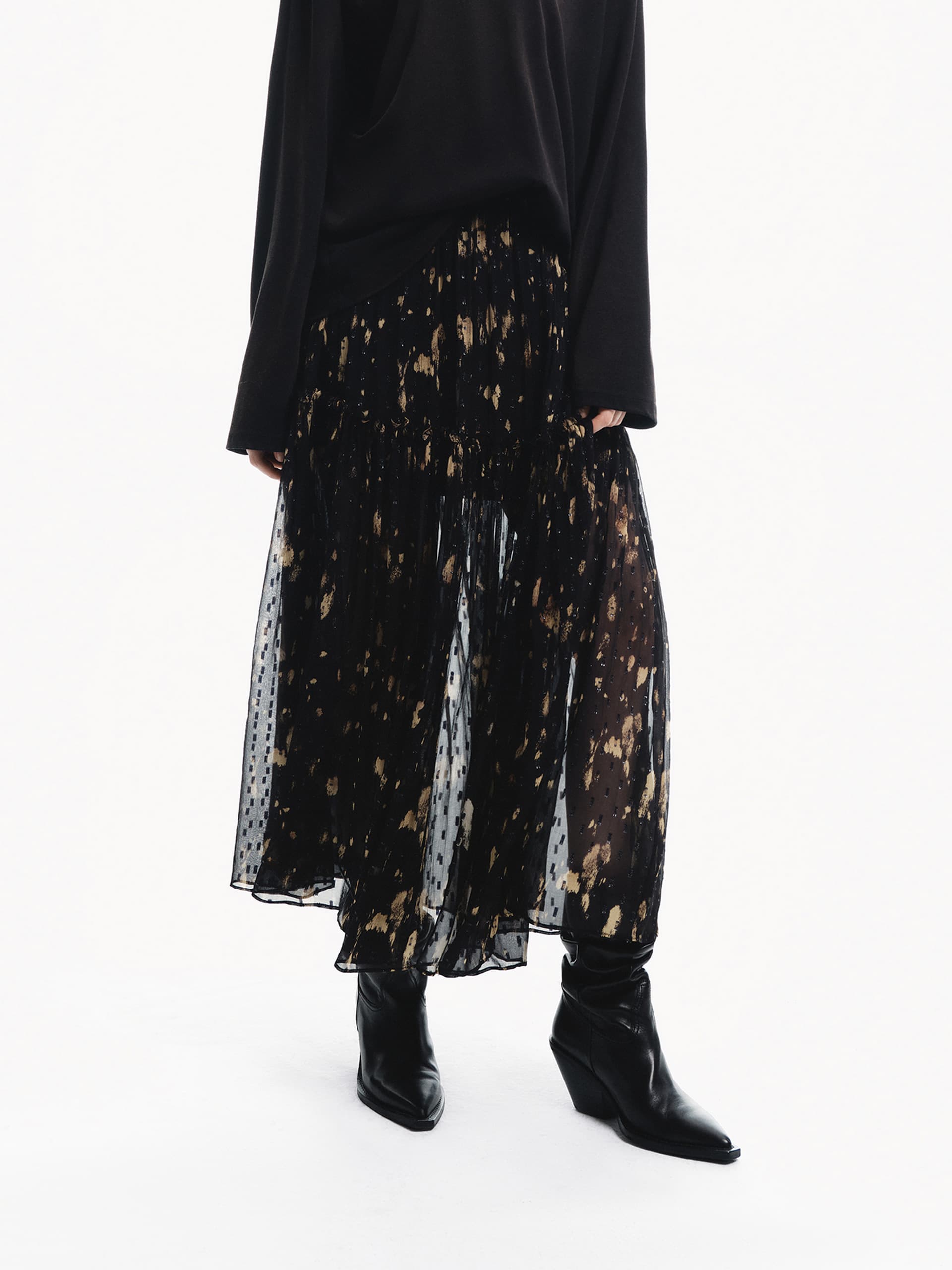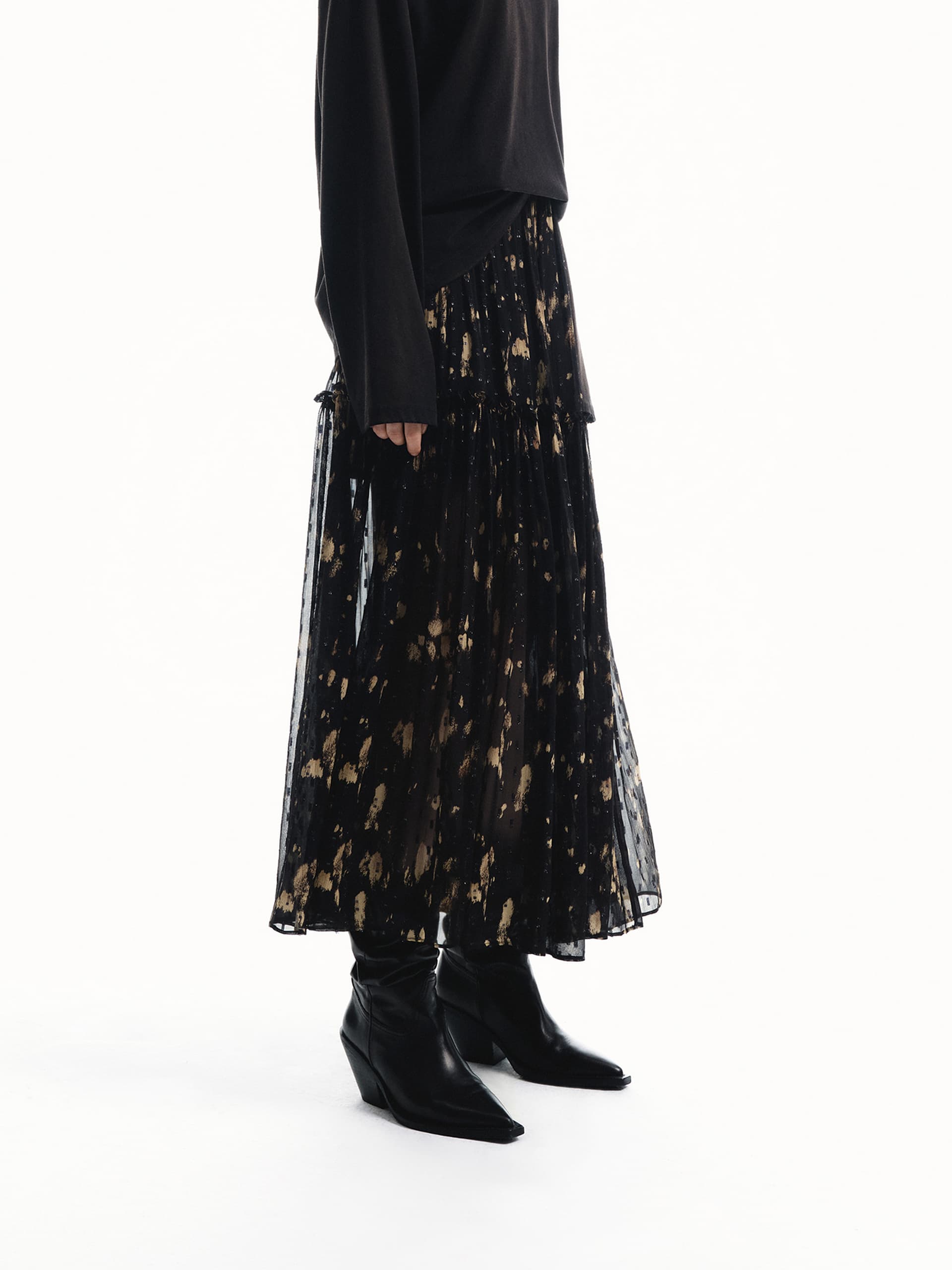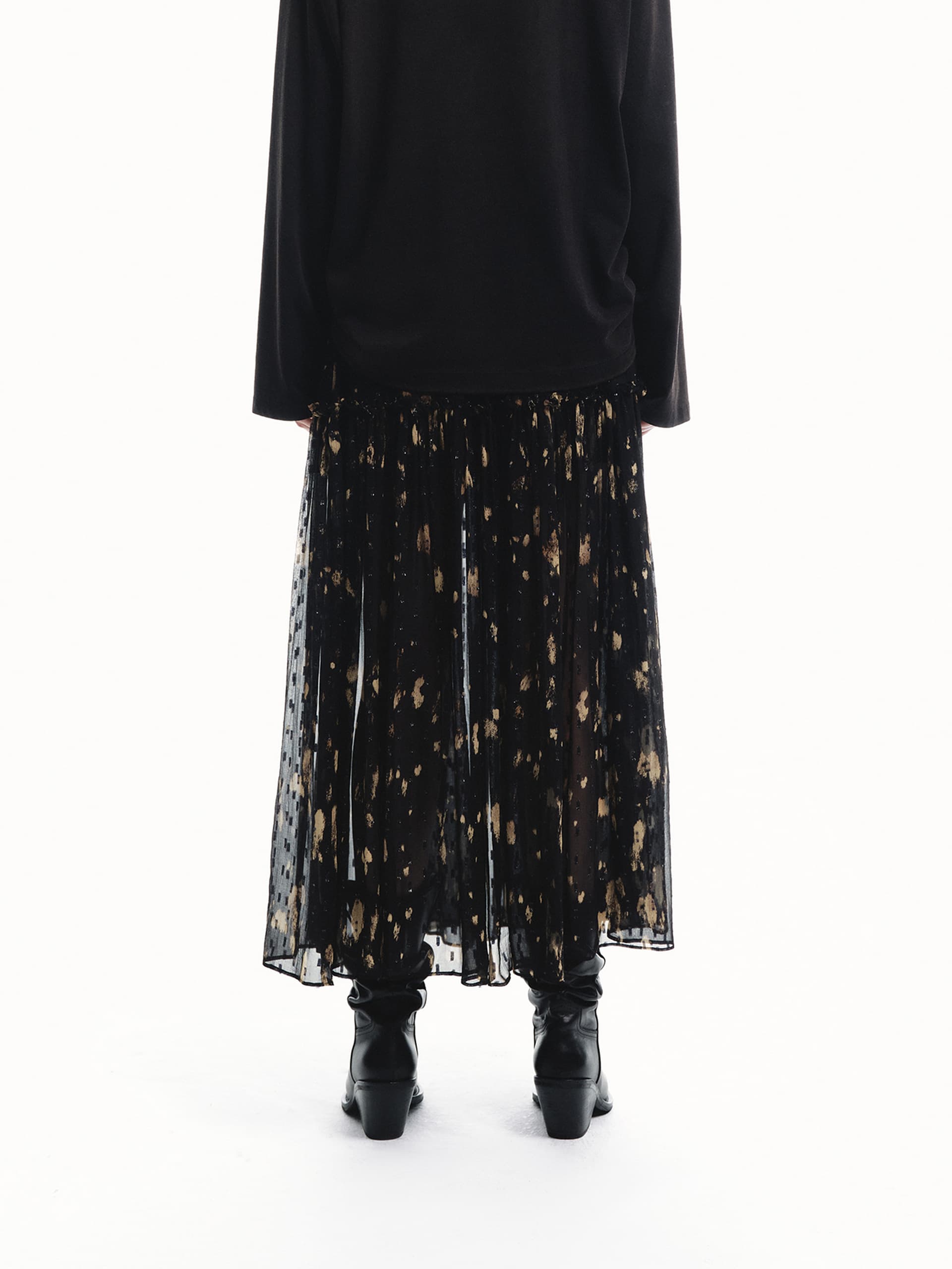 This skirt is made from lightweight chiffon fabric with a brushed print design. Its midi length and flowy design provide a comfortable fit, while its ruched pleated and side slit design adds unique and elegant touches.