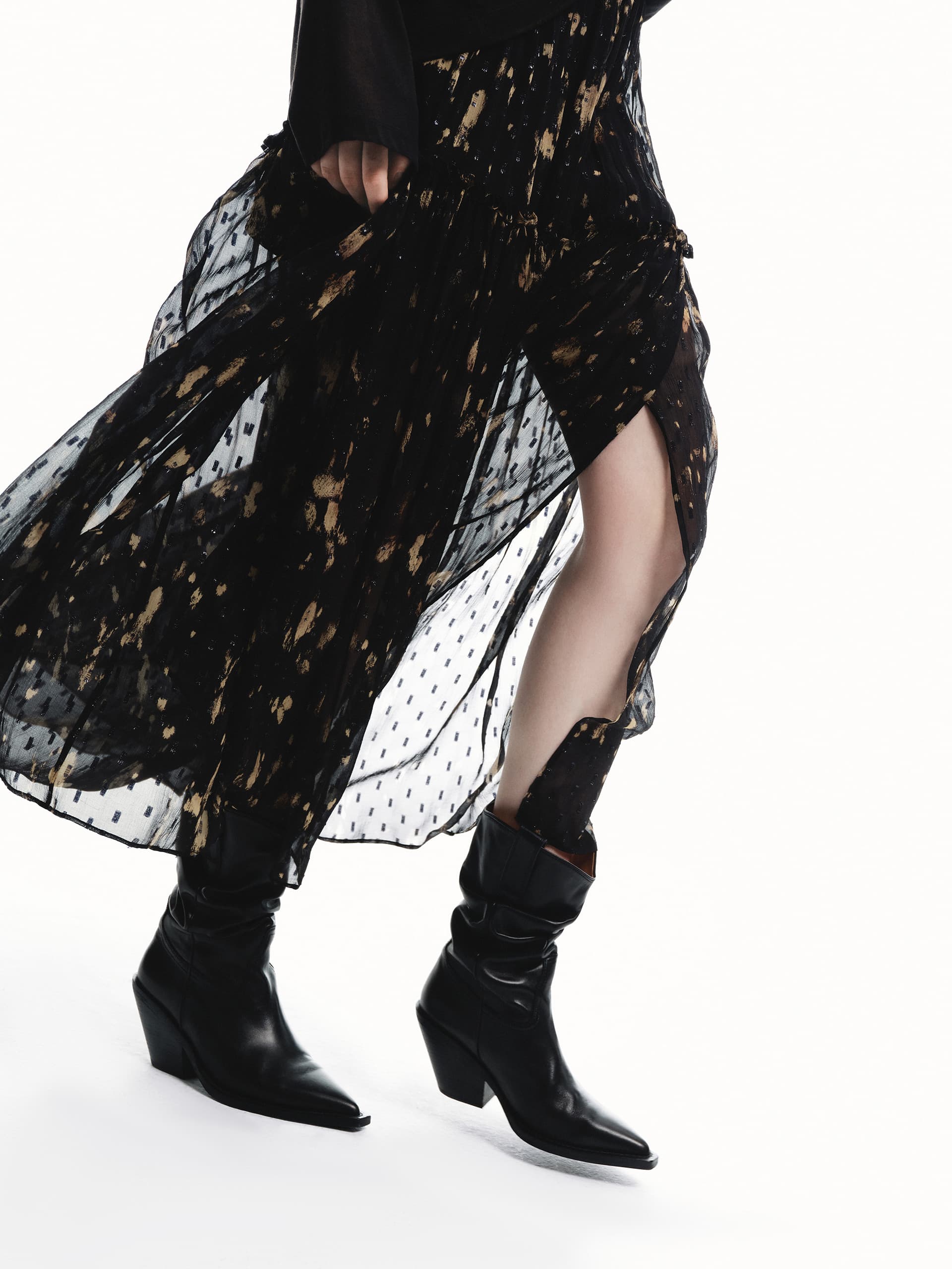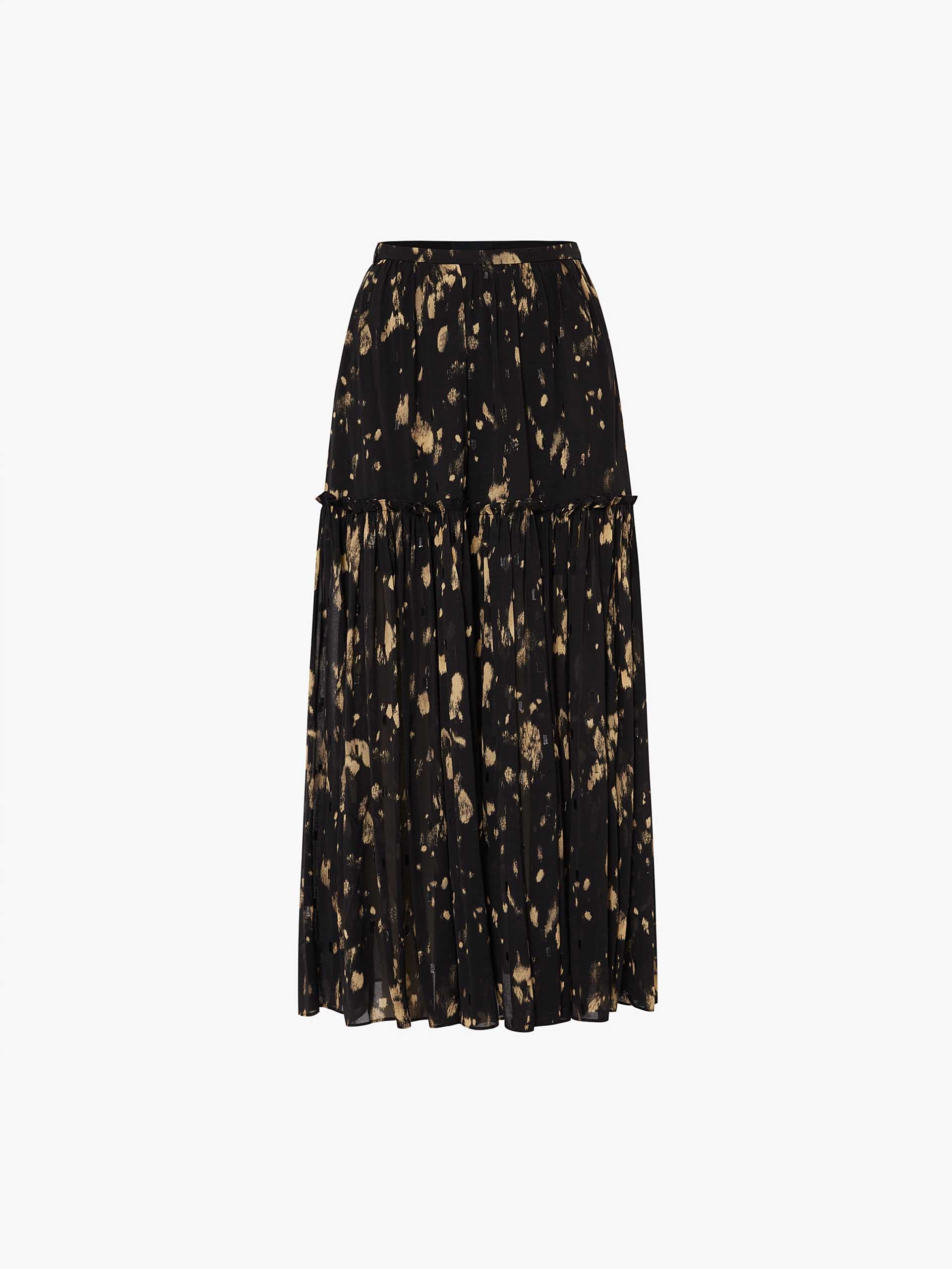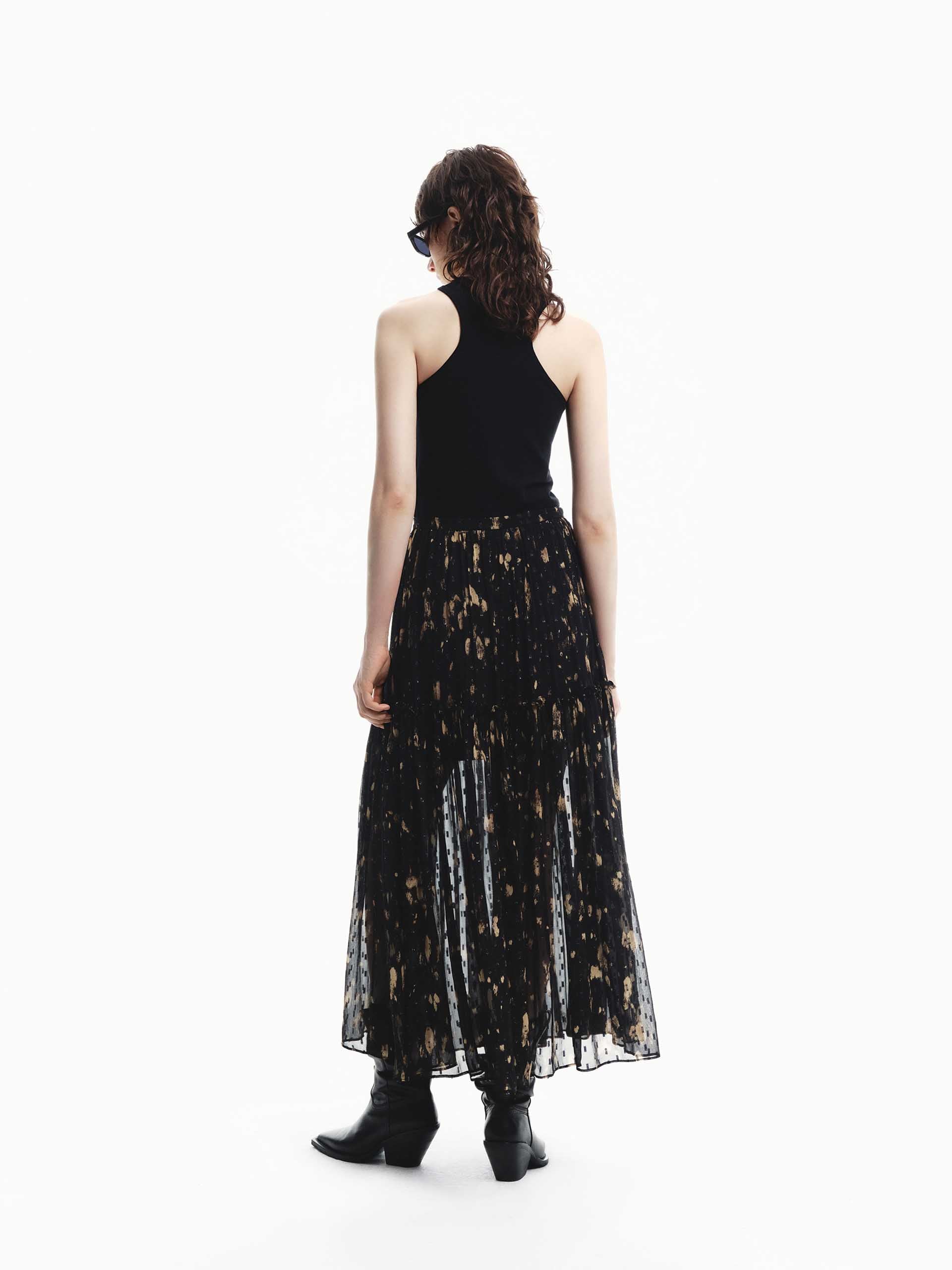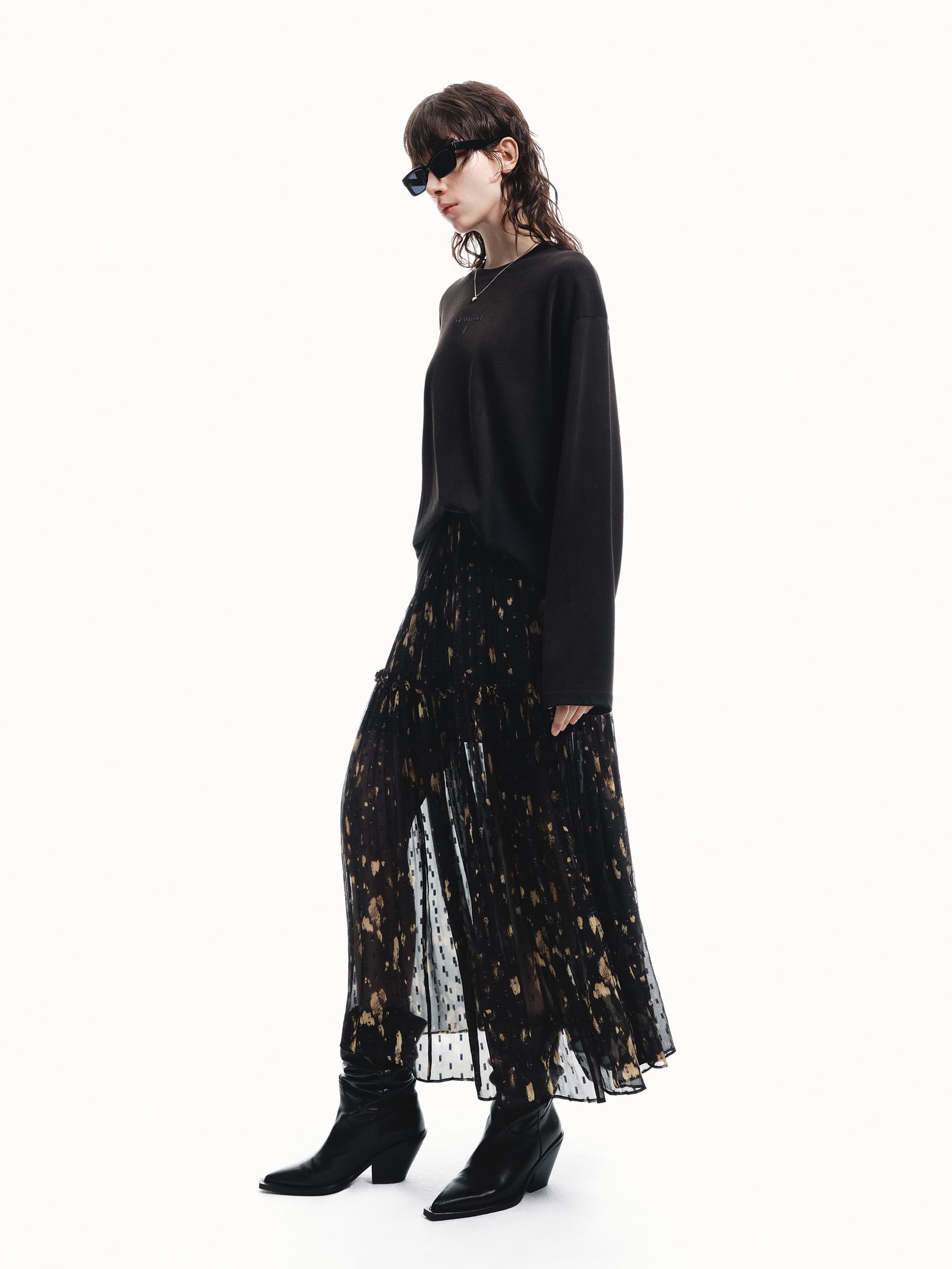 This skirt is made from lightweight chiffon fabric with a brushed print design. Its midi length and flowy design provide a comfortable fit, while its ruched pleated and side slit design adds unique and elegant touches.