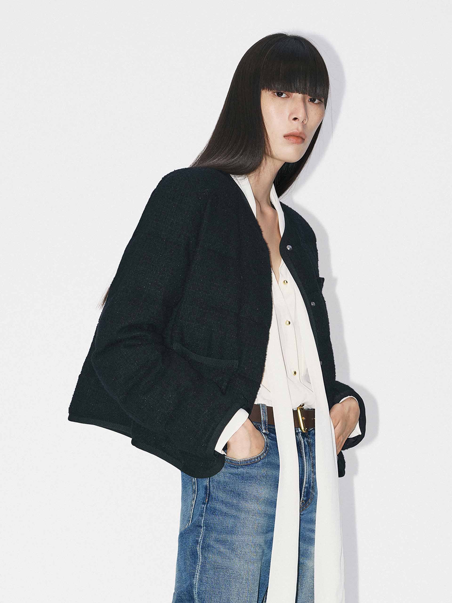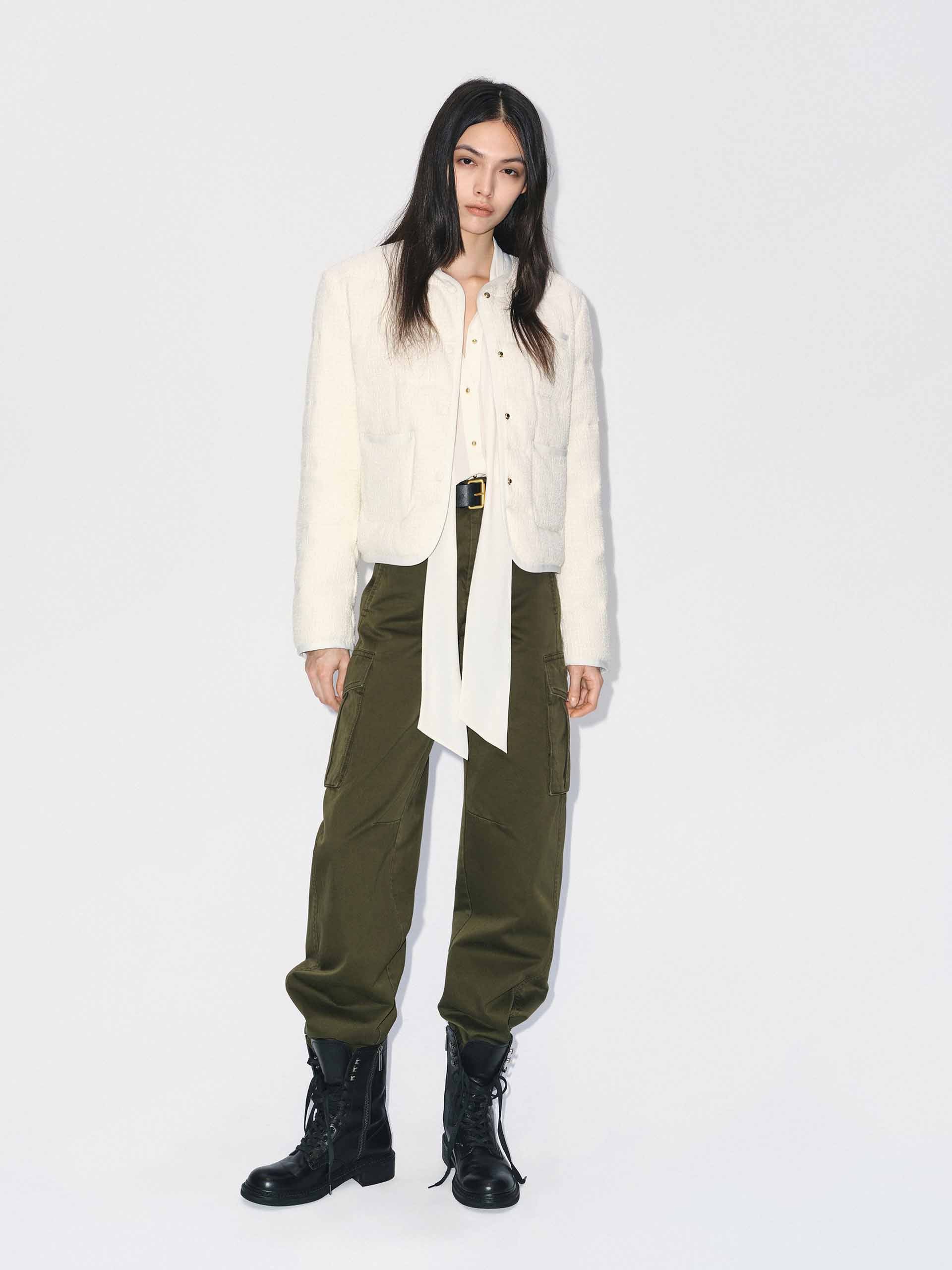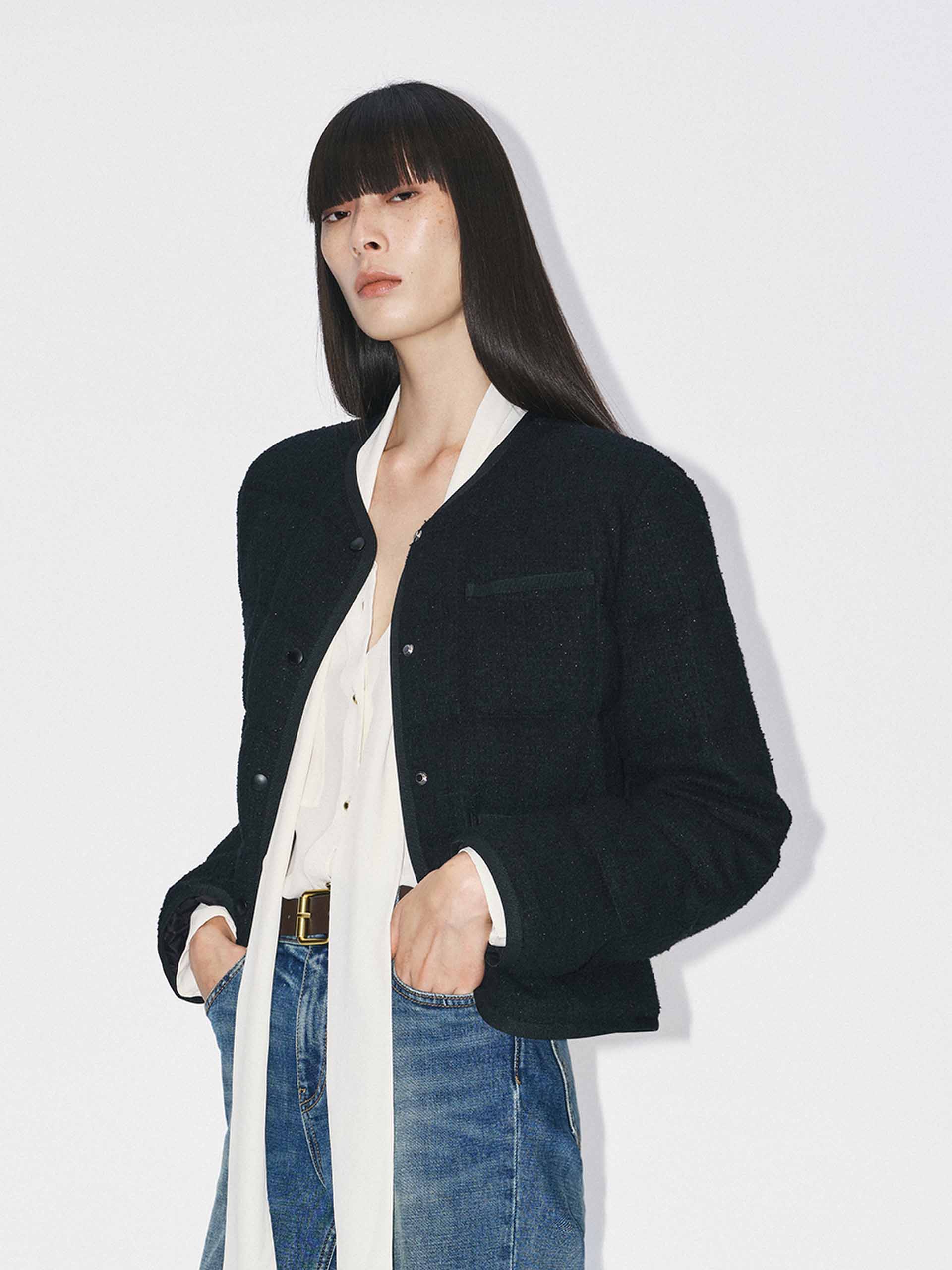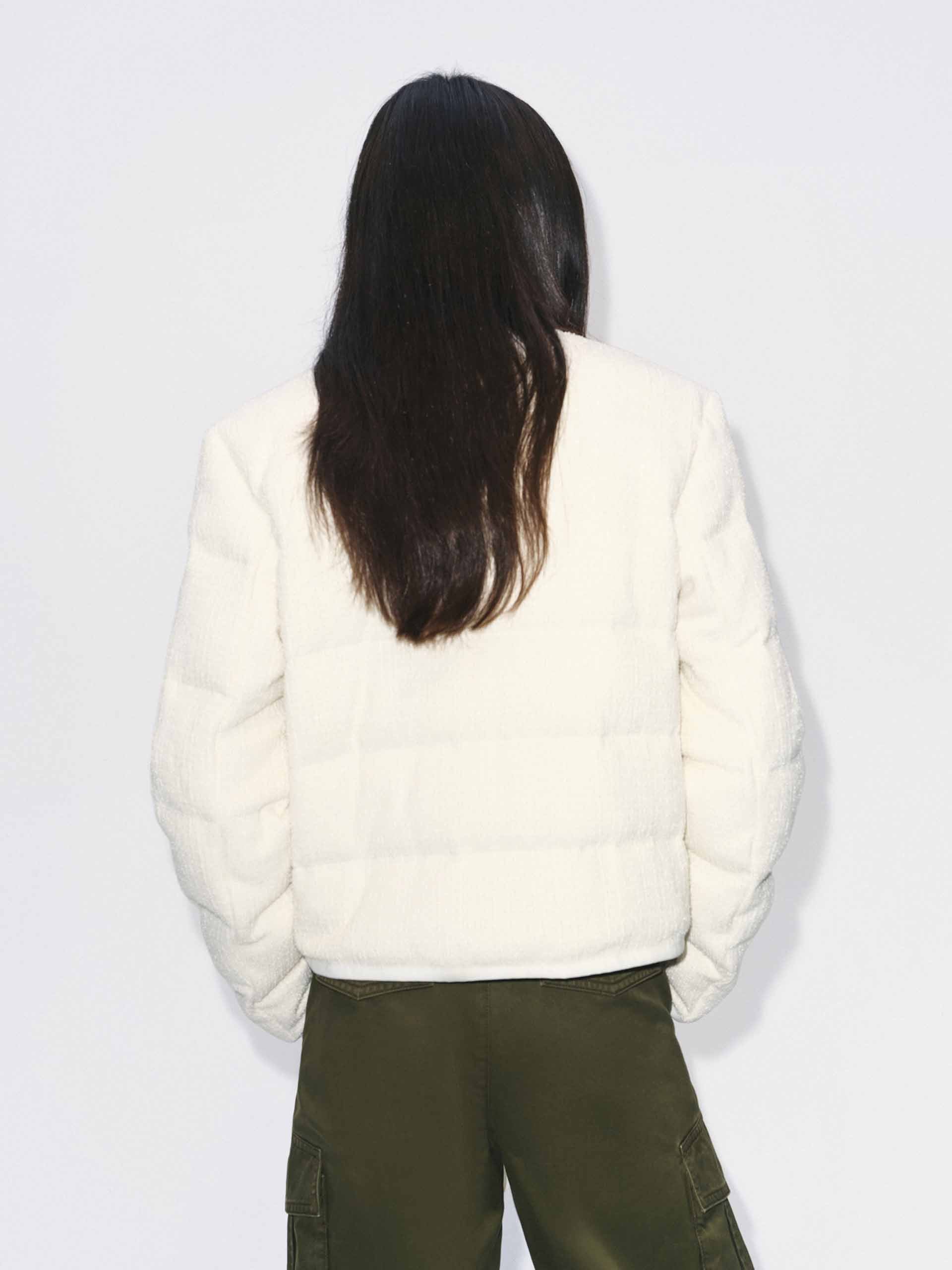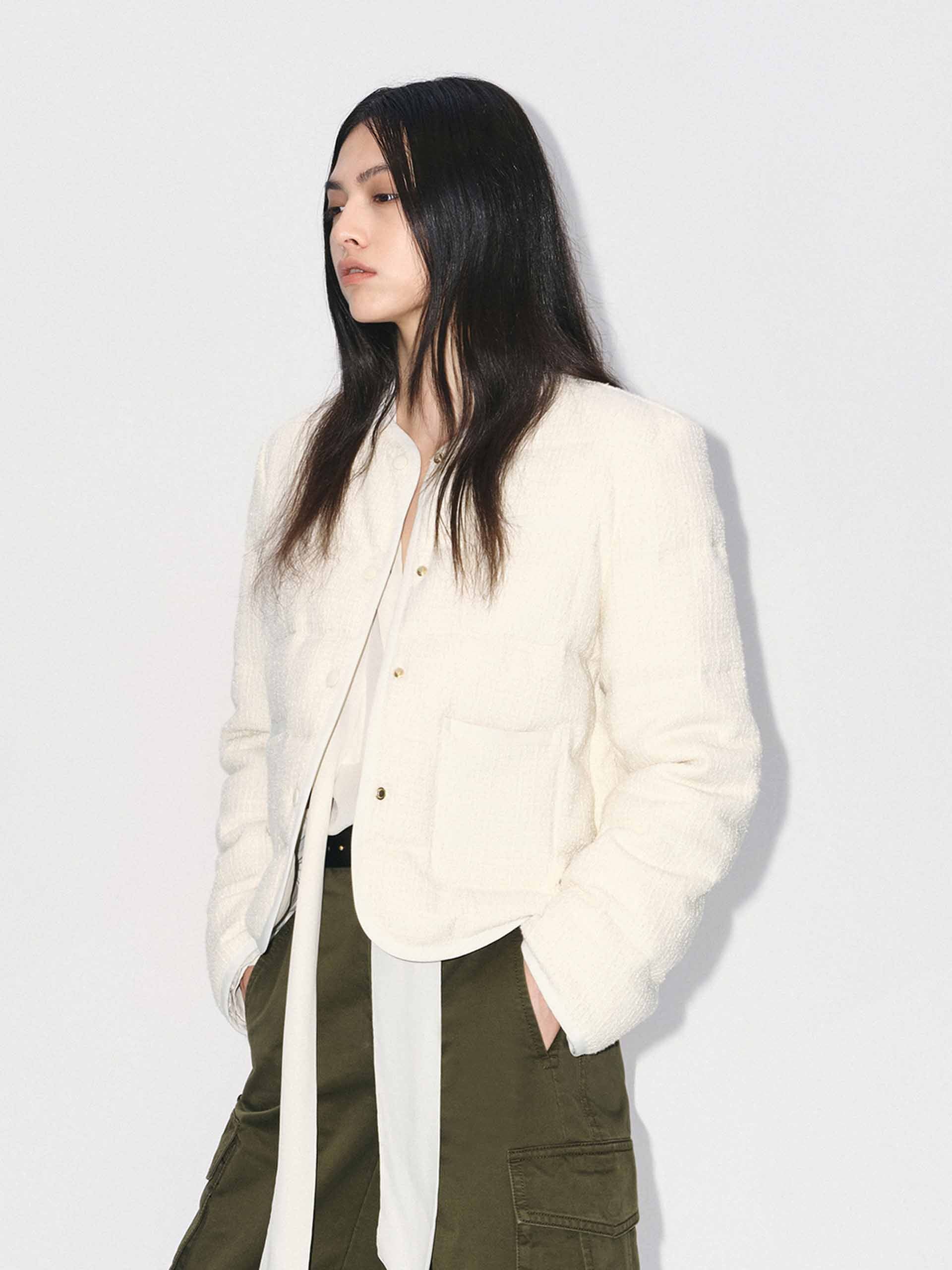 Embrace a modern and minimalist aesthetic with this down jacket. The clean collarless neckline and practical patch pockets enhance its sleek, utilitarian appeal. Featuring a secure snap-button closure and crafted from a luxuriously soft wool blend fabric, this piece delivers a unique combination of tailored sophistication and cozy, lightweight warmth.