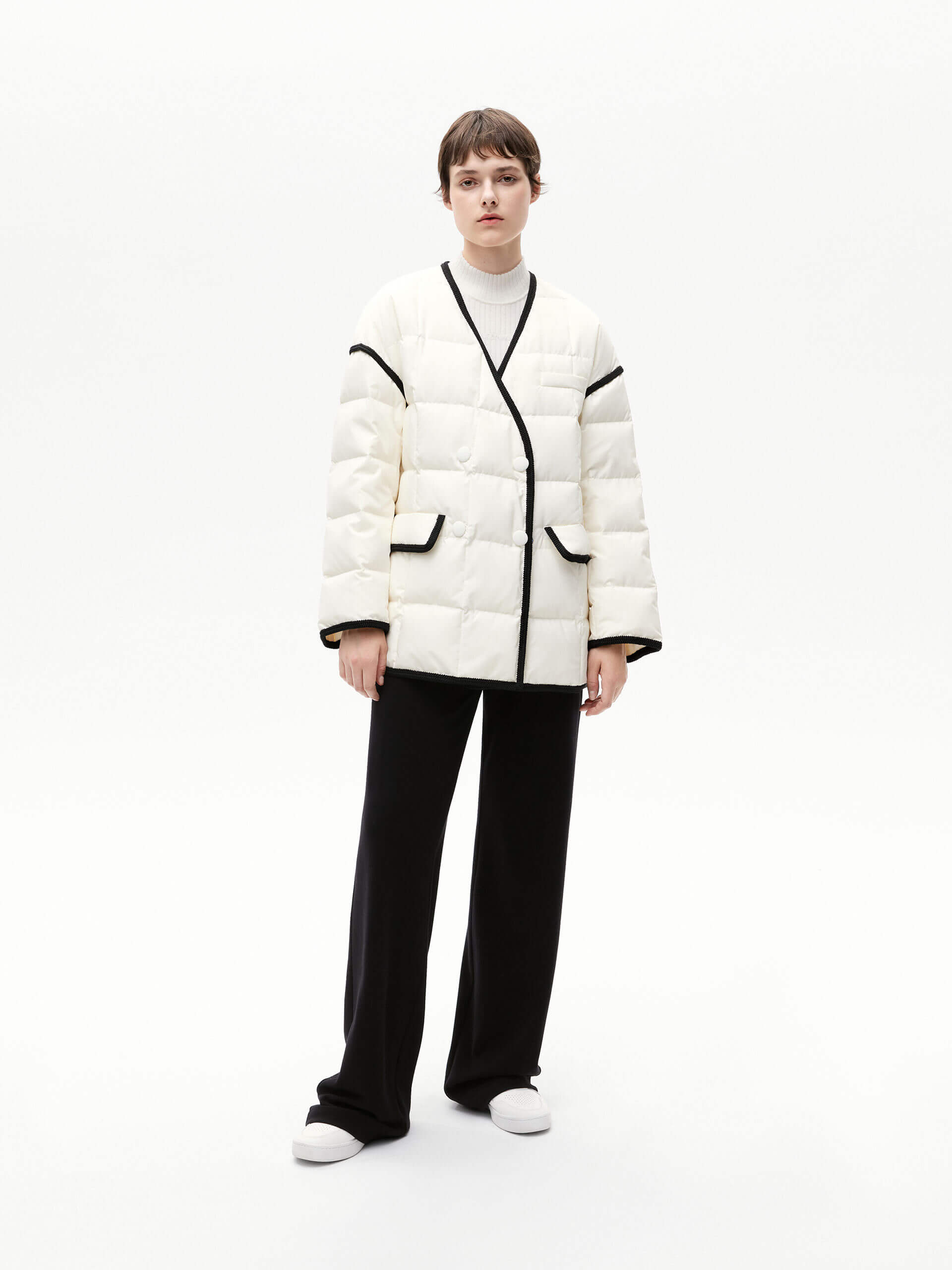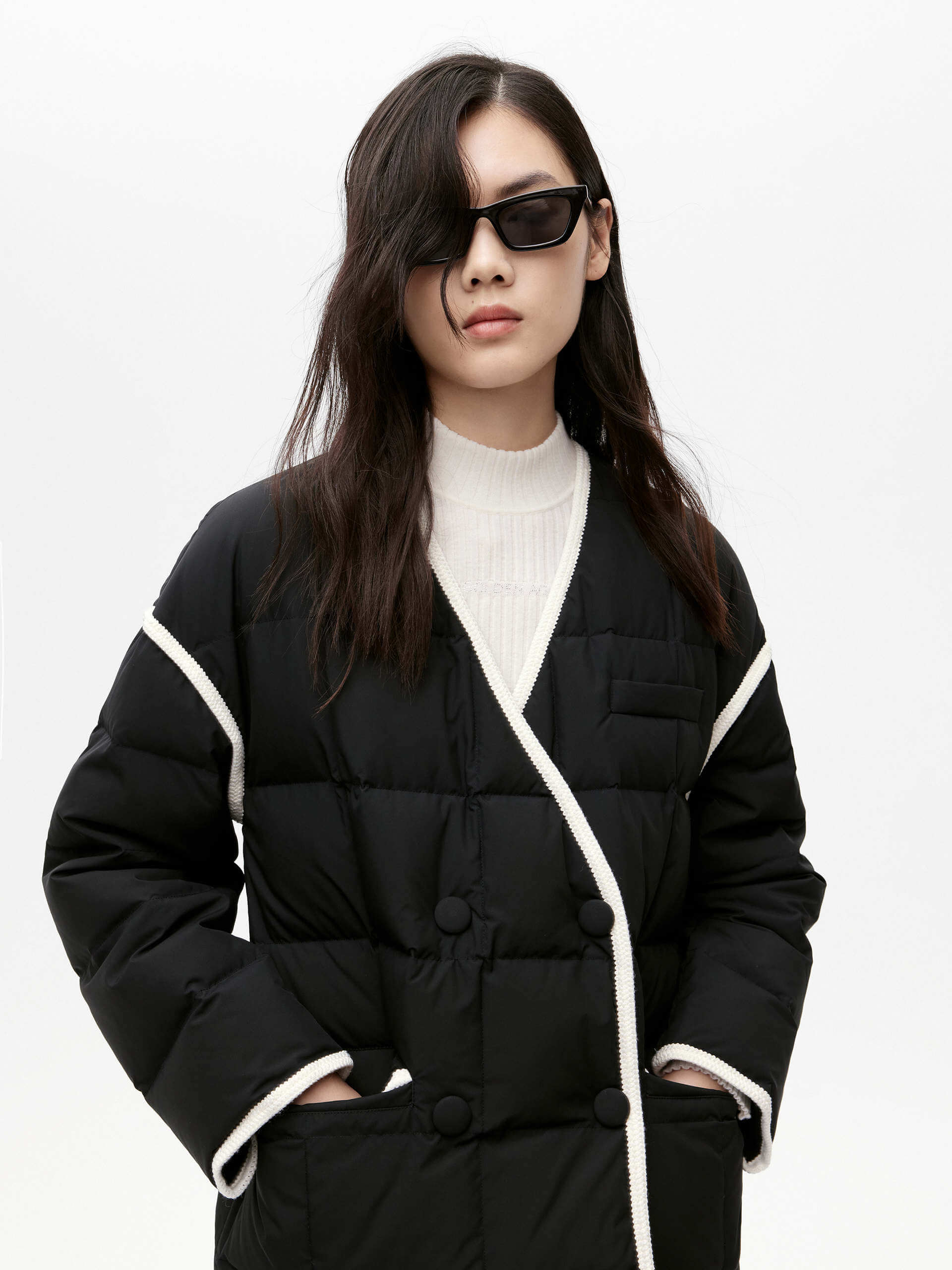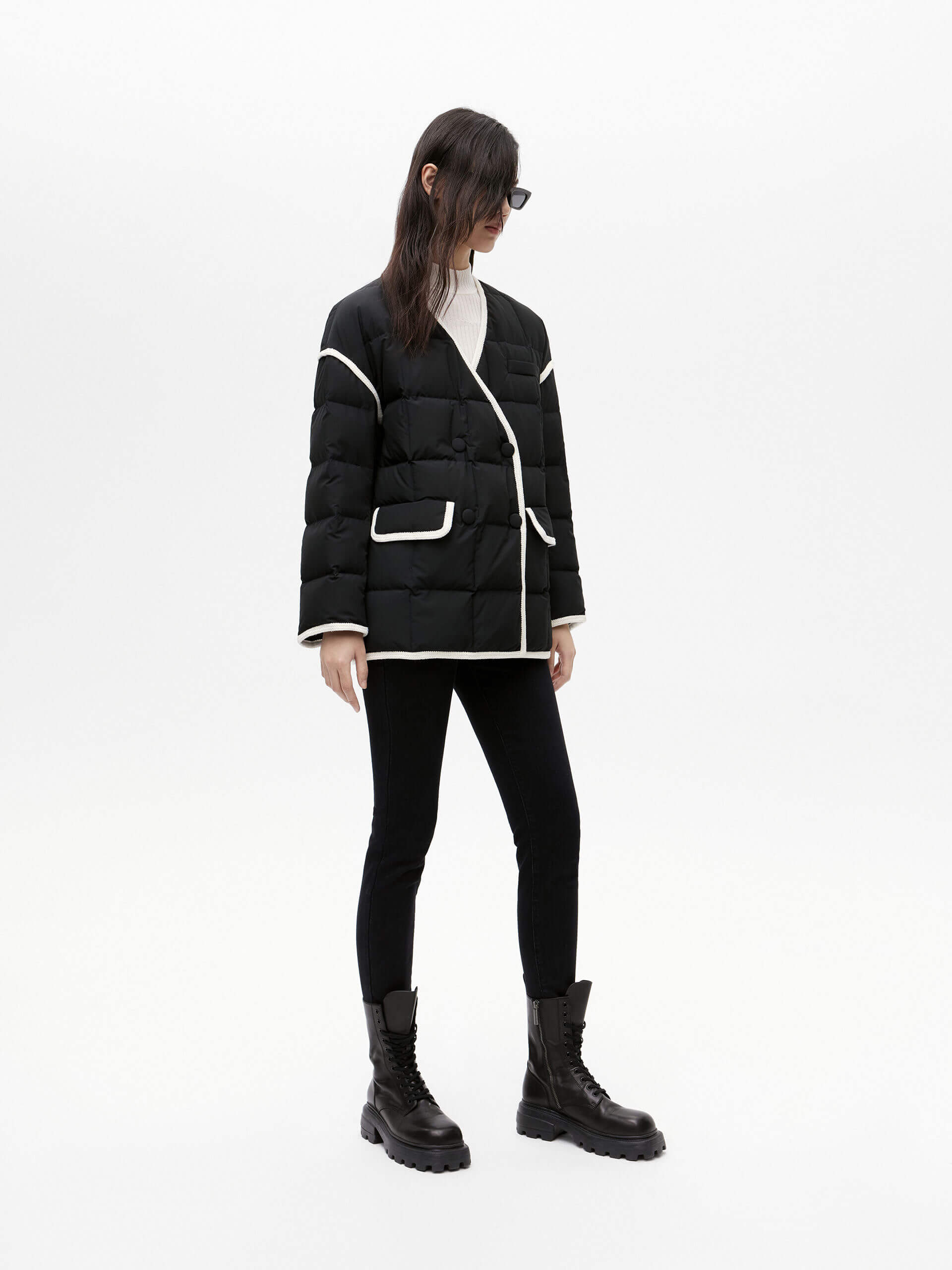 Its v-neck design with striking, contrasting trim details brings couture-infused elegance to any outfit. The generously cut silhouette fits comfortably while the pockets provide a practical style. Experience warm comfort in style, this jacket is perfect for cold weather.