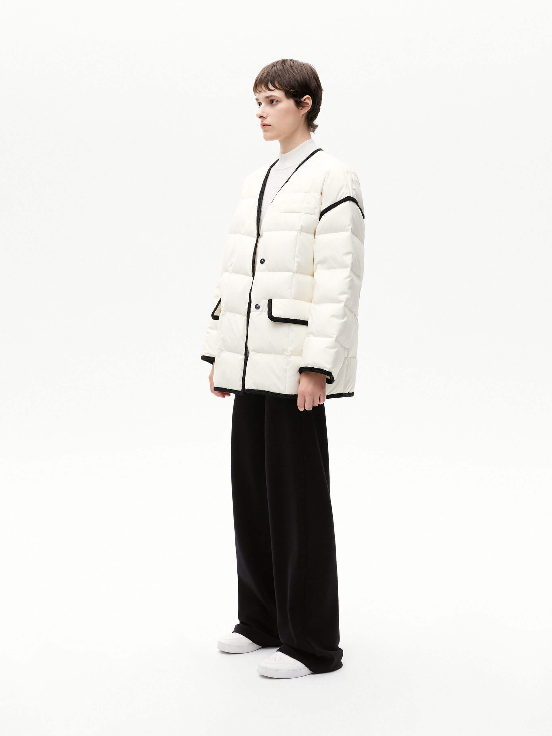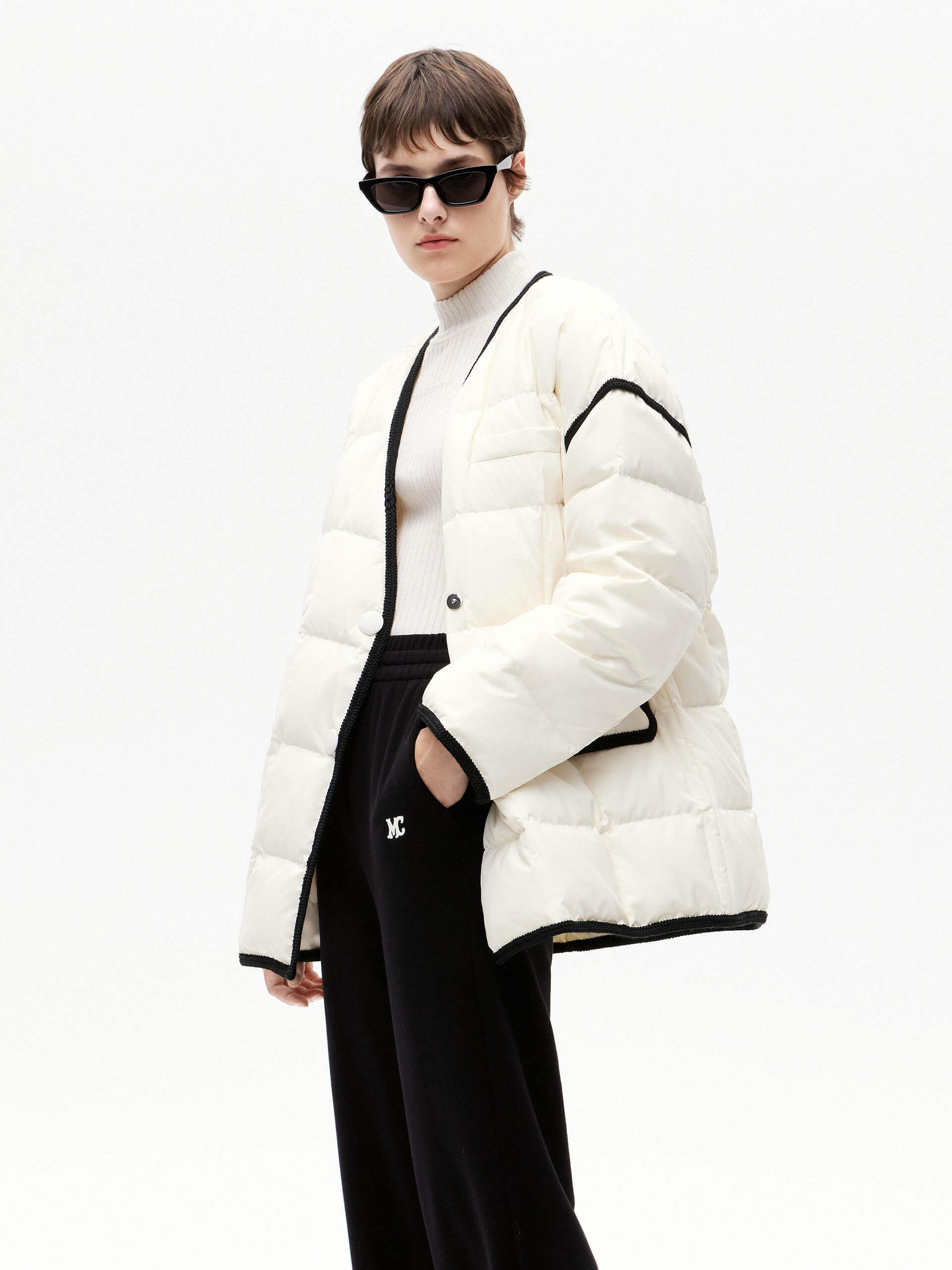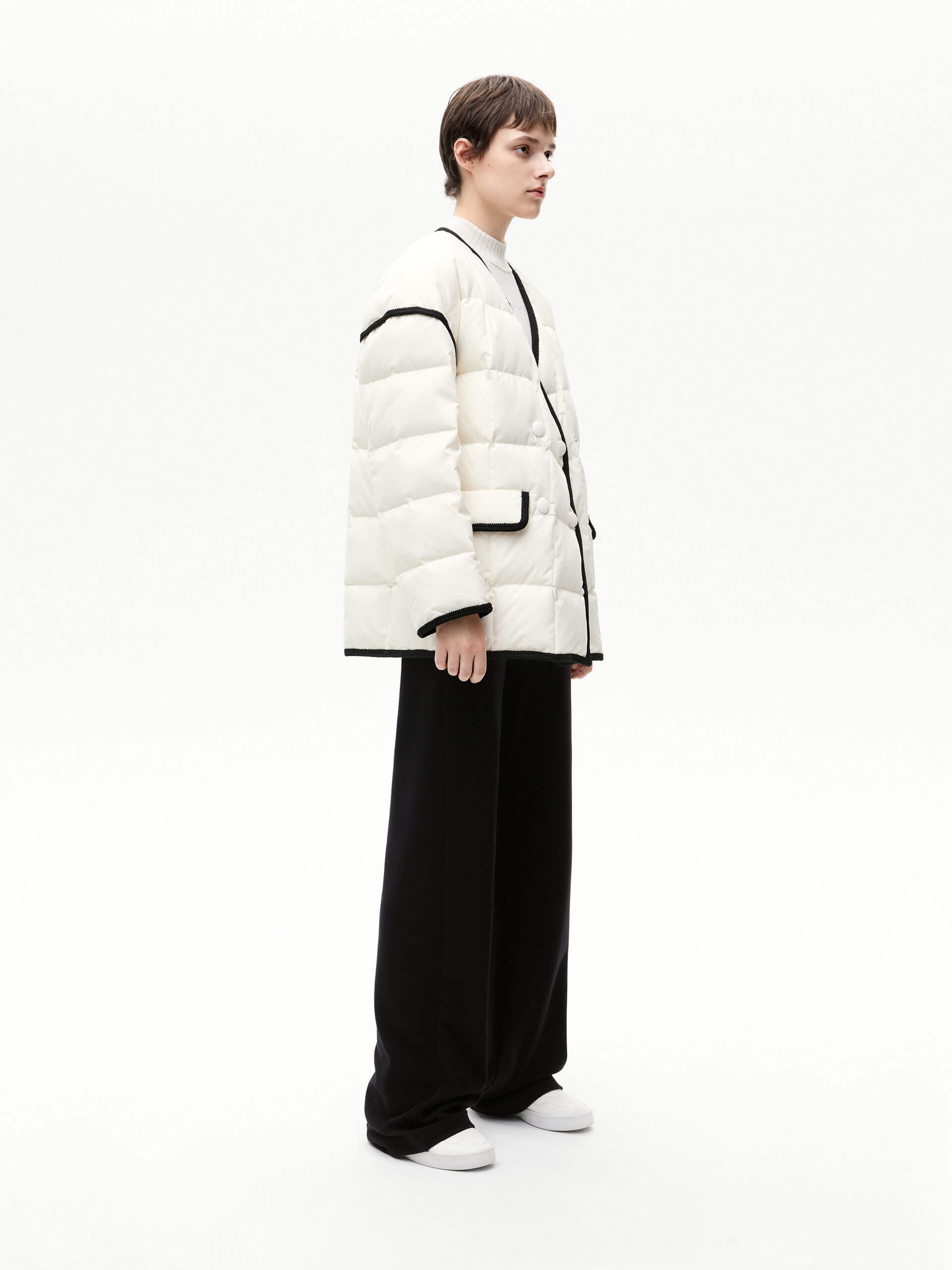 Its v-neck design with striking, contrasting trim details brings couture-infused elegance to any outfit. The generously cut silhouette fits comfortably while the pockets provide a practical style. Experience warm comfort in style, this jacket is perfect for cold weather.