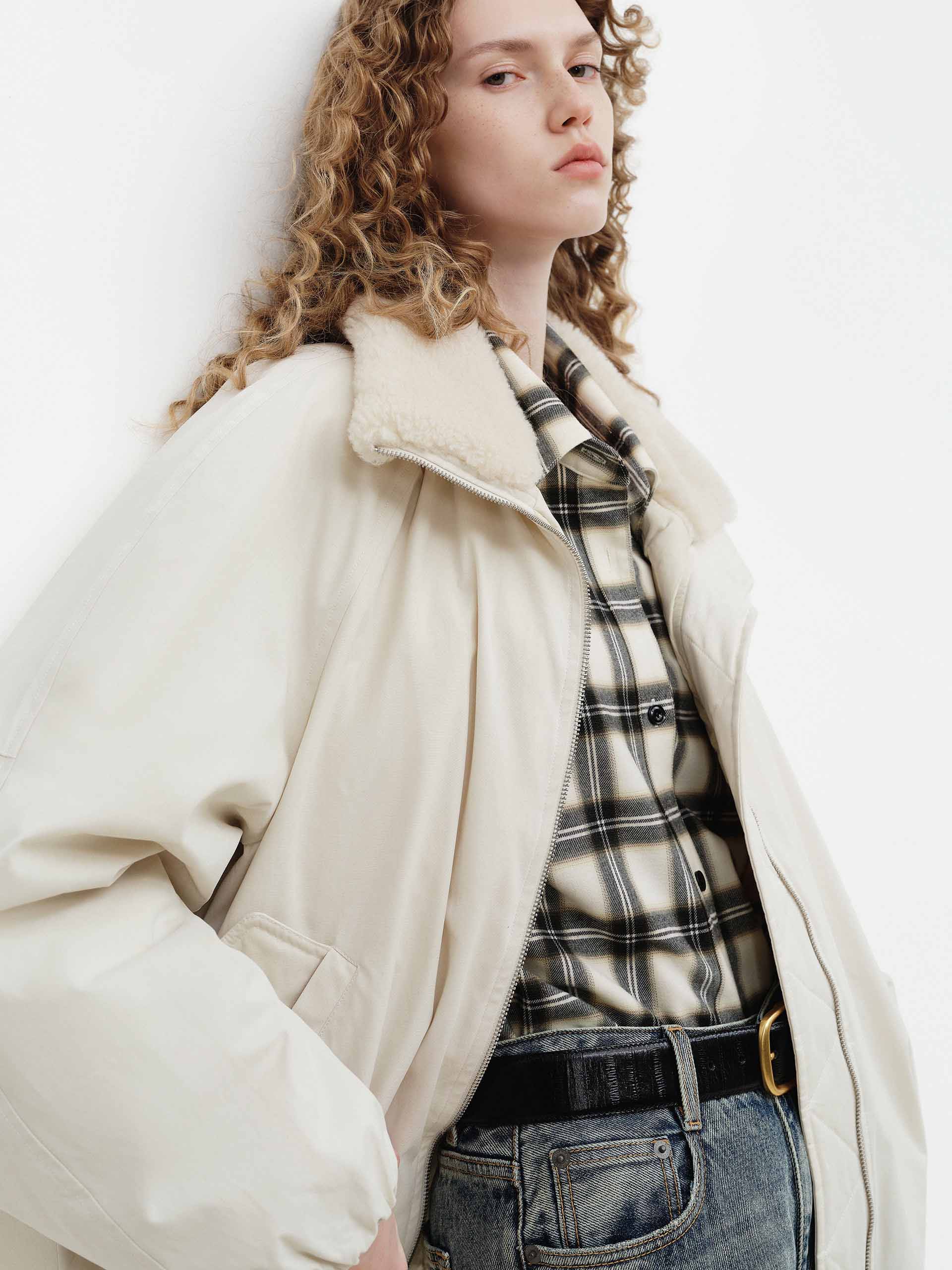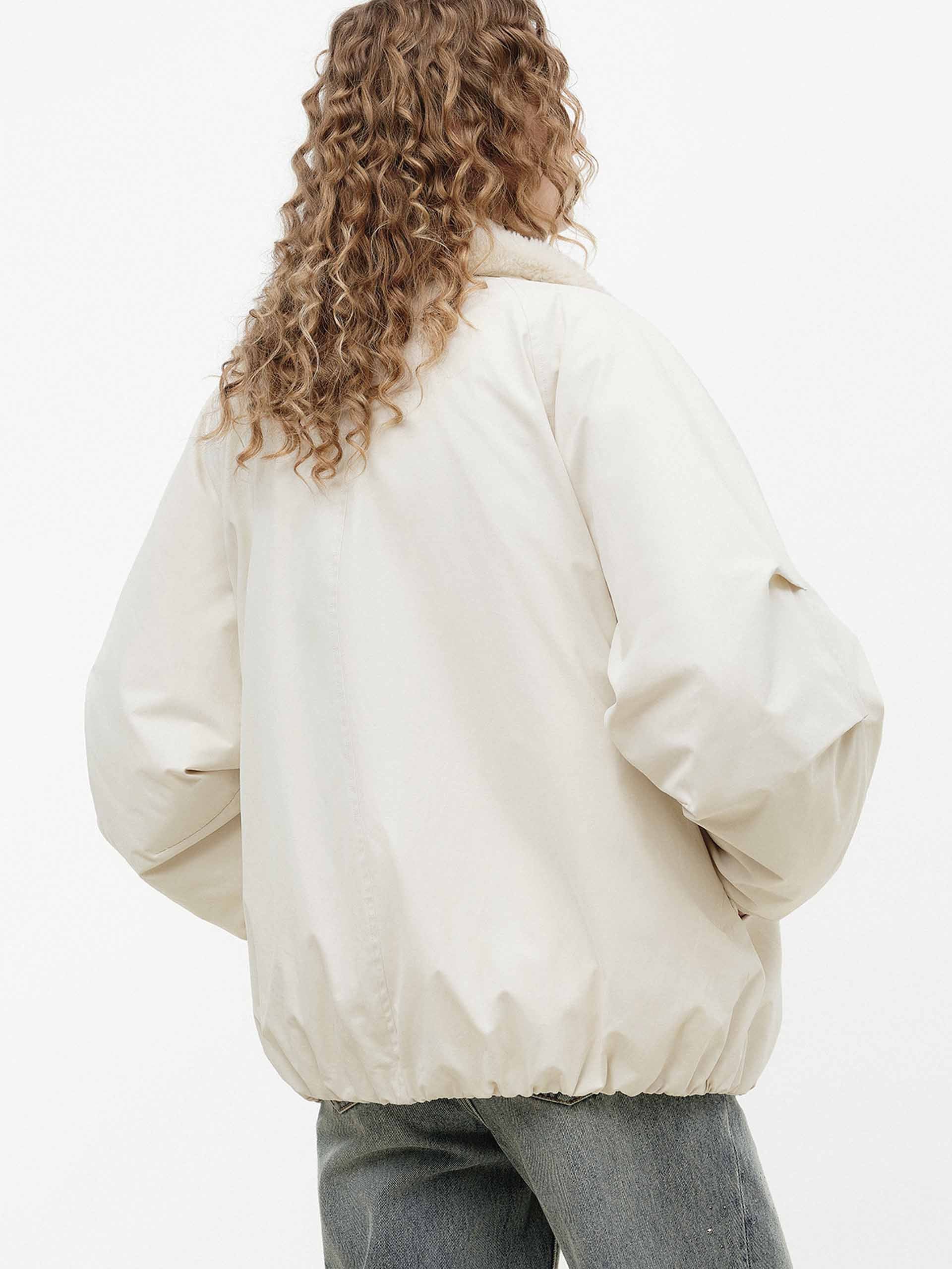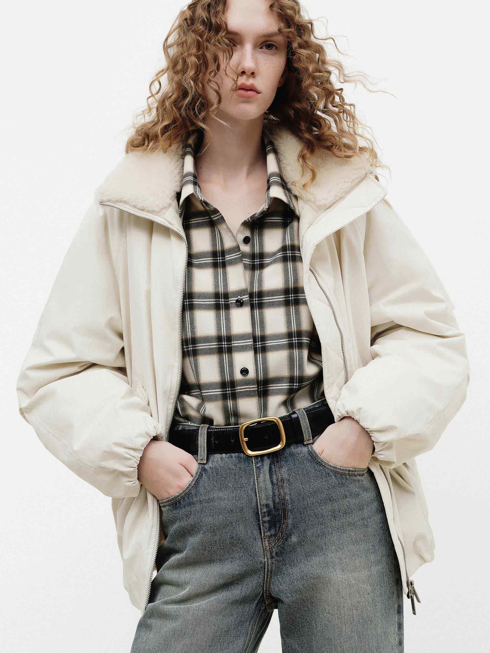 This down jacket features a relaxed fit and raglan sleeves ensure ease of movement and a comfortable silhouette. The practical two-way zip closure offers versatile wearing options, while the distinctive side pleated design adds thoughtful volume and style. Finished with a statement fur collar detail, this jacket provides a balanced blend of cozy warmth and contemporary urban appeal.