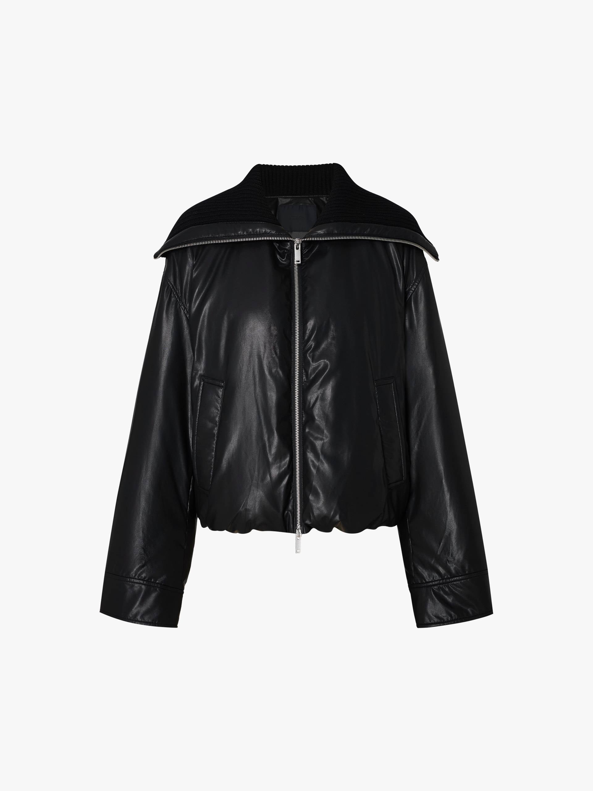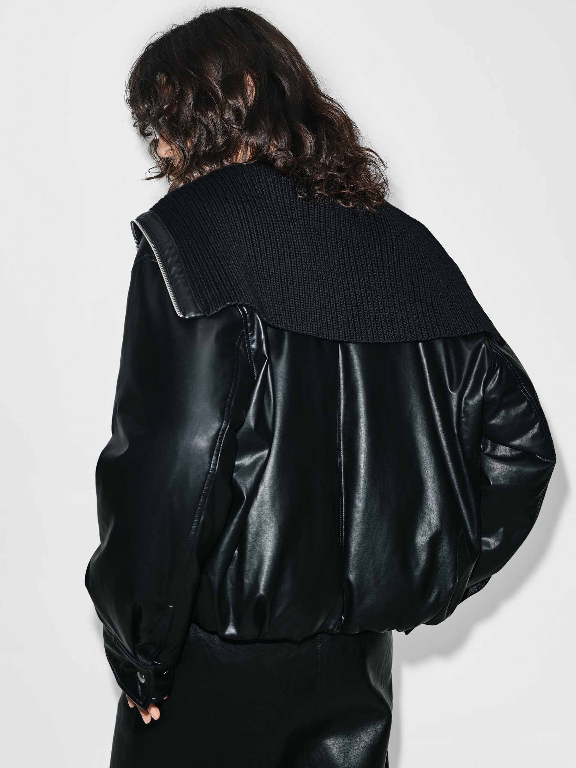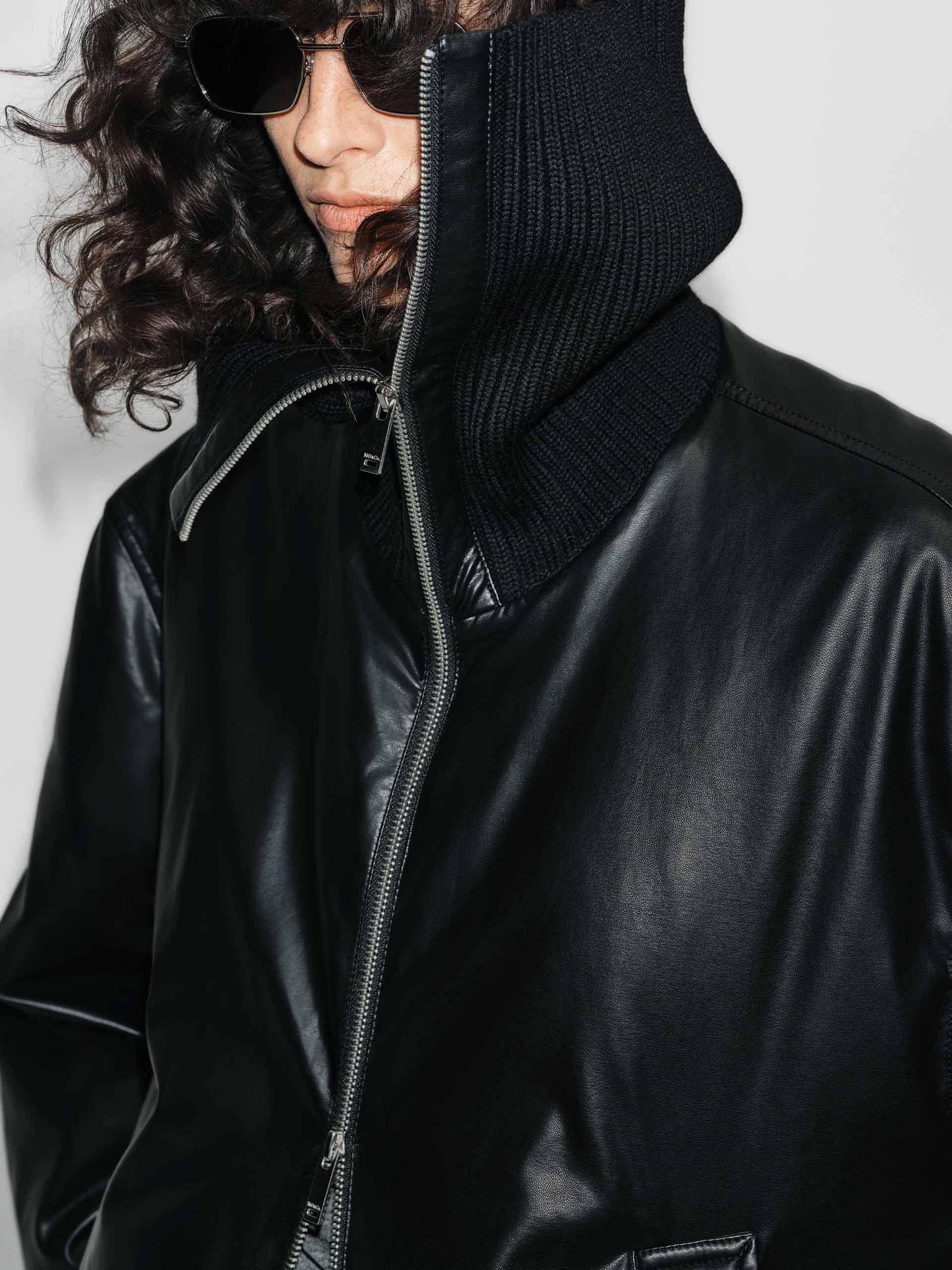 This down jacket merges utilitarian warmth with high-impact style, featuring a sleek two-way zip closure for versatile wear and practical side pockets for effortless storage. The bold wide lapel collar and sculpted ribbed neckline add architectural structure, while the leather fabric elevates the texture and durability of the design.