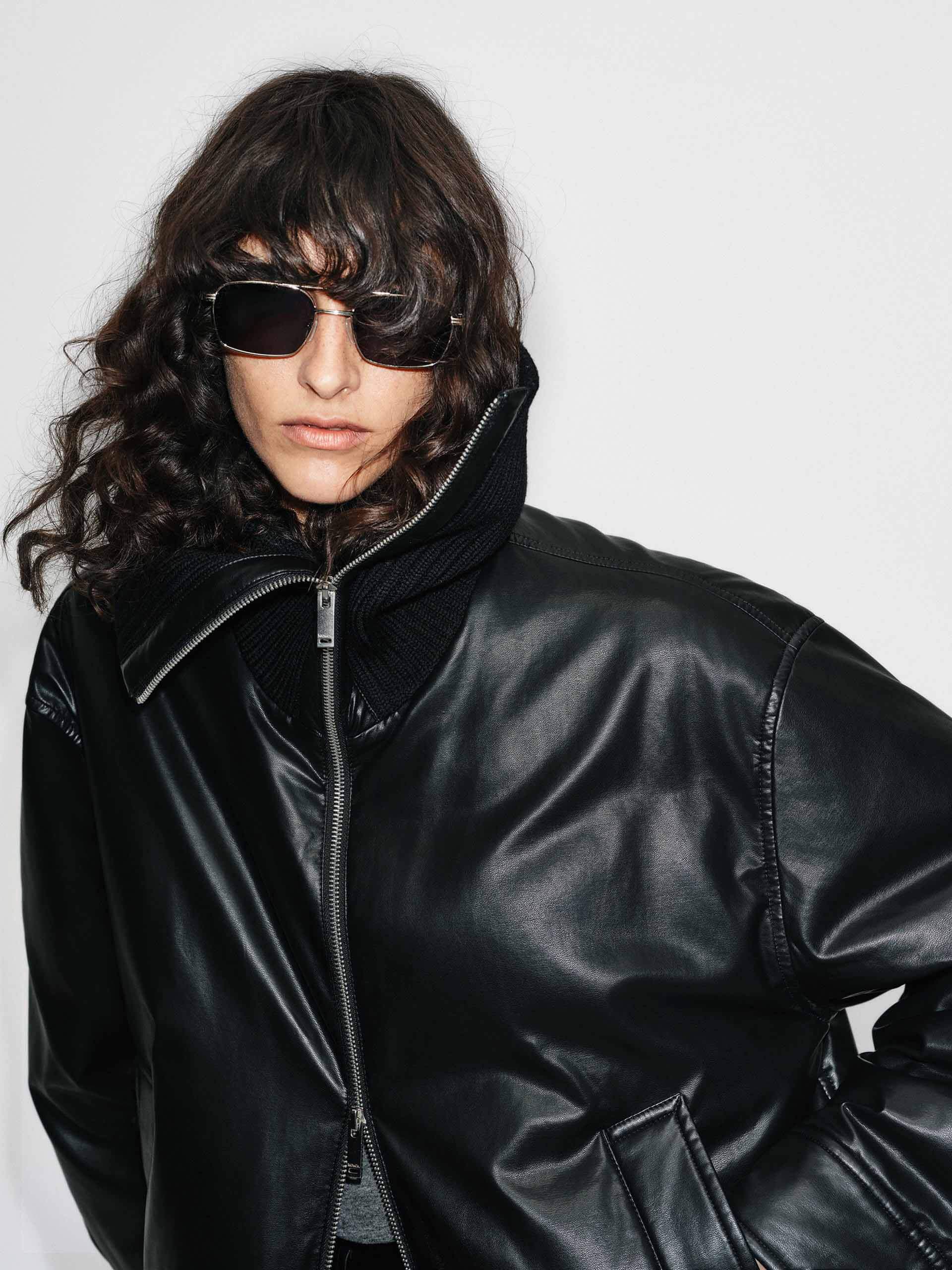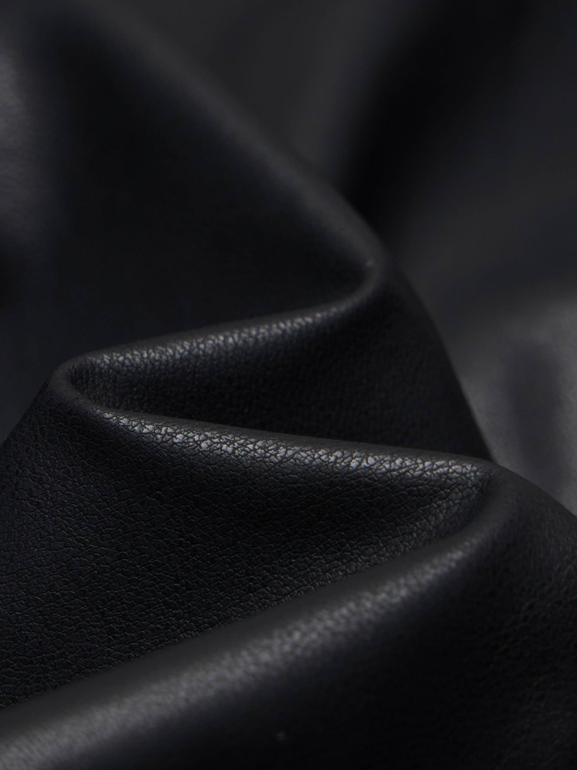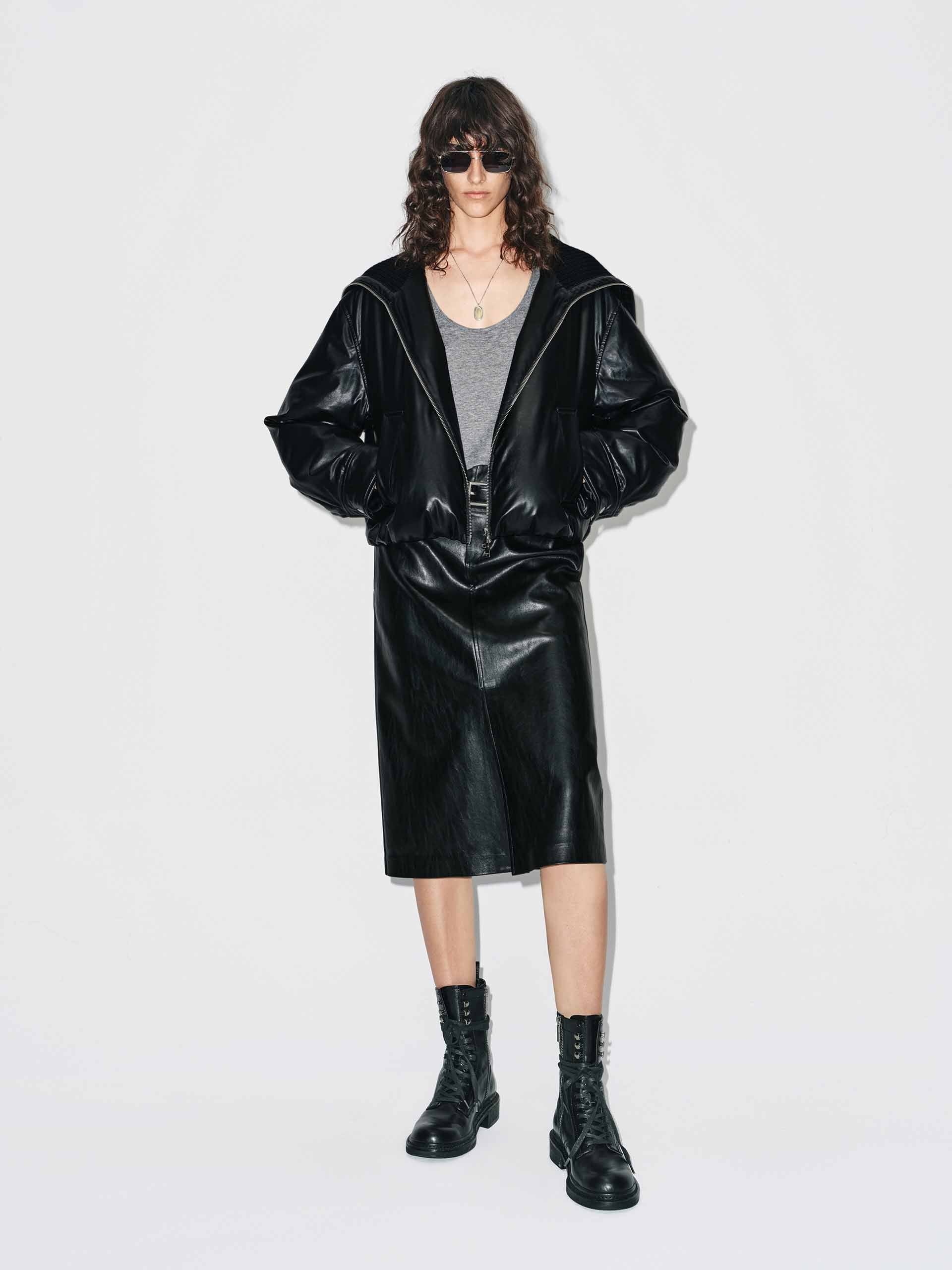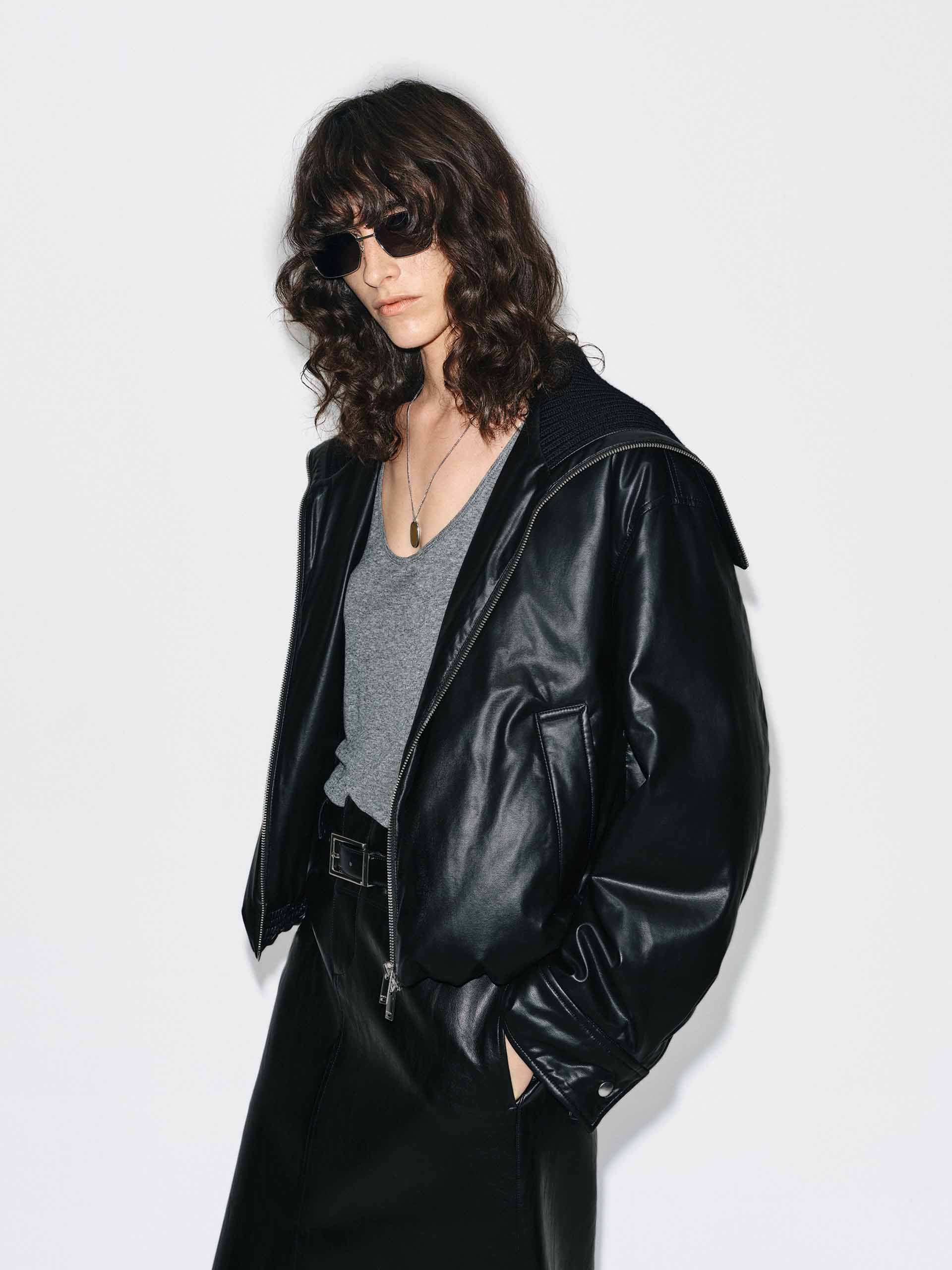 This down jacket merges utilitarian warmth with high-impact style, featuring a sleek two-way zip closure for versatile wear and practical side pockets for effortless storage. The bold wide lapel collar and sculpted ribbed neckline add architectural structure, while the leather fabric elevates the texture and durability of the design.