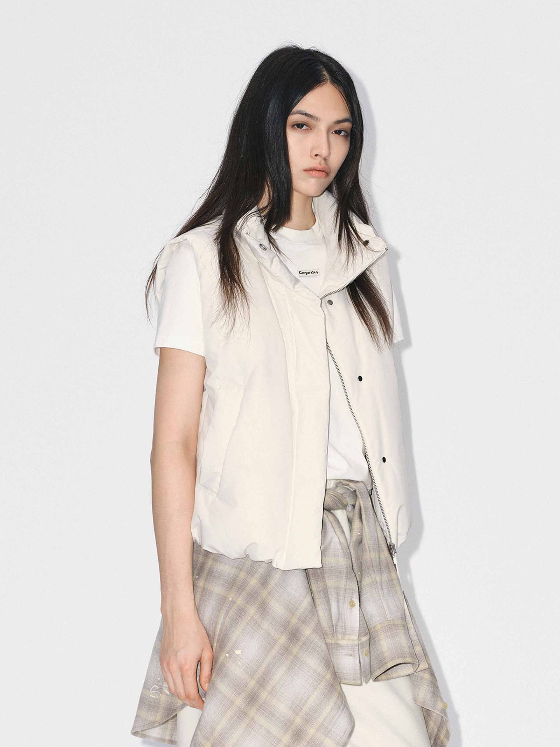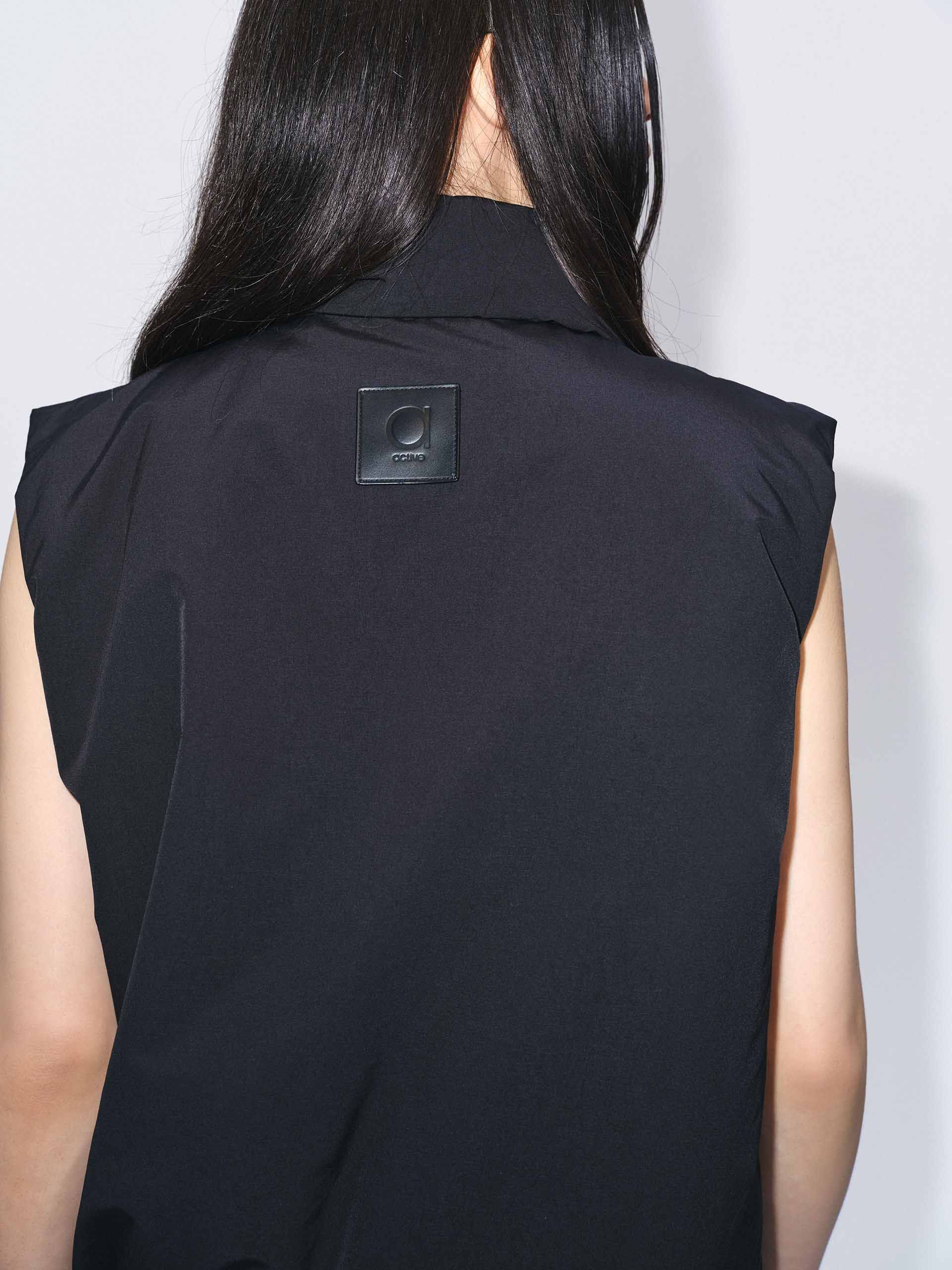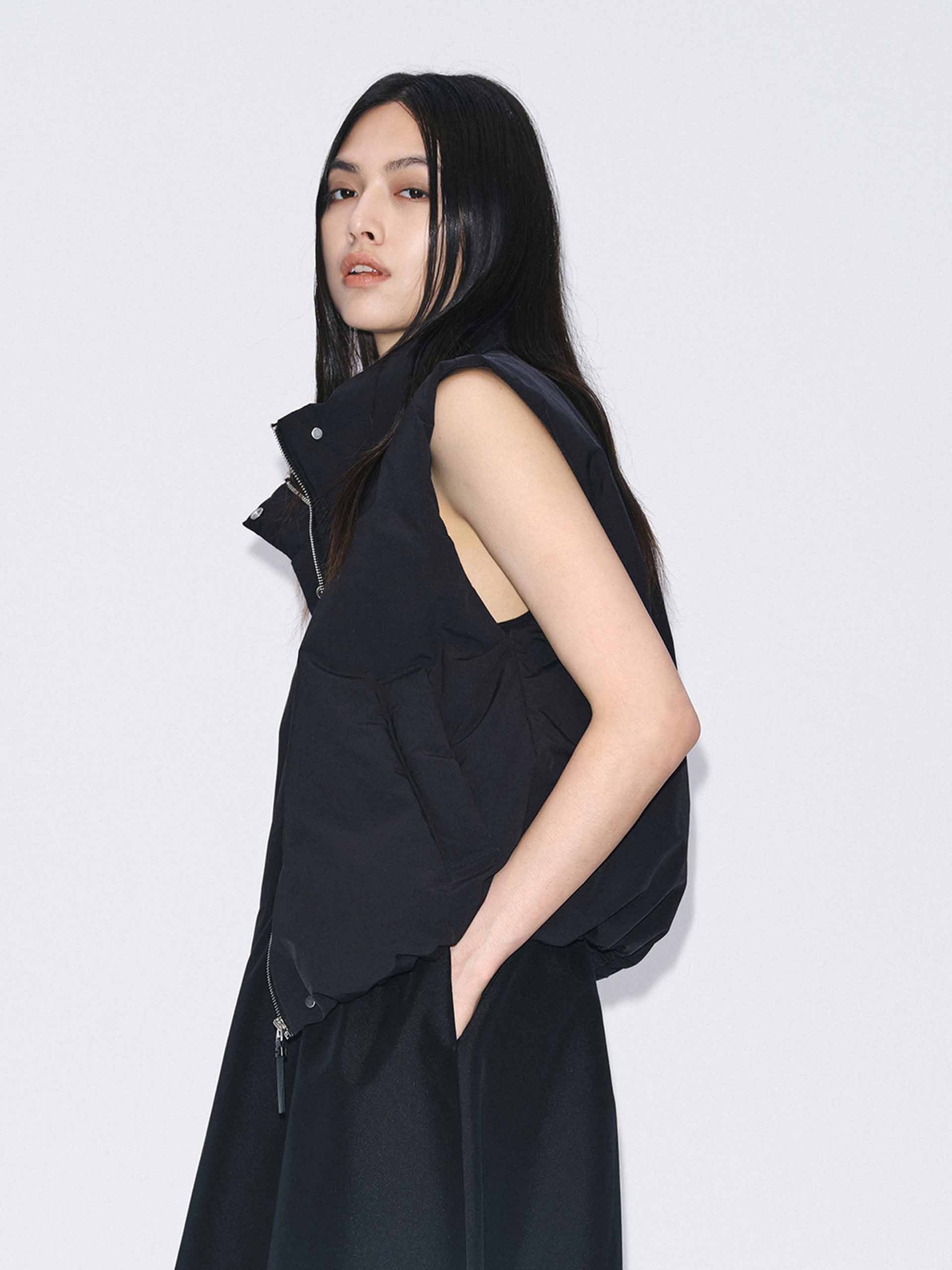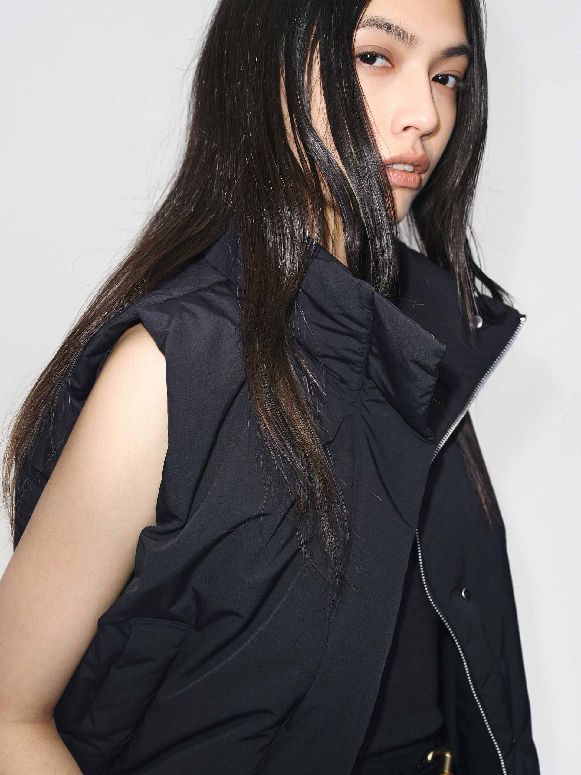 Stay warm without sacrificing style in this innovative down jacket, designed for both mobility and modern elegance. The sleeveless design allows for easy layering over long sleeves or sweaters, while the high turtleneck collar offers extra protection against the cold. Practical side pockets provide convenient storage, and the combination zipper and snap button closure ensures a secure, adjustable fit.