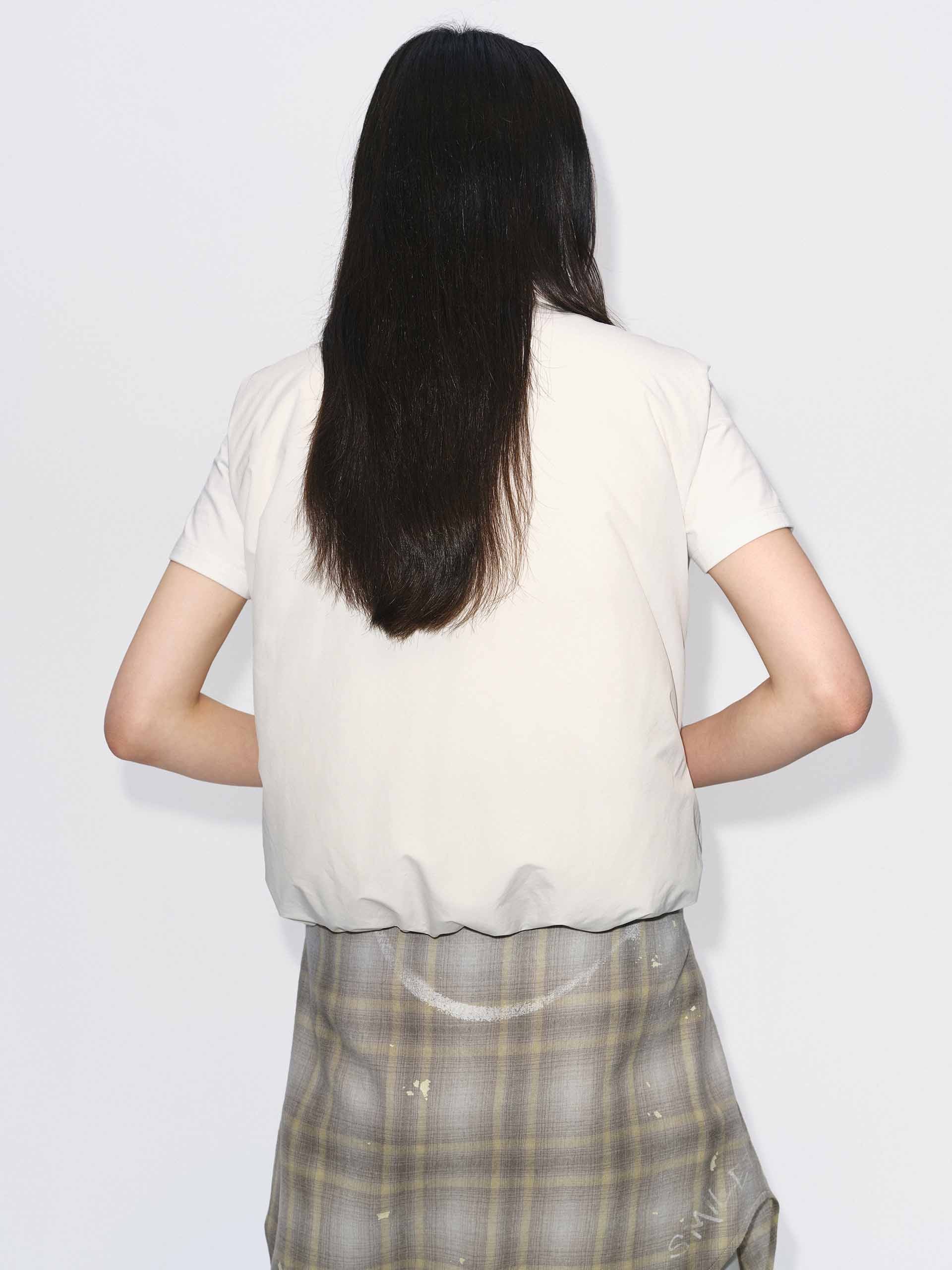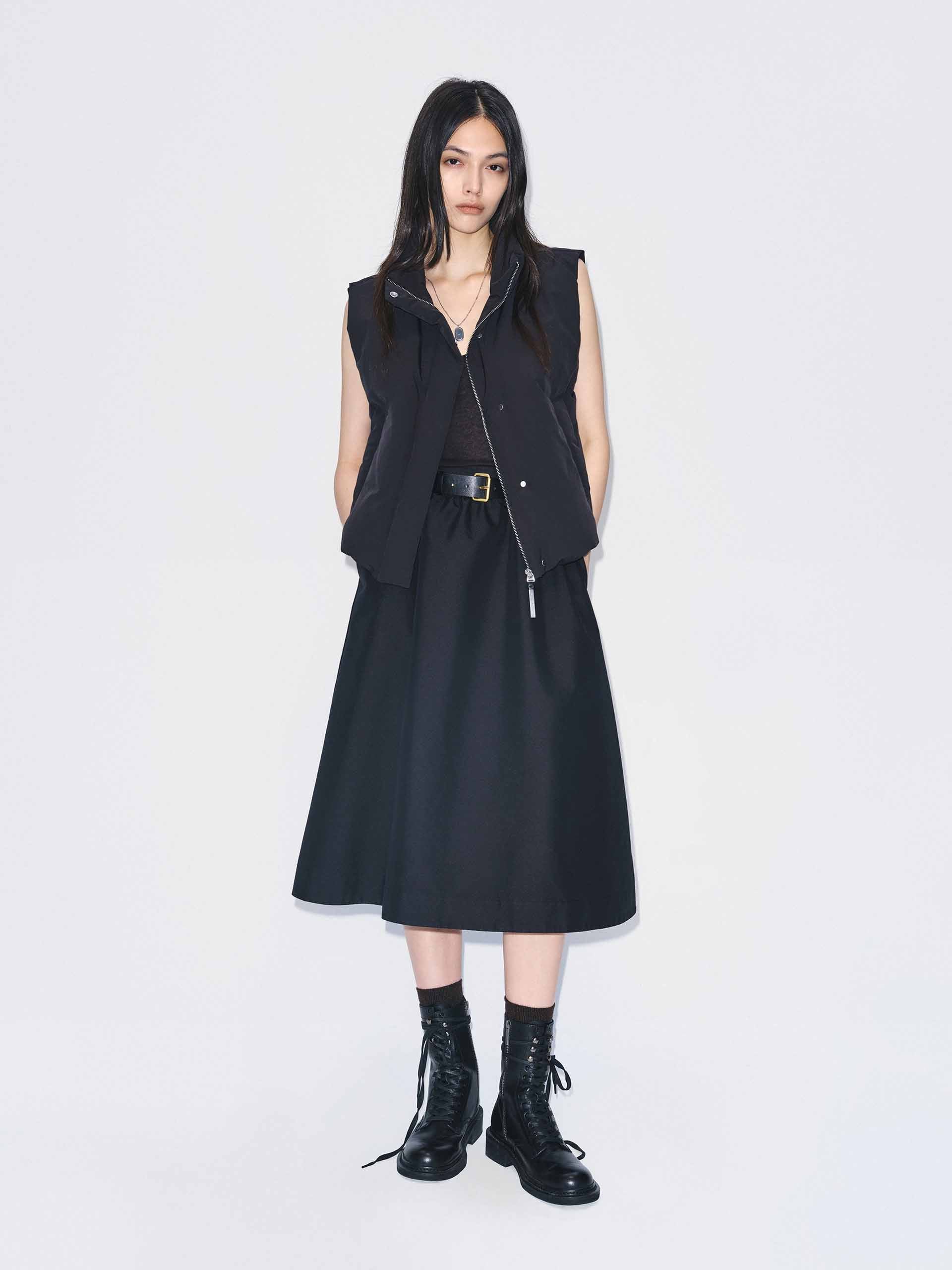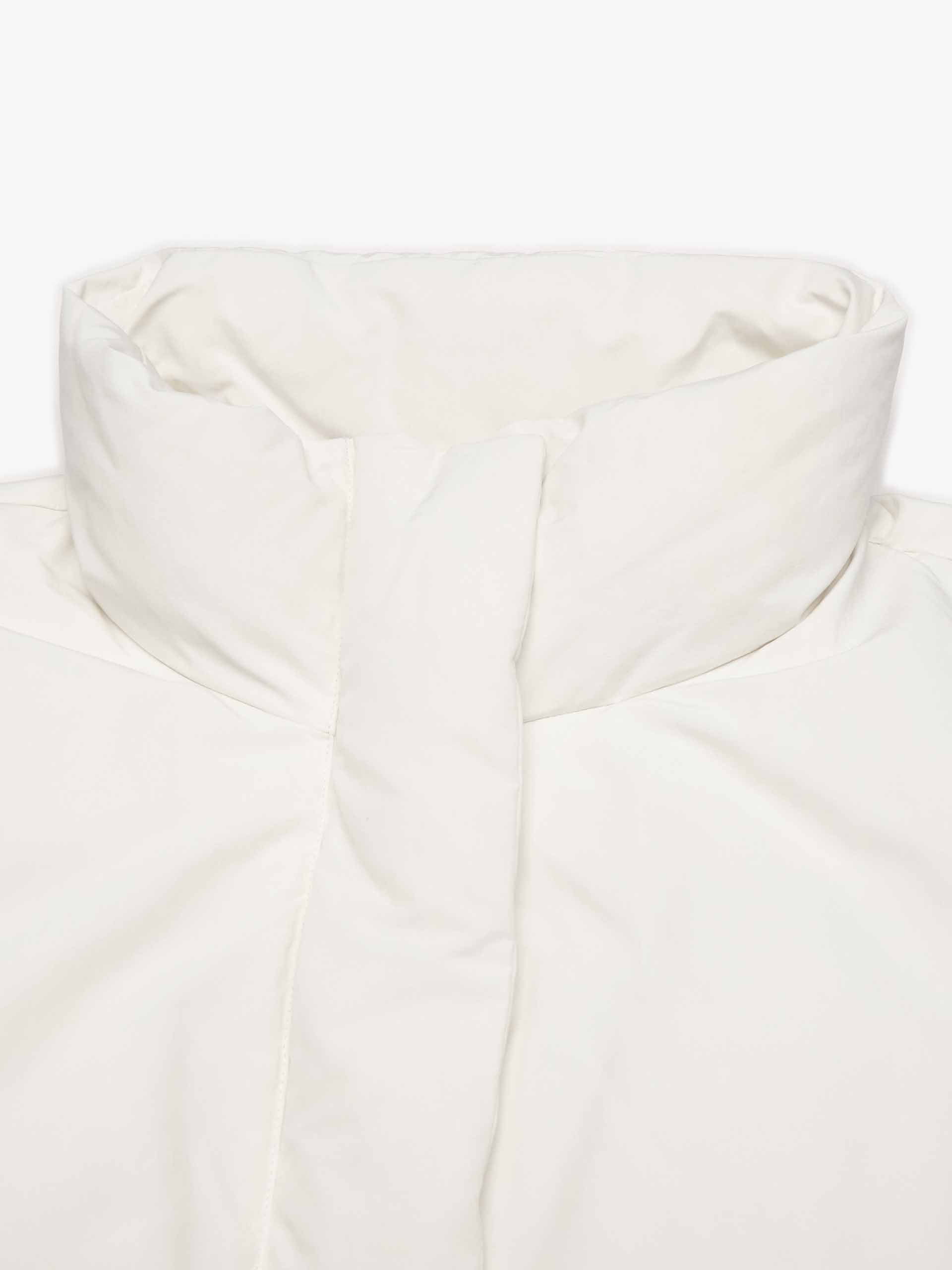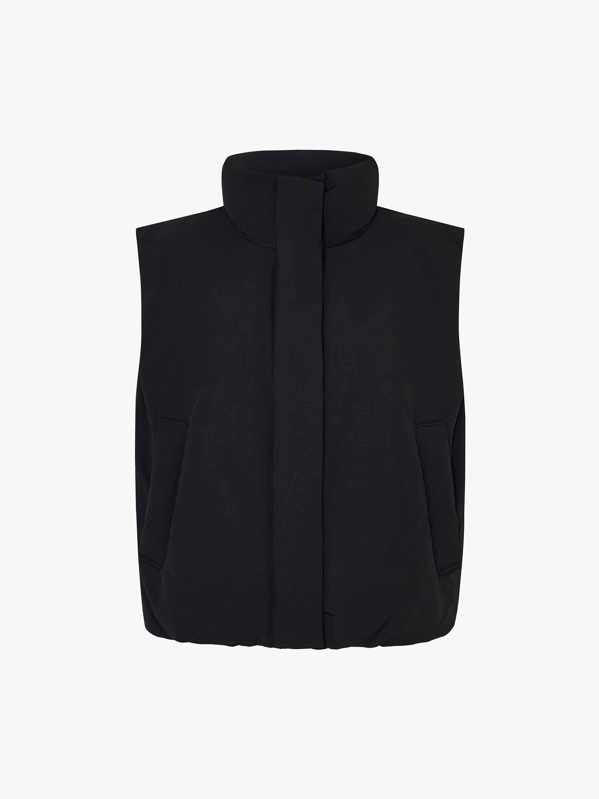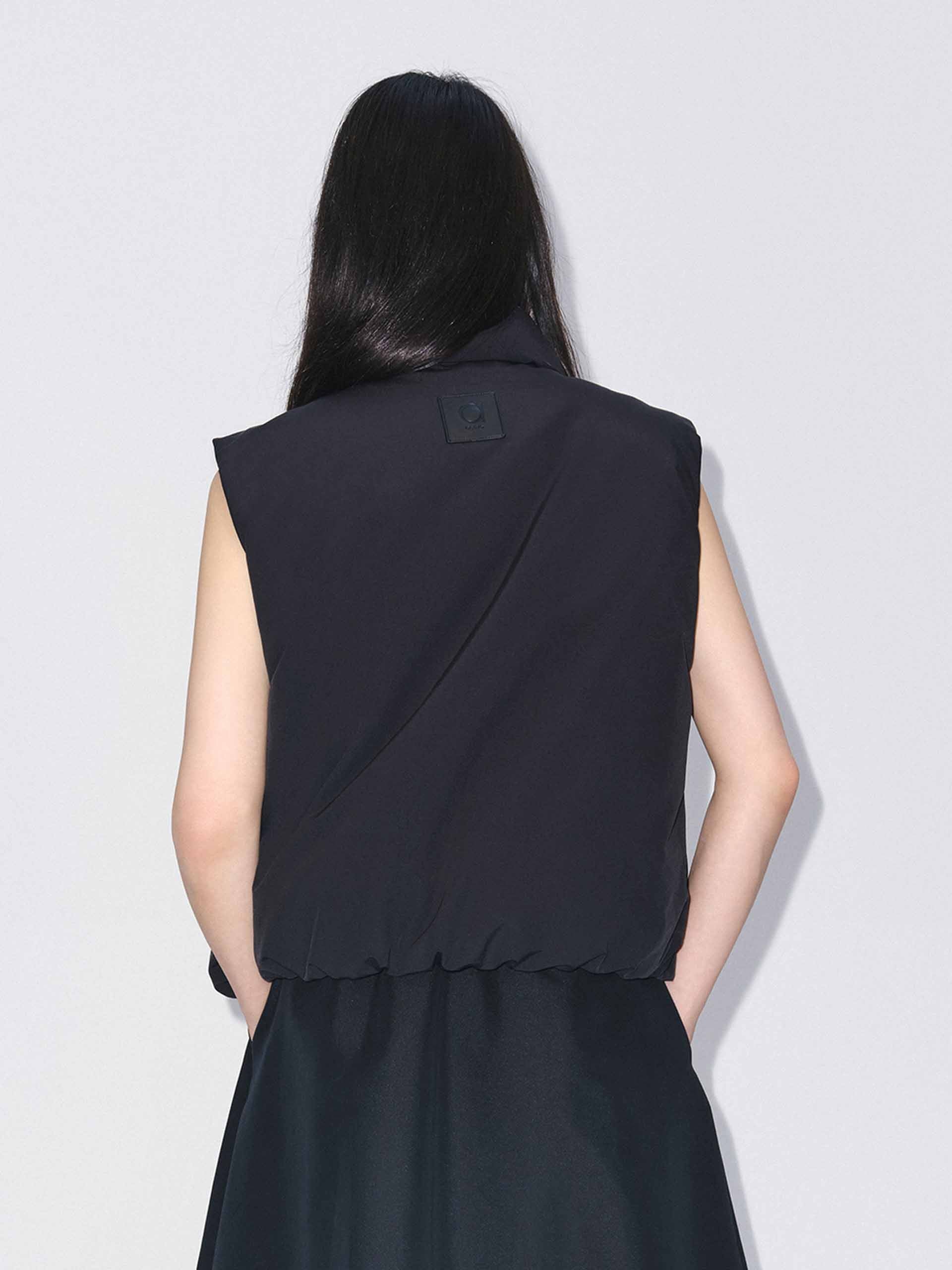 Stay warm without sacrificing style in this innovative down jacket, designed for both mobility and modern elegance. The sleeveless design allows for easy layering over long sleeves or sweaters, while the high turtleneck collar offers extra protection against the cold. Practical side pockets provide convenient storage, and the combination zipper and snap button closure ensures a secure, adjustable fit.