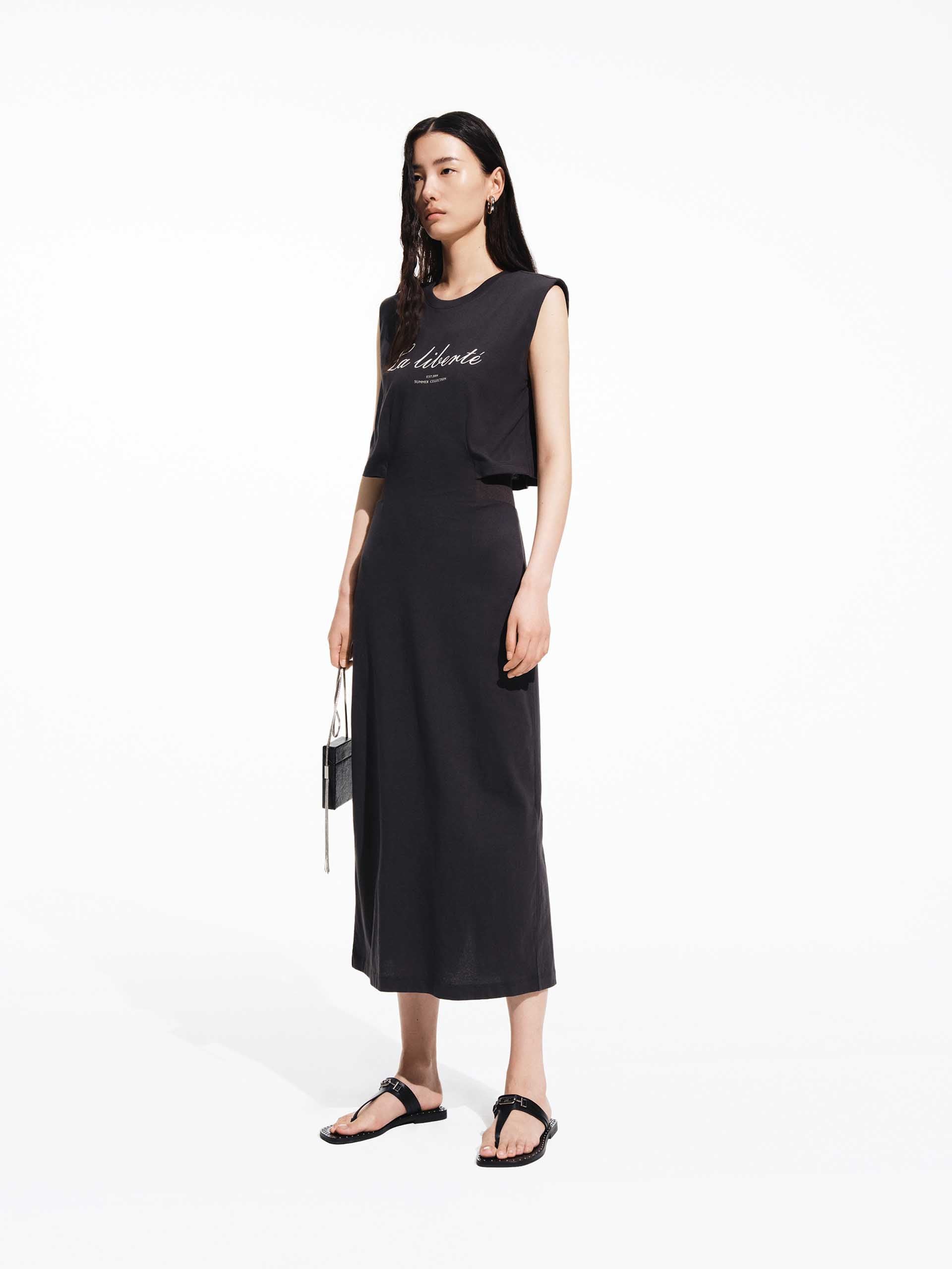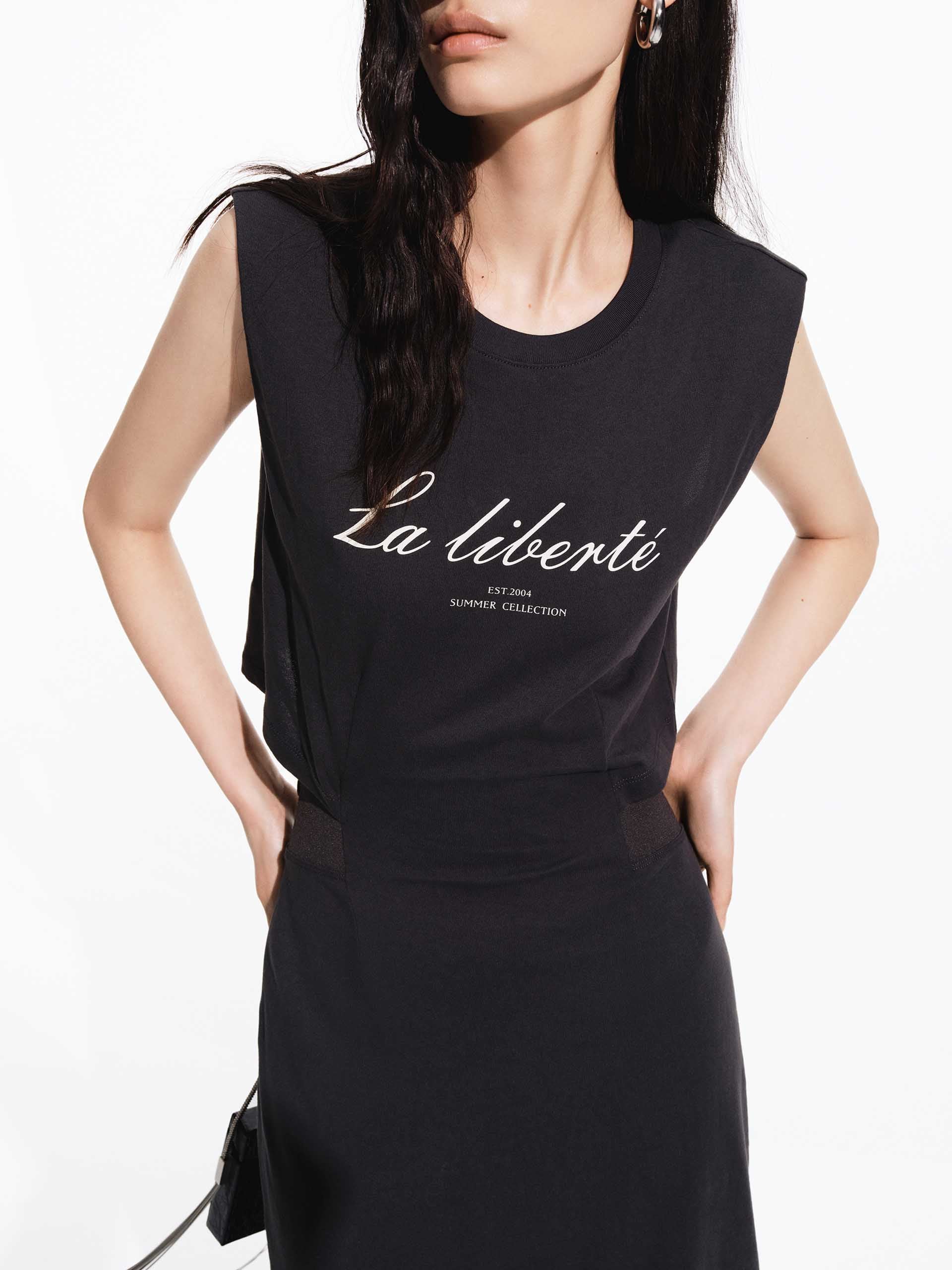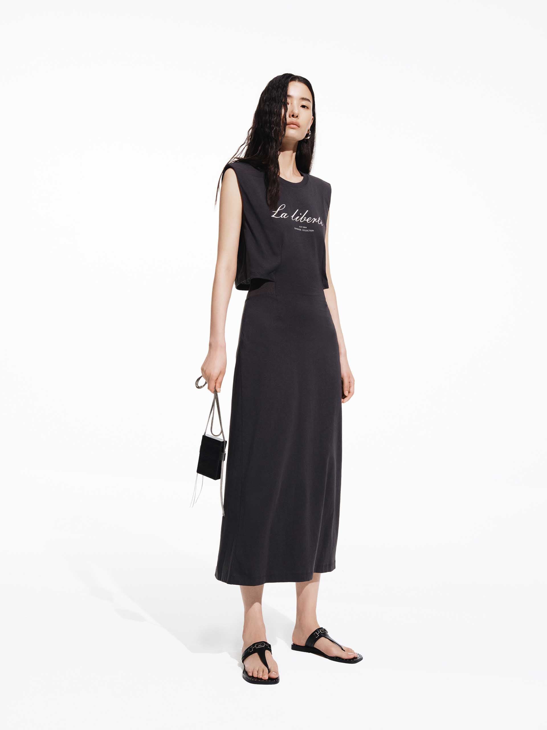 This stylish maxi dress is perfect for making a statement this summer. Made from soft and breathable cotton fabric. Feature sleeveless design and cutout waist add a modern touch, while the slit at the back adds a hint of sophistication. The front letter print design adds a playful and unique touch to this dress. Pair it with sandals for a casual look.