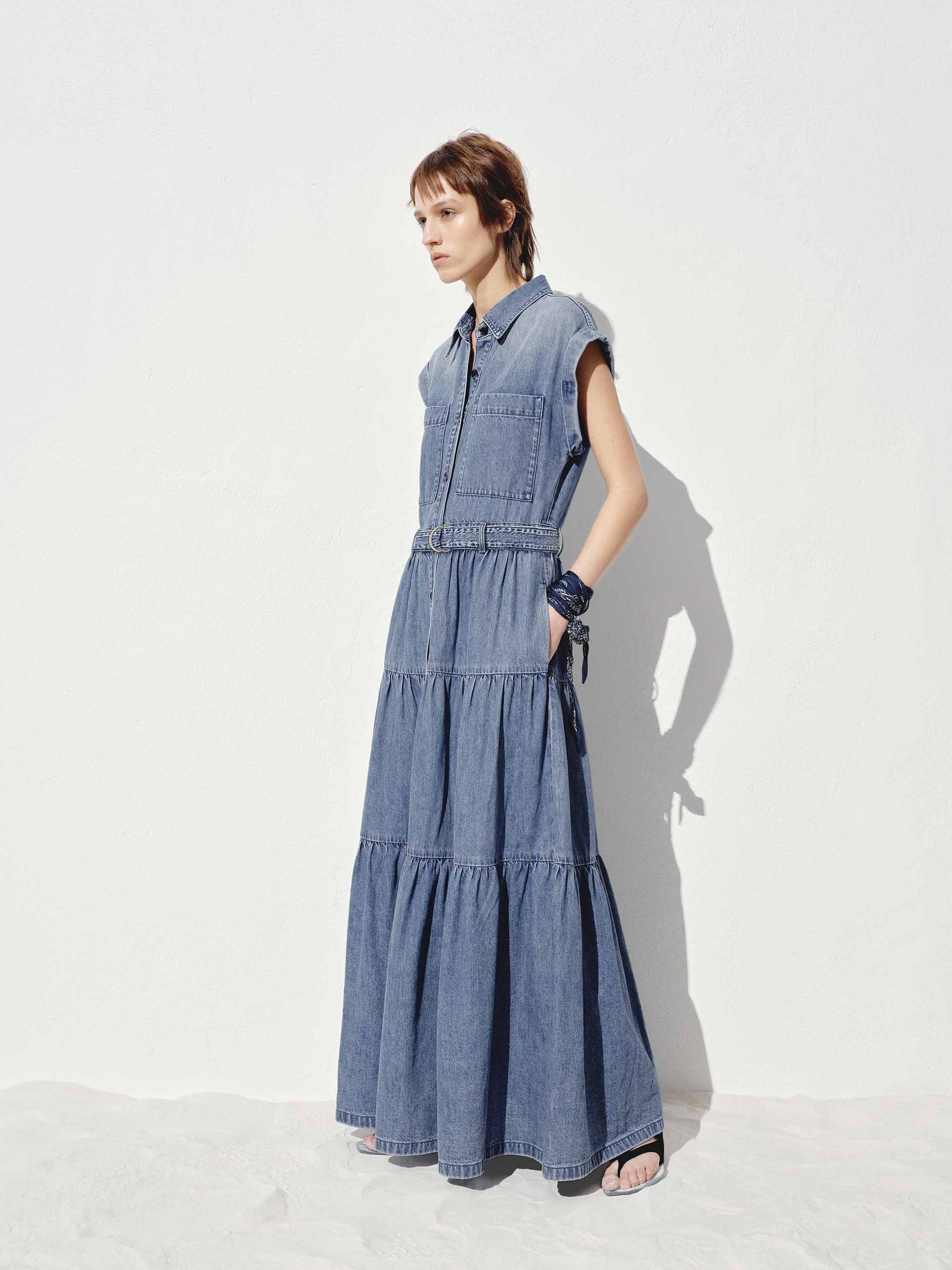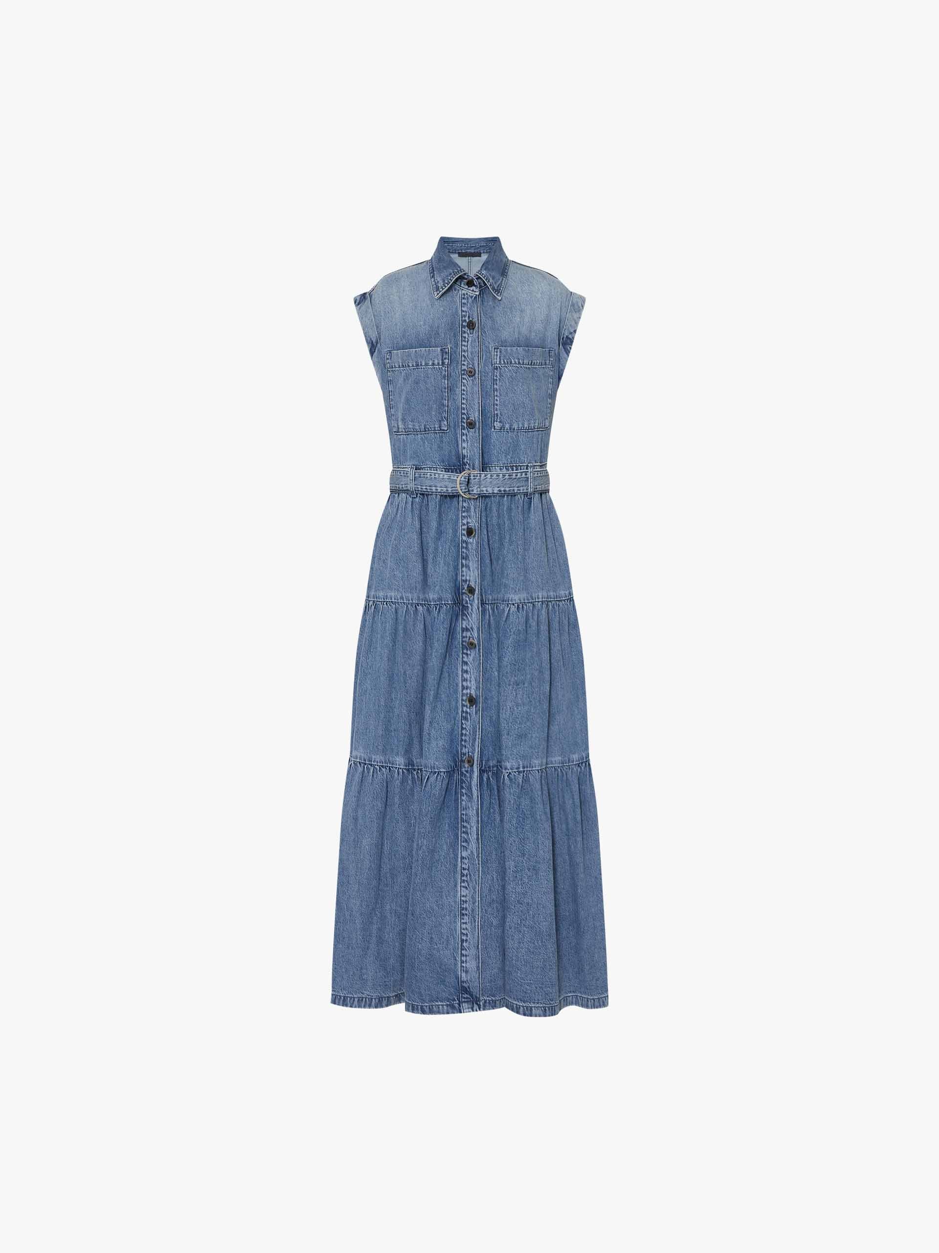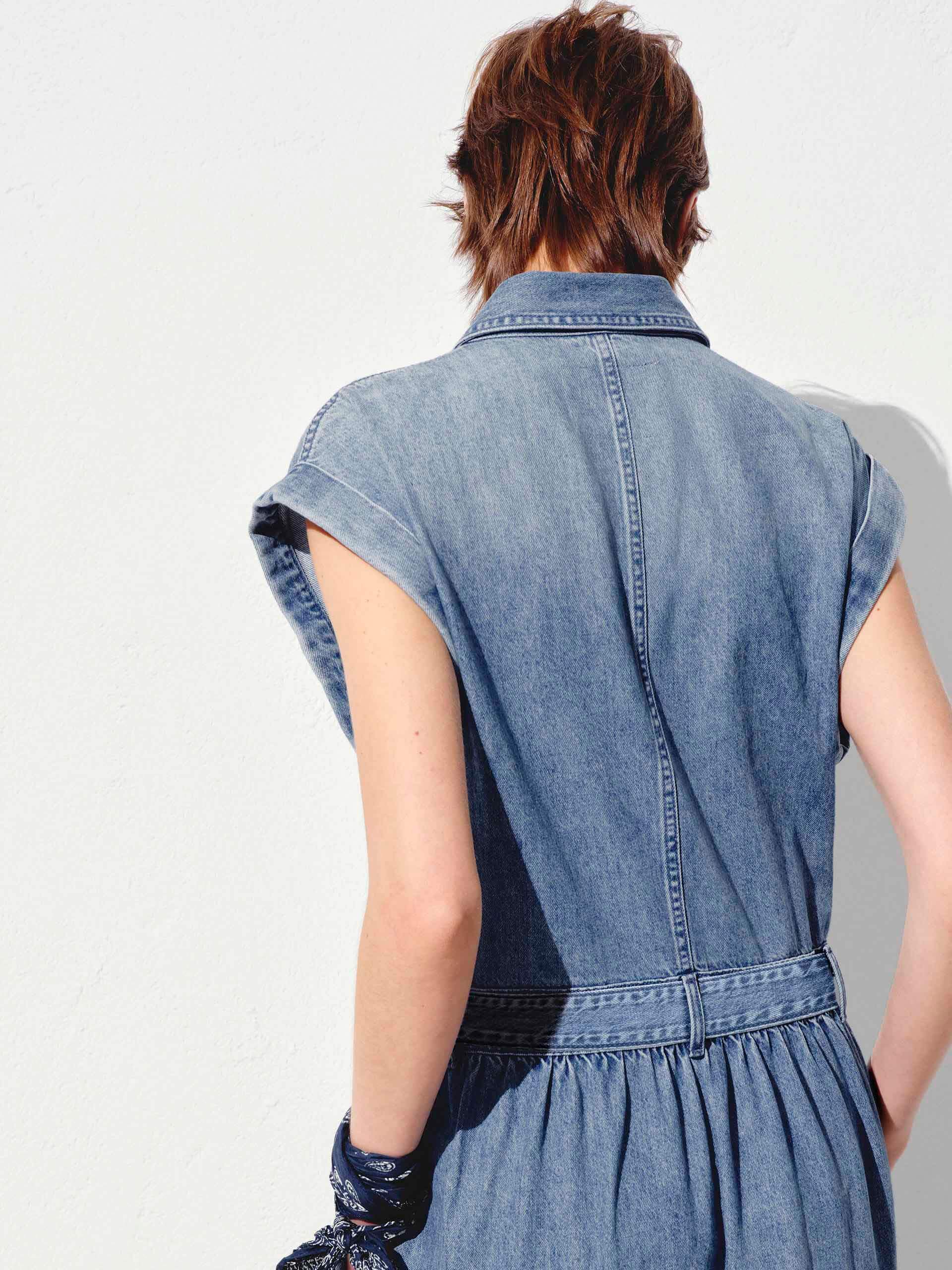 Channel modern prairie charm in this timeless denim maxi dress. The authentic button-front design pays homage to 70s Western wear, while the waist belt sculpts your silhouette effortlessly. Practical meets chic with reinforced chest pockets that hold smartphones securely.