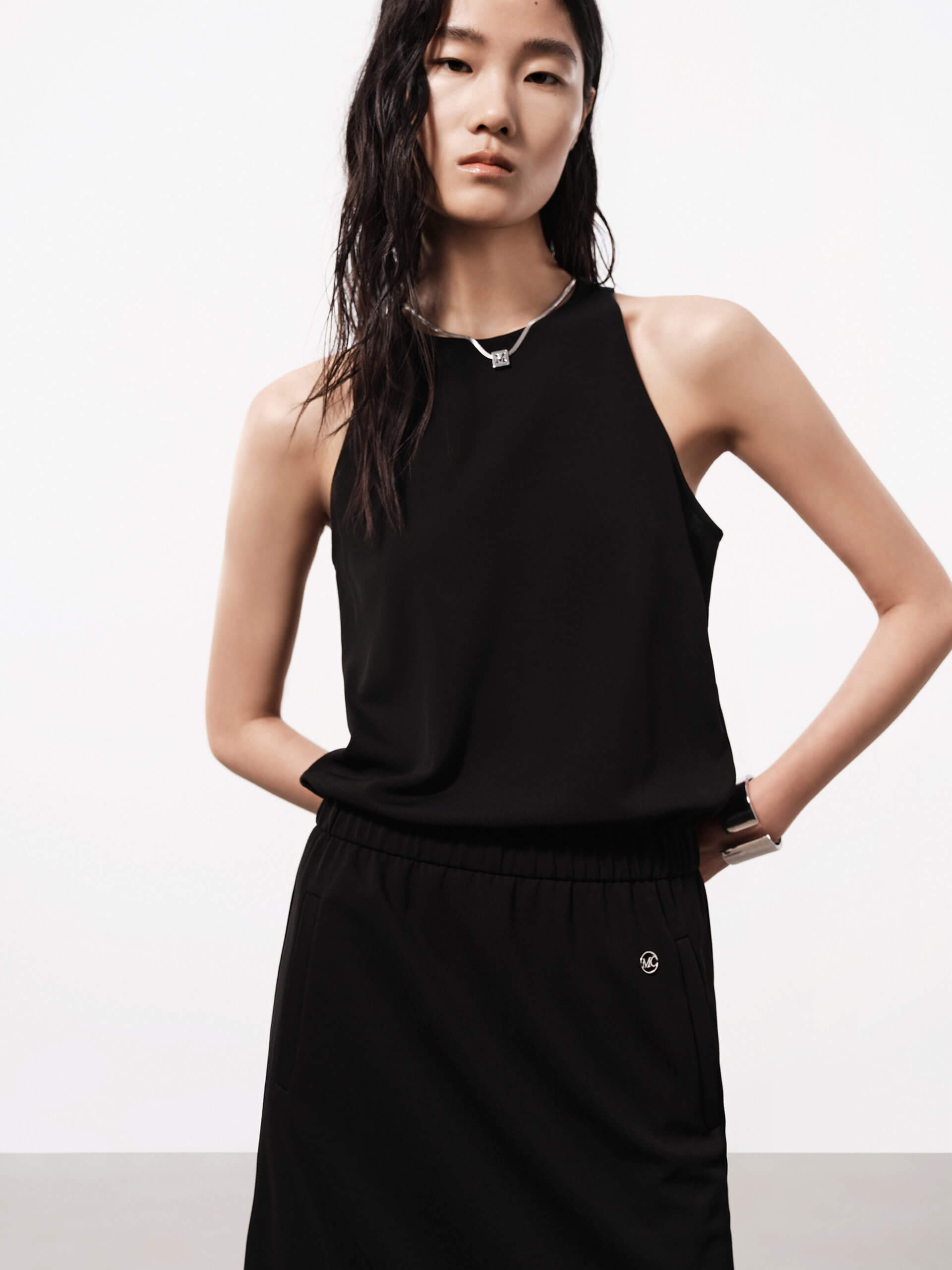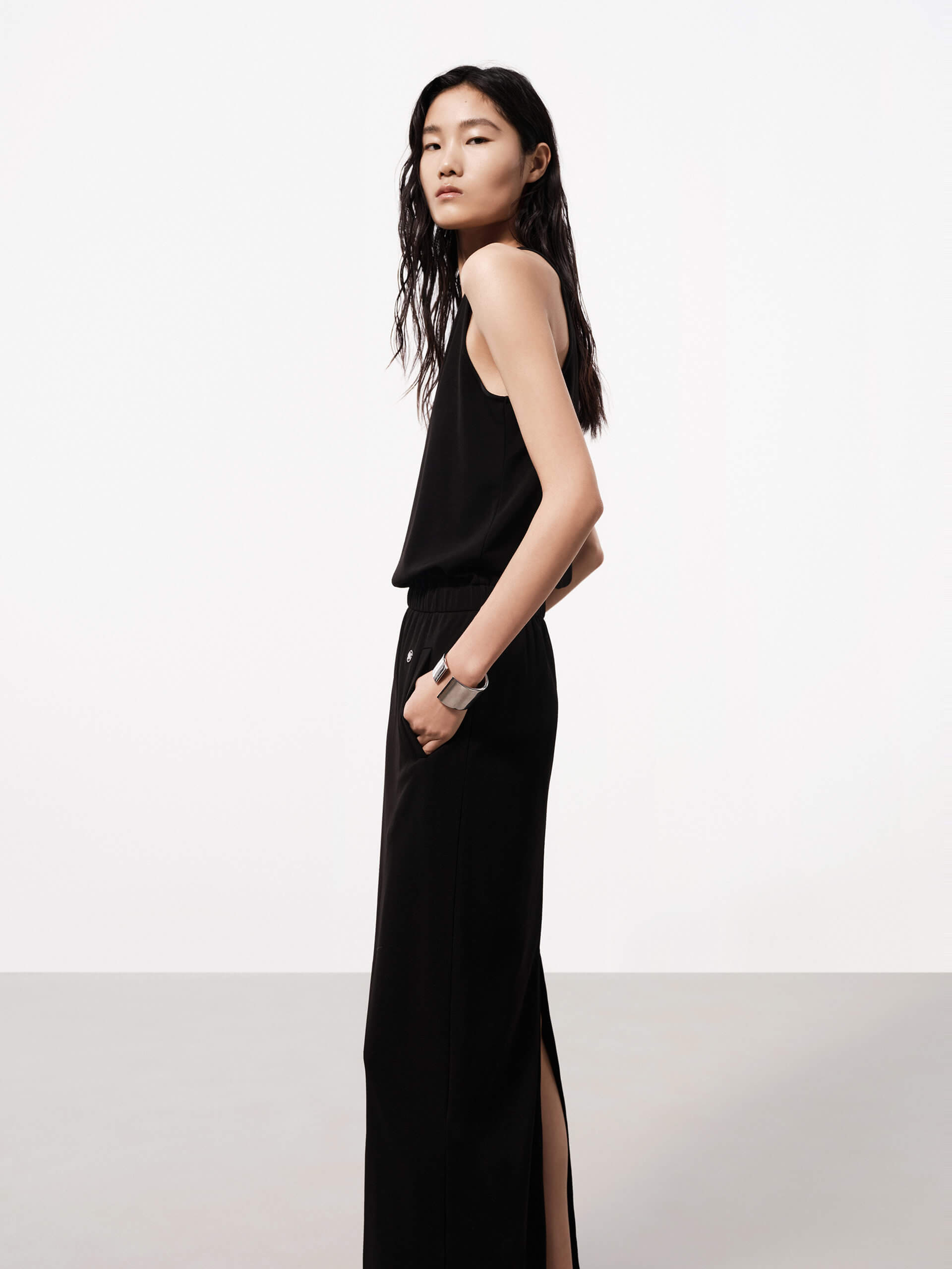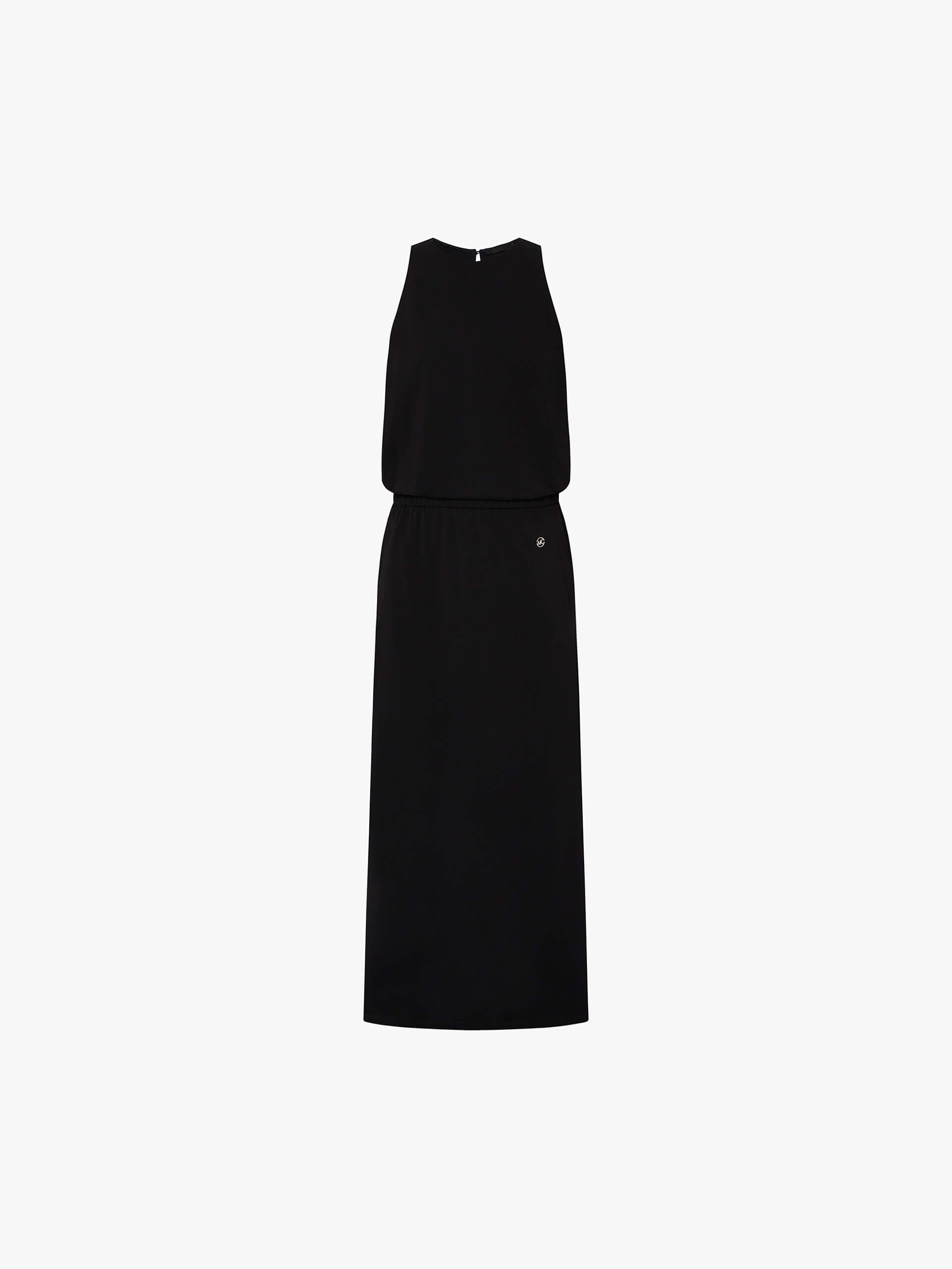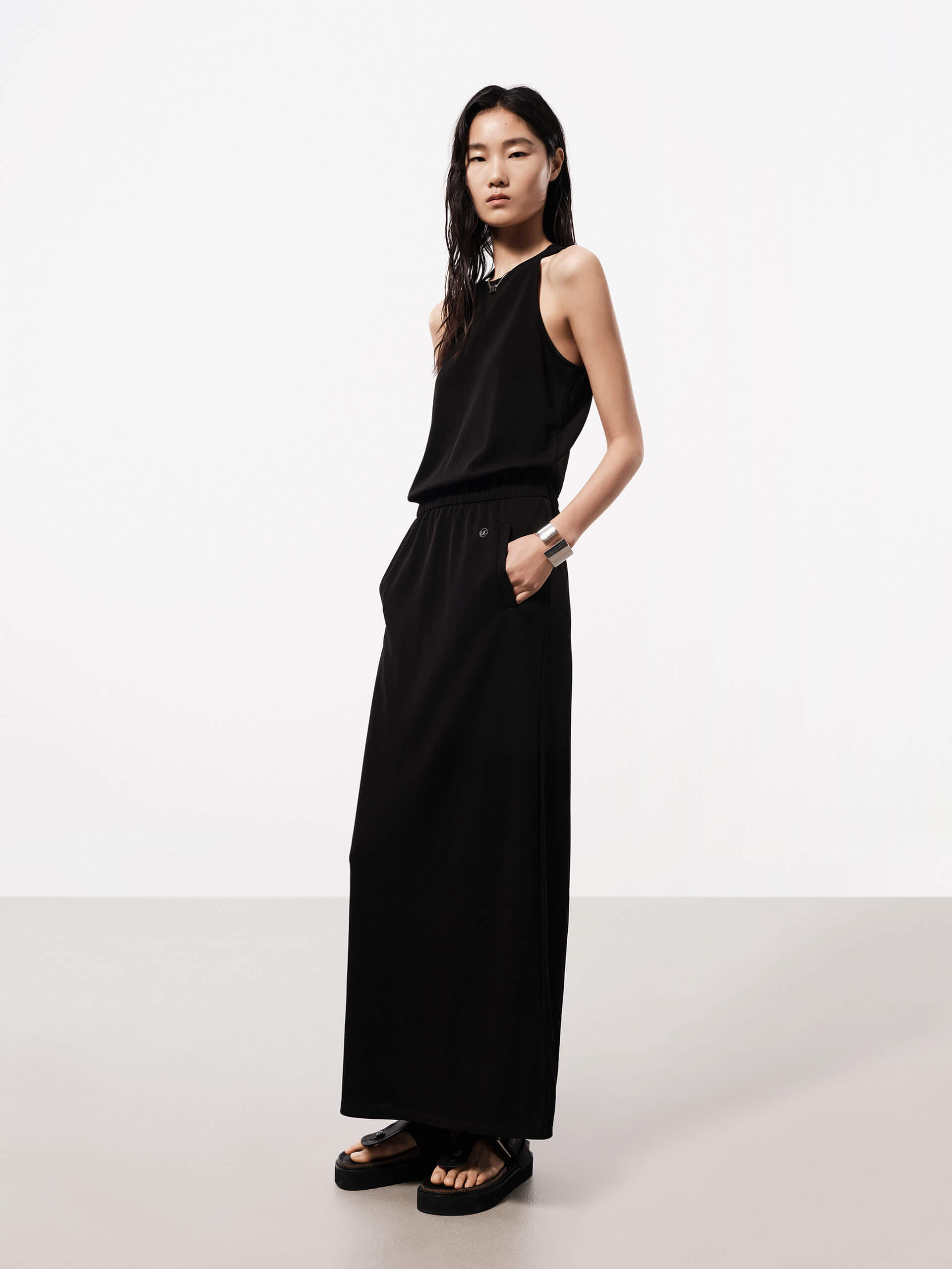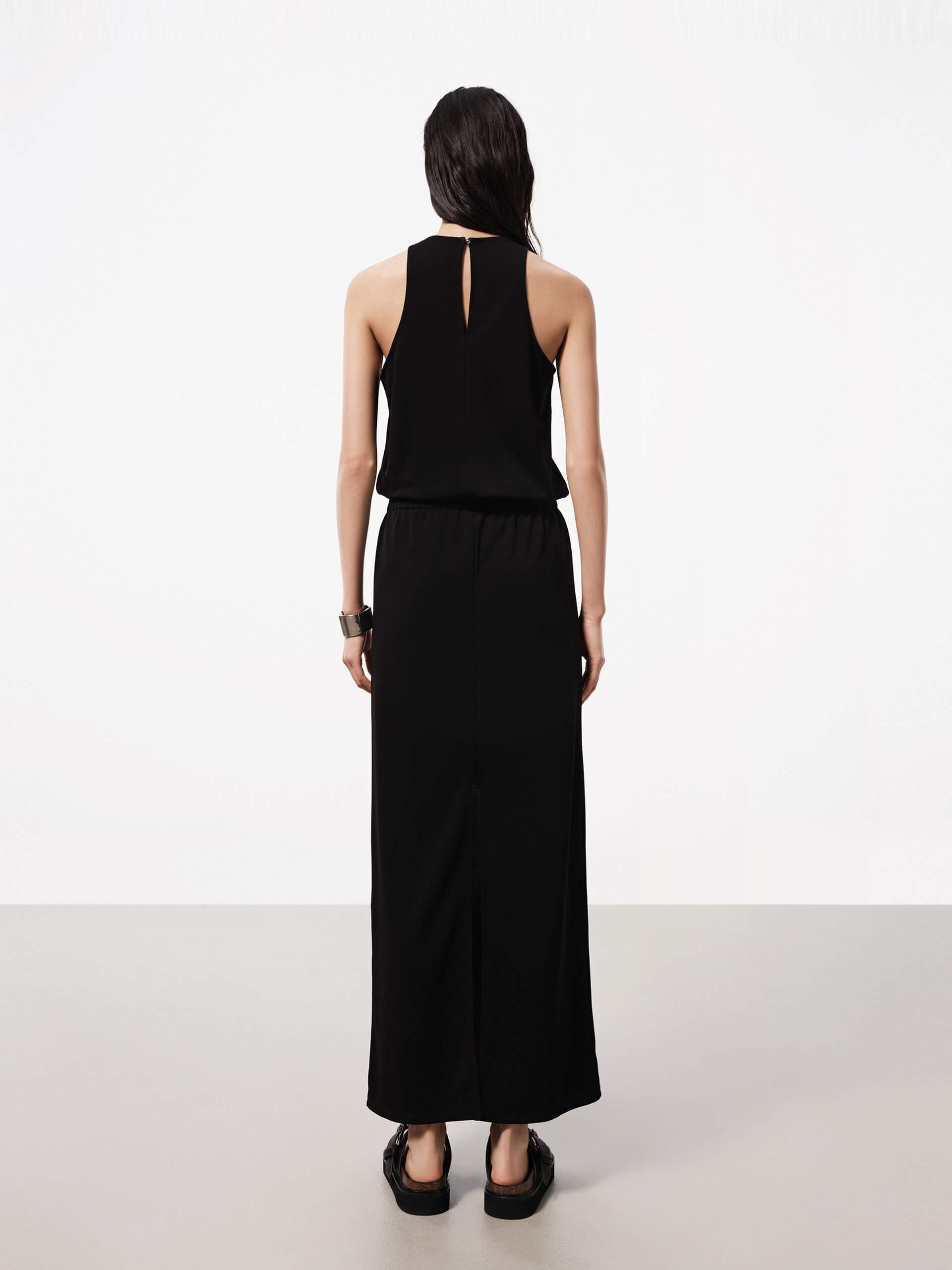 This elegant maxi dress is the perfect combination of style and comfort. Made from a soft and breathable drape fabric, it flows gracefully as you move. The sleeveless design keeps you cool on warm days, while the elasticized waist adds a flattering and adjustable fit. Feature back cutout and slit design add a touch of sophistication and sexiness, making this dress perfect for a night out or a special occasion.