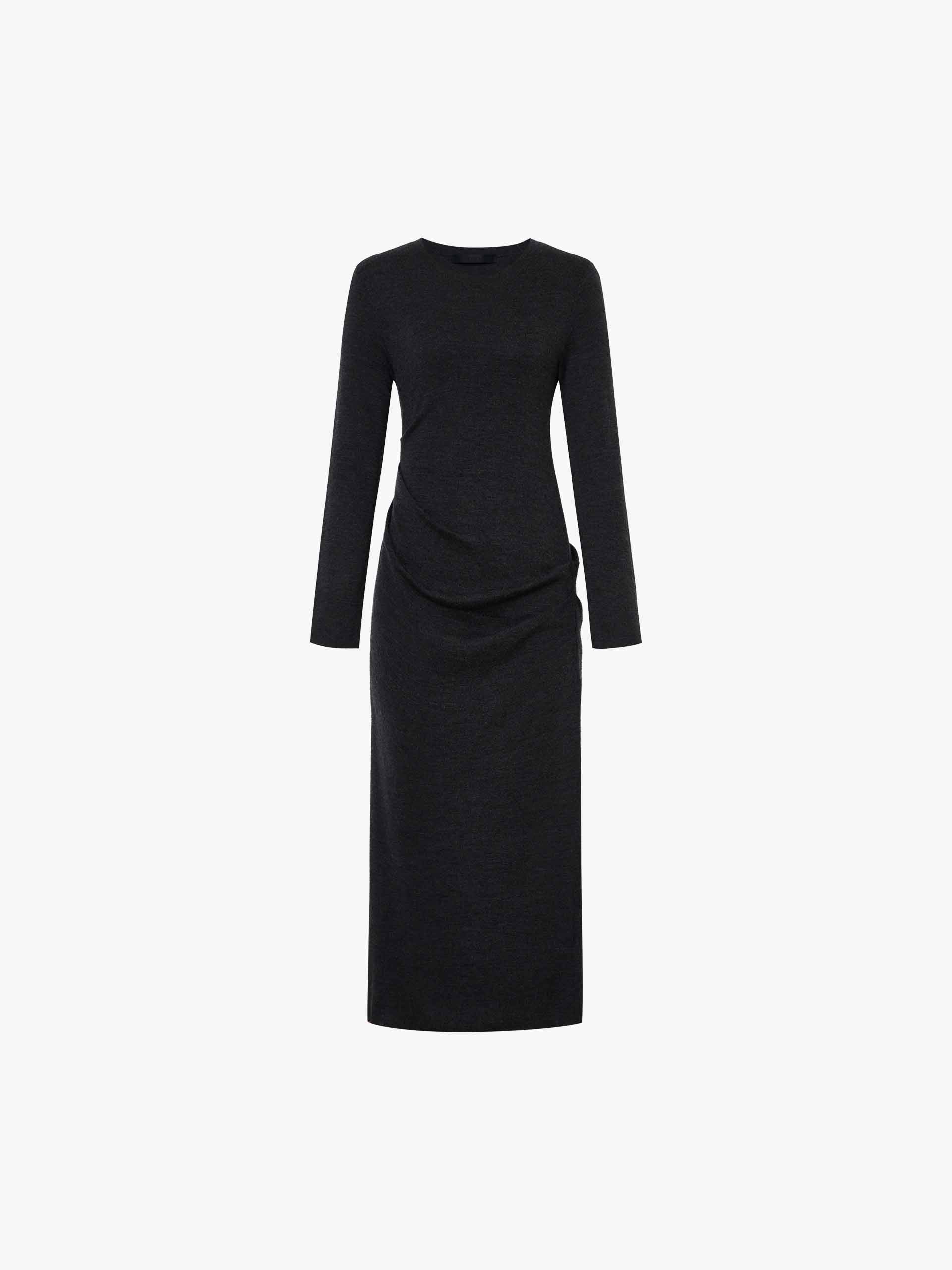 Crafted from 100% premium wool, this dress combines a slim-fitting silhouette with graceful midi-length elegance. Featuring a classic round neck and long sleeves, it’s designed for refined simplicity. The pleated waist detail adds subtle texture and shape, enhancing your natural curves while maintaining a clean, polished look.