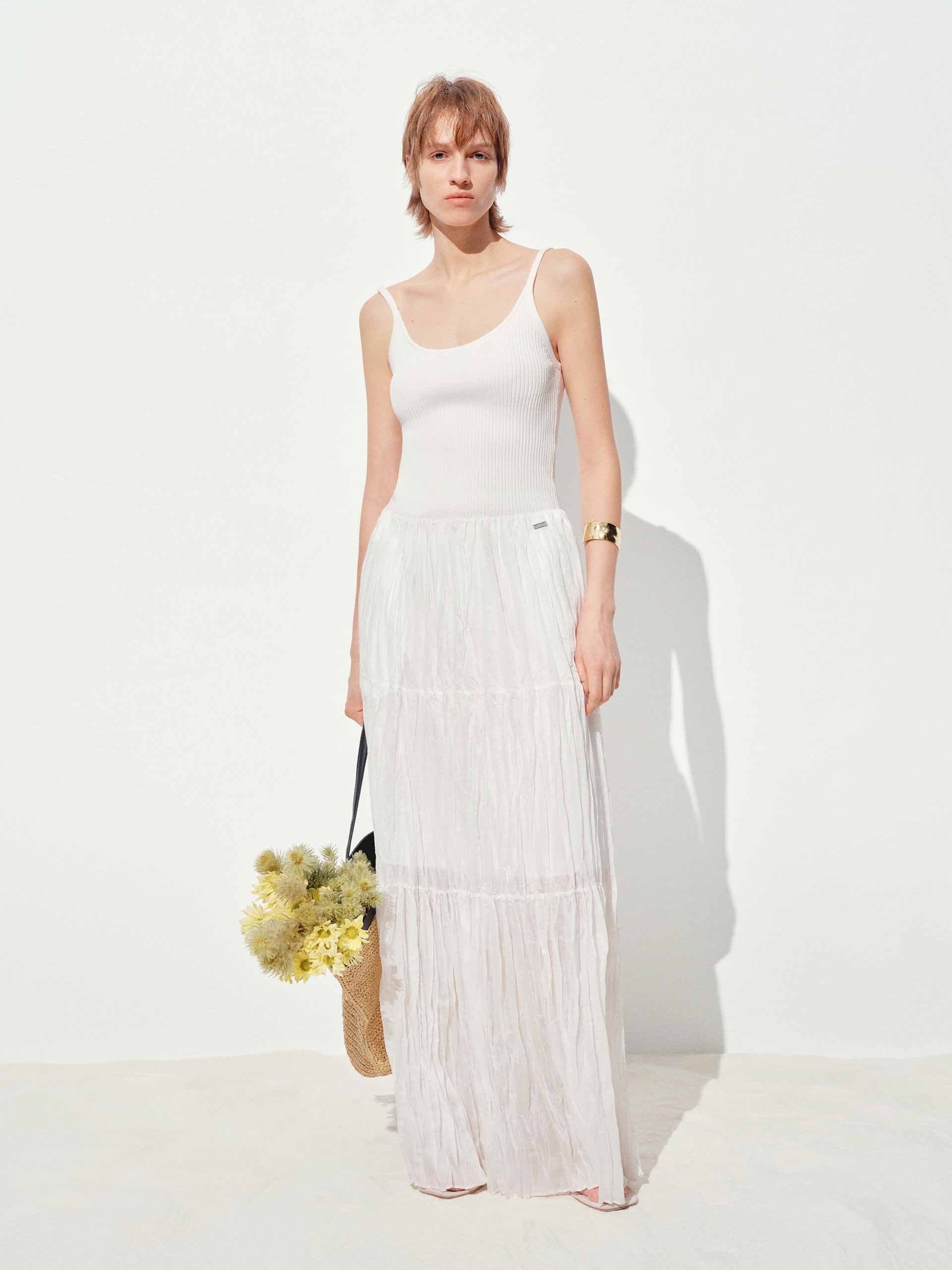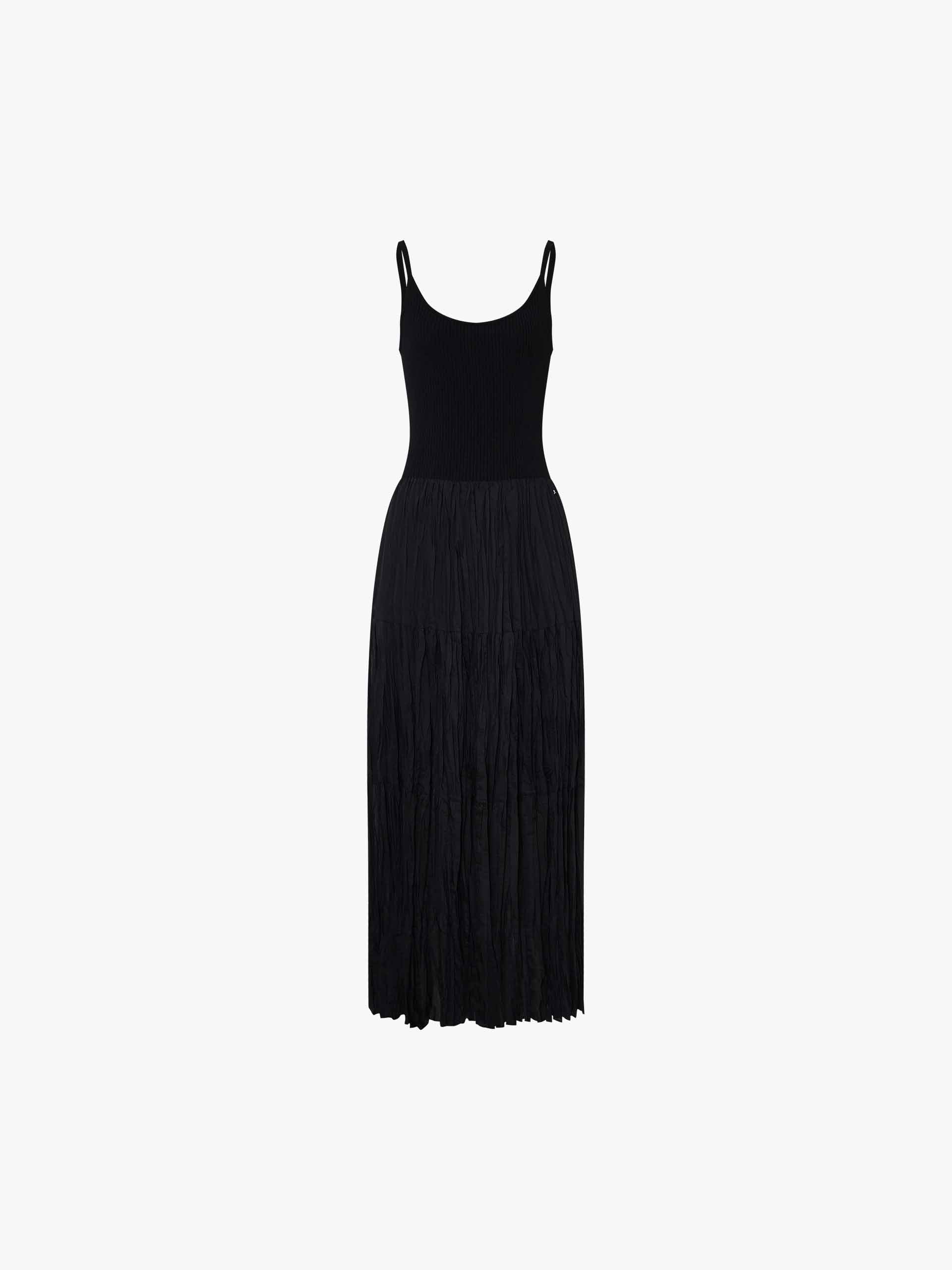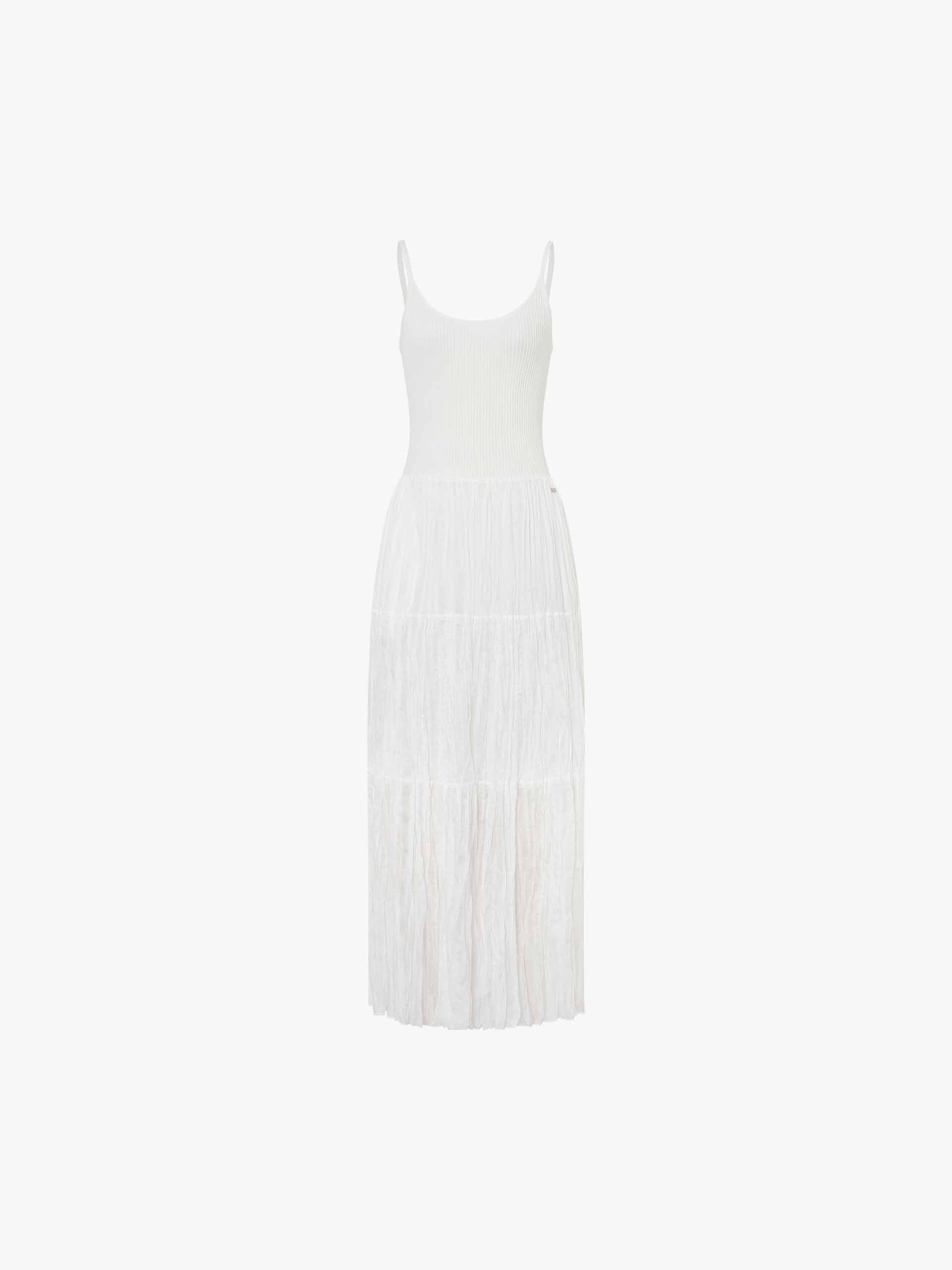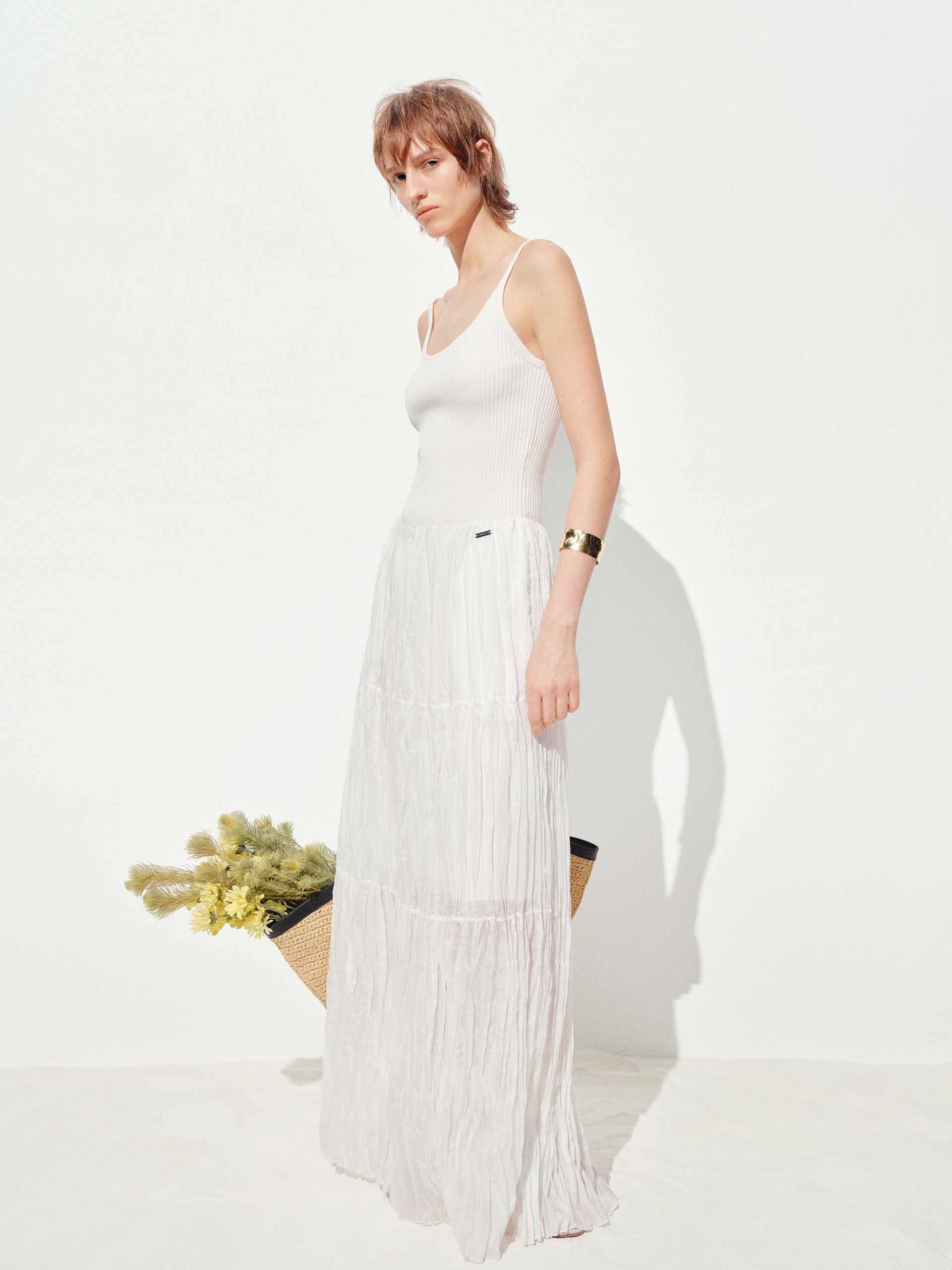 Embrace effortless elegance in this flowy dress, a stunning maxi design that blends structure with softness. The regular fit glides over your curves gracefully, while clever vest-inspired detailing adds a contemporary edge to the romantic silhouette. Delicate tulle panel accents create subtle texture and movement, whisper of sheerness for a tastefully alluring effect.
