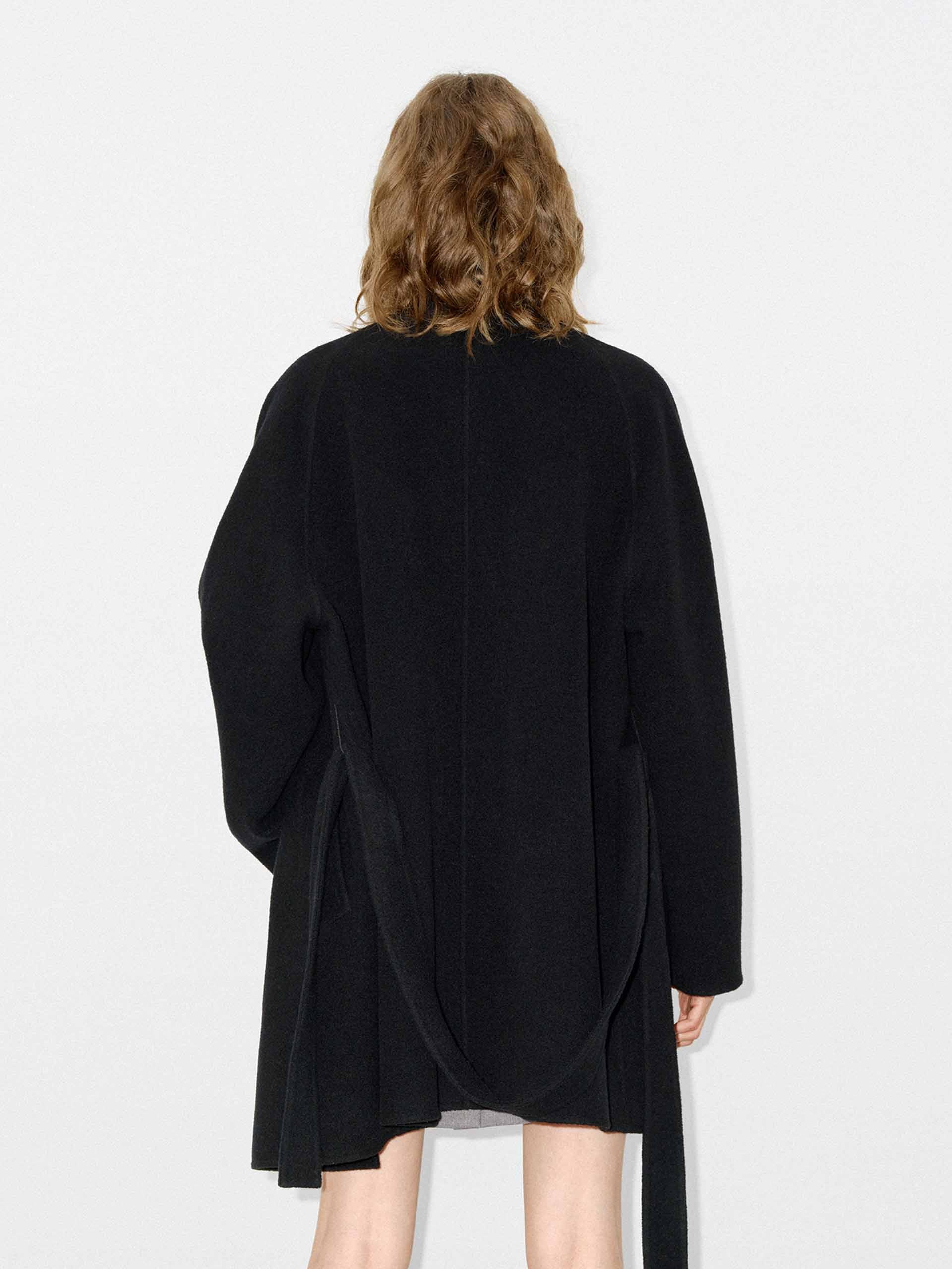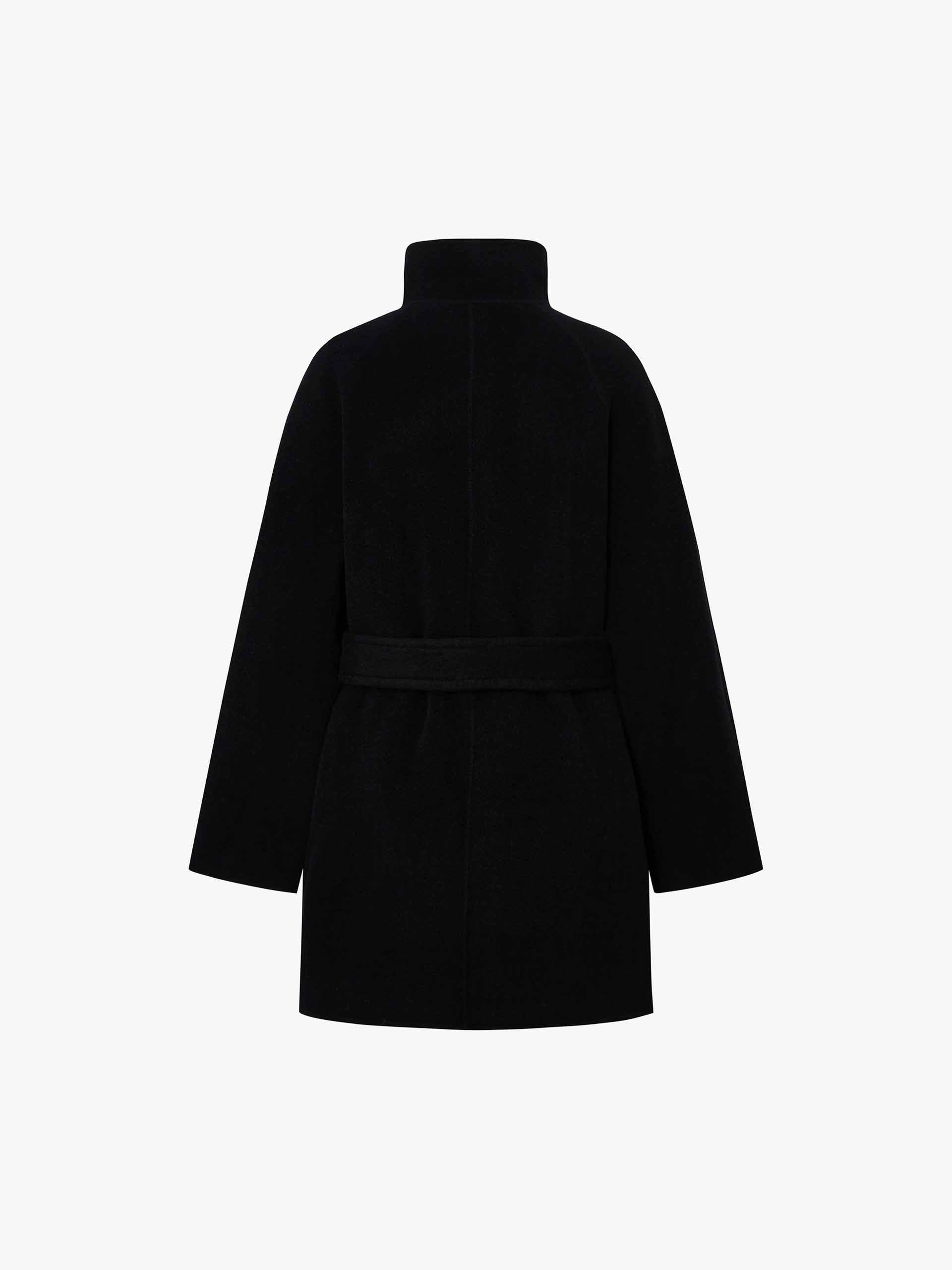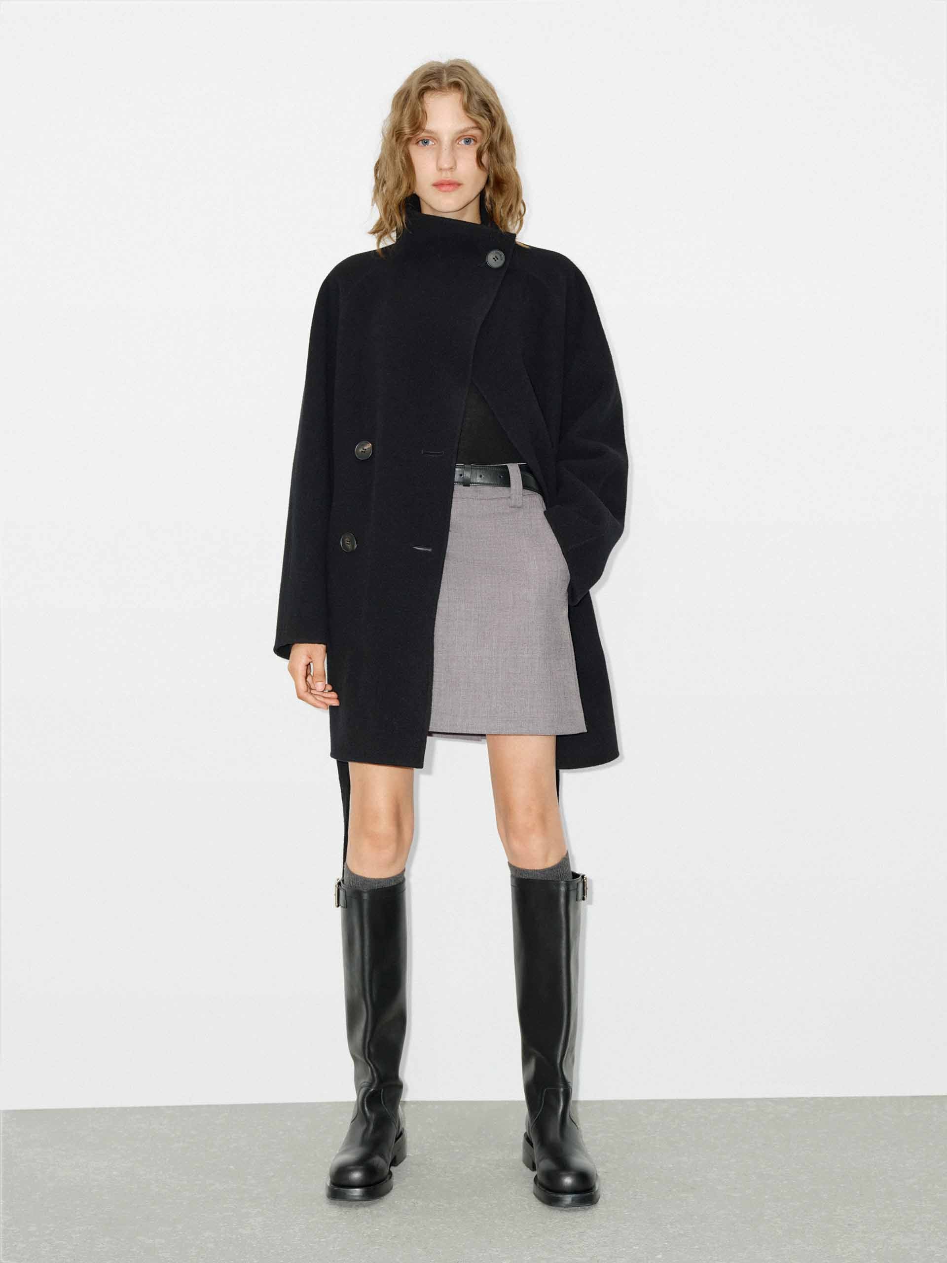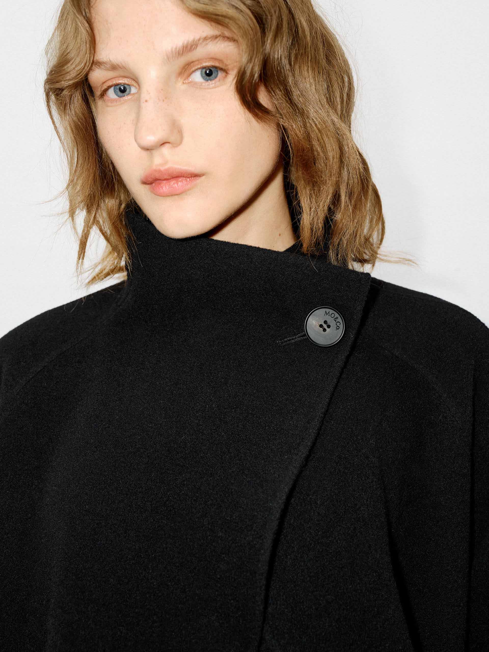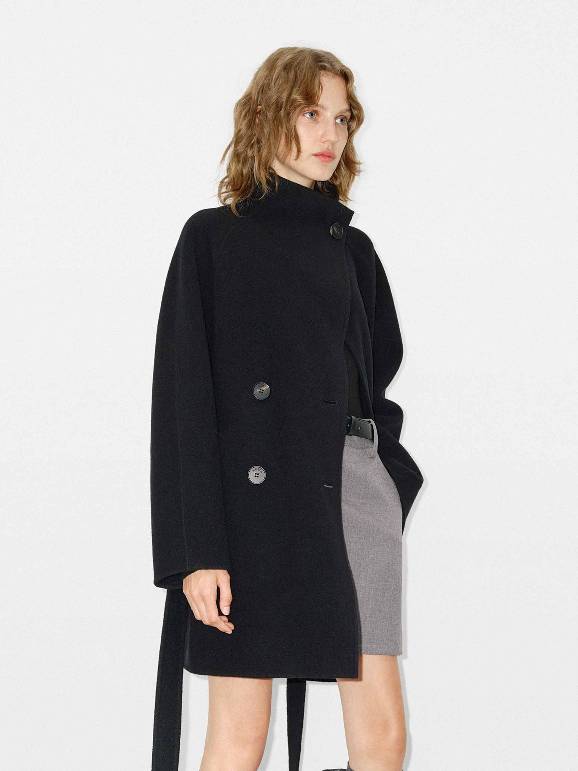This coat is a luxurious piece made from high-quality Merino wool with double-faced for enhanced structure and warmth. It's tailored in a relaxed by the raglan sleeves and designed with a standing collar that can be worn open or buttoned to the top.