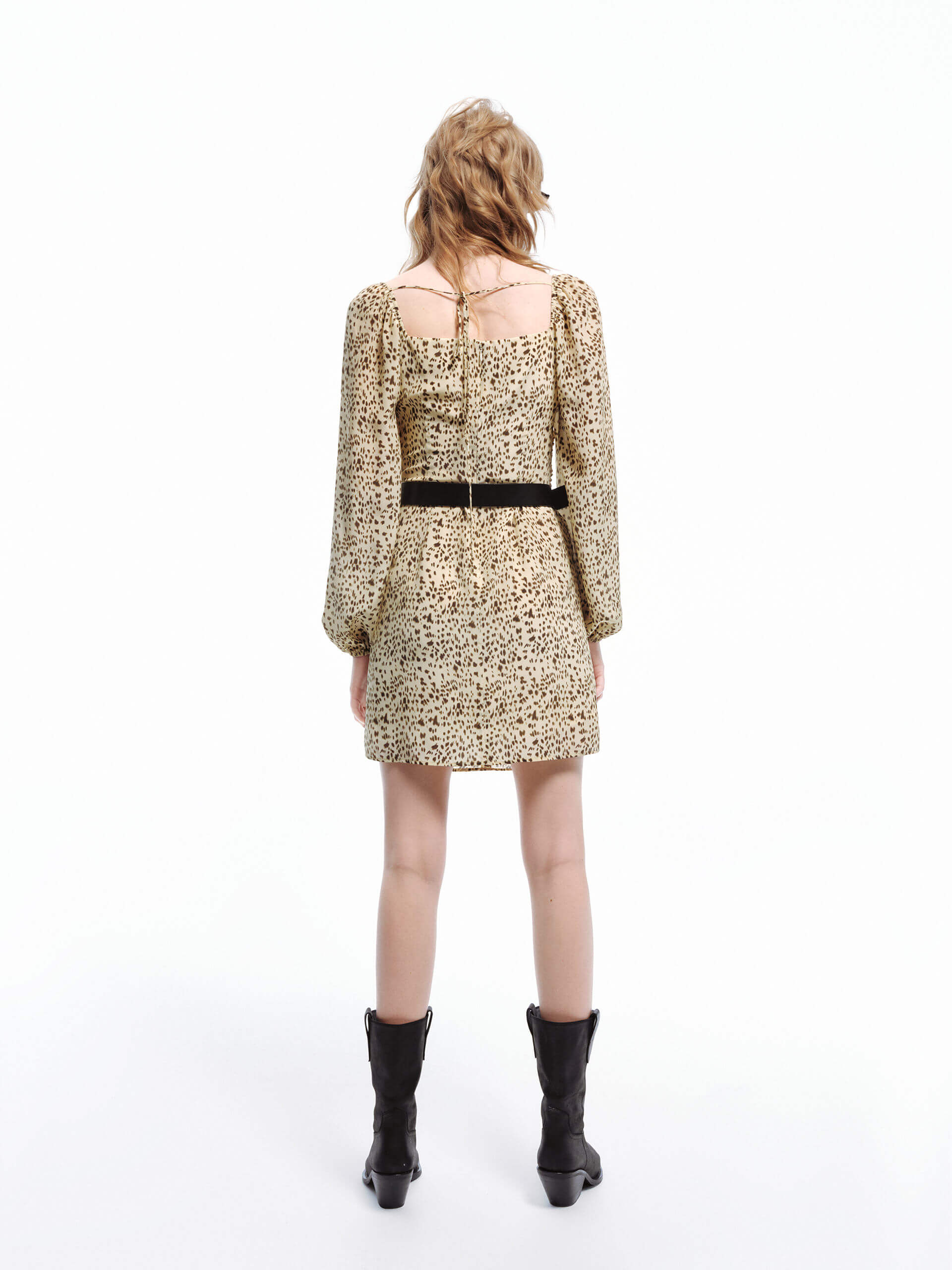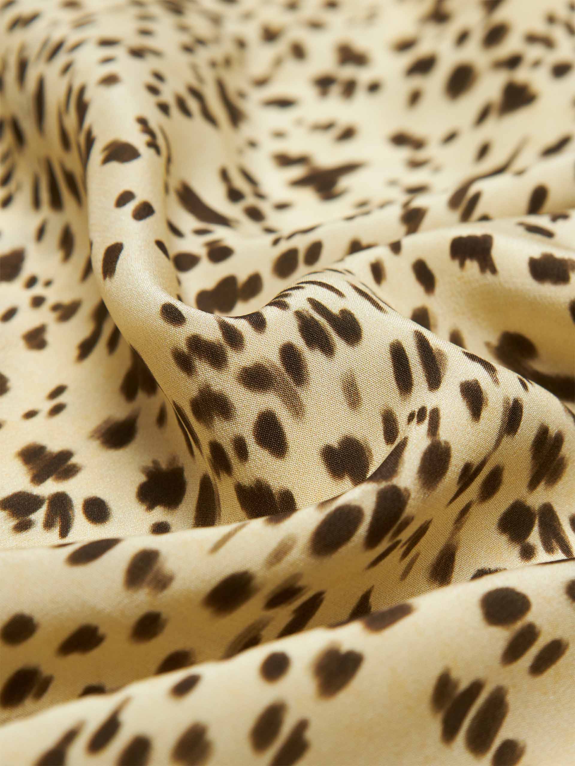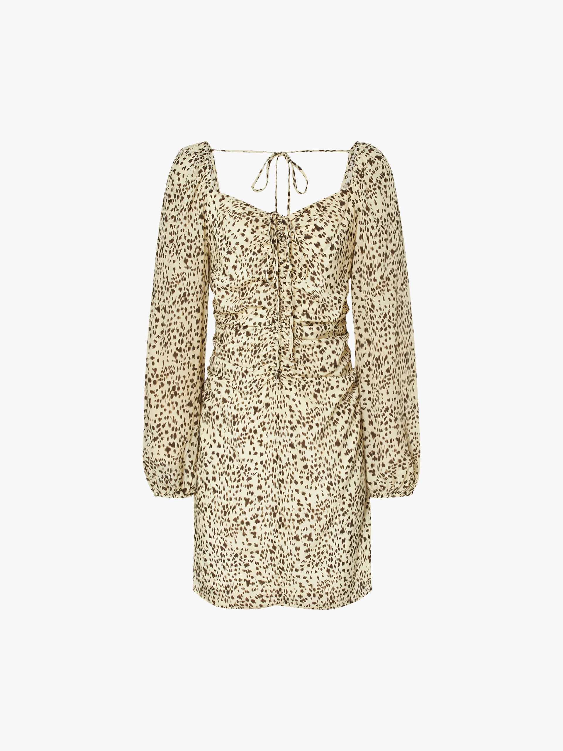 This mini dress is covered in classic leopard spots, it's cut from comfortable and super soft silk. Featuring a square neckline and front pleats with a drawstring for a customizable look. Wear yours with a pair of ankle boots for a cool look.