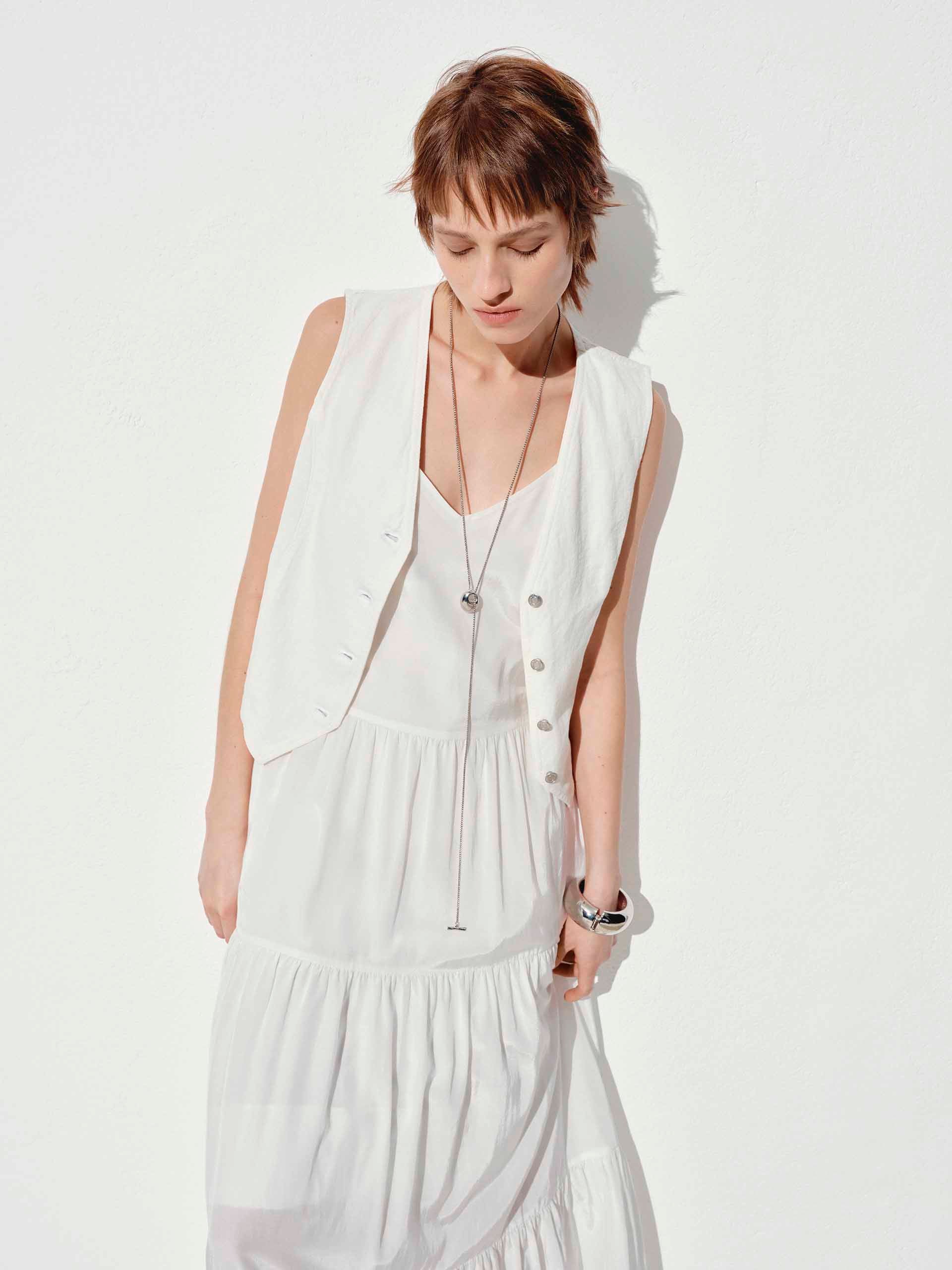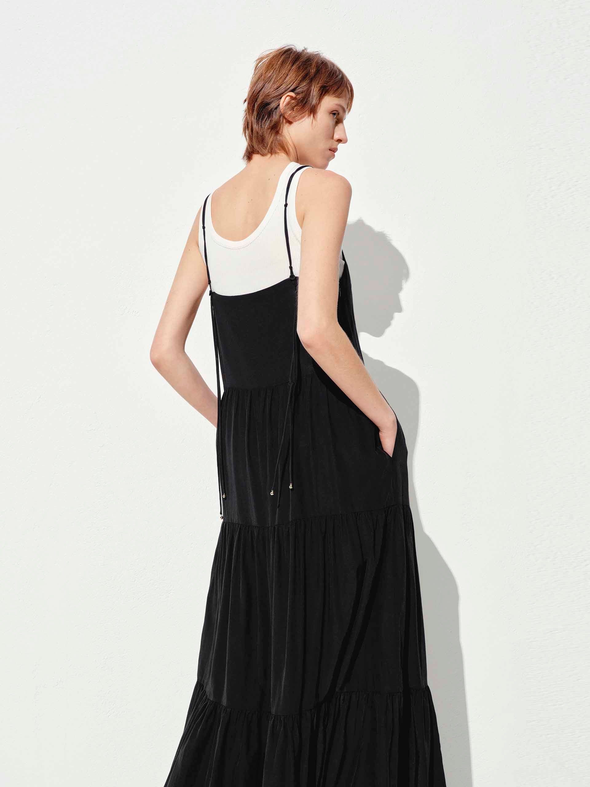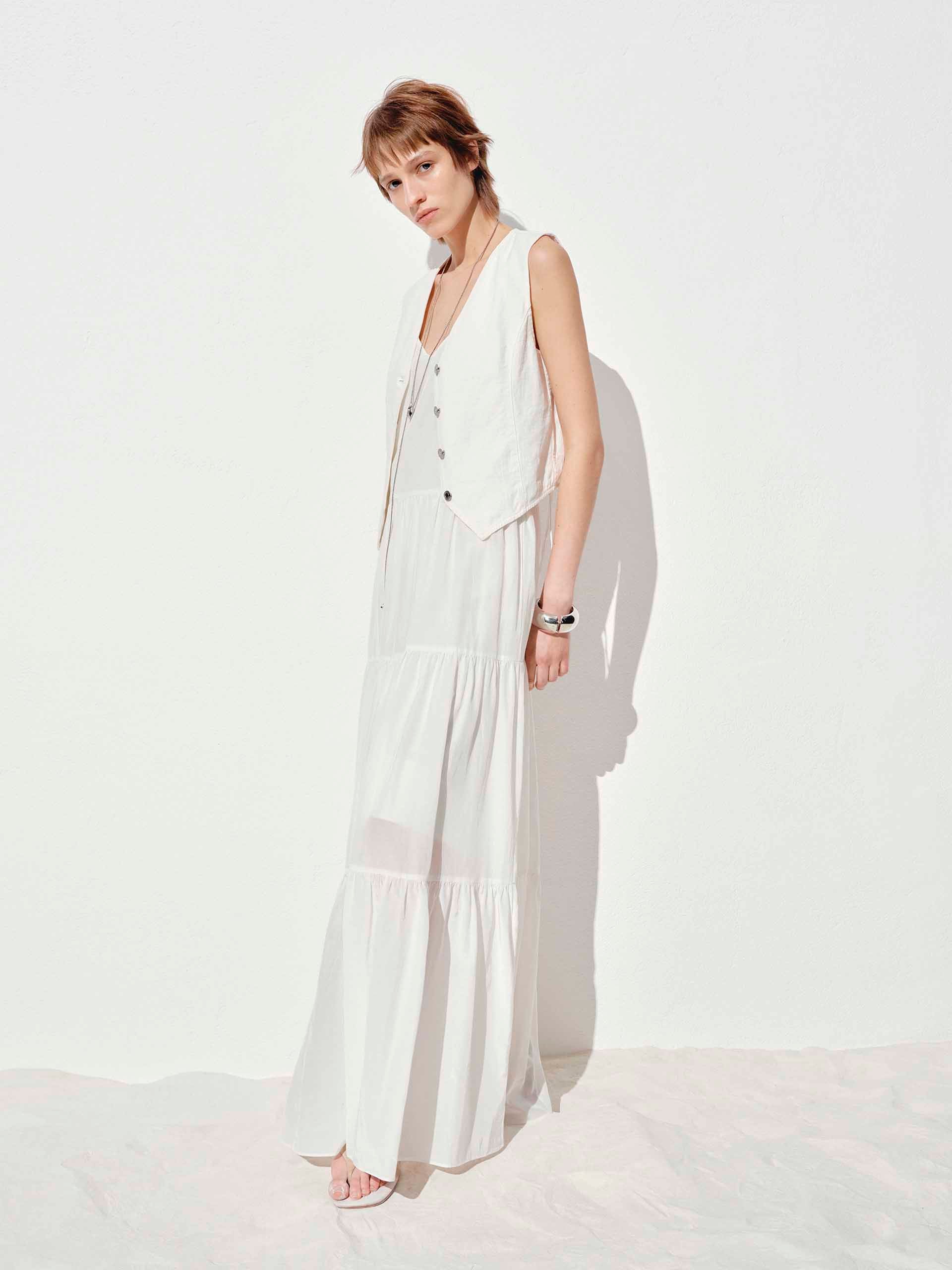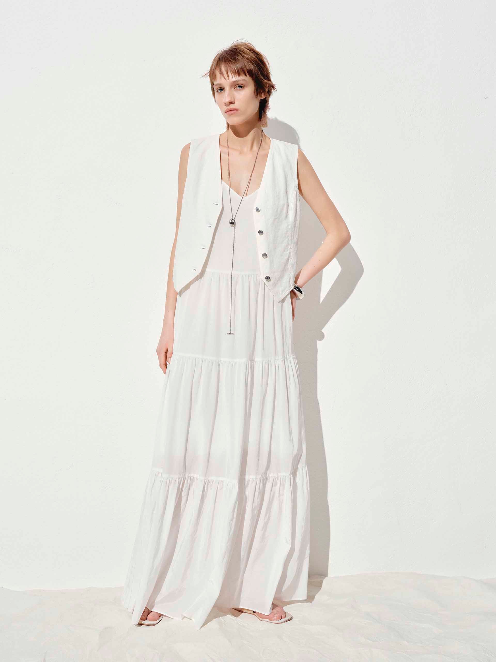 Expertly crafted for comfort and style, our spaghetti straps maxi dress features delicate spaghetti straps and a flattering V-neckline. The pleated design adds texture and dimension, while the side pockets provide convenience and functionality. Pair with the matching waistcoat for a more sophisticated and charming look.