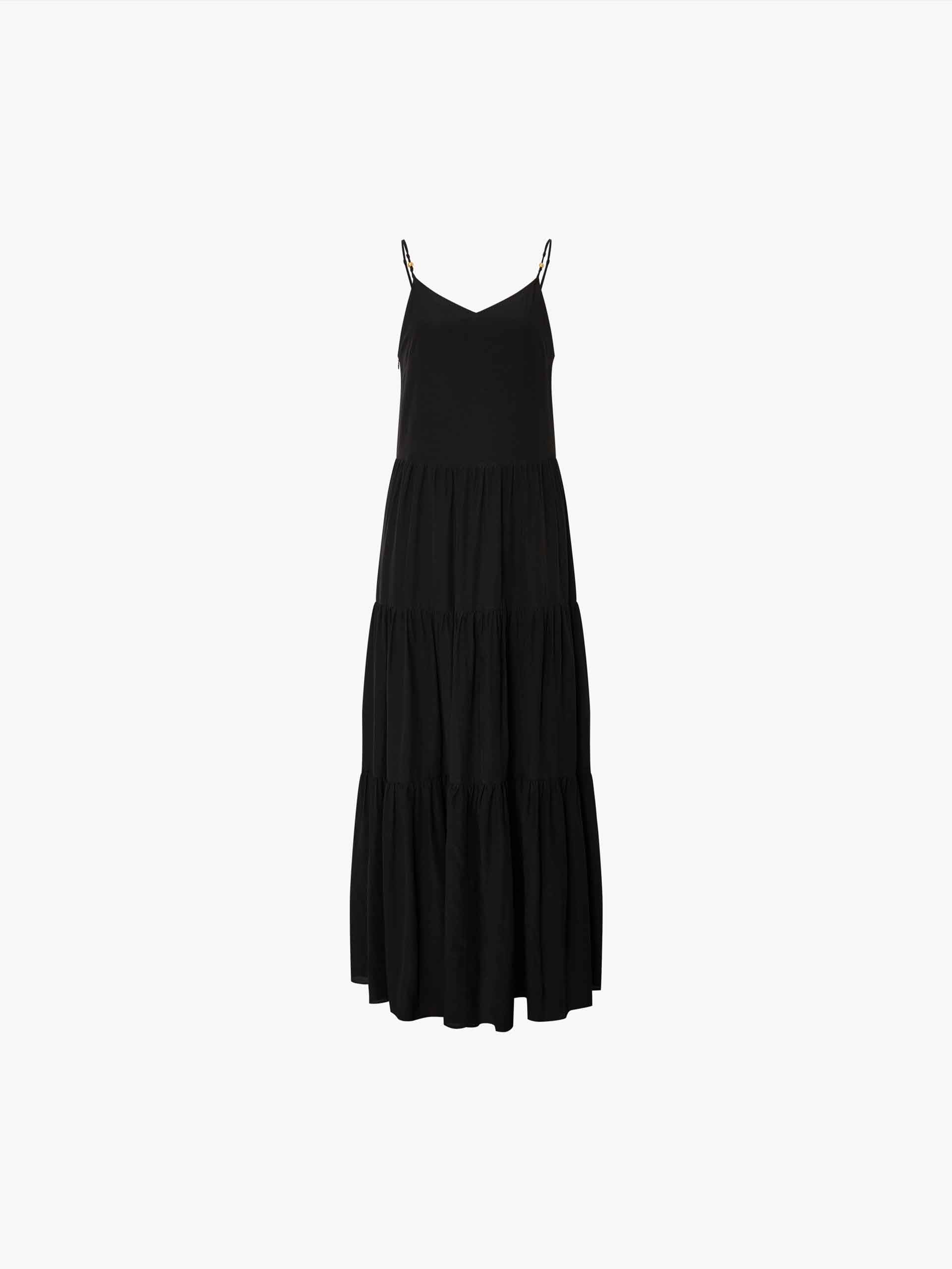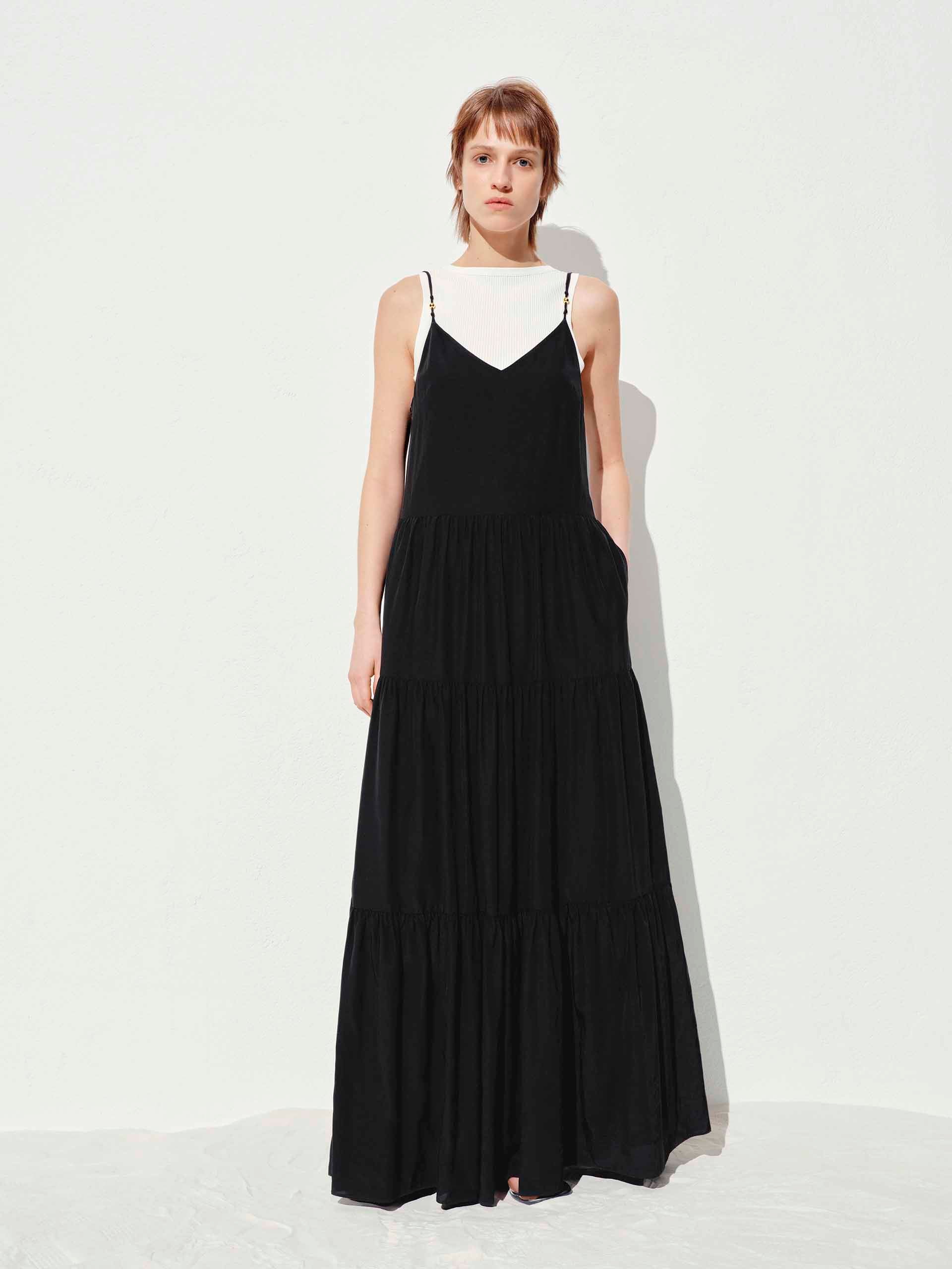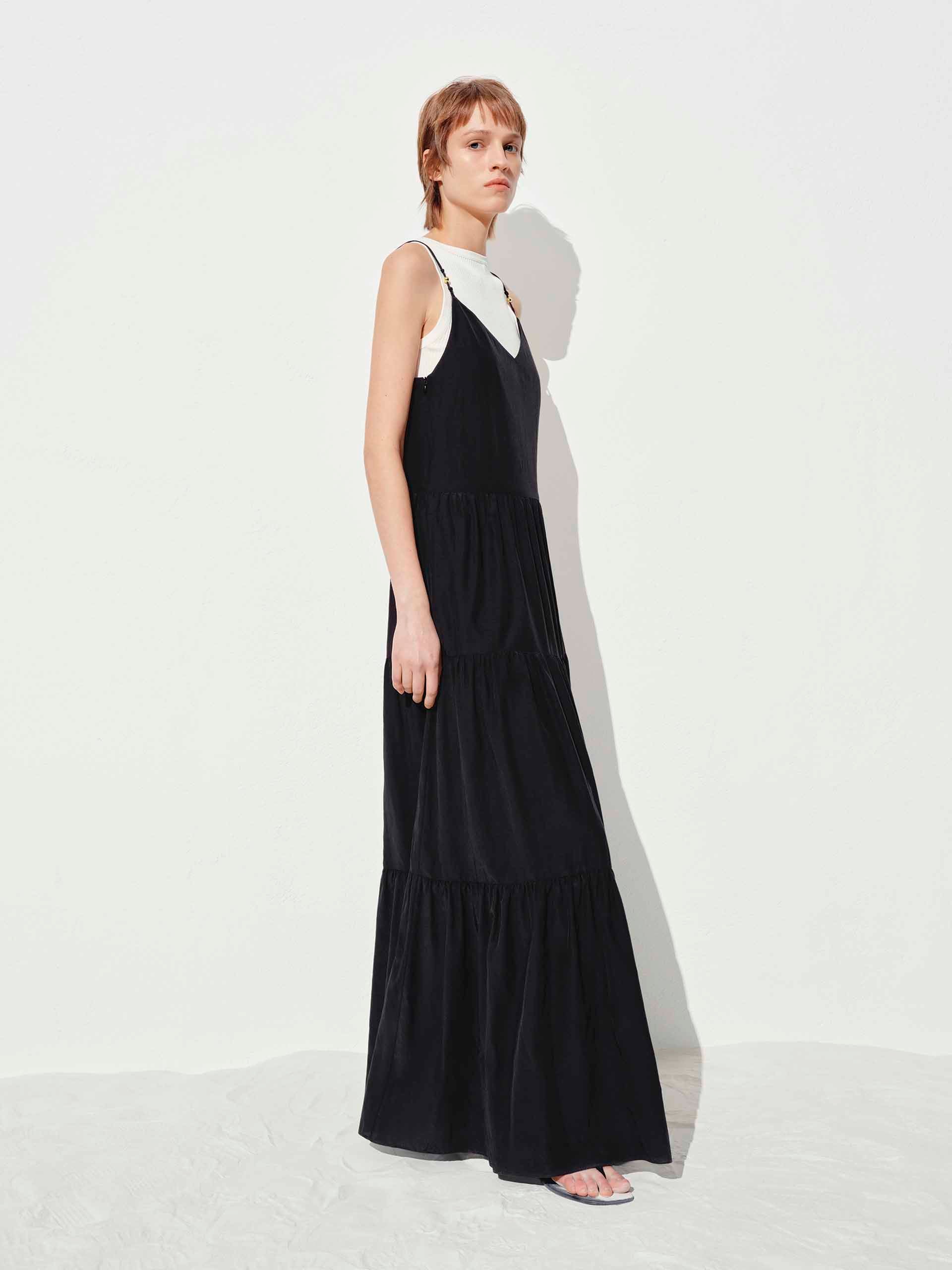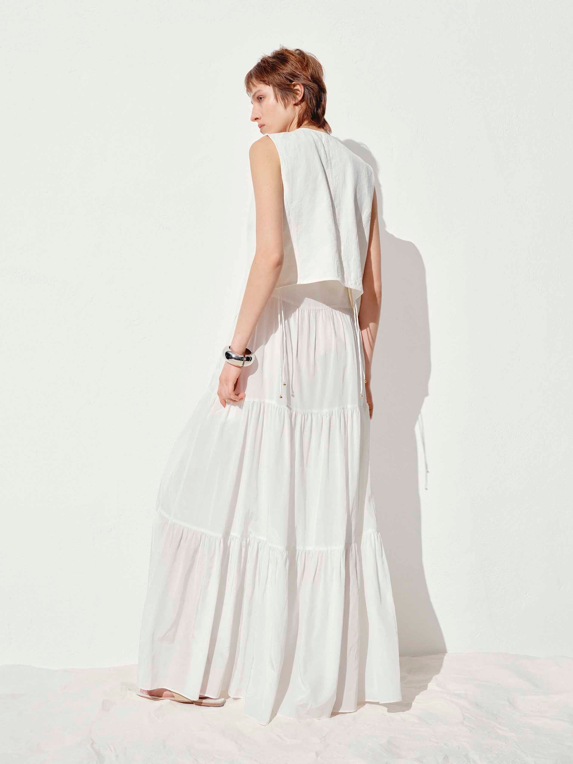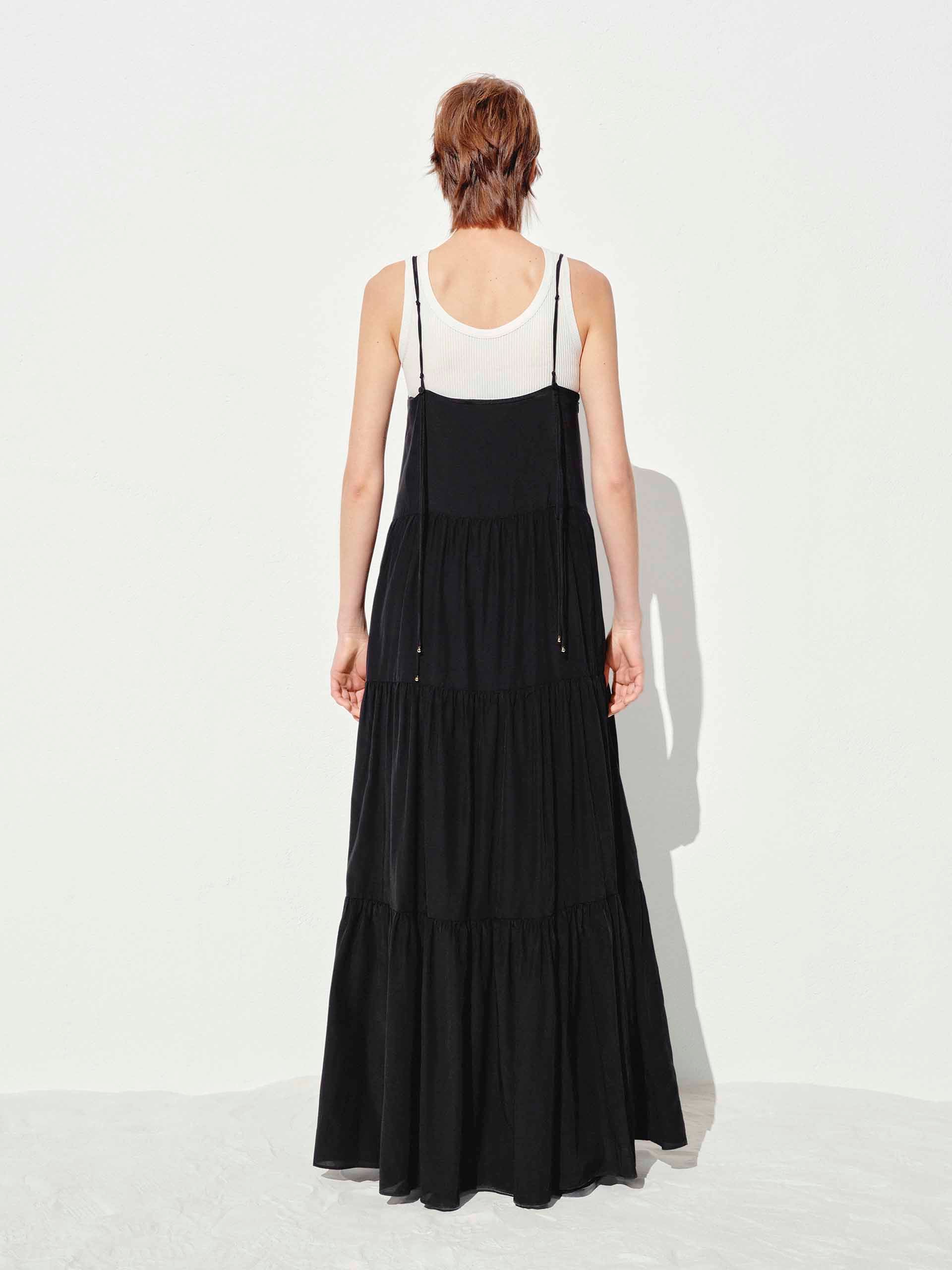 Expertly crafted for comfort and style, our spaghetti straps maxi dress features delicate spaghetti straps and a flattering V-neckline. The pleated design adds texture and dimension, while the side pockets provide convenience and functionality. Pair with the matching waistcoat for a more sophisticated and charming look.